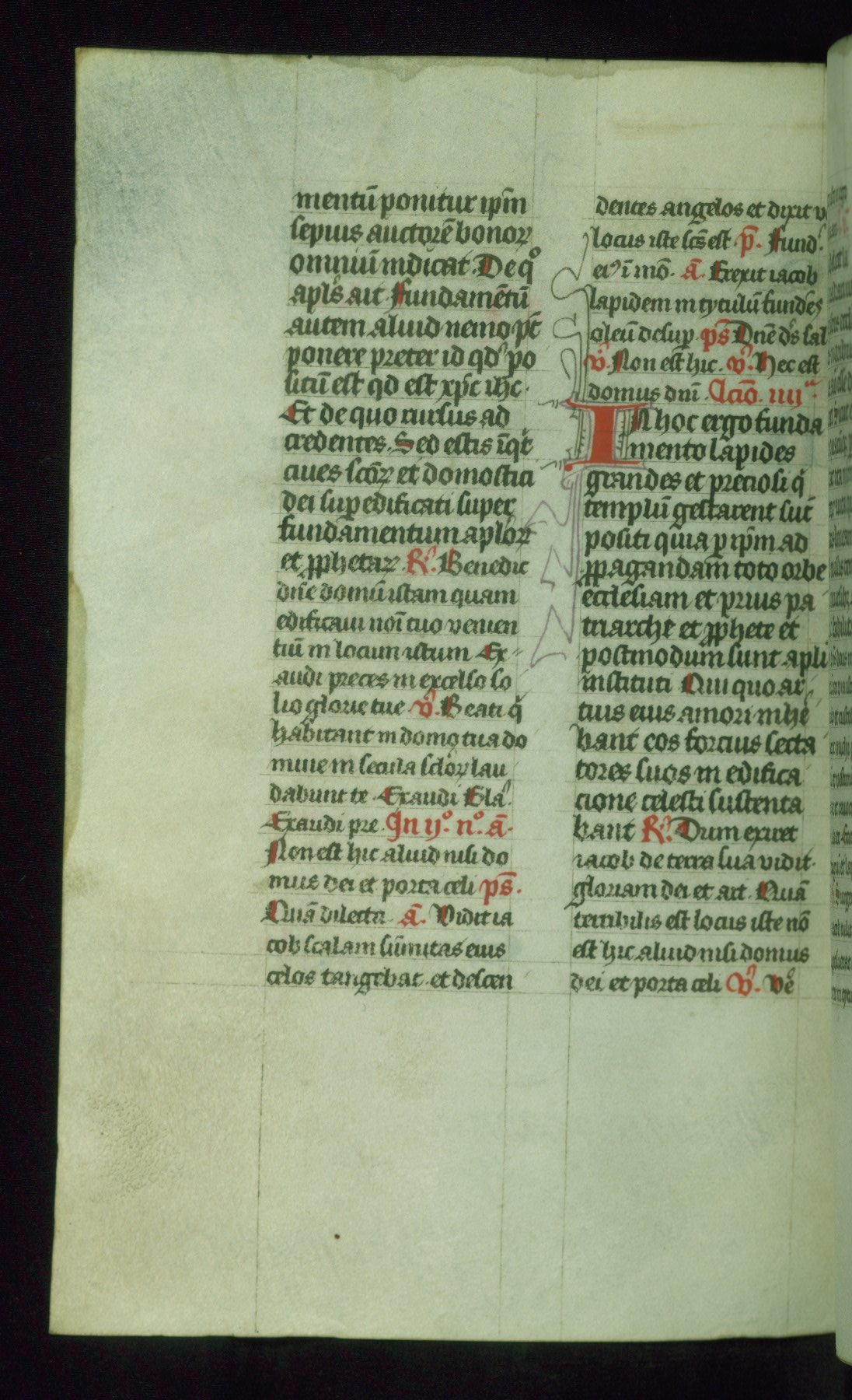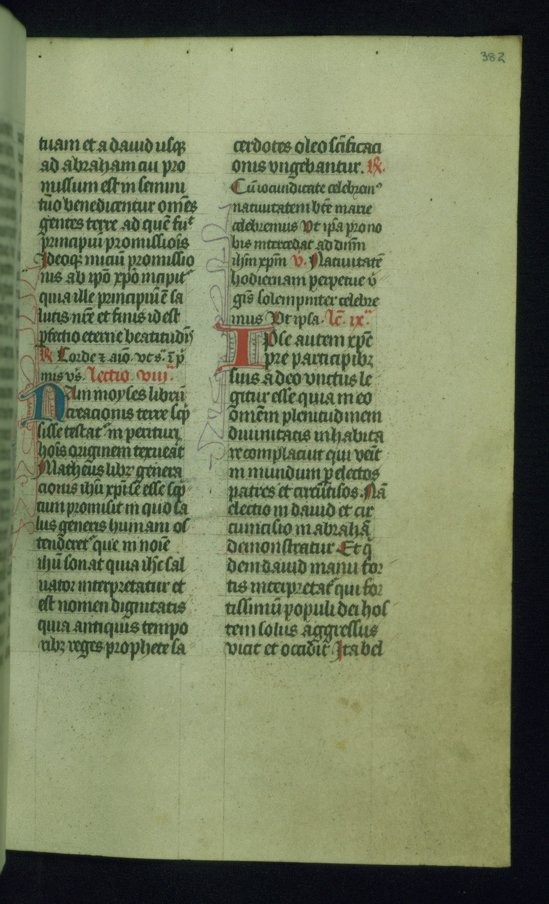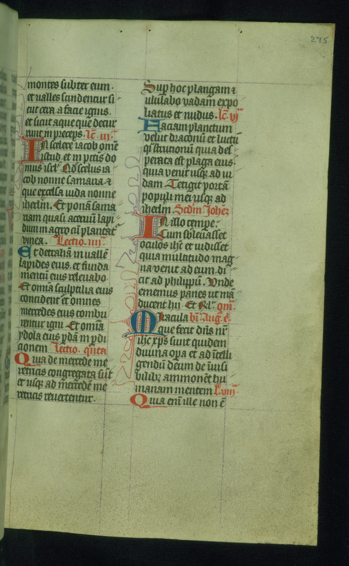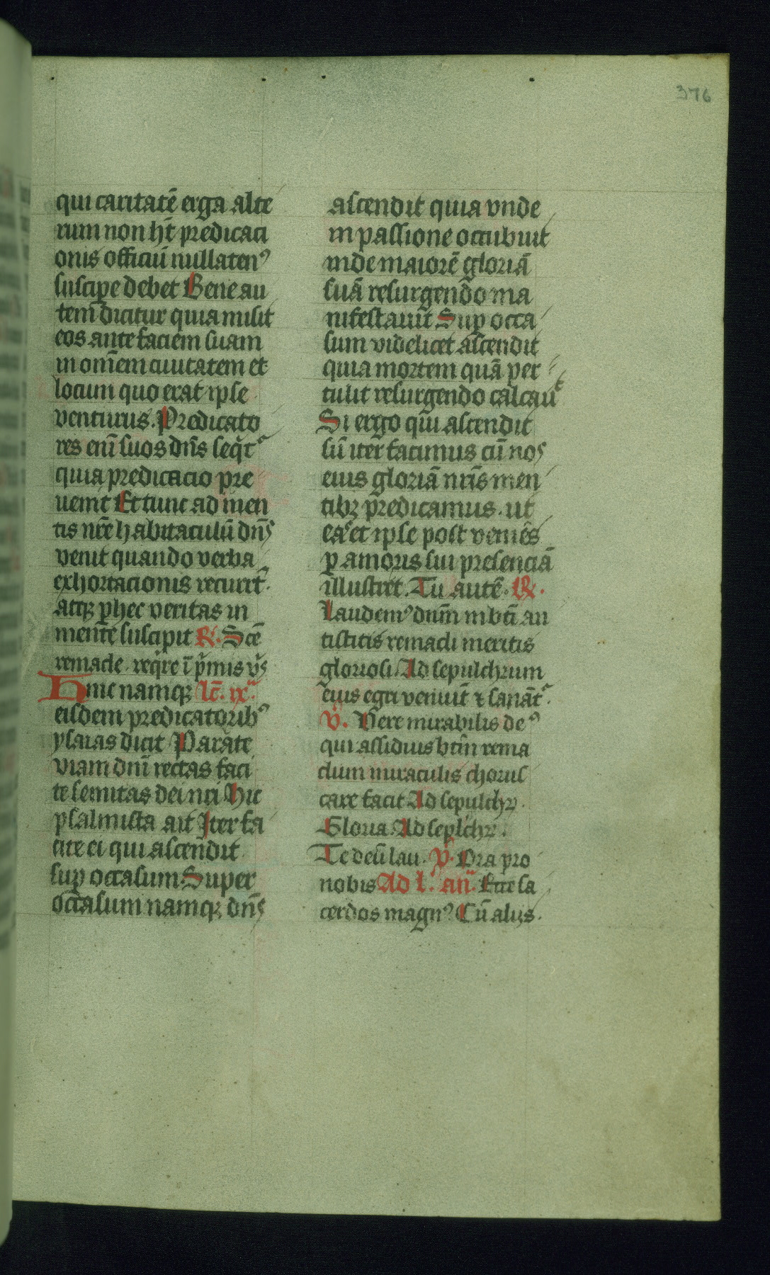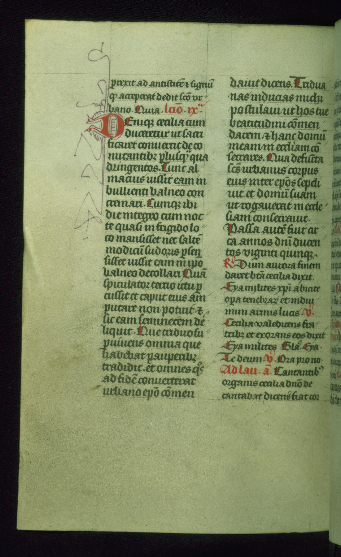 This small breviary, composed of more than 500 folios, is extraordinary for its length, considering it is the summer portion of a two-volume breviary for the use of Liège. The manuscript was completed for ecclesiastical use at the Cathedral of Notre-Dame and St.-Lambert in Liège ca. 1420. This attribution is suggested, for instance, by the petitions to the congregation of this cathedral (fols. 114v-117v), as well as the armorial shield of the family of Surlet de Chokier of Liège represented at the opening of the Psalms. The manuscript has modest, but interesting, decoration with historiated and decorated initials marking the liturgical texts, and occasional angels playing instruments in the margins. The most notable pictorial effect is found in the initials inhabited by transparent figures on rich blue ground. The technique is found, for instance, on fol. 156r with the gold monstrance held by translucent angels for the feast of the Corpus Christi.