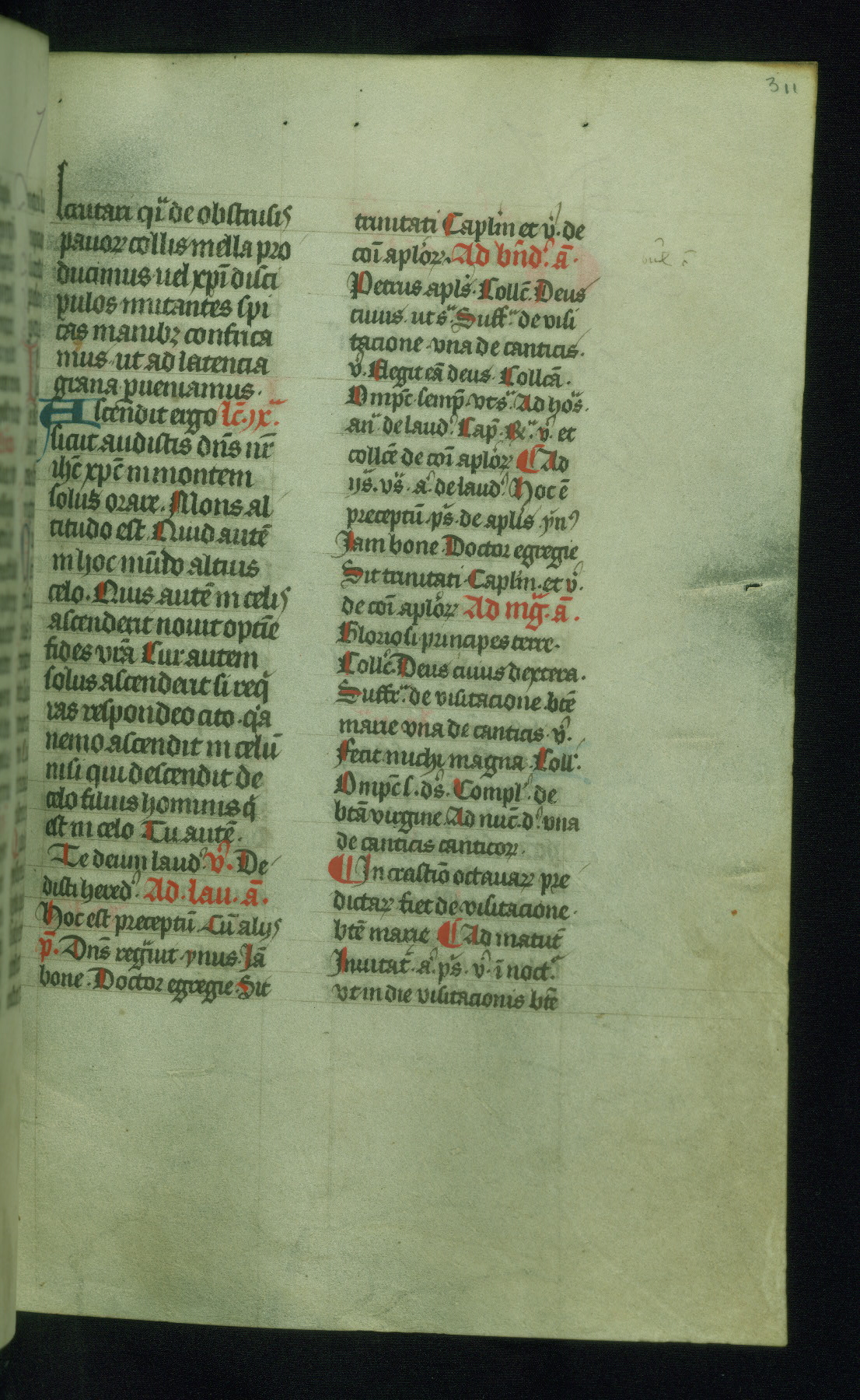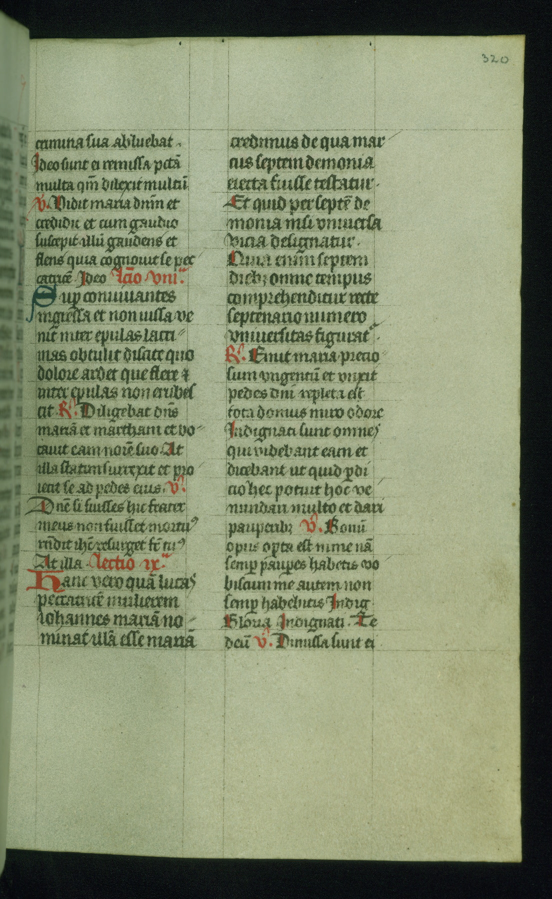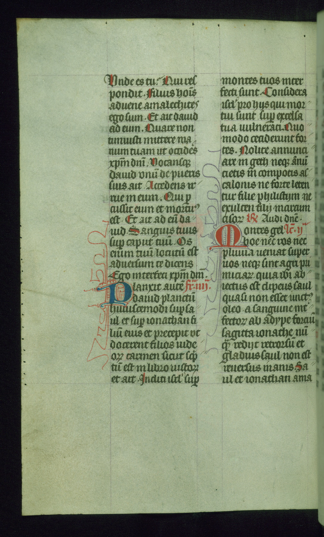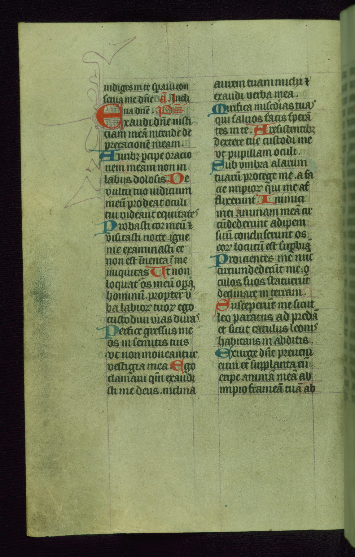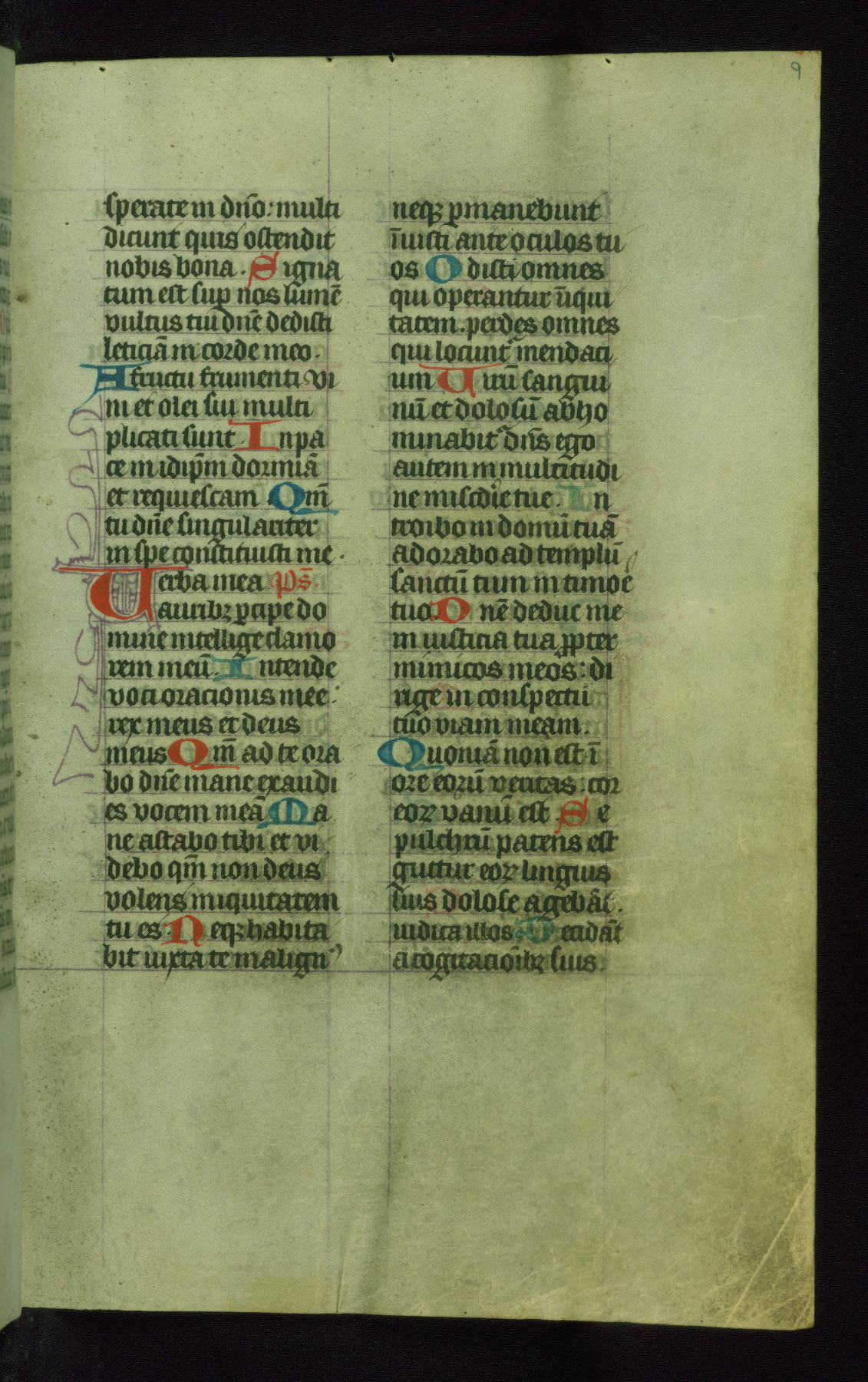 This small breviary, composed of more than 500 folios, is extraordinary for its length, considering it is the summer portion of a two-volume breviary for the use of Liège. The manuscript was completed for ecclesiastical use at the Cathedral of Notre-Dame and St.-Lambert in Liège ca. 1420. This attribution is suggested, for instance, by the petitions to the congregation of this cathedral (fols. 114v-117v), as well as the armorial shield of the family of Surlet de Chokier of Liège represented at the opening of the Psalms. The manuscript has modest, but interesting, decoration with historiated and decorated initials marking the liturgical texts, and occasional angels playing instruments in the margins. The most notable pictorial effect is found in the initials inhabited by transparent figures on rich blue ground. The technique is found, for instance, on fol. 156r with the gold monstrance held by translucent angels for the feast of the Corpus Christi.