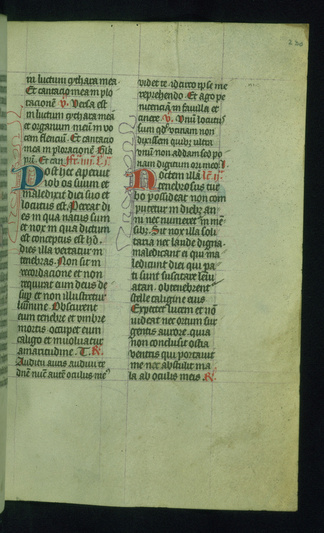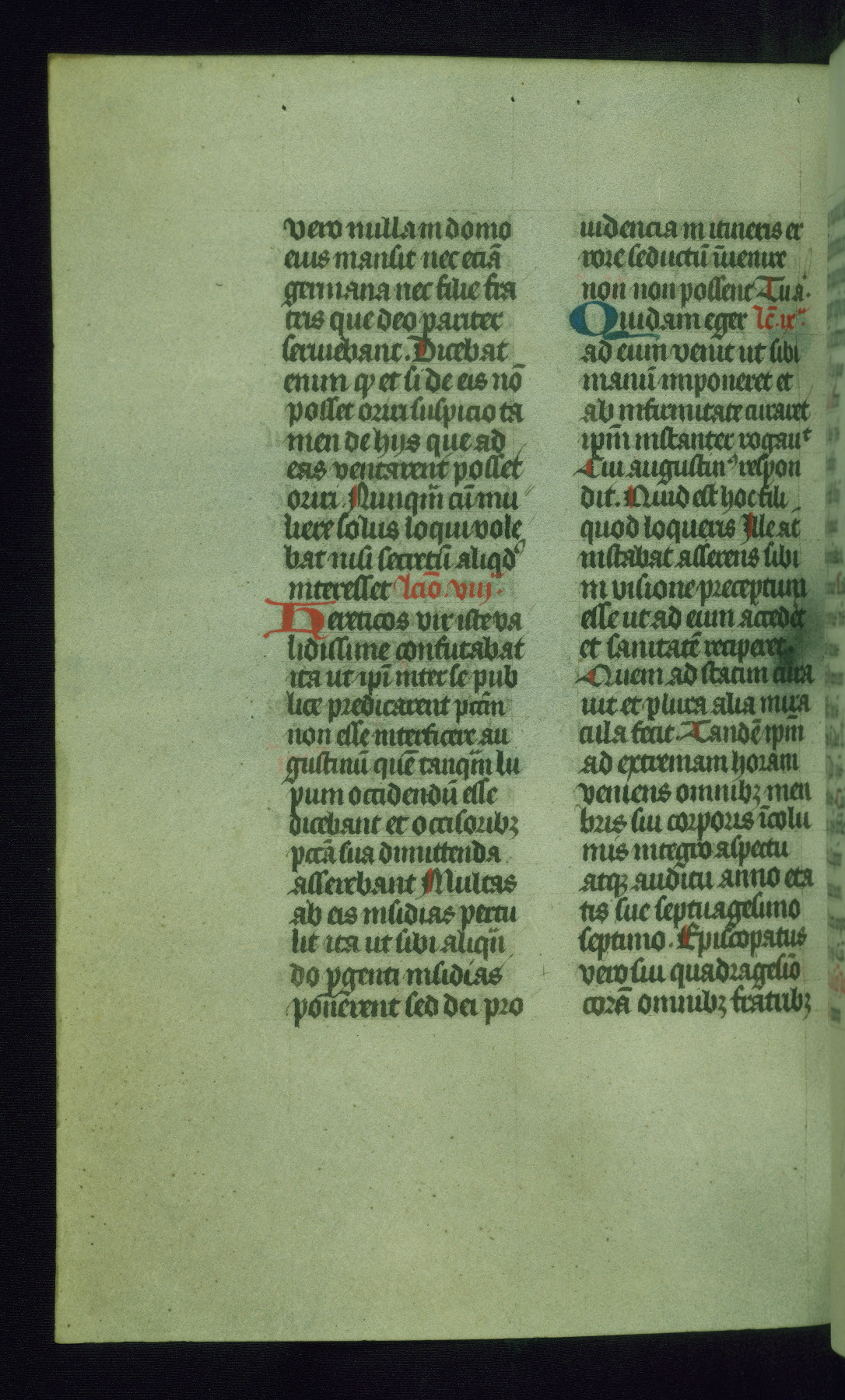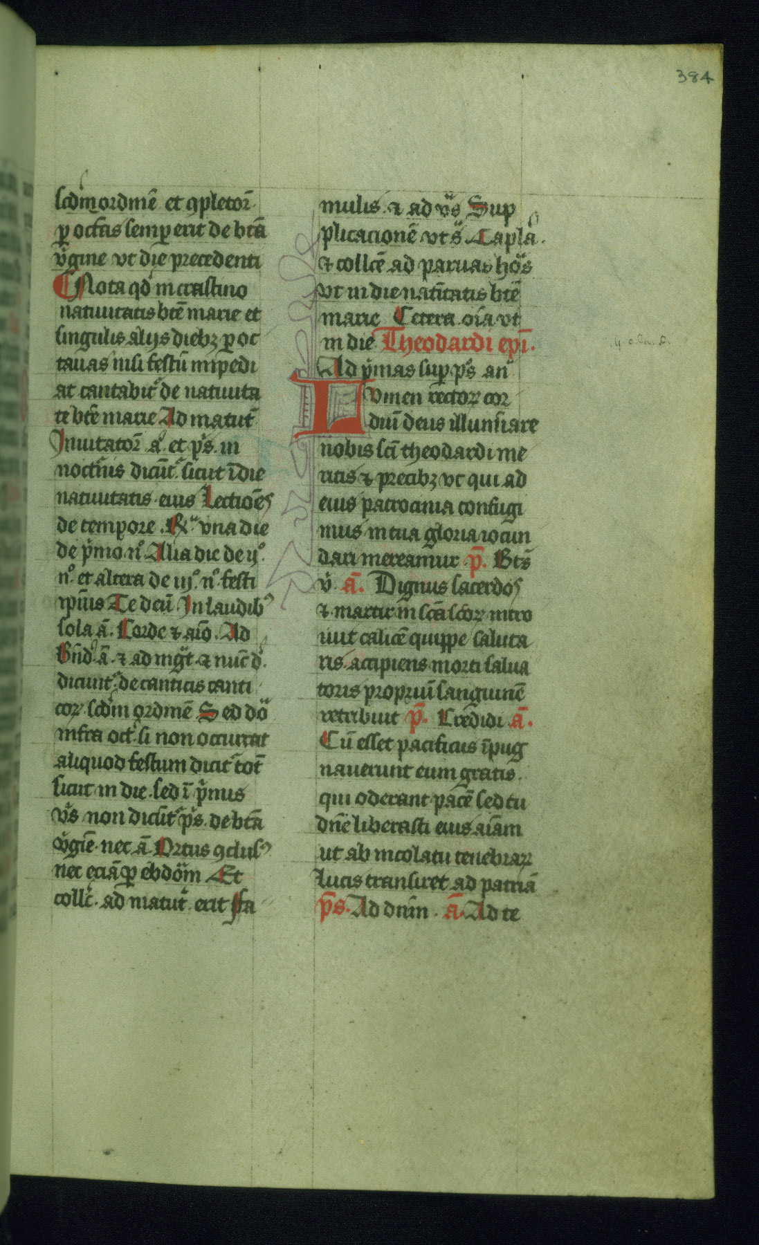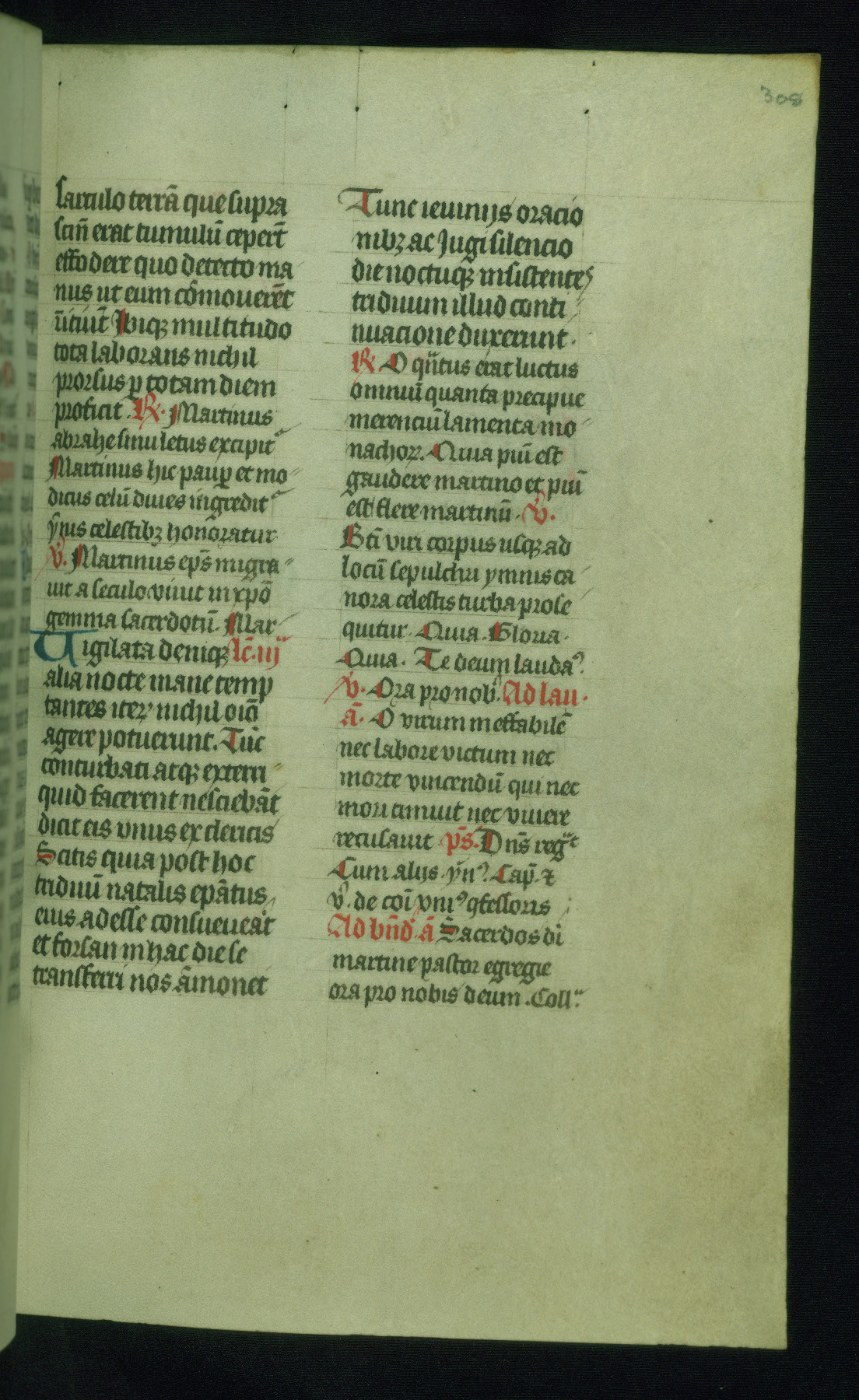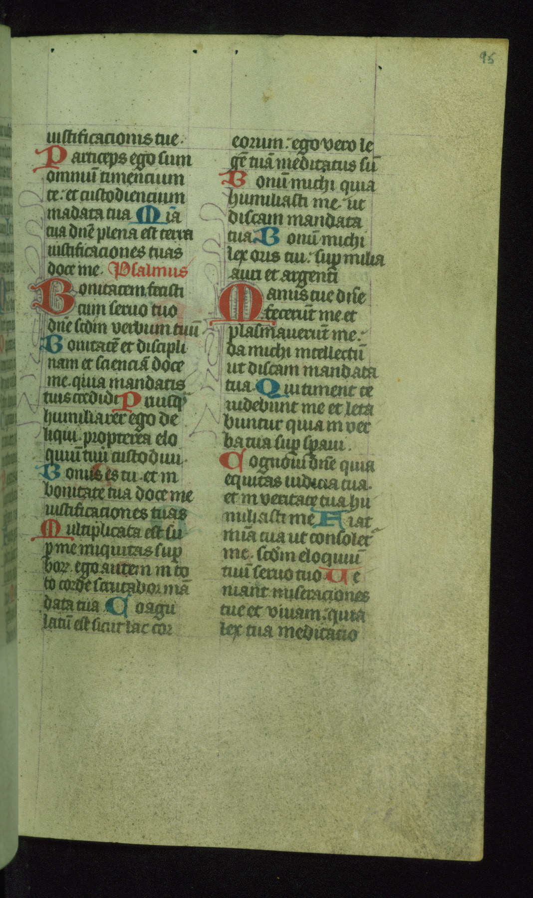 This small breviary, composed of more than 500 folios, is extraordinary for its length, considering it is the summer portion of a two-volume breviary for the use of Liège. The manuscript was completed for ecclesiastical use at the Cathedral of Notre-Dame and St.-Lambert in Liège ca. 1420. This attribution is suggested, for instance, by the petitions to the congregation of this cathedral (fols. 114v-117v), as well as the armorial shield of the family of Surlet de Chokier of Liège represented at the opening of the Psalms. The manuscript has modest, but interesting, decoration with historiated and decorated initials marking the liturgical texts, and occasional angels playing instruments in the margins. The most notable pictorial effect is found in the initials inhabited by transparent figures on rich blue ground. The technique is found, for instance, on fol. 156r with the gold monstrance held by translucent angels for the feast of the Corpus Christi.
