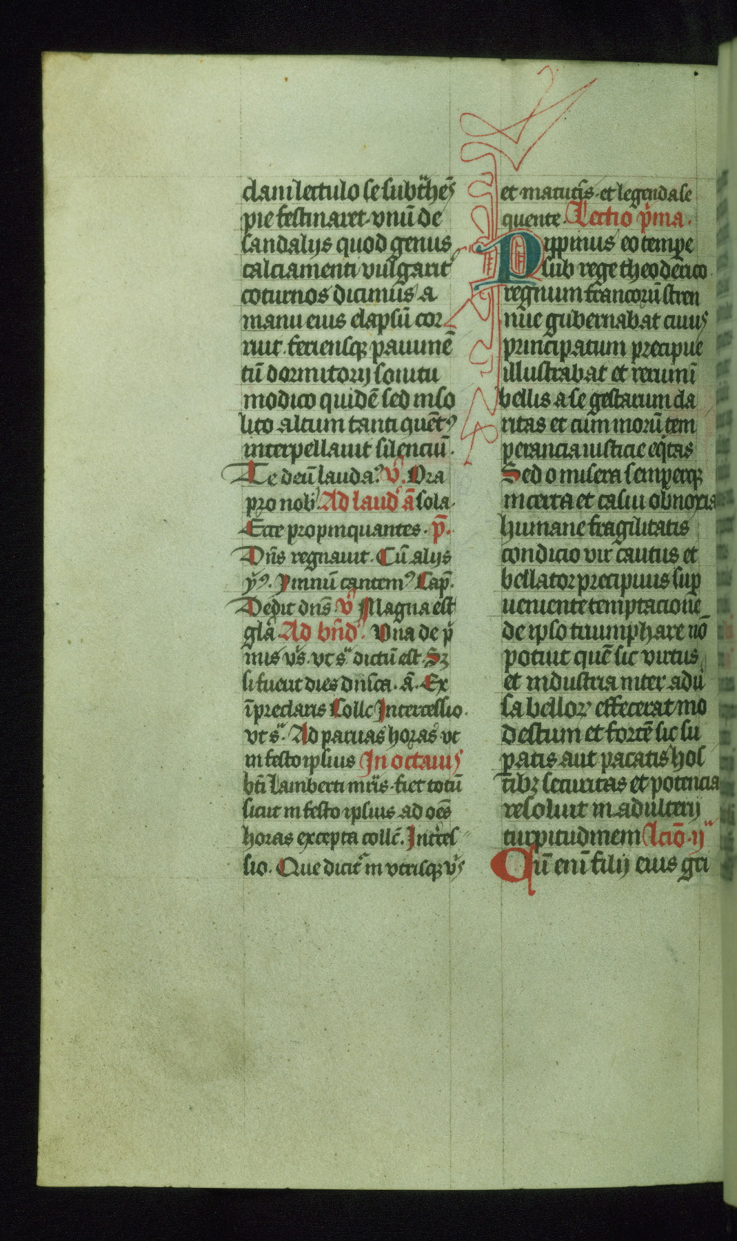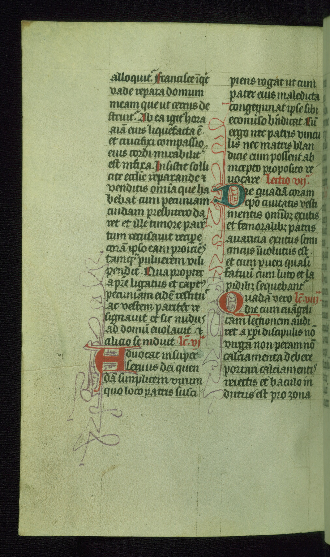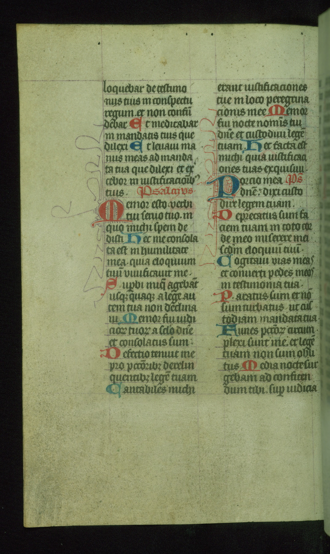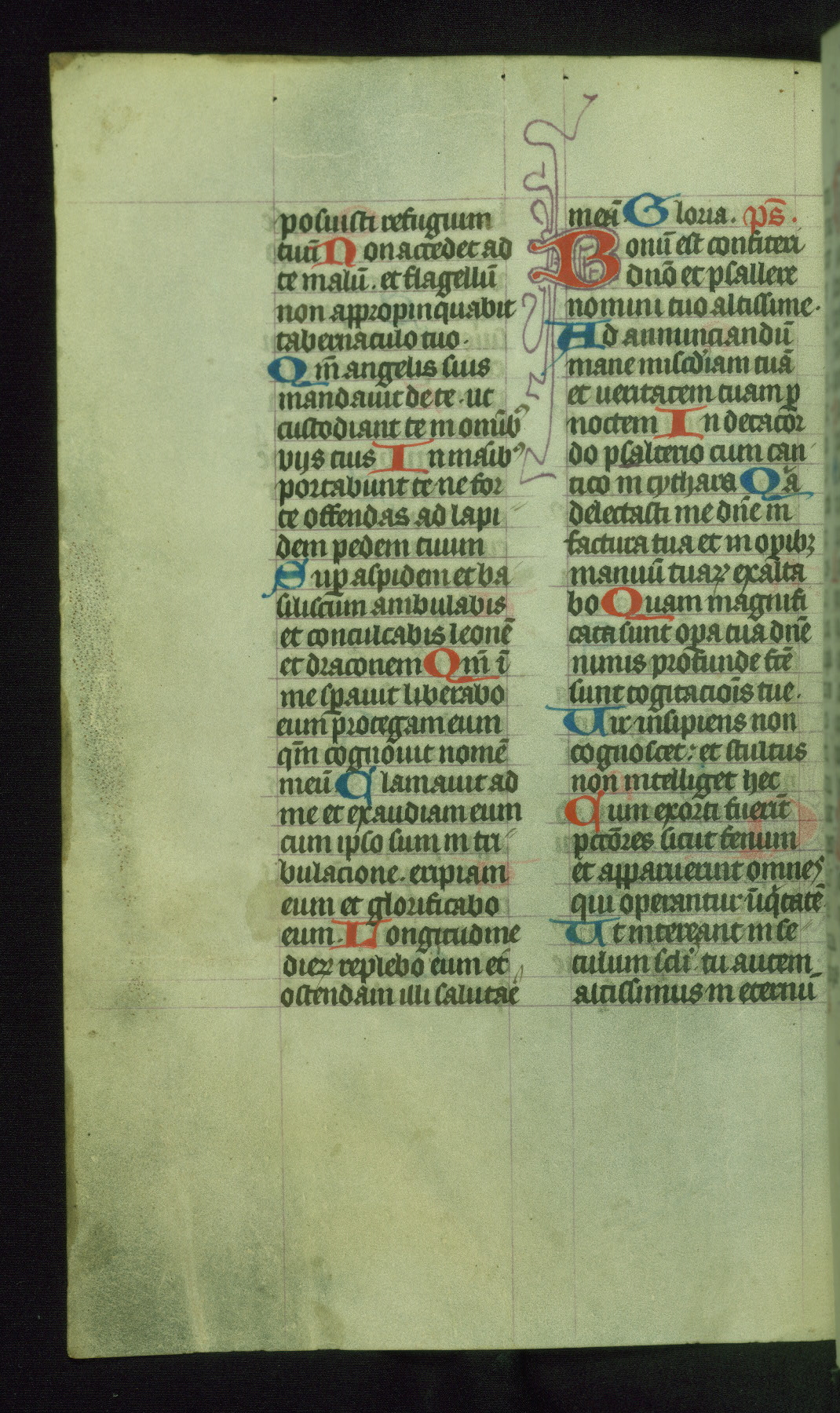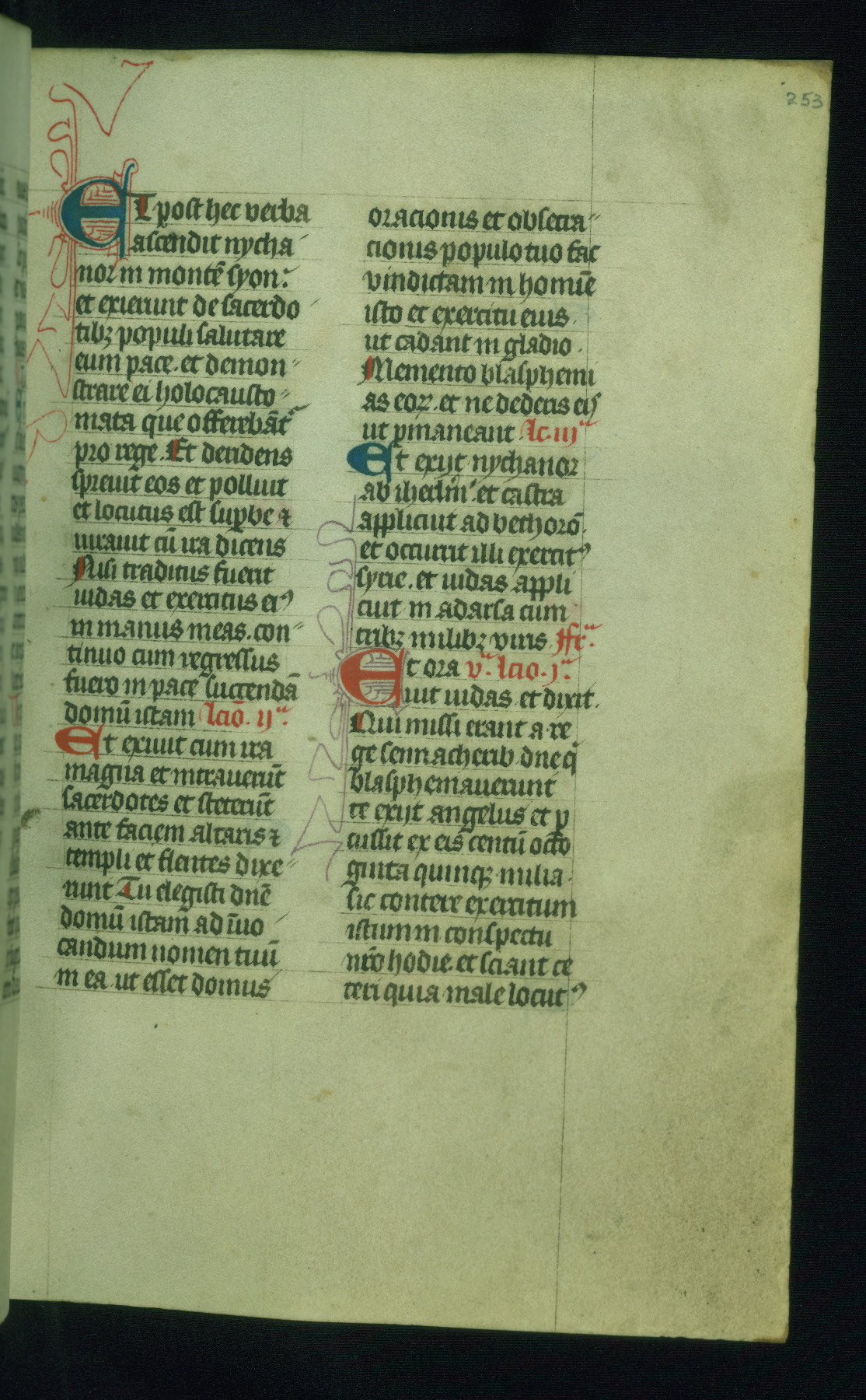 This small breviary, composed of more than 500 folios, is extraordinary for its length, considering it is the summer portion of a two-volume breviary for the use of Liège. The manuscript was completed for ecclesiastical use at the Cathedral of Notre-Dame and St.-Lambert in Liège ca. 1420. This attribution is suggested, for instance, by the petitions to the congregation of this cathedral (fols. 114v-117v), as well as the armorial shield of the family of Surlet de Chokier of Liège represented at the opening of the Psalms. The manuscript has modest, but interesting, decoration with historiated and decorated initials marking the liturgical texts, and occasional angels playing instruments in the margins. The most notable pictorial effect is found in the initials inhabited by transparent figures on rich blue ground. The technique is found, for instance, on fol. 156r with the gold monstrance held by translucent angels for the feast of the Corpus Christi.