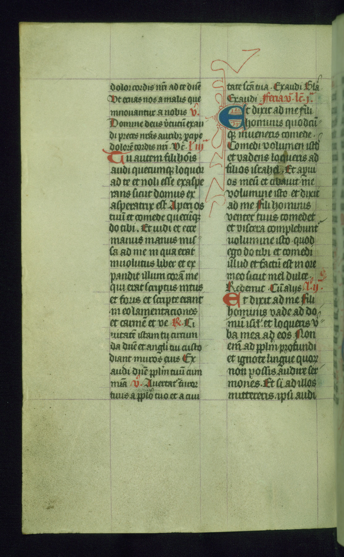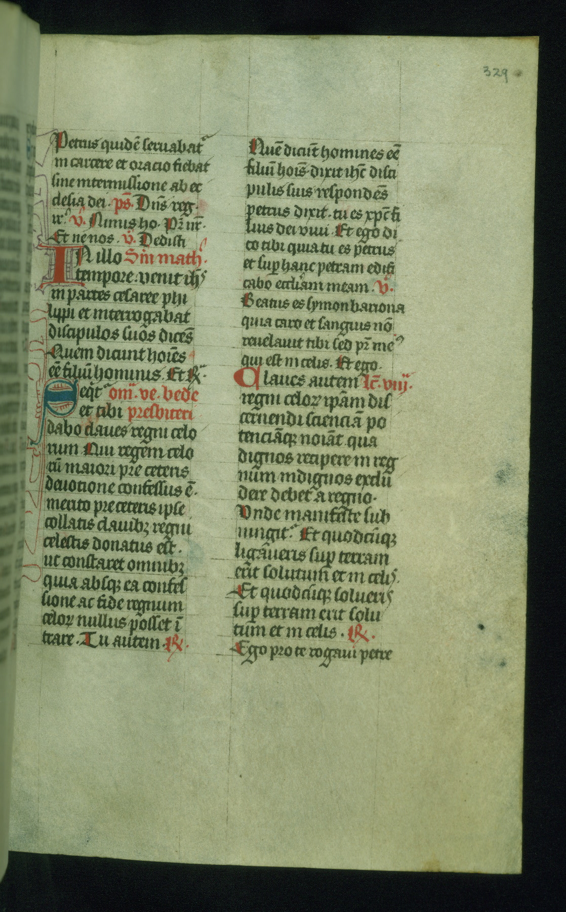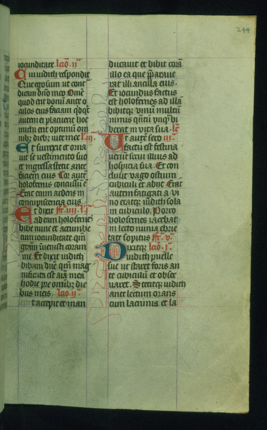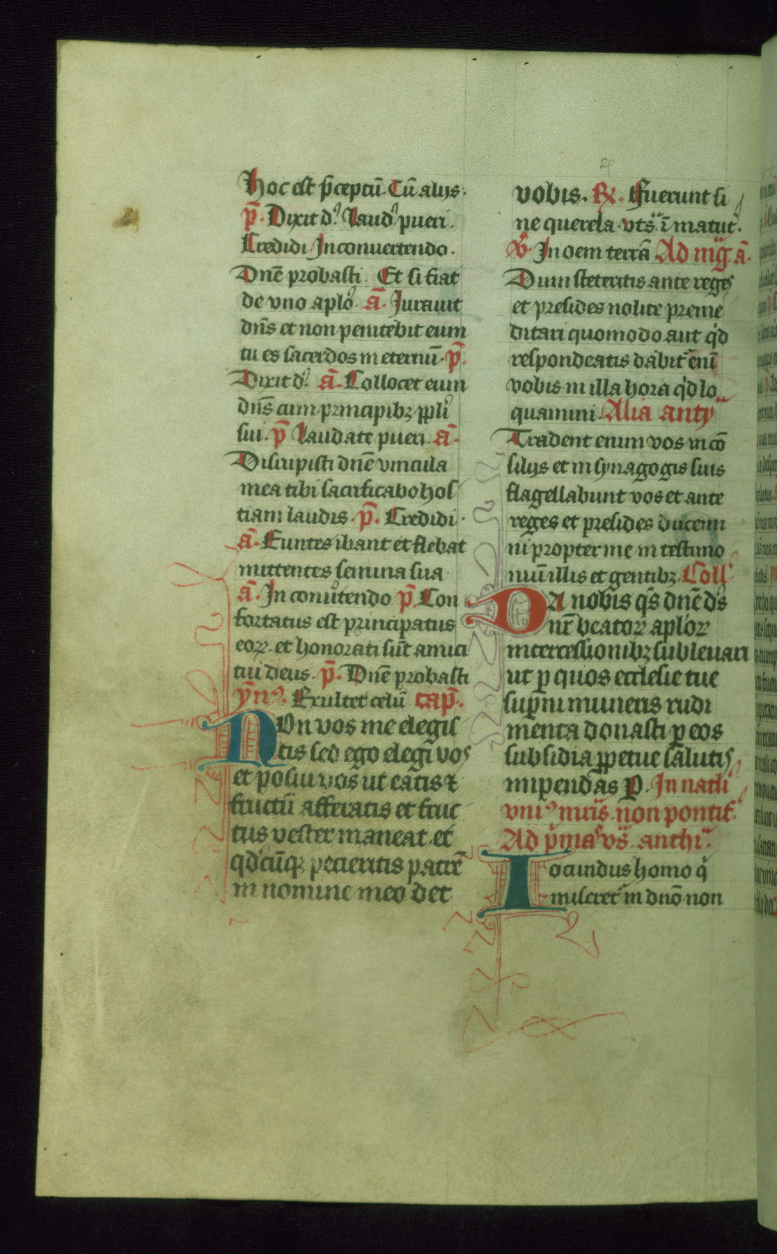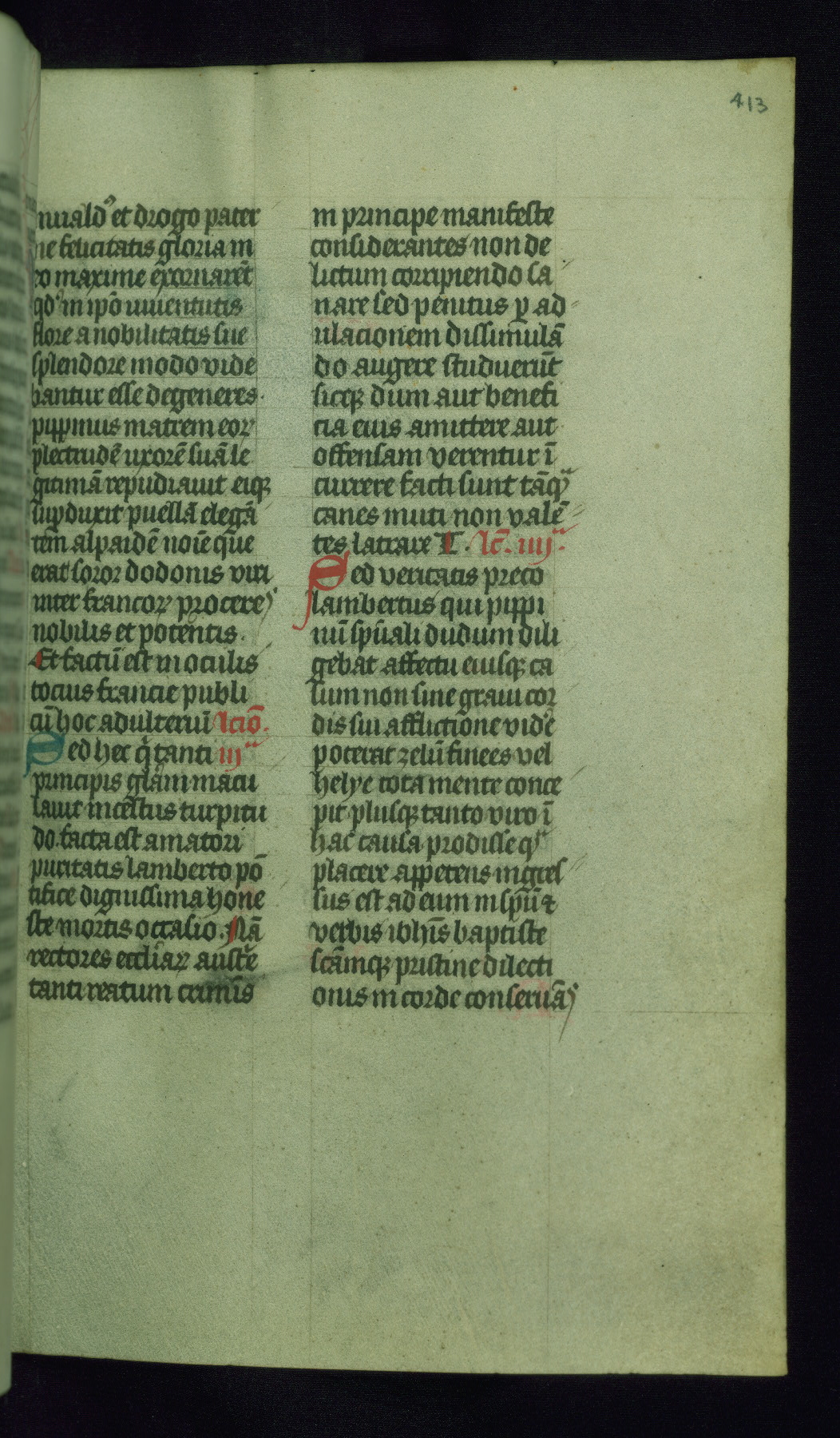 This small breviary, composed of more than 500 folios, is extraordinary for its length, considering it is the summer portion of a two-volume breviary for the use of Liège. The manuscript was completed for ecclesiastical use at the Cathedral of Notre-Dame and St.-Lambert in Liège ca. 1420. This attribution is suggested, for instance, by the petitions to the congregation of this cathedral (fols. 114v-117v), as well as the armorial shield of the family of Surlet de Chokier of Liège represented at the opening of the Psalms. The manuscript has modest, but interesting, decoration with historiated and decorated initials marking the liturgical texts, and occasional angels playing instruments in the margins. The most notable pictorial effect is found in the initials inhabited by transparent figures on rich blue ground. The technique is found, for instance, on fol. 156r with the gold monstrance held by translucent angels for the feast of the Corpus Christi.