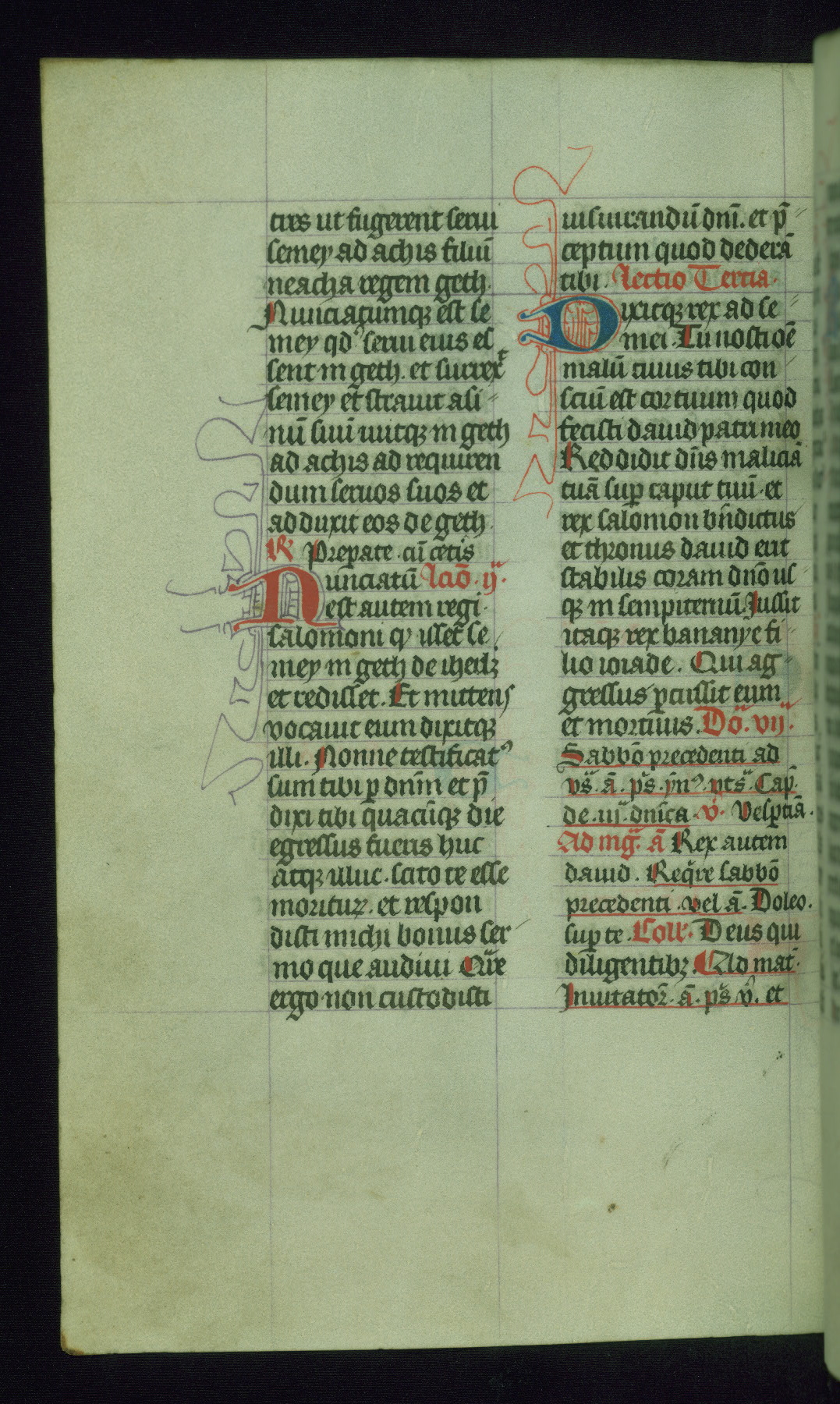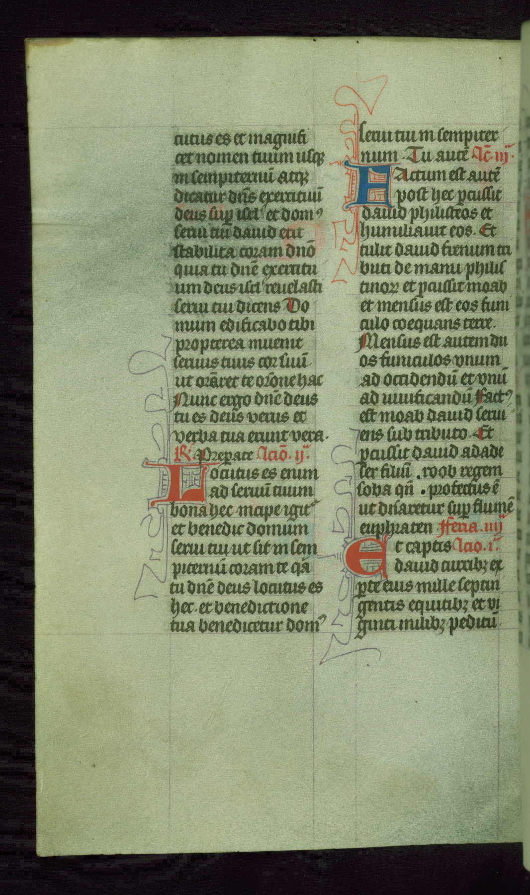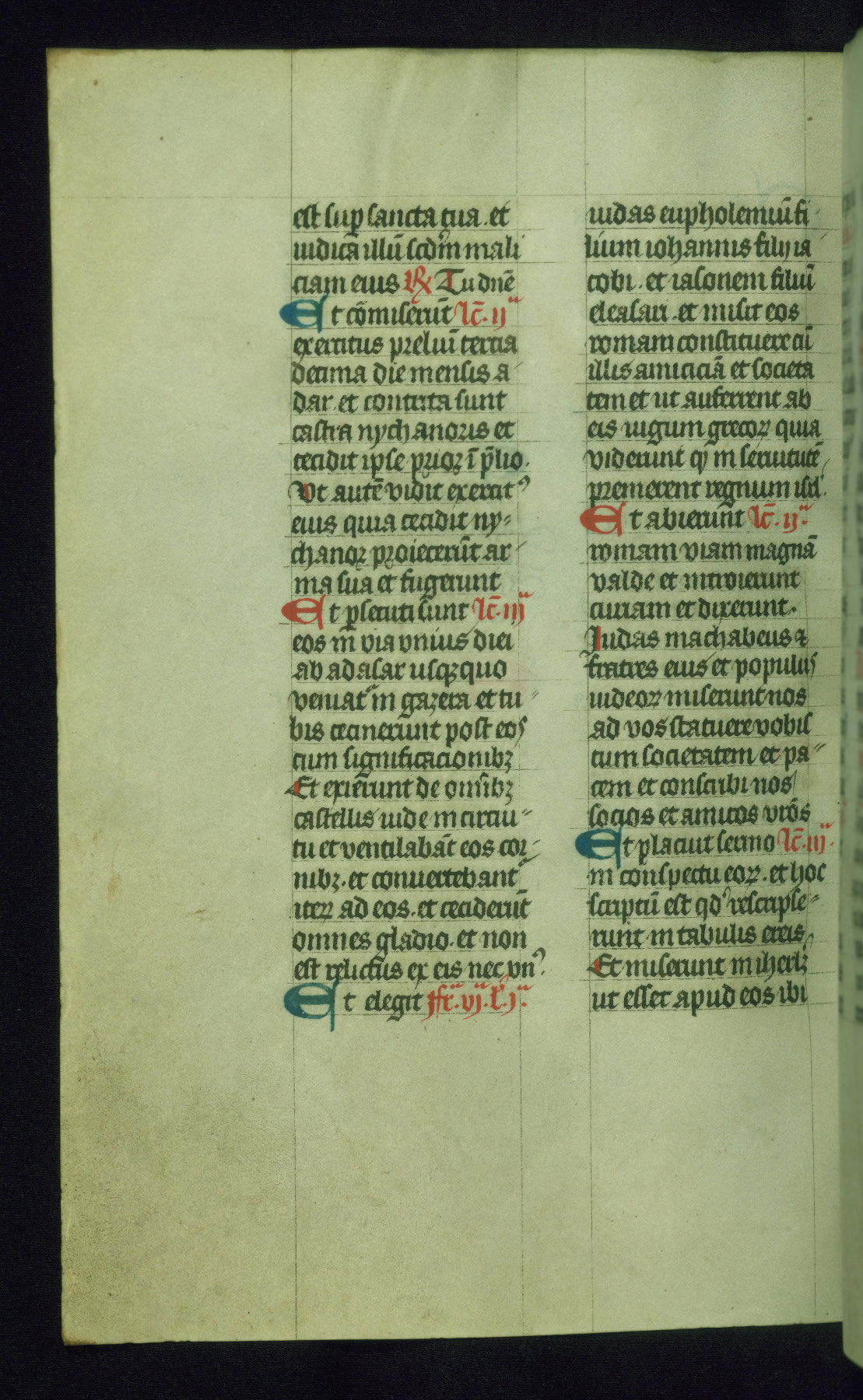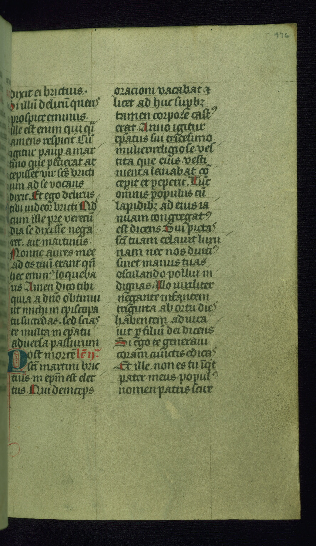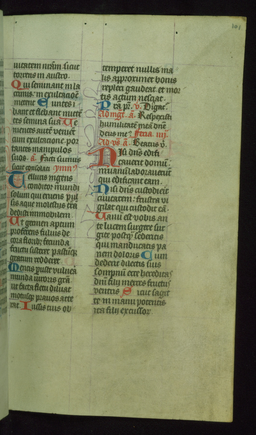 This small breviary, composed of more than 500 folios, is extraordinary for its length, considering it is the summer portion of a two-volume breviary for the use of Liège. The manuscript was completed for ecclesiastical use at the Cathedral of Notre-Dame and St.-Lambert in Liège ca. 1420. This attribution is suggested, for instance, by the petitions to the congregation of this cathedral (fols. 114v-117v), as well as the armorial shield of the family of Surlet de Chokier of Liège represented at the opening of the Psalms. The manuscript has modest, but interesting, decoration with historiated and decorated initials marking the liturgical texts, and occasional angels playing instruments in the margins. The most notable pictorial effect is found in the initials inhabited by transparent figures on rich blue ground. The technique is found, for instance, on fol. 156r with the gold monstrance held by translucent angels for the feast of the Corpus Christi.
