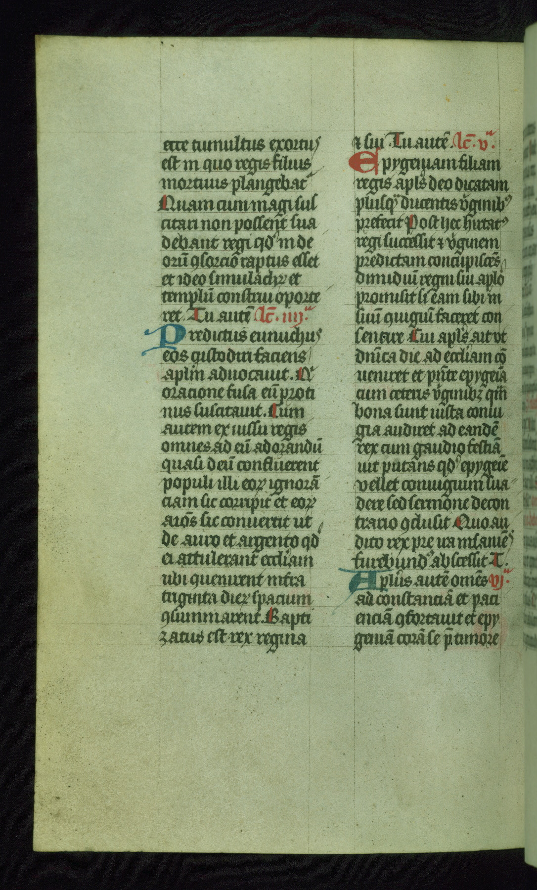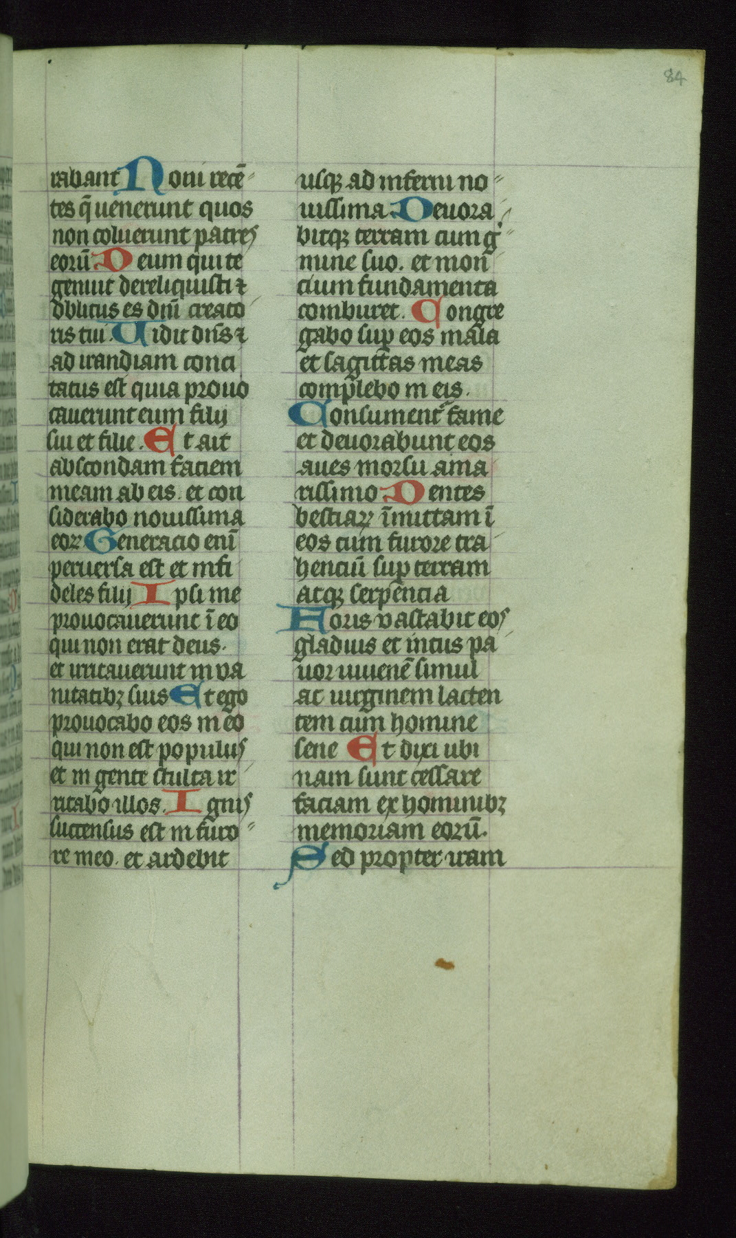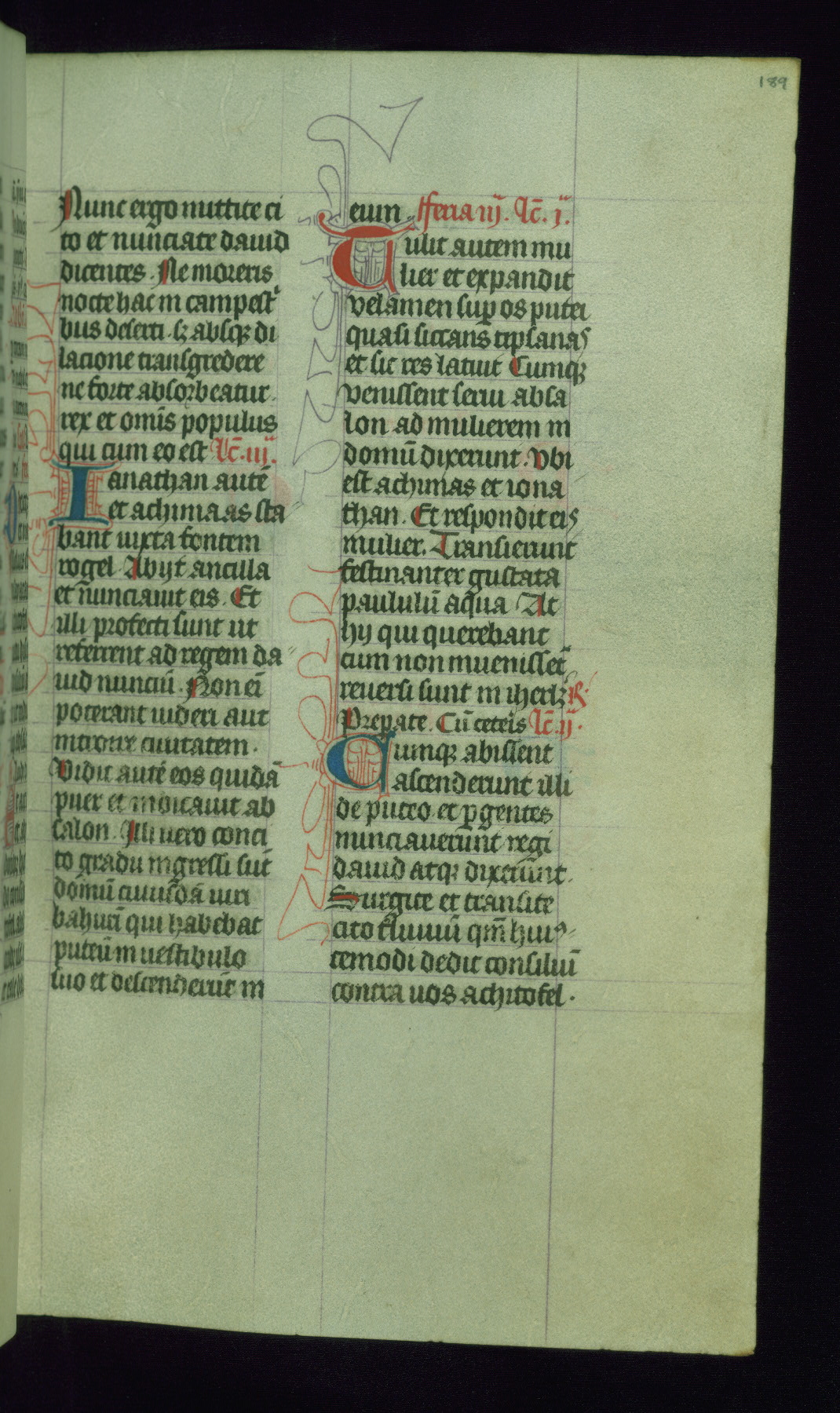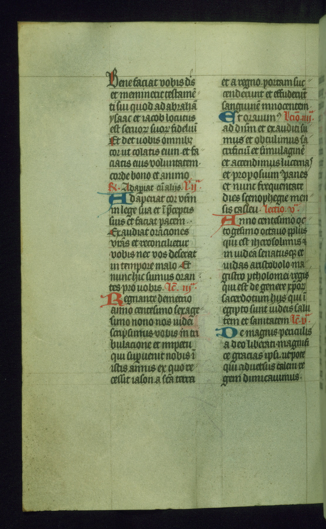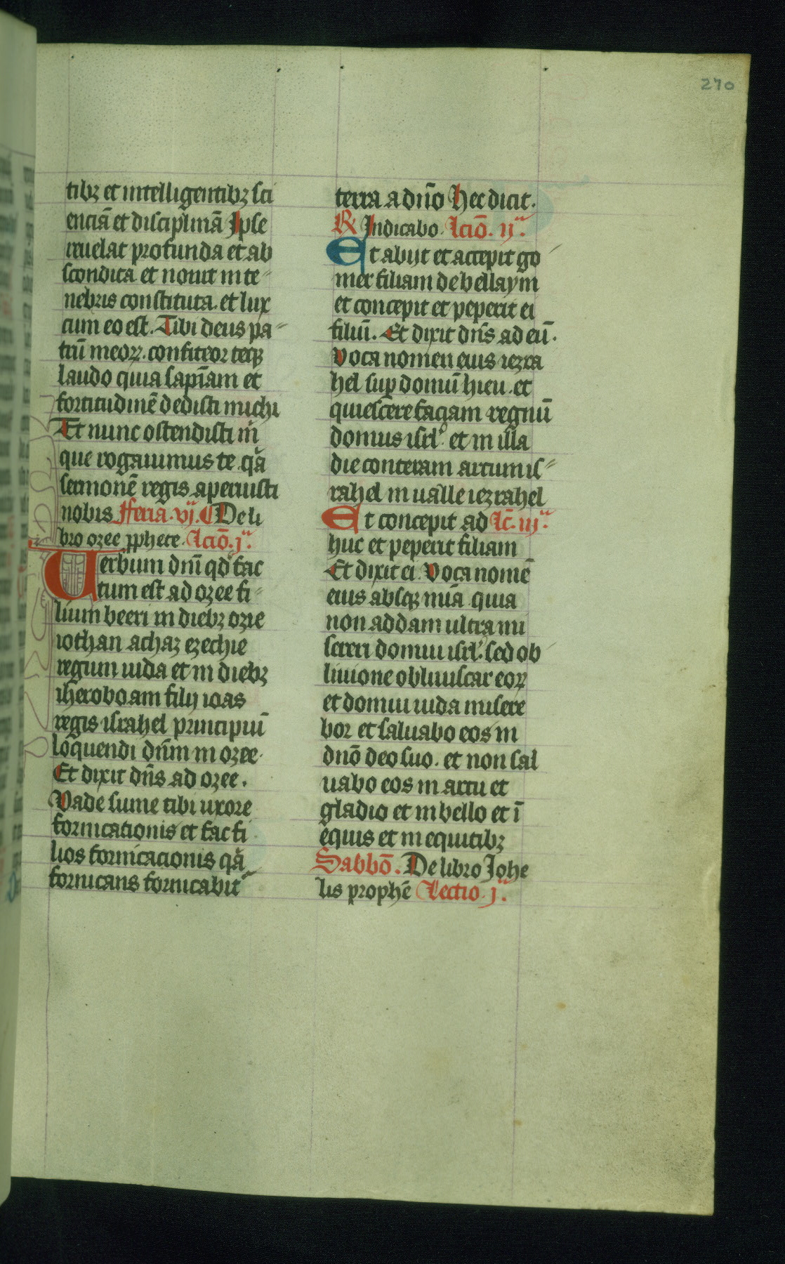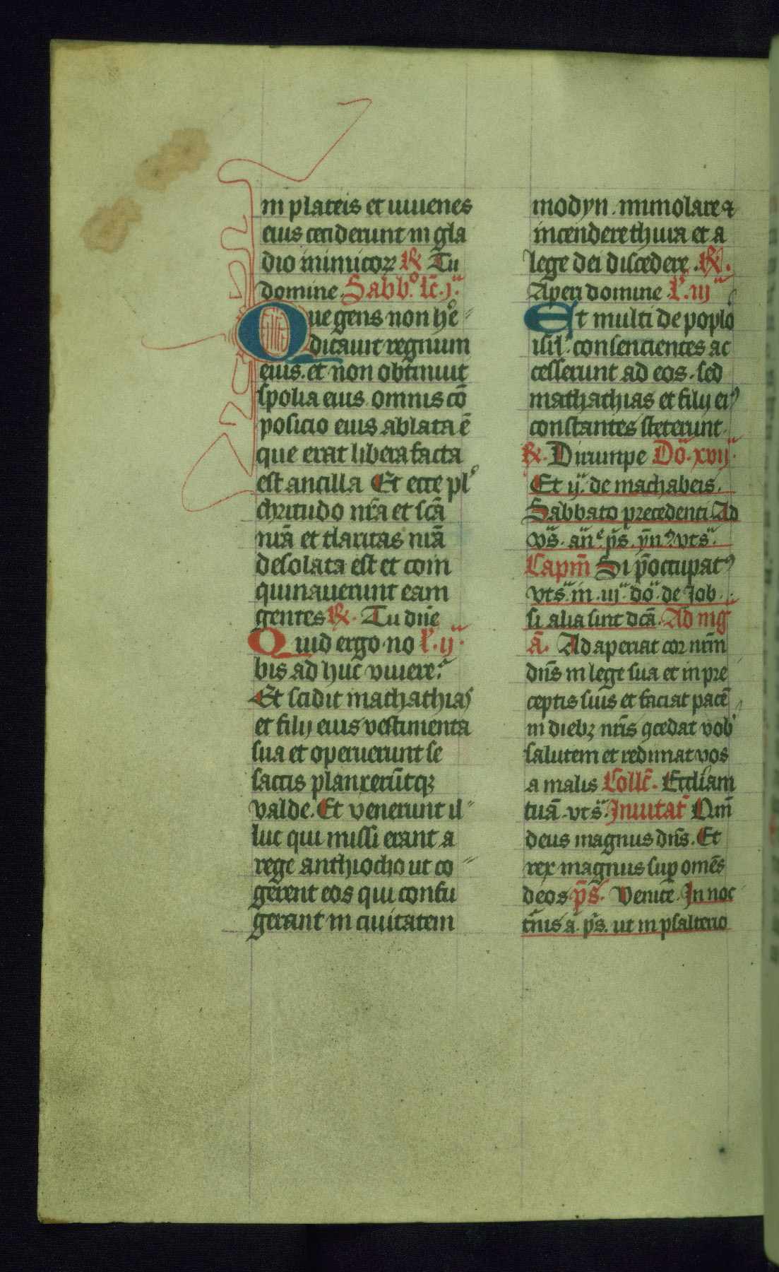 This small breviary, composed of more than 500 folios, is extraordinary for its length, considering it is the summer portion of a two-volume breviary for the use of Liège. The manuscript was completed for ecclesiastical use at the Cathedral of Notre-Dame and St.-Lambert in Liège ca. 1420. This attribution is suggested, for instance, by the petitions to the congregation of this cathedral (fols. 114v-117v), as well as the armorial shield of the family of Surlet de Chokier of Liège represented at the opening of the Psalms. The manuscript has modest, but interesting, decoration with historiated and decorated initials marking the liturgical texts, and occasional angels playing instruments in the margins. The most notable pictorial effect is found in the initials inhabited by transparent figures on rich blue ground. The technique is found, for instance, on fol. 156r with the gold monstrance held by translucent angels for the feast of the Corpus Christi.