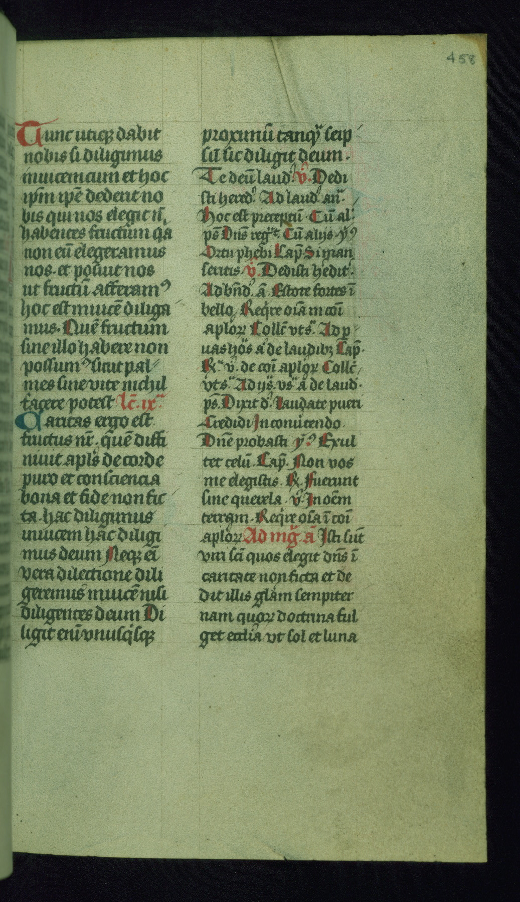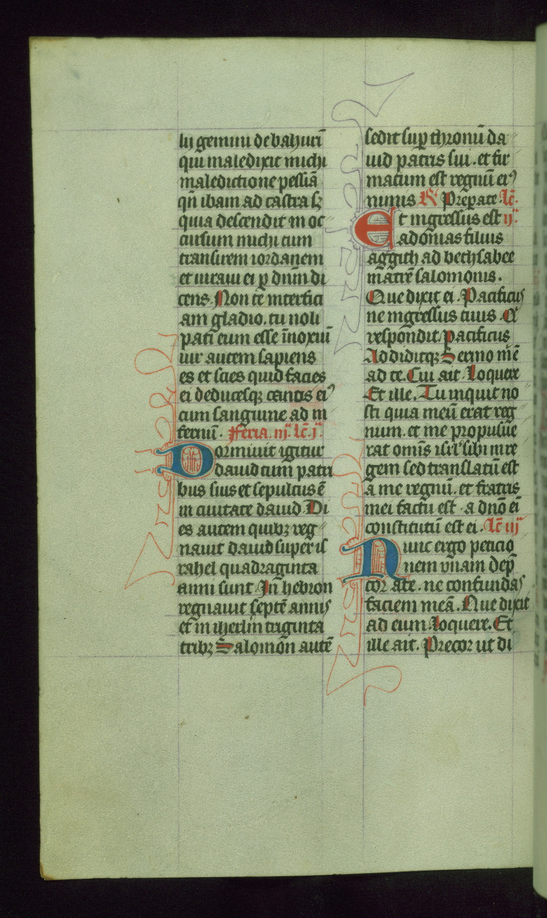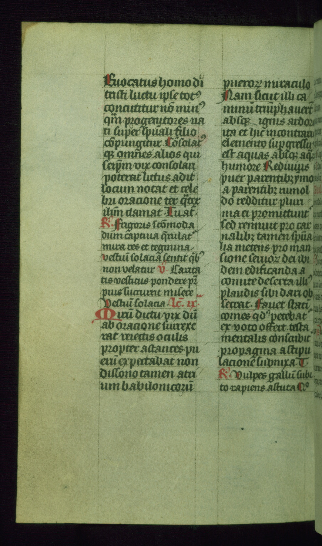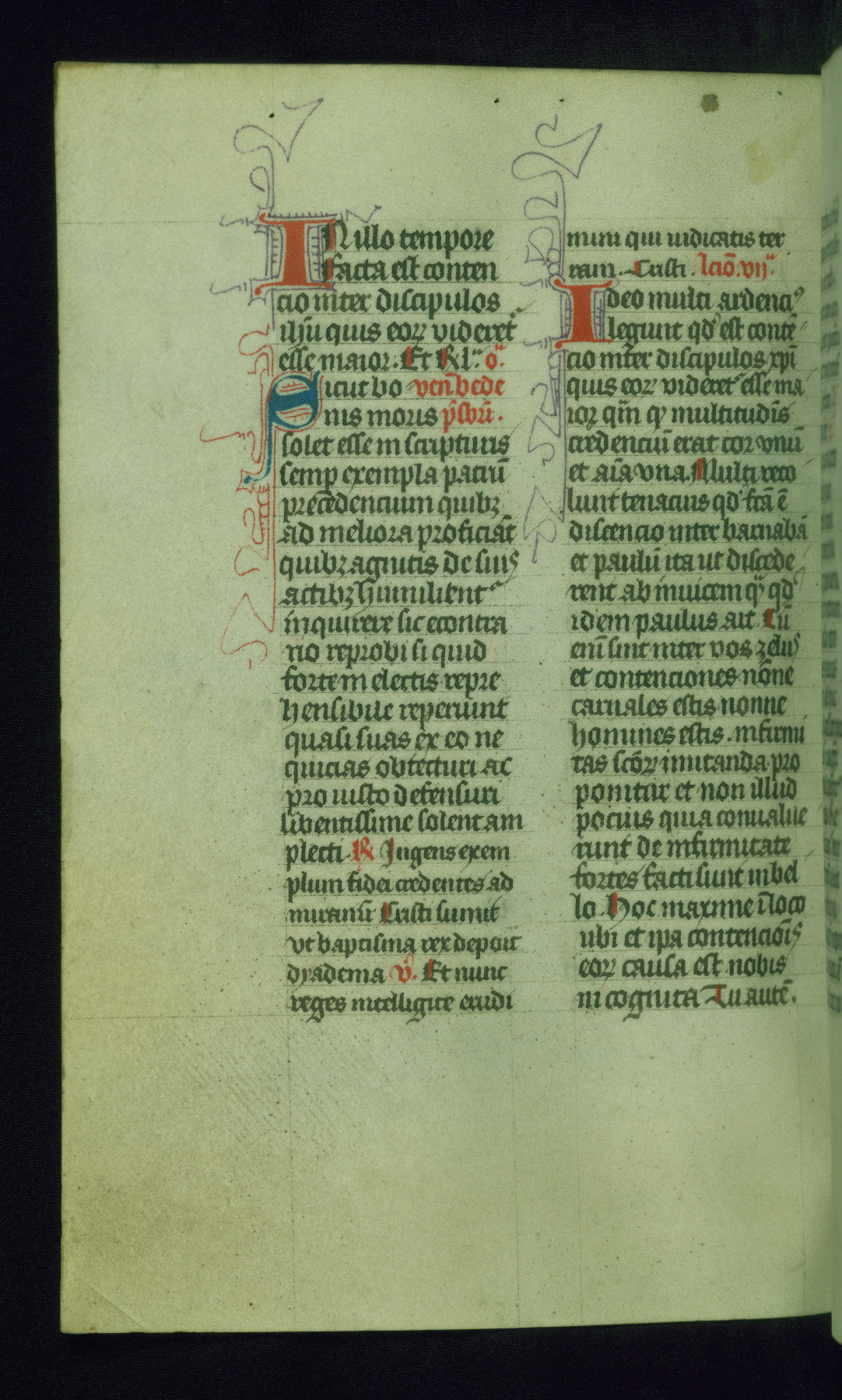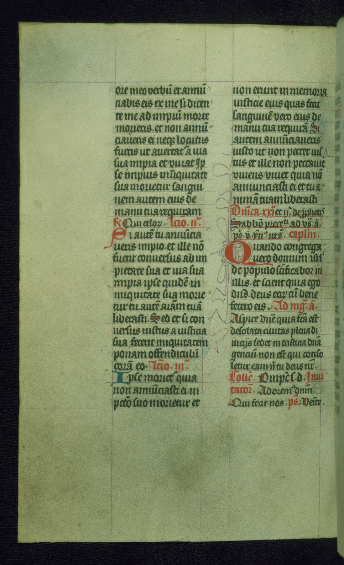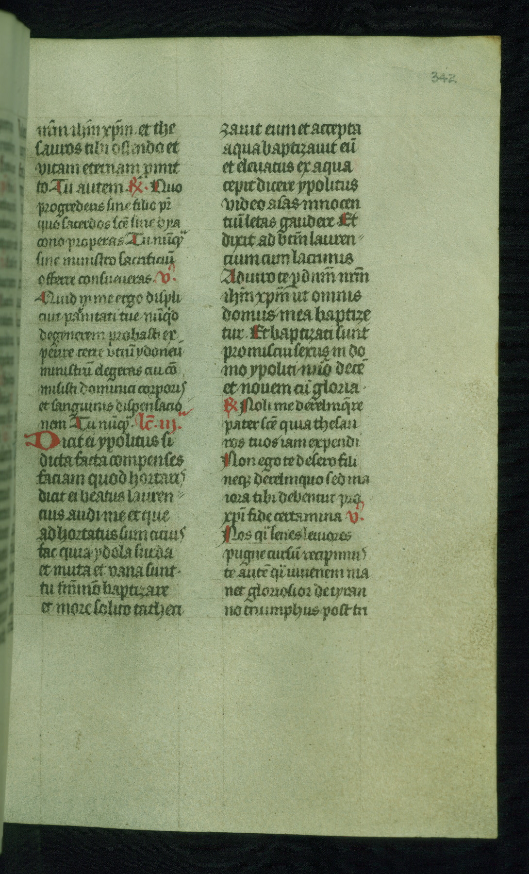 This small breviary, composed of more than 500 folios, is extraordinary for its length, considering it is the summer portion of a two-volume breviary for the use of Liège. The manuscript was completed for ecclesiastical use at the Cathedral of Notre-Dame and St.-Lambert in Liège ca. 1420. This attribution is suggested, for instance, by the petitions to the congregation of this cathedral (fols. 114v-117v), as well as the armorial shield of the family of Surlet de Chokier of Liège represented at the opening of the Psalms. The manuscript has modest, but interesting, decoration with historiated and decorated initials marking the liturgical texts, and occasional angels playing instruments in the margins. The most notable pictorial effect is found in the initials inhabited by transparent figures on rich blue ground. The technique is found, for instance, on fol. 156r with the gold monstrance held by translucent angels for the feast of the Corpus Christi.