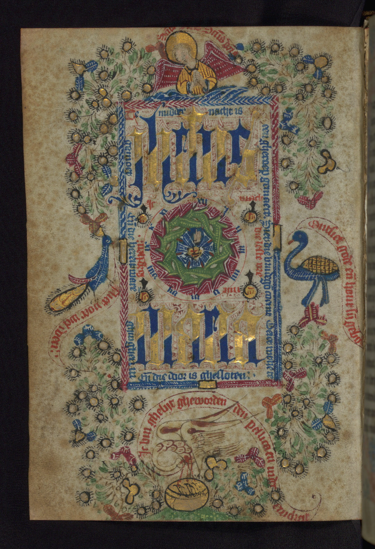 - Decoration note: Full-page illumination of a clock incorporating a wreath in the center; a border of scrolling flowers and leaves punctuated with golden bezants frames the page, with imagery including an angel, a peacock, an ostrich, and a pelican feeding its young