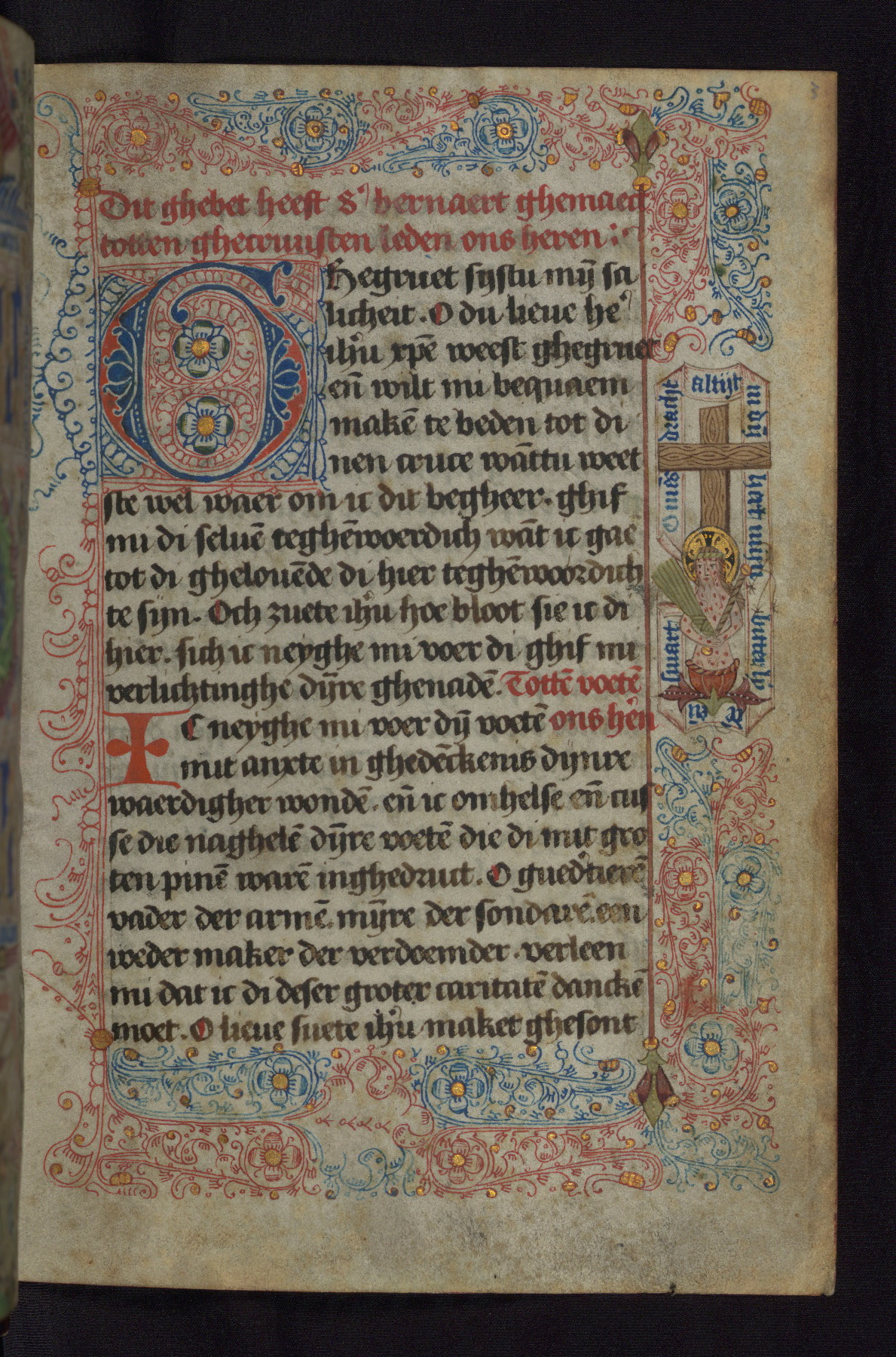 - Decoration note: One full-page miniature facing folio with decorated border with Christ and the instruments of the Passion; initials with blue and red penwork designs on the external margin mark major divisions of the text (3 to 5 lines); capital letters in blue or red for minor divisions (2 to 4 lines); rubrics in red, text in black ink