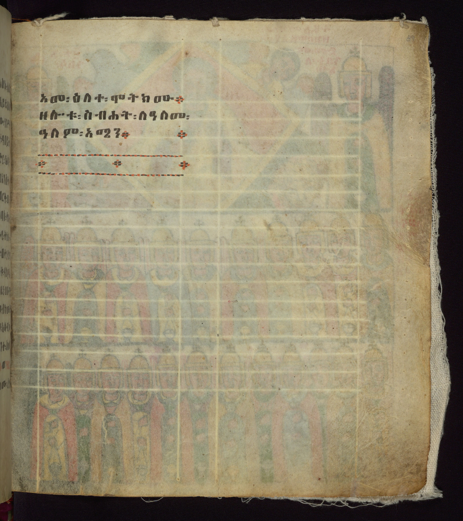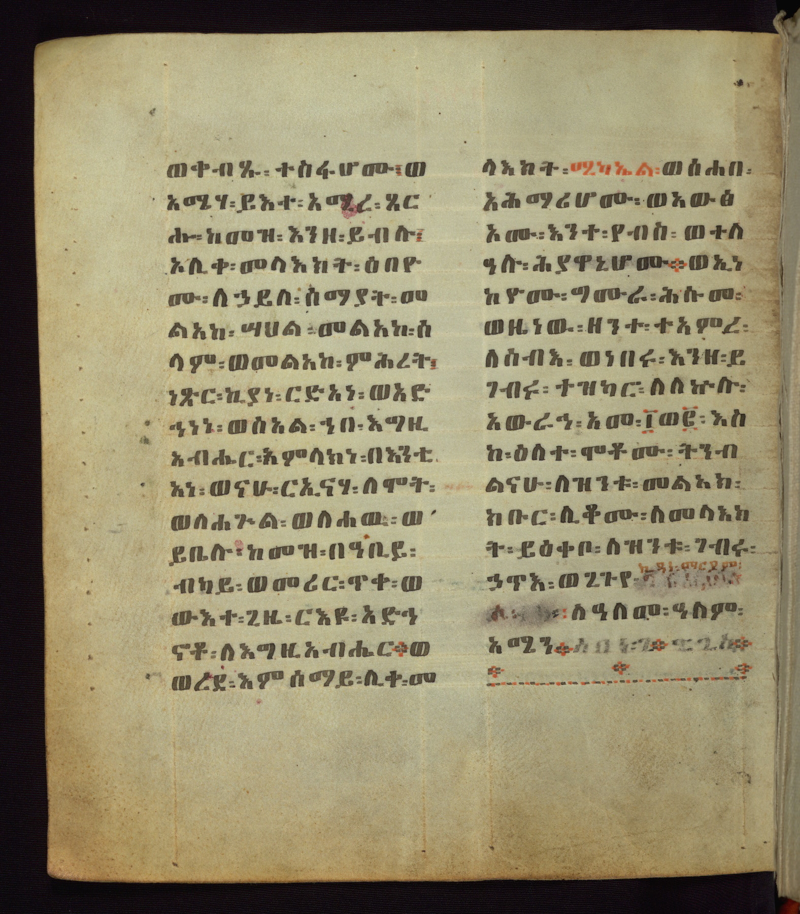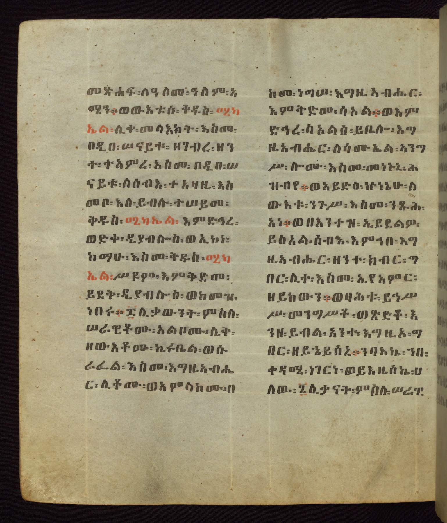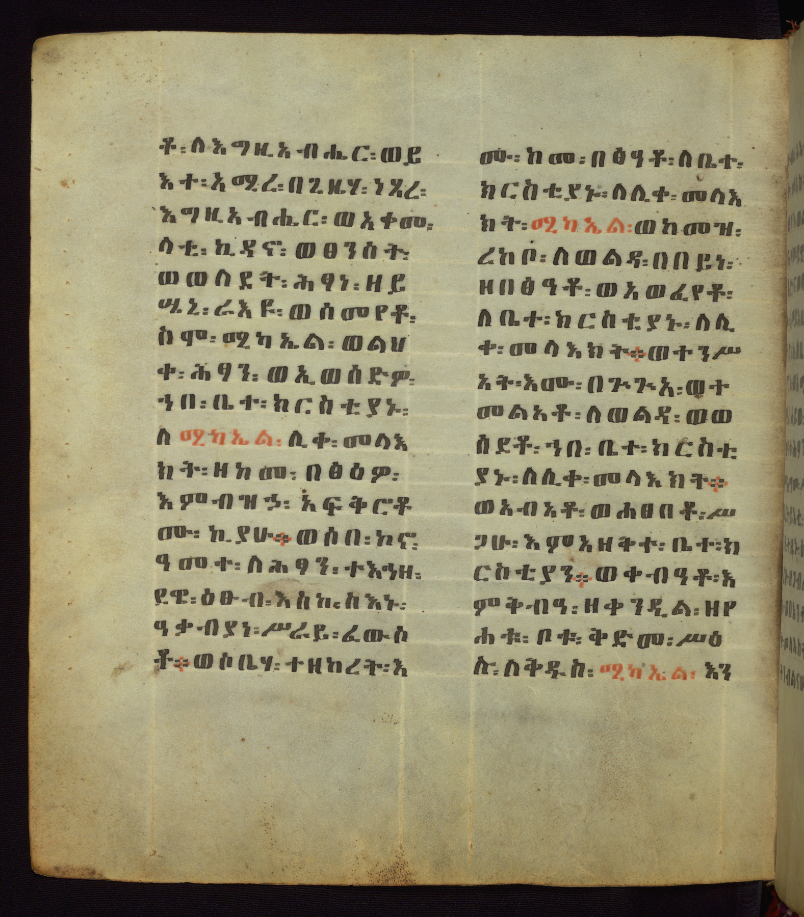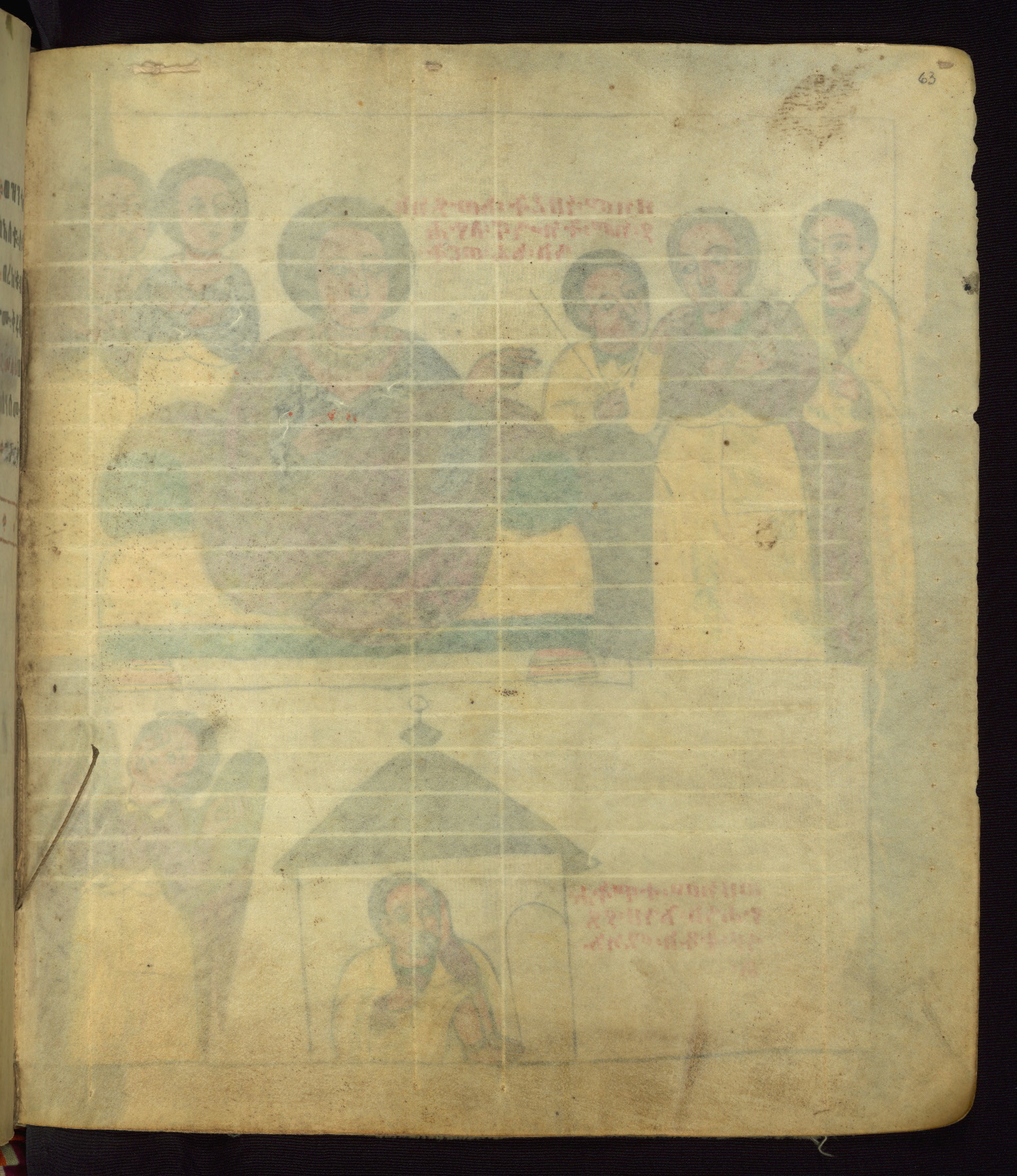 This Homiliary was created in Gondar, Ethiopia, during a period of artistic flowering in the late seventeenth century. The Imperial court and its accompanying aristocracy took up permanent residence in Gondar at this time, and the taste of these wealthy patrons for paintings and extensive image cycles is exemplified by this richly illuminated manuscript. The text, a Homiliary focused on the Miracles of the Archangel Michael, combines liturgical readings with forty-nine brightly colored renderings of God, St. Michael, and the miracles related in the text. Sections of the manuscript would have been read aloud on monthly feast days of the Archangel, and the images would have punctuated the readings. The artists were likely trained as painters, rather than solely as manuscript illuminators, and their art can therefore be linked stylistically to contemporary mural painting.