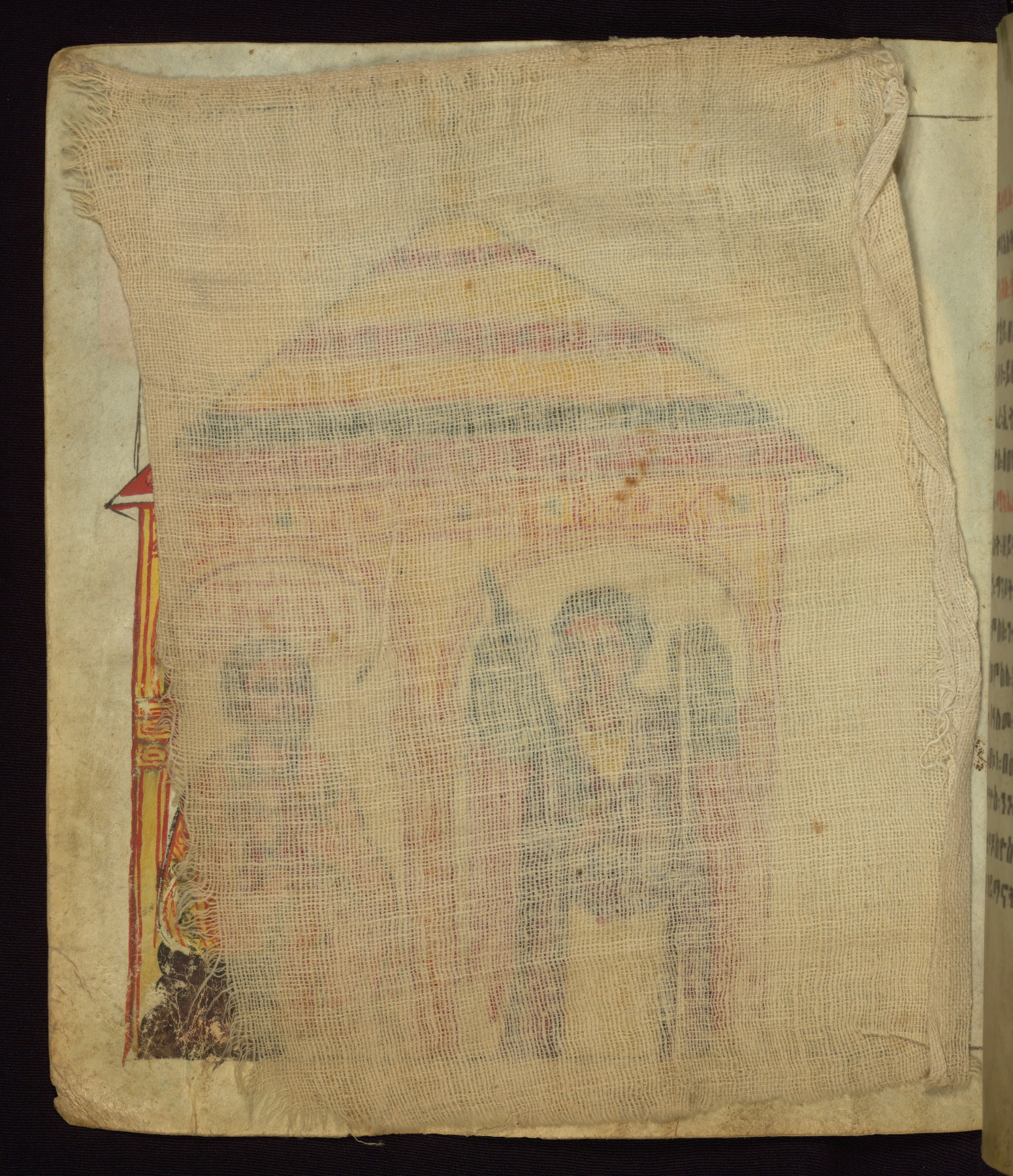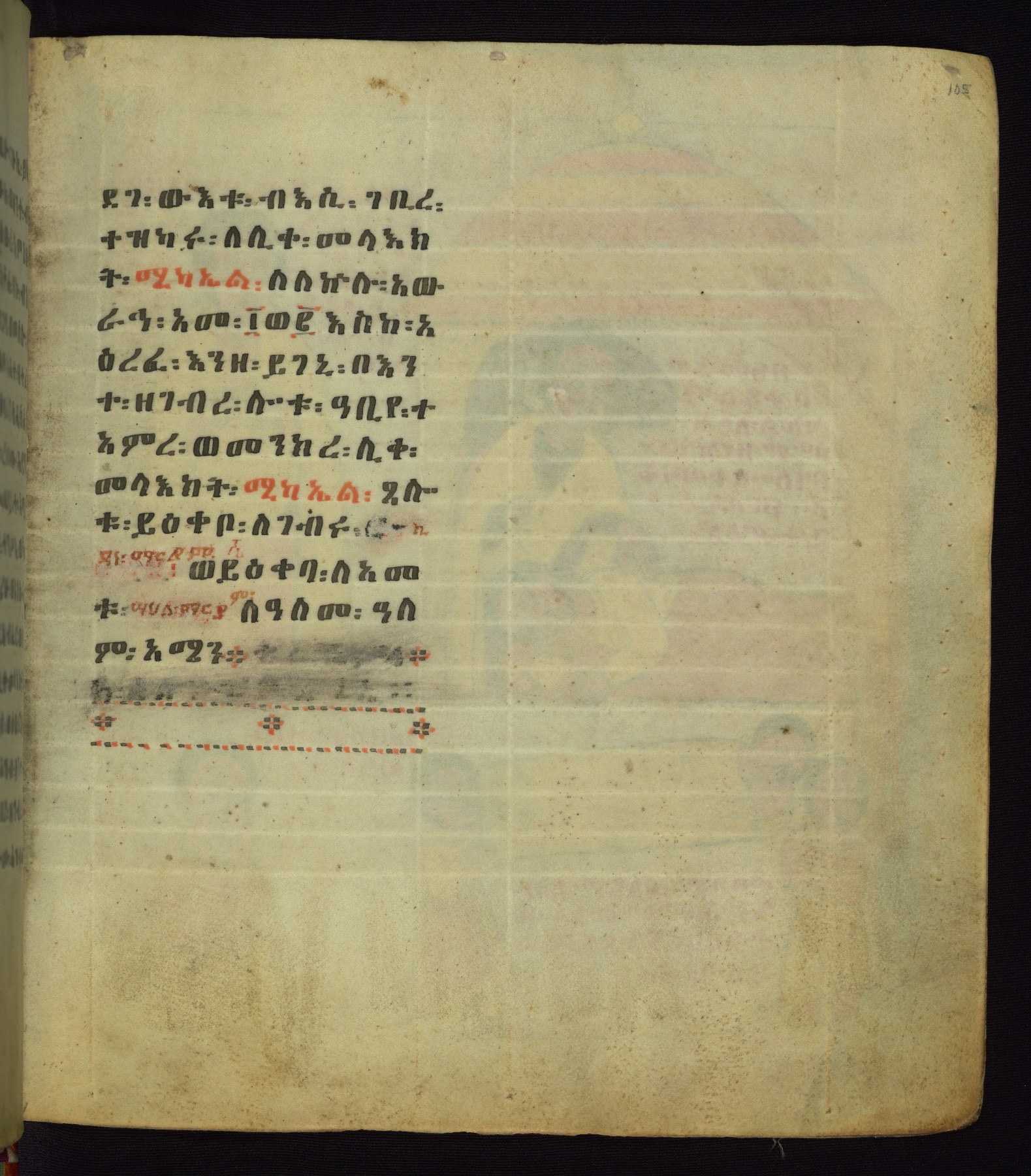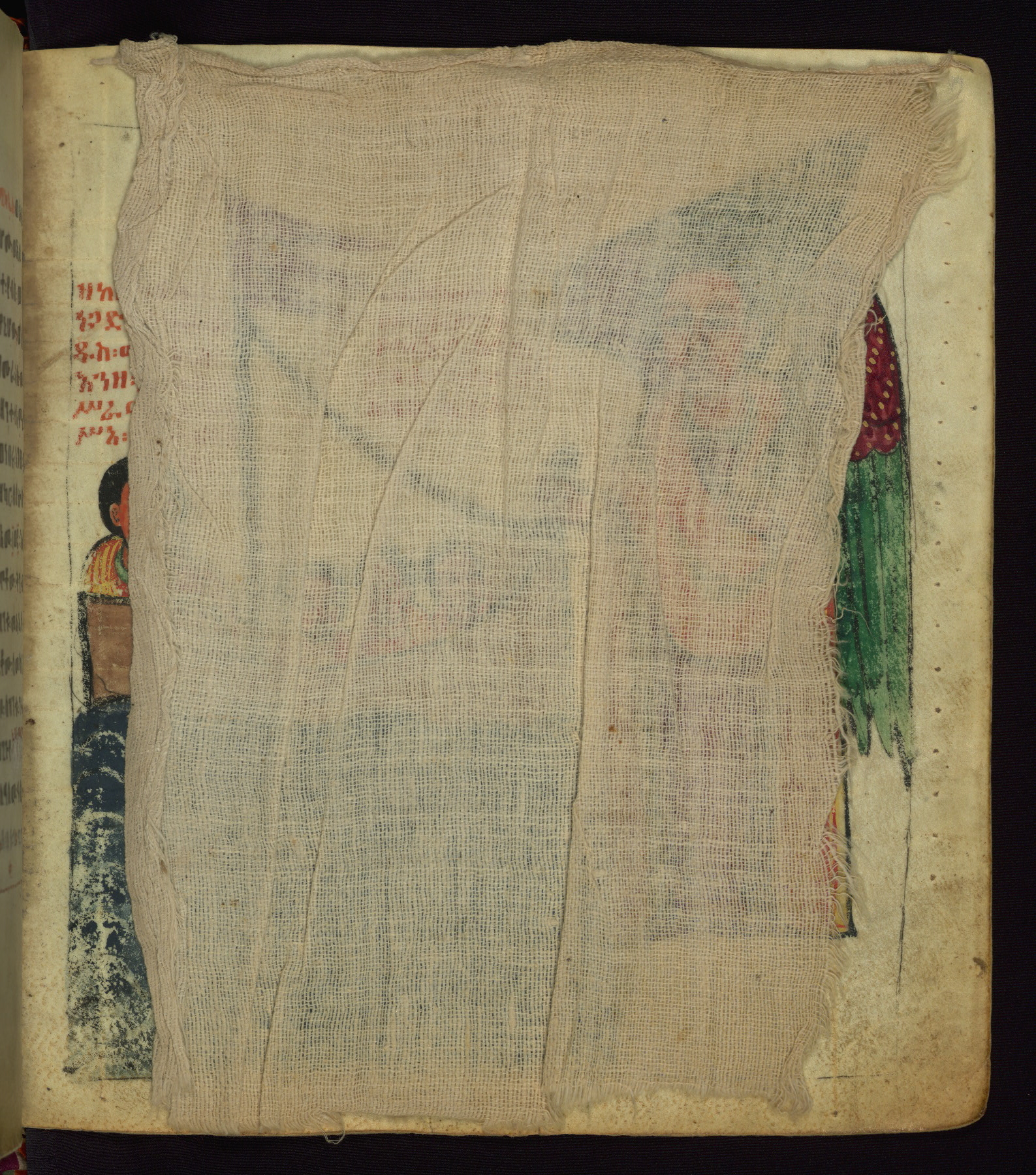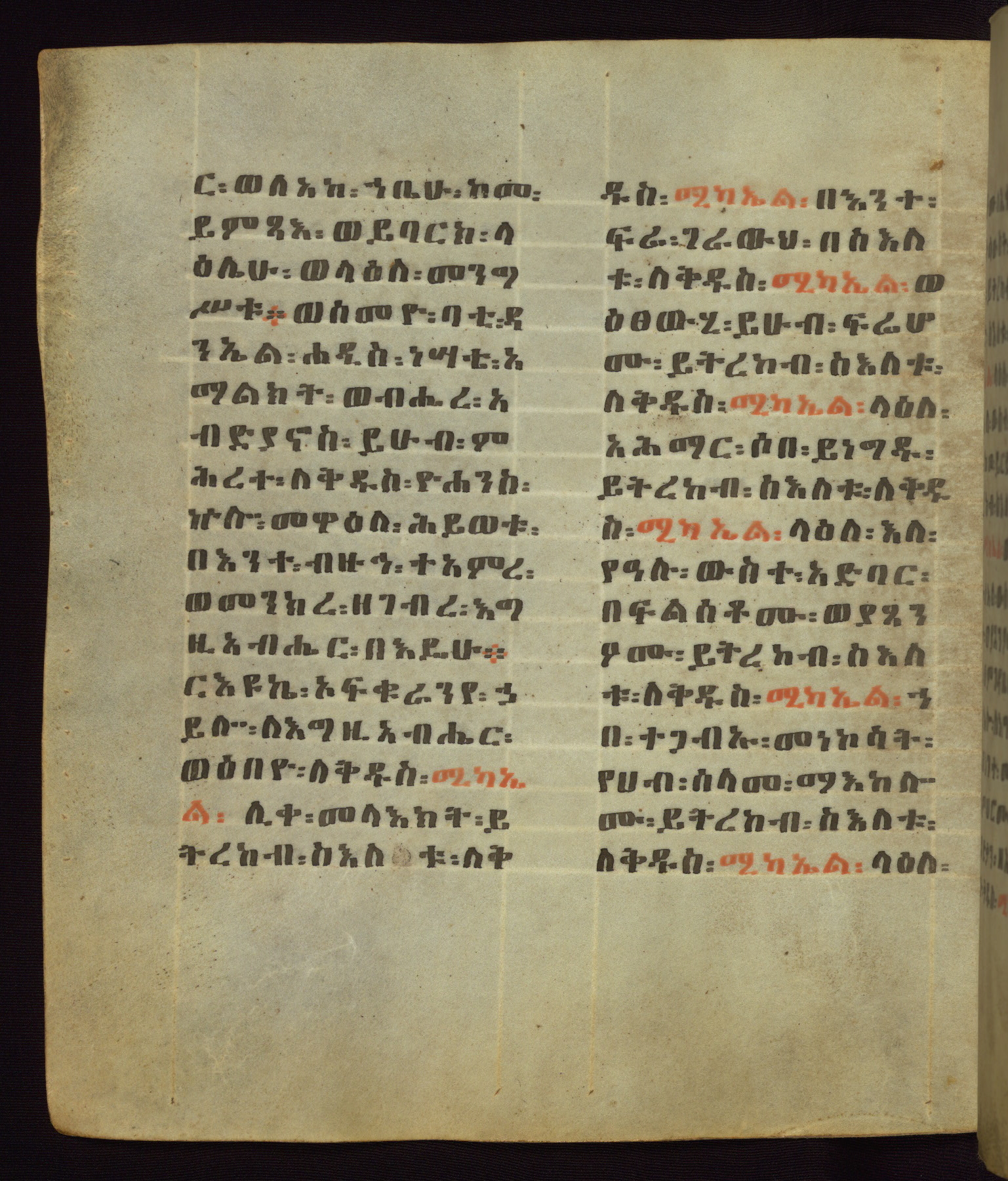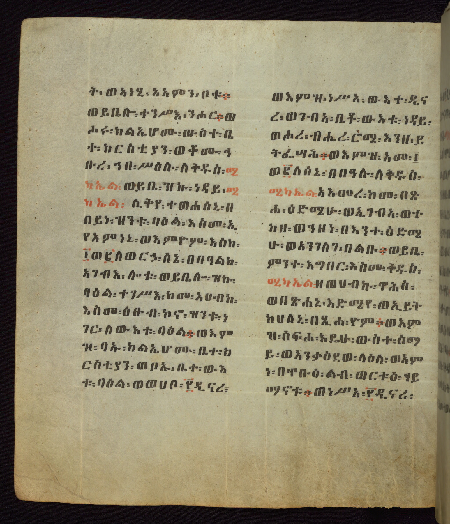 This Homiliary was created in Gondar, Ethiopia, during a period of artistic flowering in the late seventeenth century. The Imperial court and its accompanying aristocracy took up permanent residence in Gondar at this time, and the taste of these wealthy patrons for paintings and extensive image cycles is exemplified by this richly illuminated manuscript. The text, a Homiliary focused on the Miracles of the Archangel Michael, combines liturgical readings with forty-nine brightly colored renderings of God, St. Michael, and the miracles related in the text. Sections of the manuscript would have been read aloud on monthly feast days of the Archangel, and the images would have punctuated the readings. The artists were likely trained as painters, rather than solely as manuscript illuminators, and their art can therefore be linked stylistically to contemporary mural painting.