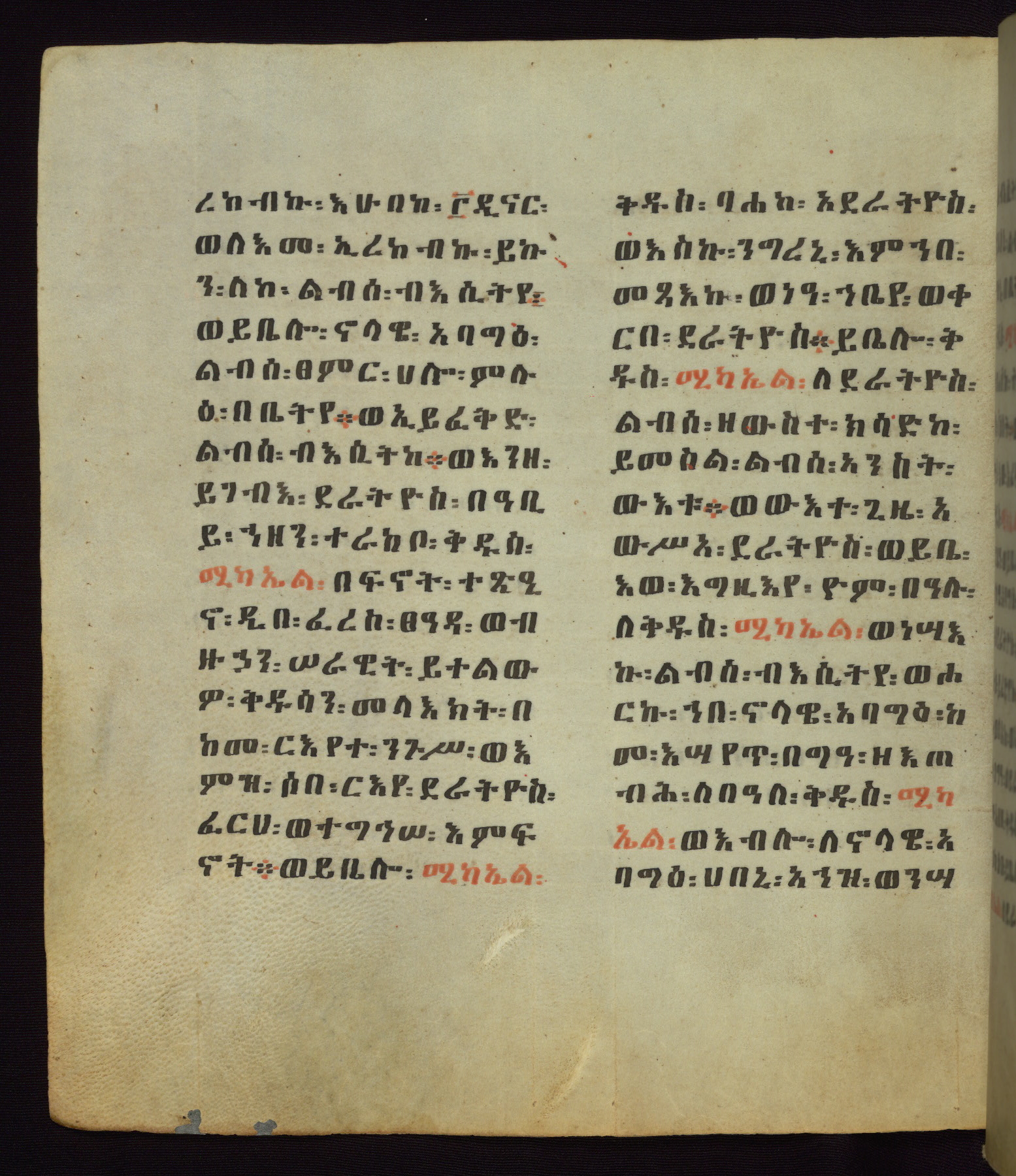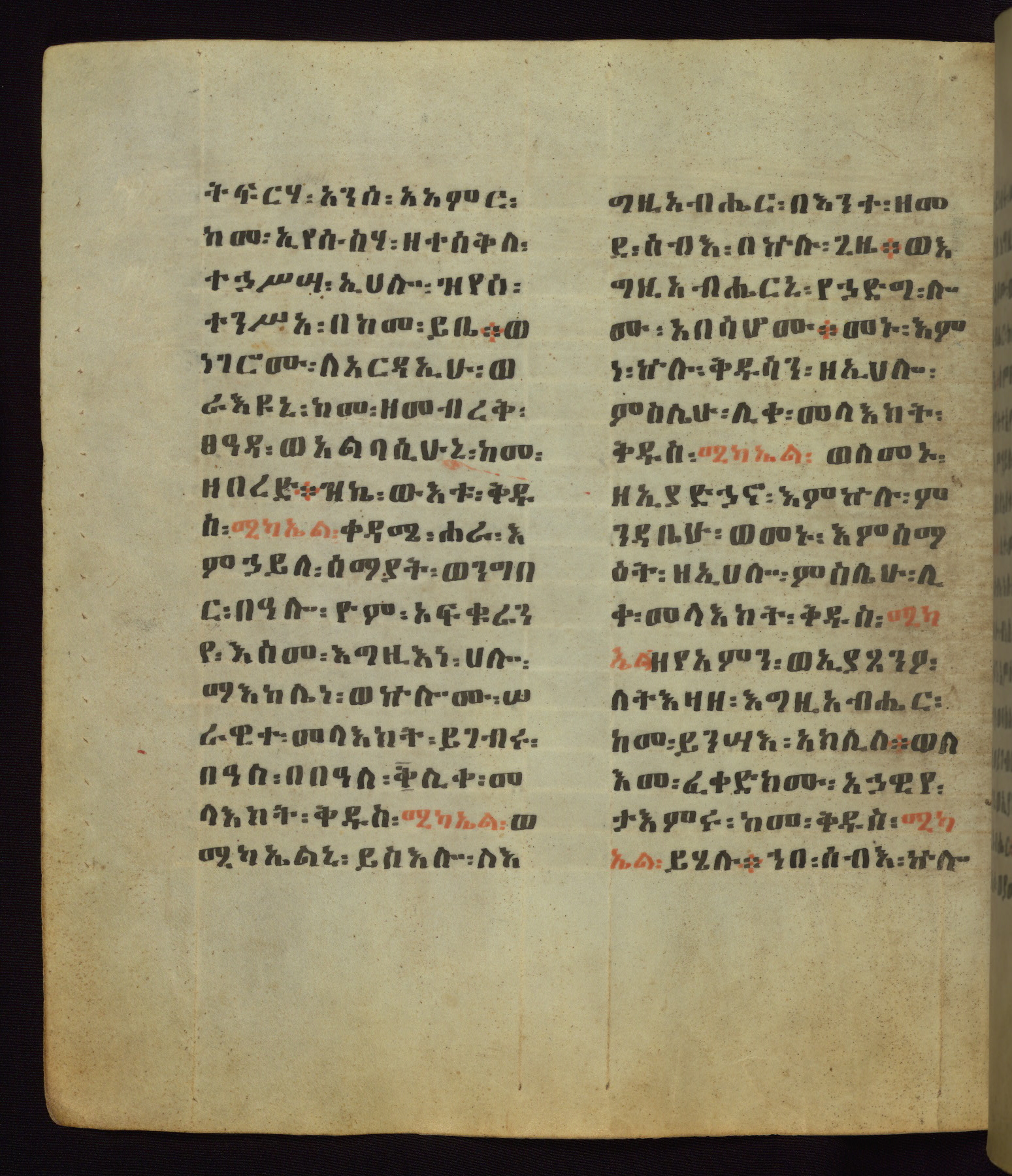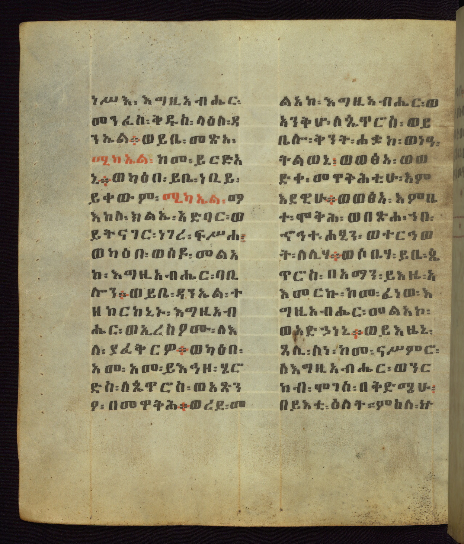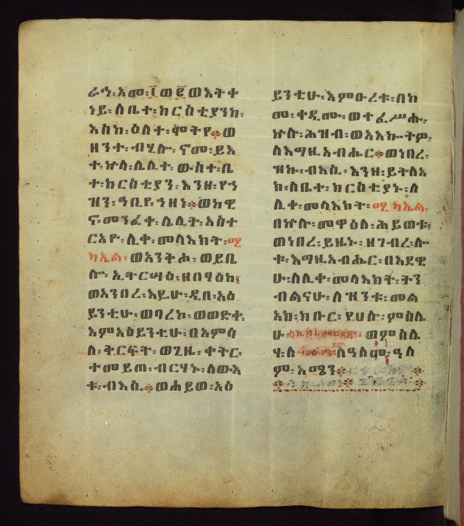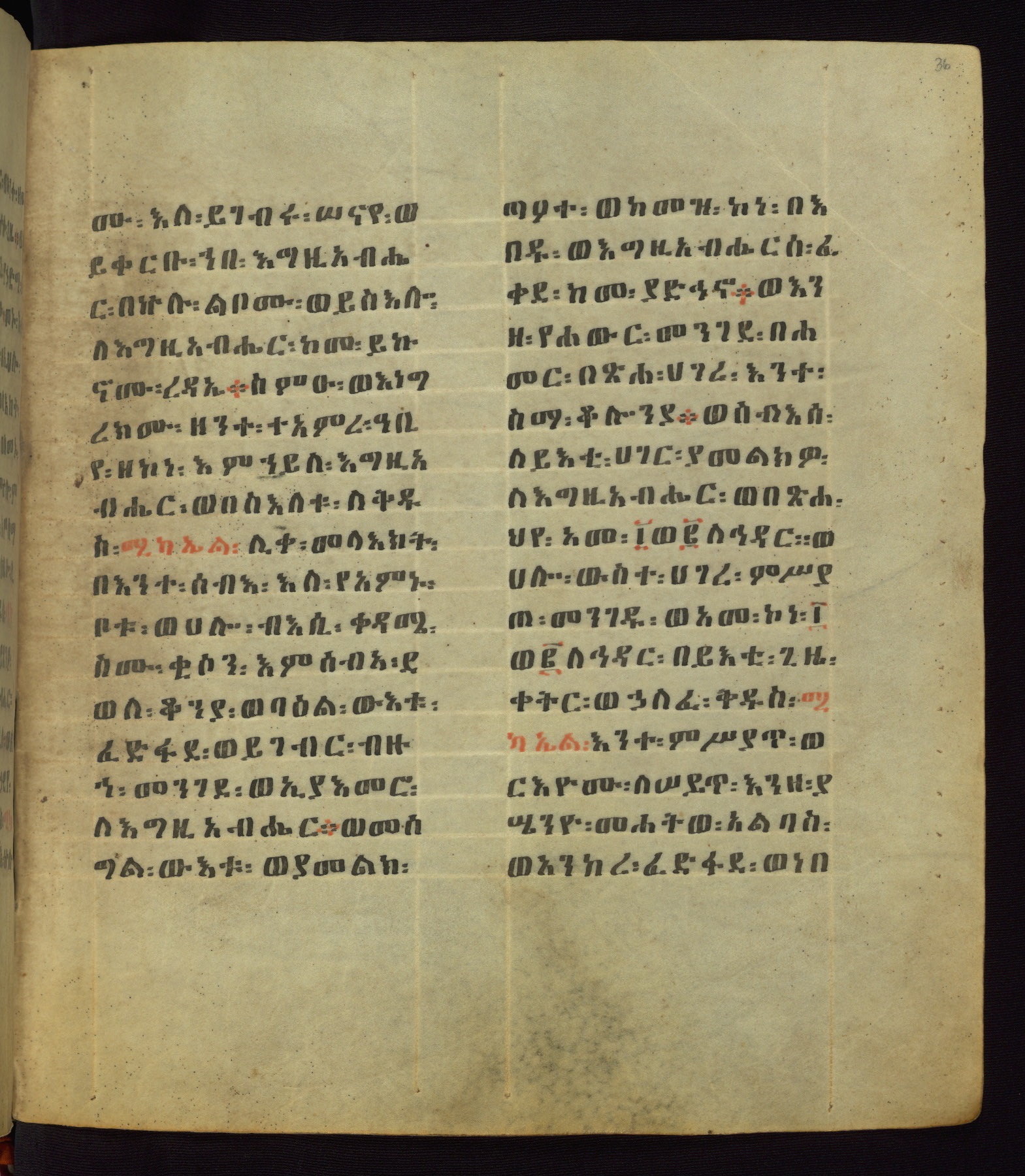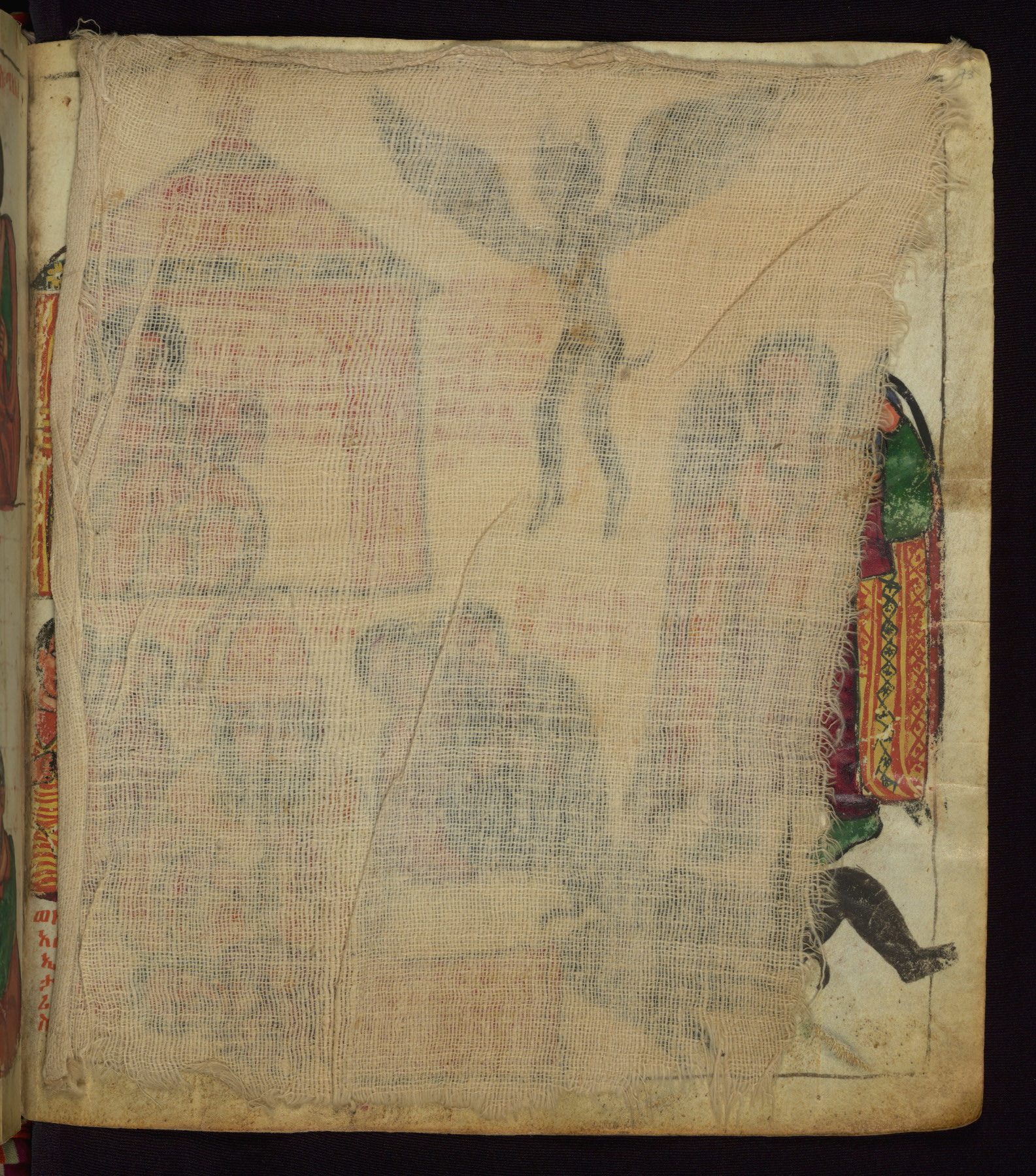 This Homiliary was created in Gondar, Ethiopia, during a period of artistic flowering in the late seventeenth century. The Imperial court and its accompanying aristocracy took up permanent residence in Gondar at this time, and the taste of these wealthy patrons for paintings and extensive image cycles is exemplified by this richly illuminated manuscript. The text, a Homiliary focused on the Miracles of the Archangel Michael, combines liturgical readings with forty-nine brightly colored renderings of God, St. Michael, and the miracles related in the text. Sections of the manuscript would have been read aloud on monthly feast days of the Archangel, and the images would have punctuated the readings. The artists were likely trained as painters, rather than solely as manuscript illuminators, and their art can therefore be linked stylistically to contemporary mural painting.