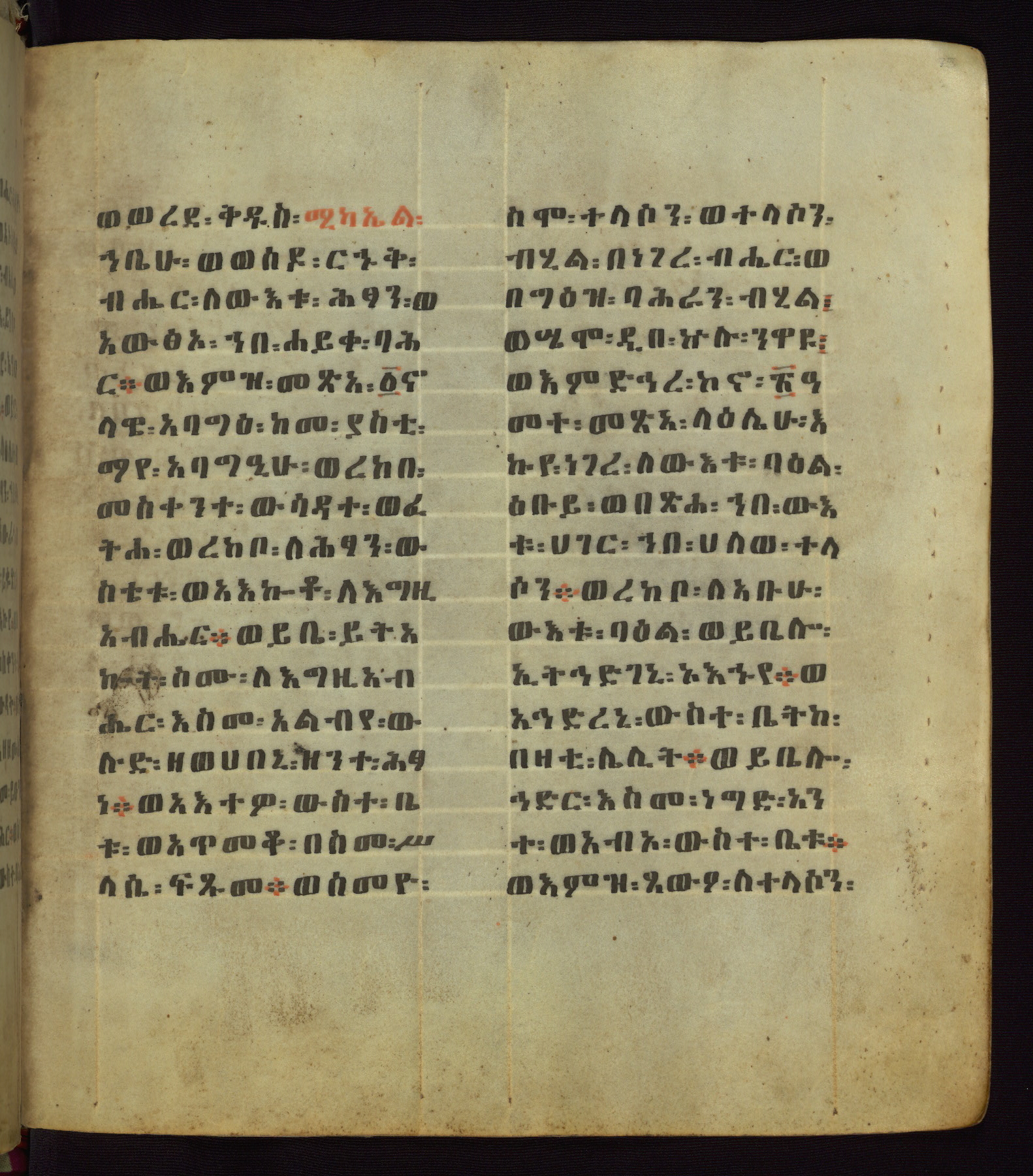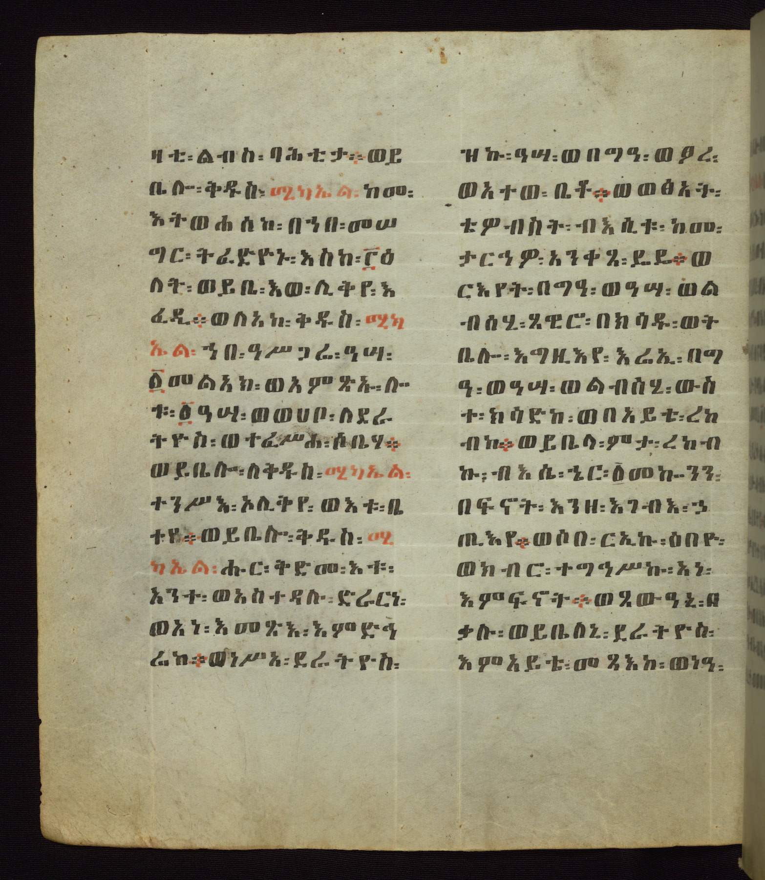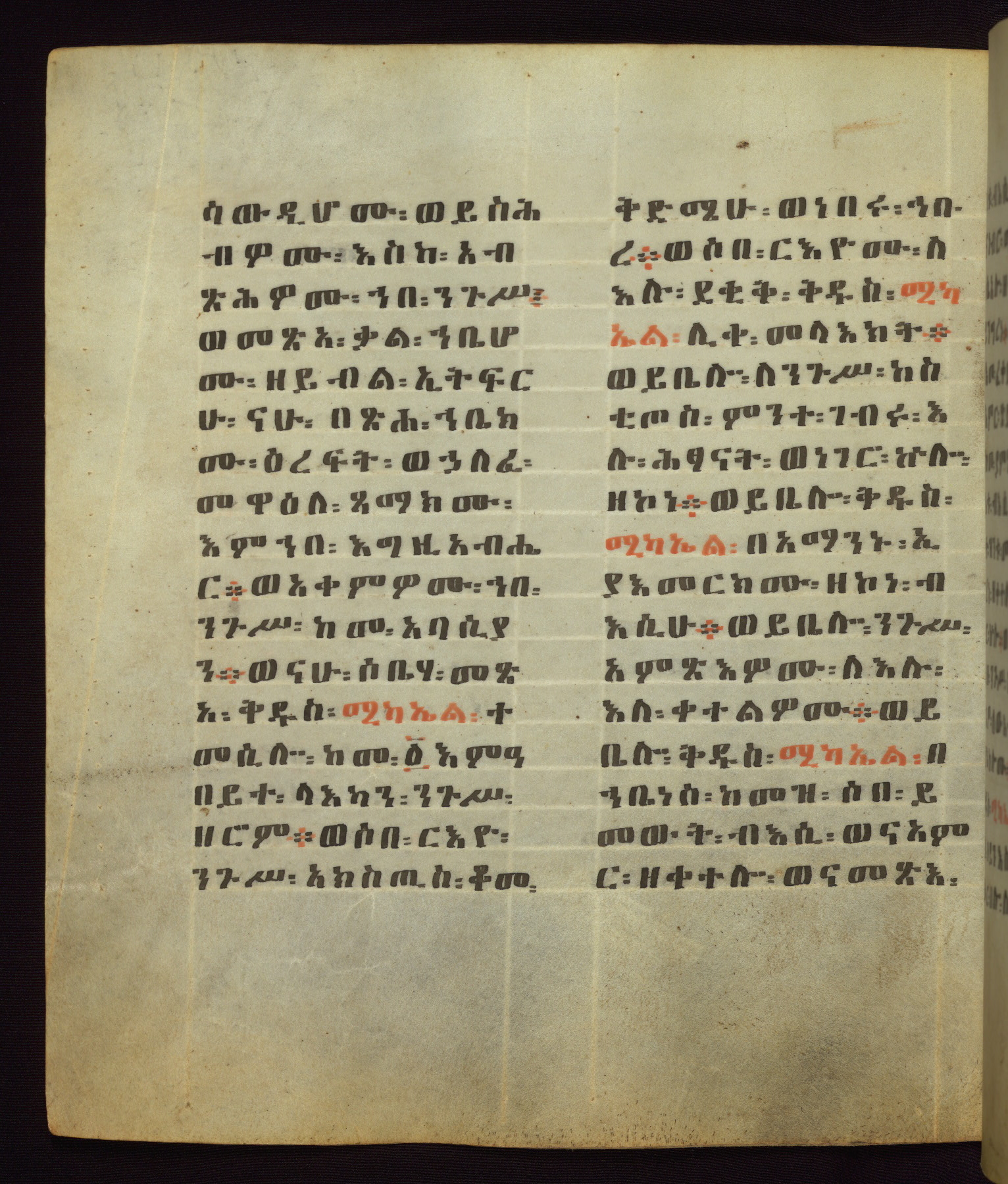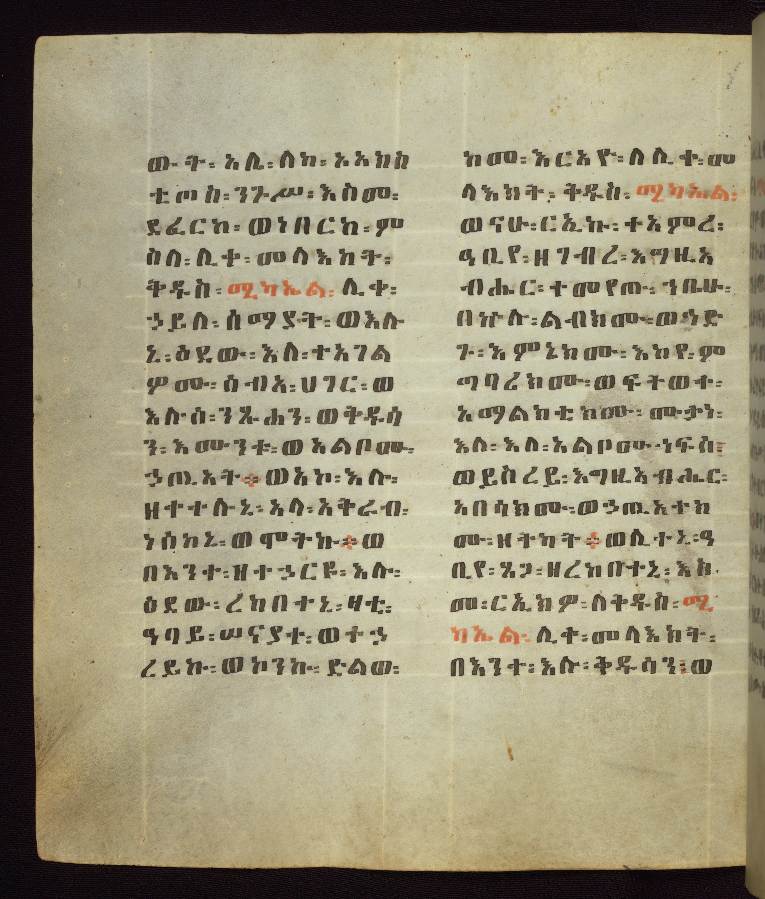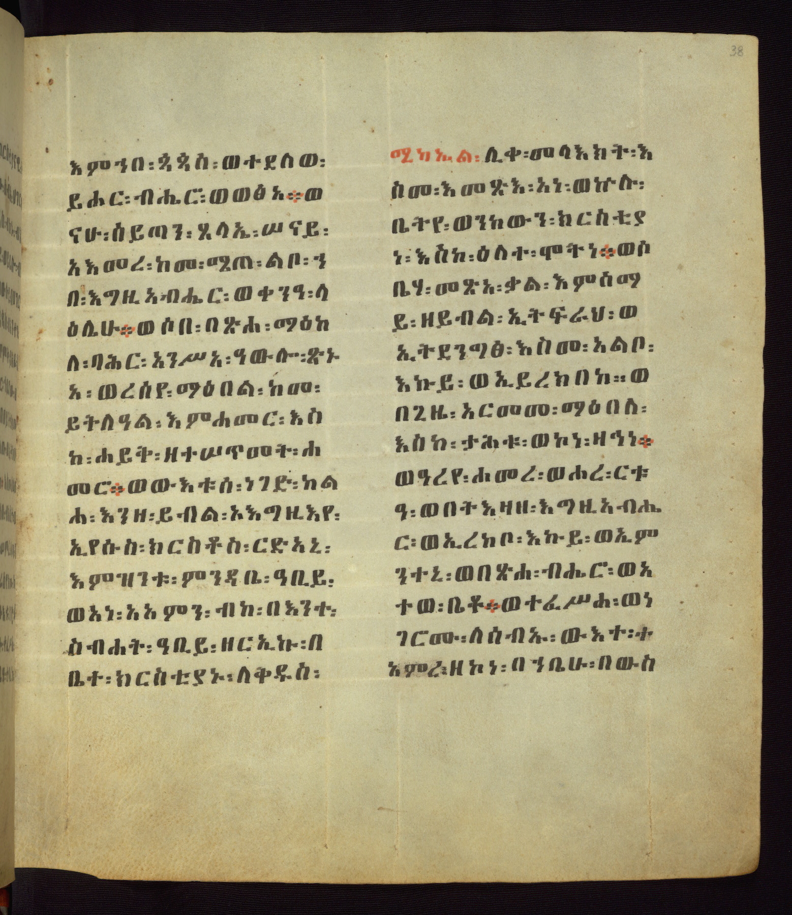 This Homiliary was created in Gondar, Ethiopia, during a period of artistic flowering in the late seventeenth century. The Imperial court and its accompanying aristocracy took up permanent residence in Gondar at this time, and the taste of these wealthy patrons for paintings and extensive image cycles is exemplified by this richly illuminated manuscript. The text, a Homiliary focused on the Miracles of the Archangel Michael, combines liturgical readings with forty-nine brightly colored renderings of God, St. Michael, and the miracles related in the text. Sections of the manuscript would have been read aloud on monthly feast days of the Archangel, and the images would have punctuated the readings. The artists were likely trained as painters, rather than solely as manuscript illuminators, and their art can therefore be linked stylistically to contemporary mural painting.