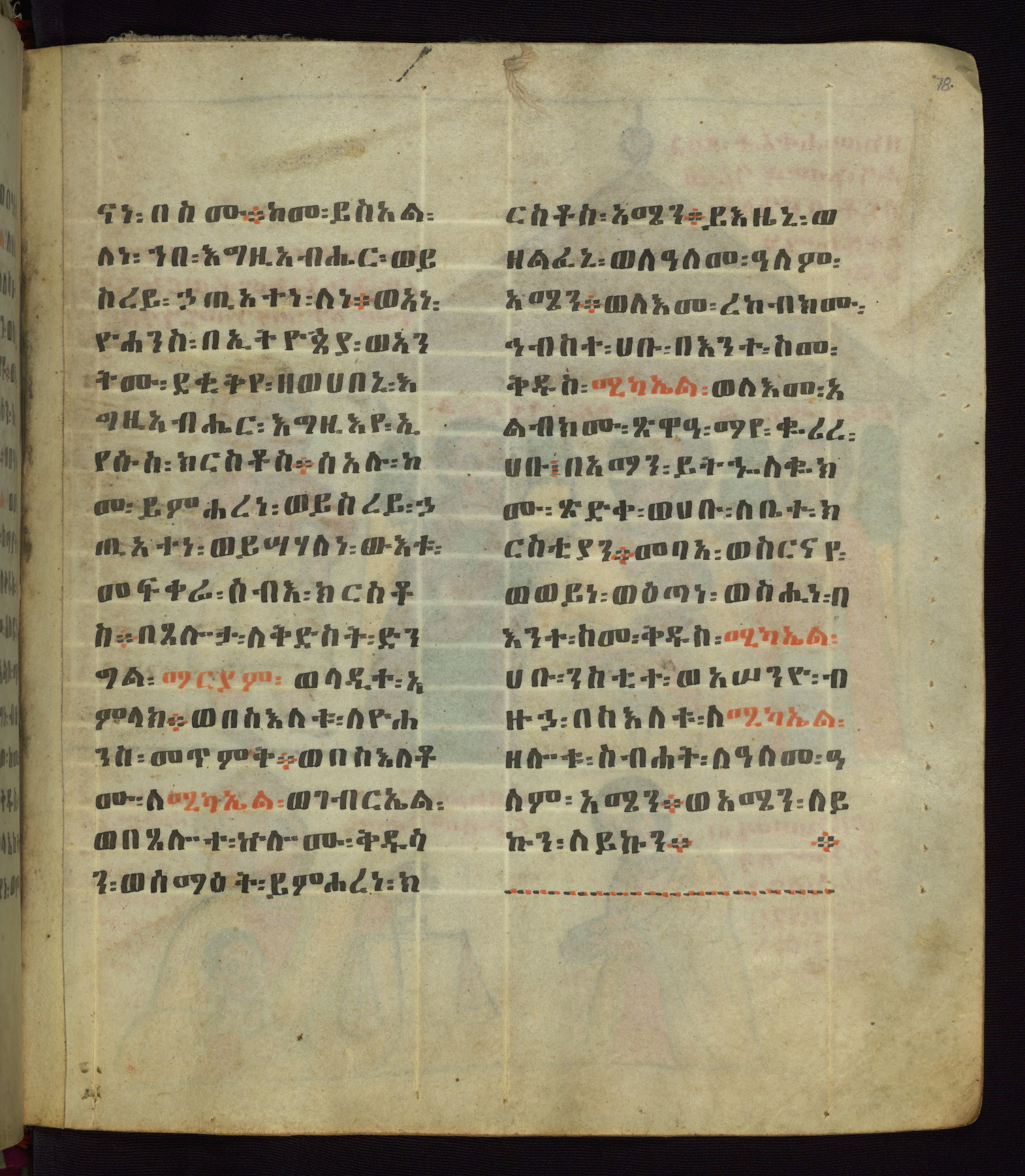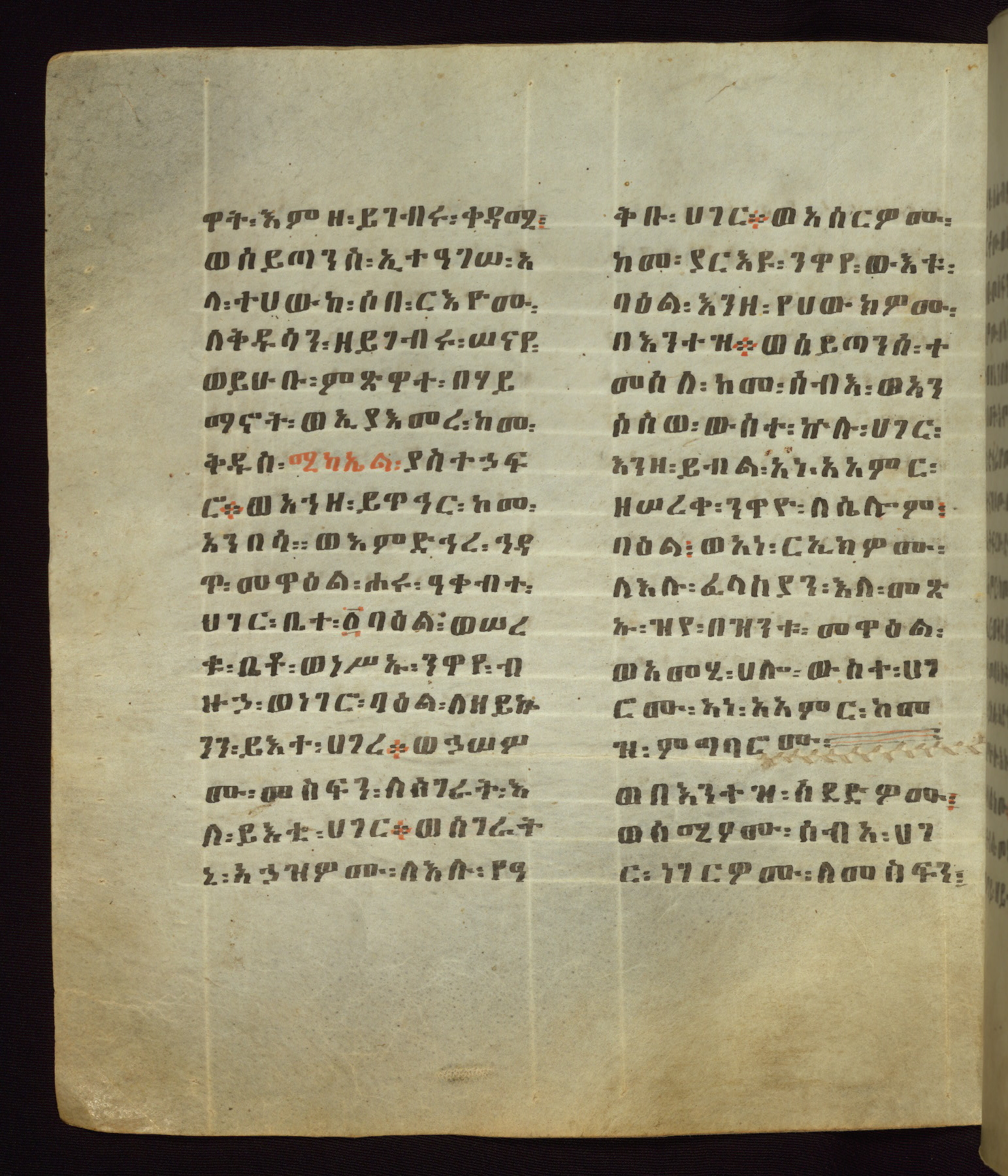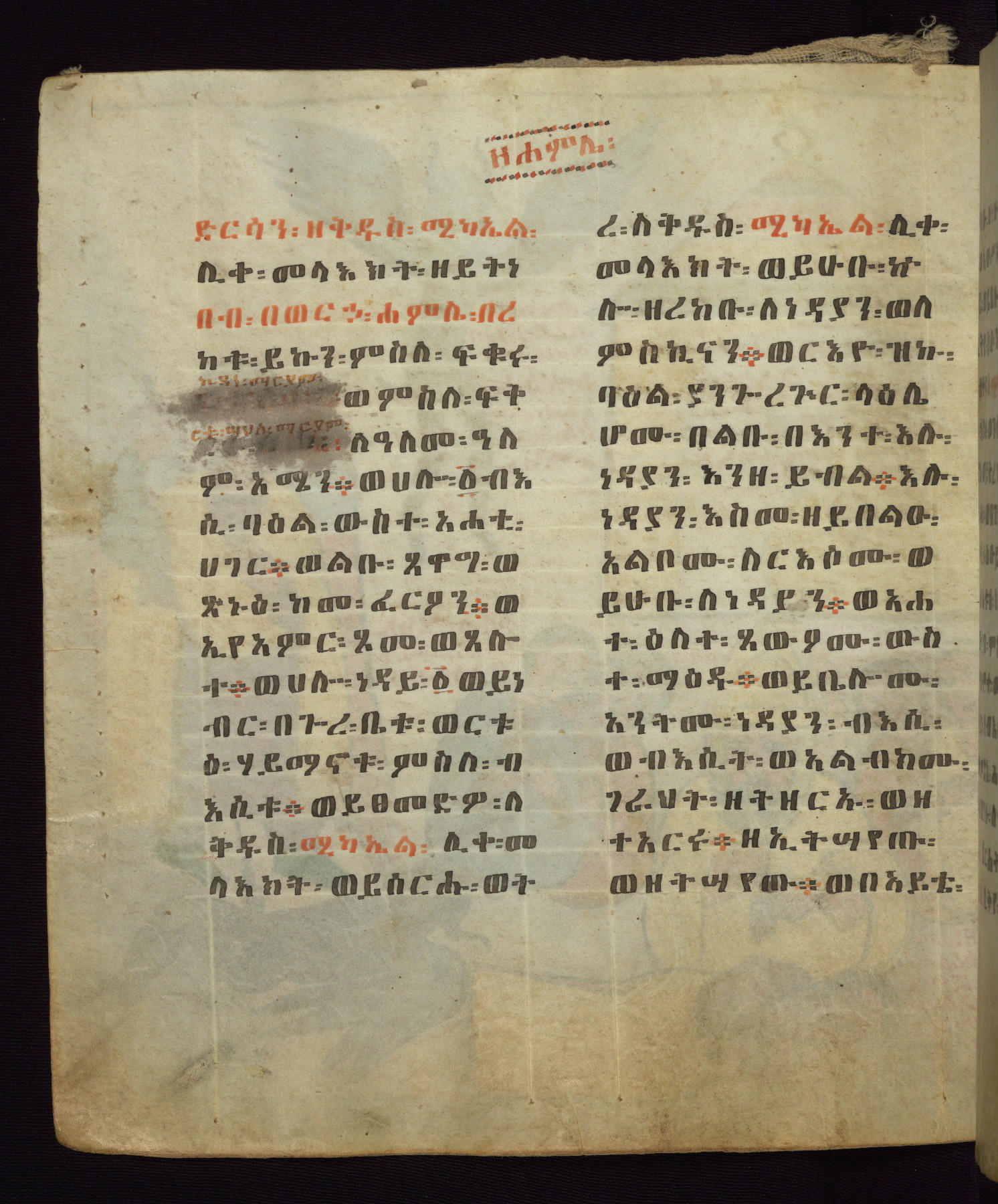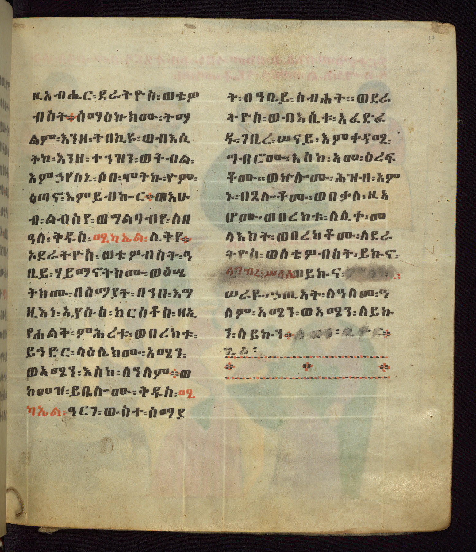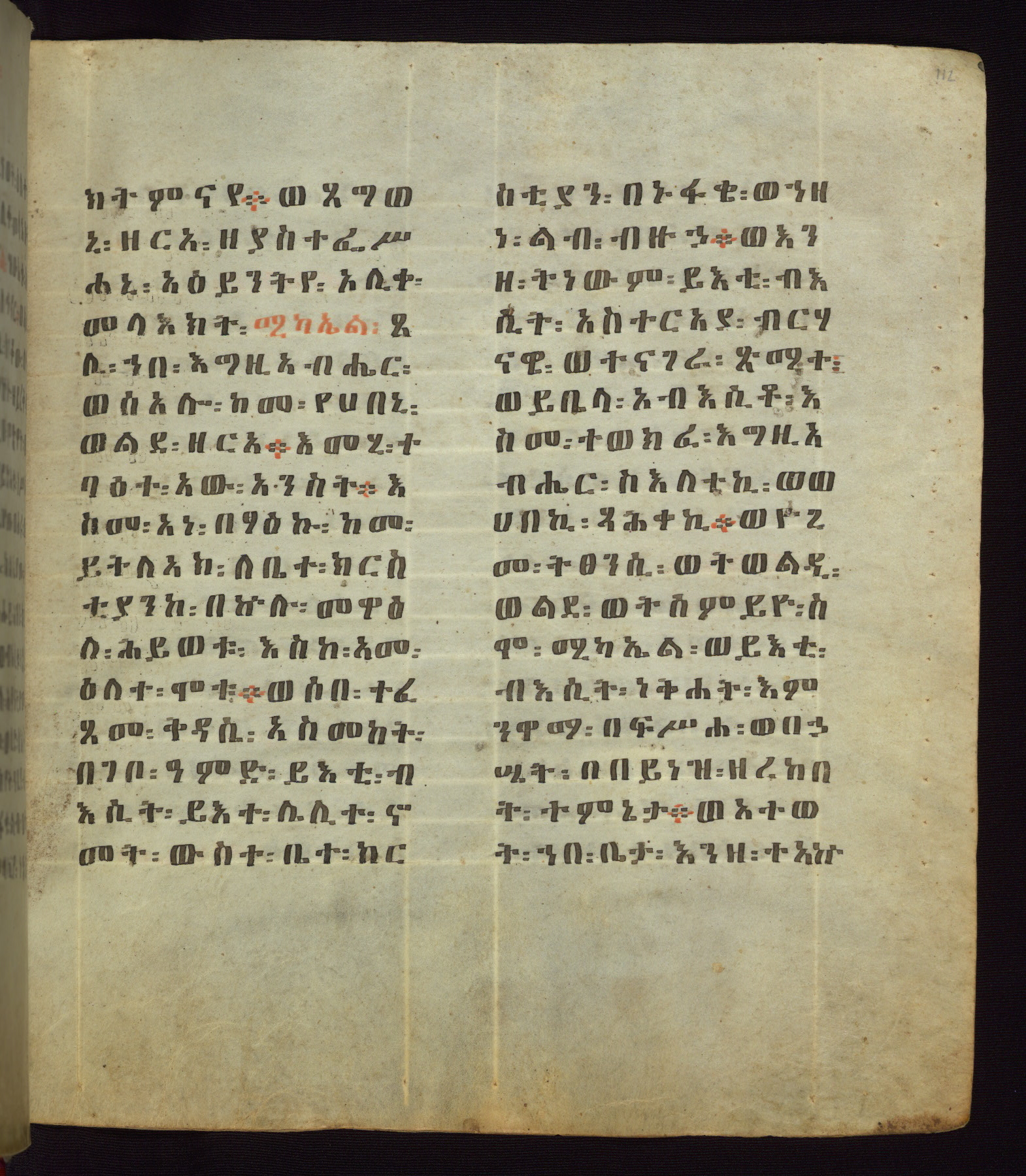 This Homiliary was created in Gondar, Ethiopia, during a period of artistic flowering in the late seventeenth century. The Imperial court and its accompanying aristocracy took up permanent residence in Gondar at this time, and the taste of these wealthy patrons for paintings and extensive image cycles is exemplified by this richly illuminated manuscript. The text, a Homiliary focused on the Miracles of the Archangel Michael, combines liturgical readings with forty-nine brightly colored renderings of God, St. Michael, and the miracles related in the text. Sections of the manuscript would have been read aloud on monthly feast days of the Archangel, and the images would have punctuated the readings. The artists were likely trained as painters, rather than solely as manuscript illuminators, and their art can therefore be linked stylistically to contemporary mural painting.