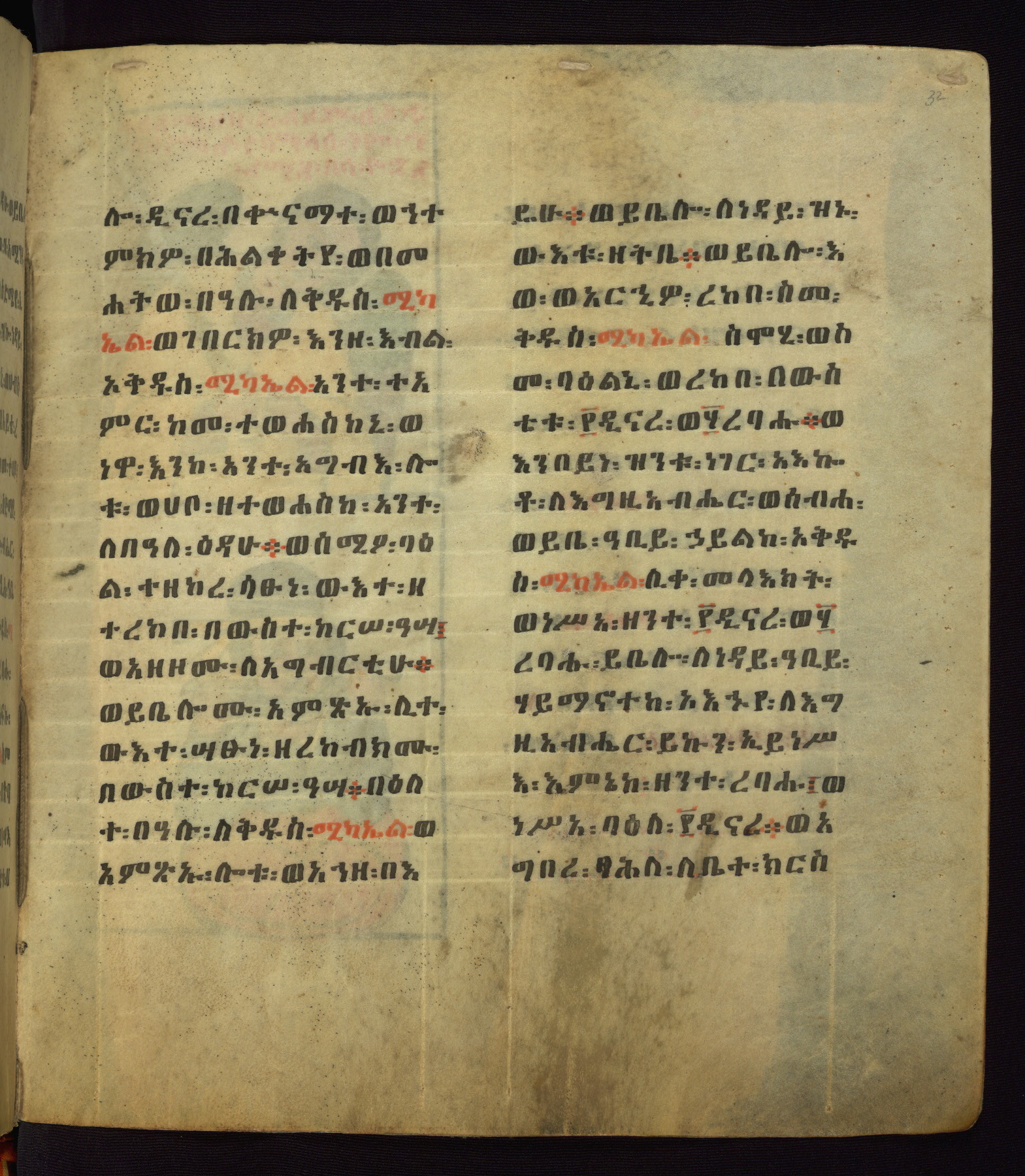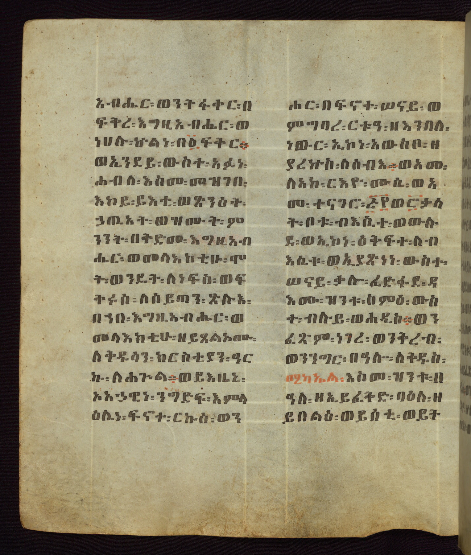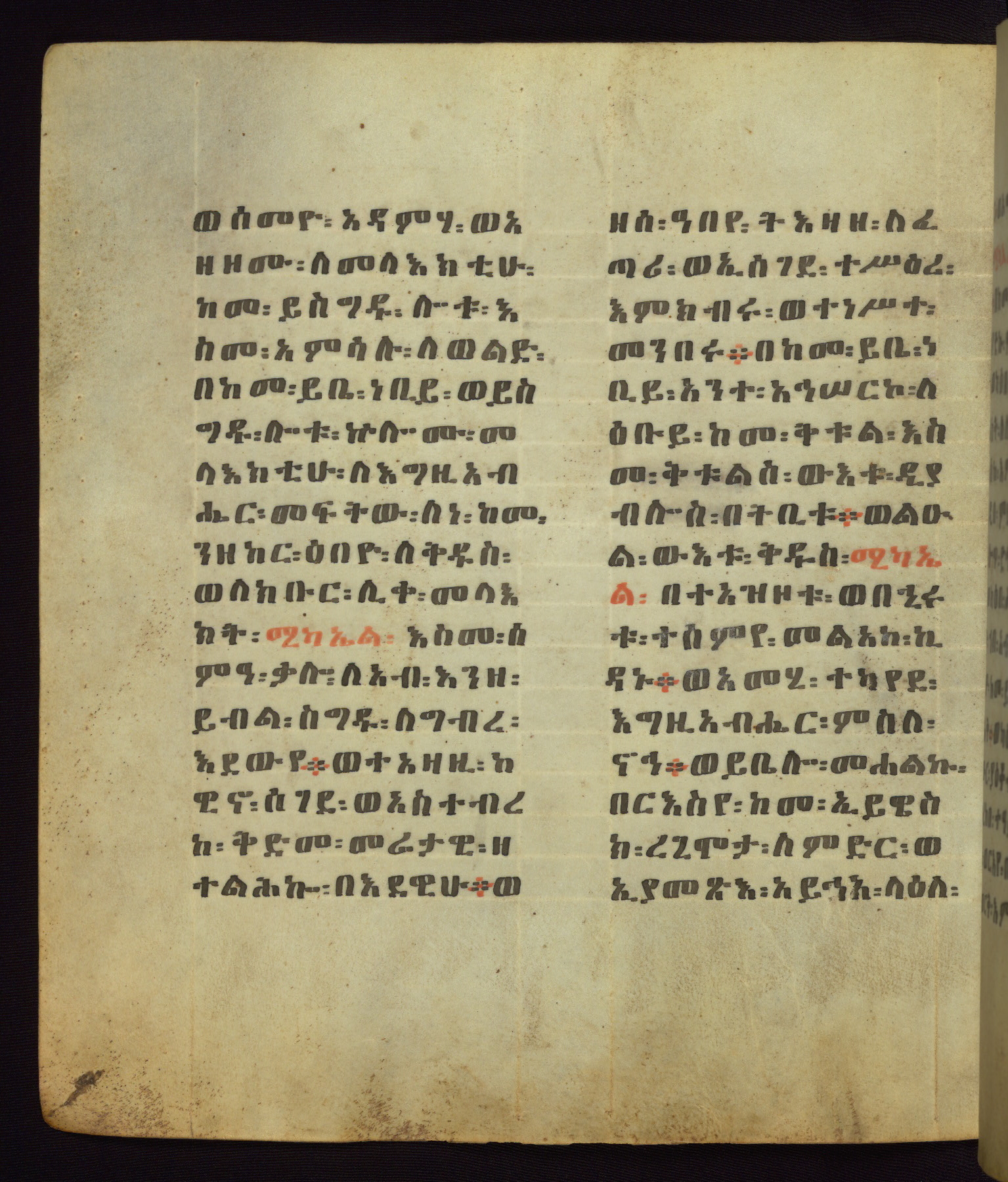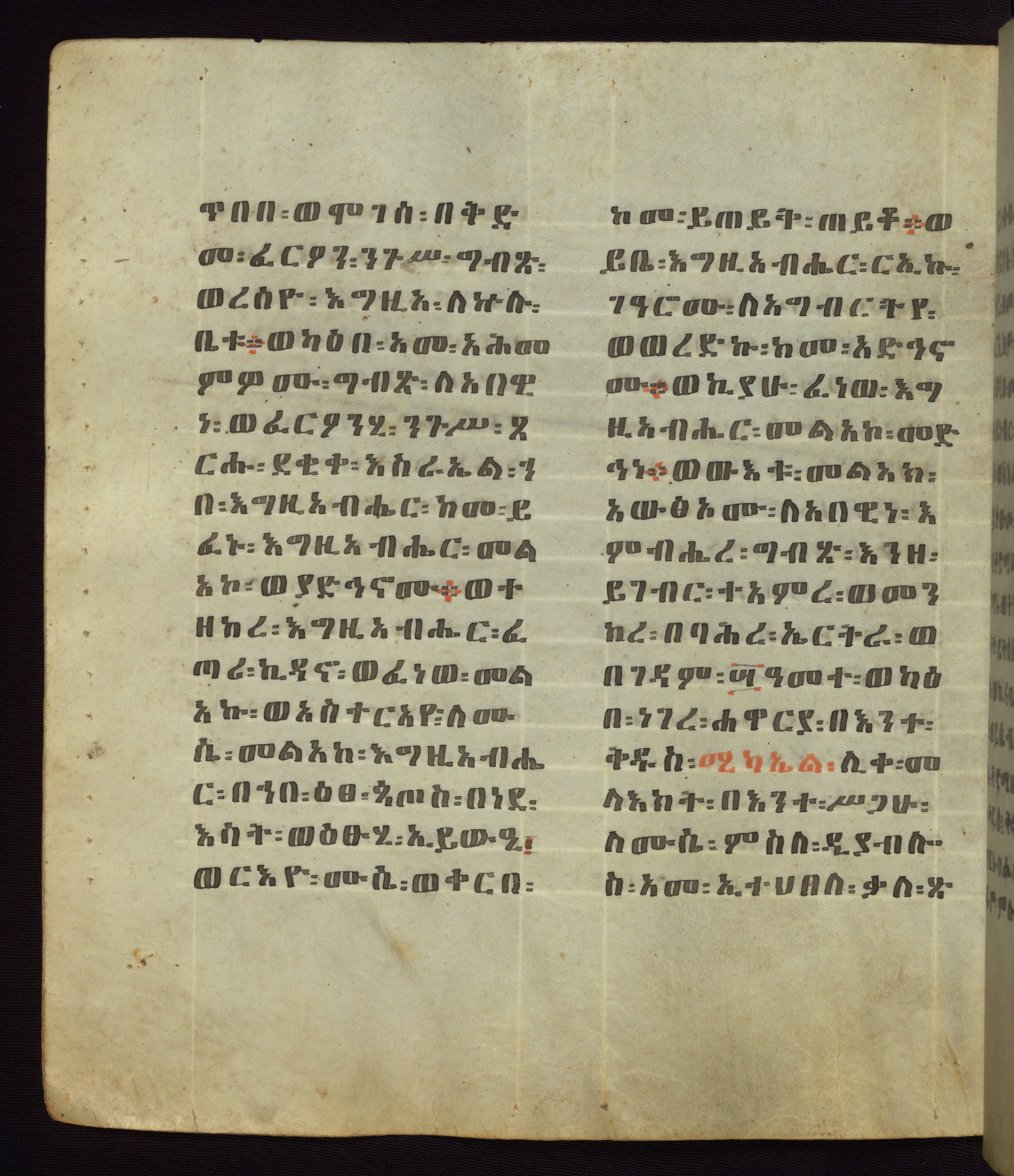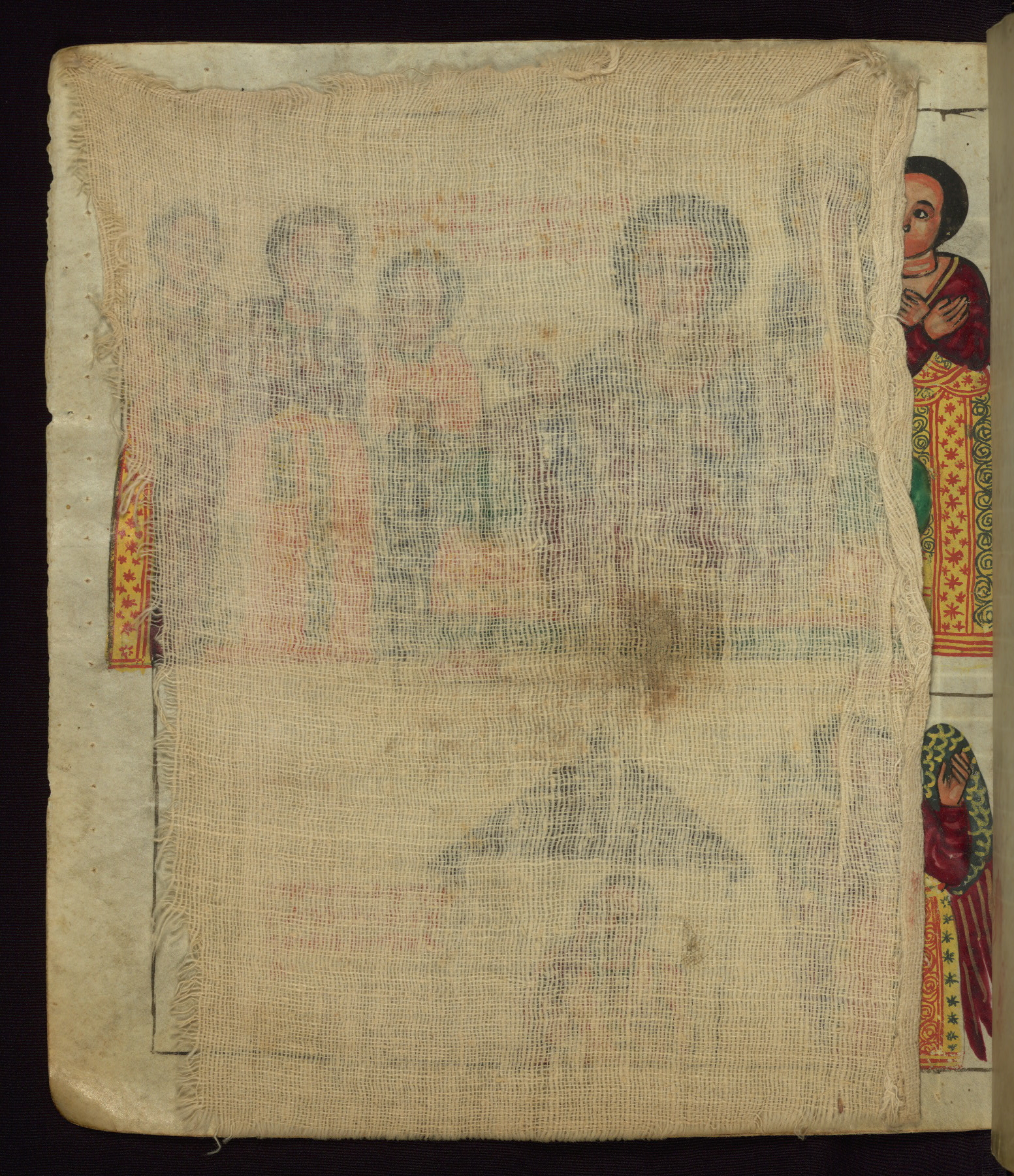 This Homiliary was created in Gondar, Ethiopia, during a period of artistic flowering in the late seventeenth century. The Imperial court and its accompanying aristocracy took up permanent residence in Gondar at this time, and the taste of these wealthy patrons for paintings and extensive image cycles is exemplified by this richly illuminated manuscript. The text, a Homiliary focused on the Miracles of the Archangel Michael, combines liturgical readings with forty-nine brightly colored renderings of God, St. Michael, and the miracles related in the text. Sections of the manuscript would have been read aloud on monthly feast days of the Archangel, and the images would have punctuated the readings. The artists were likely trained as painters, rather than solely as manuscript illuminators, and their art can therefore be linked stylistically to contemporary mural painting.