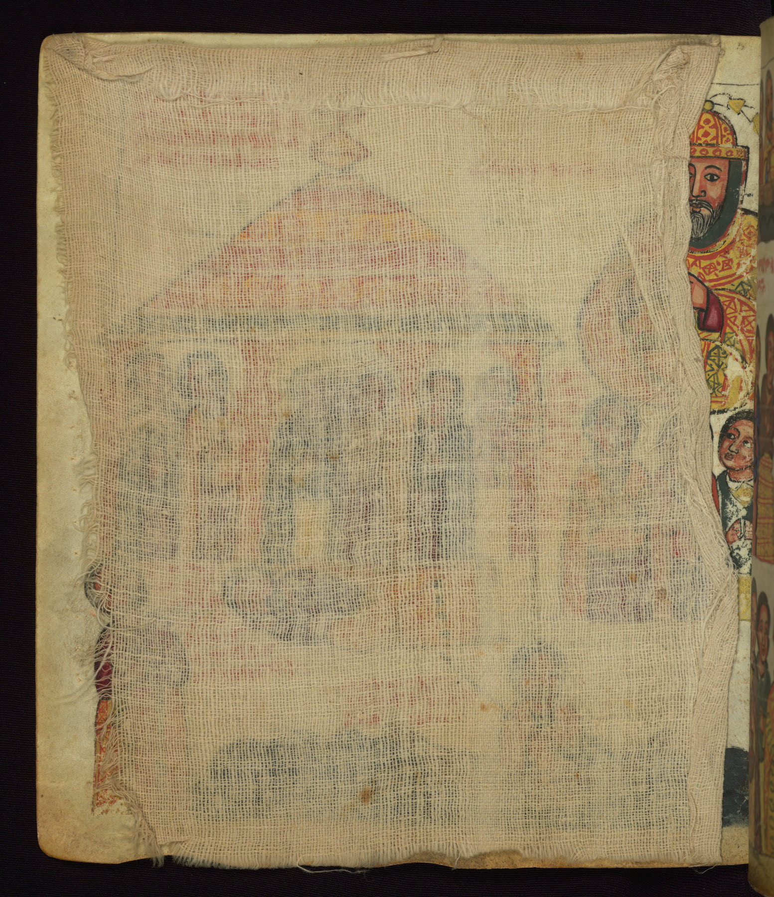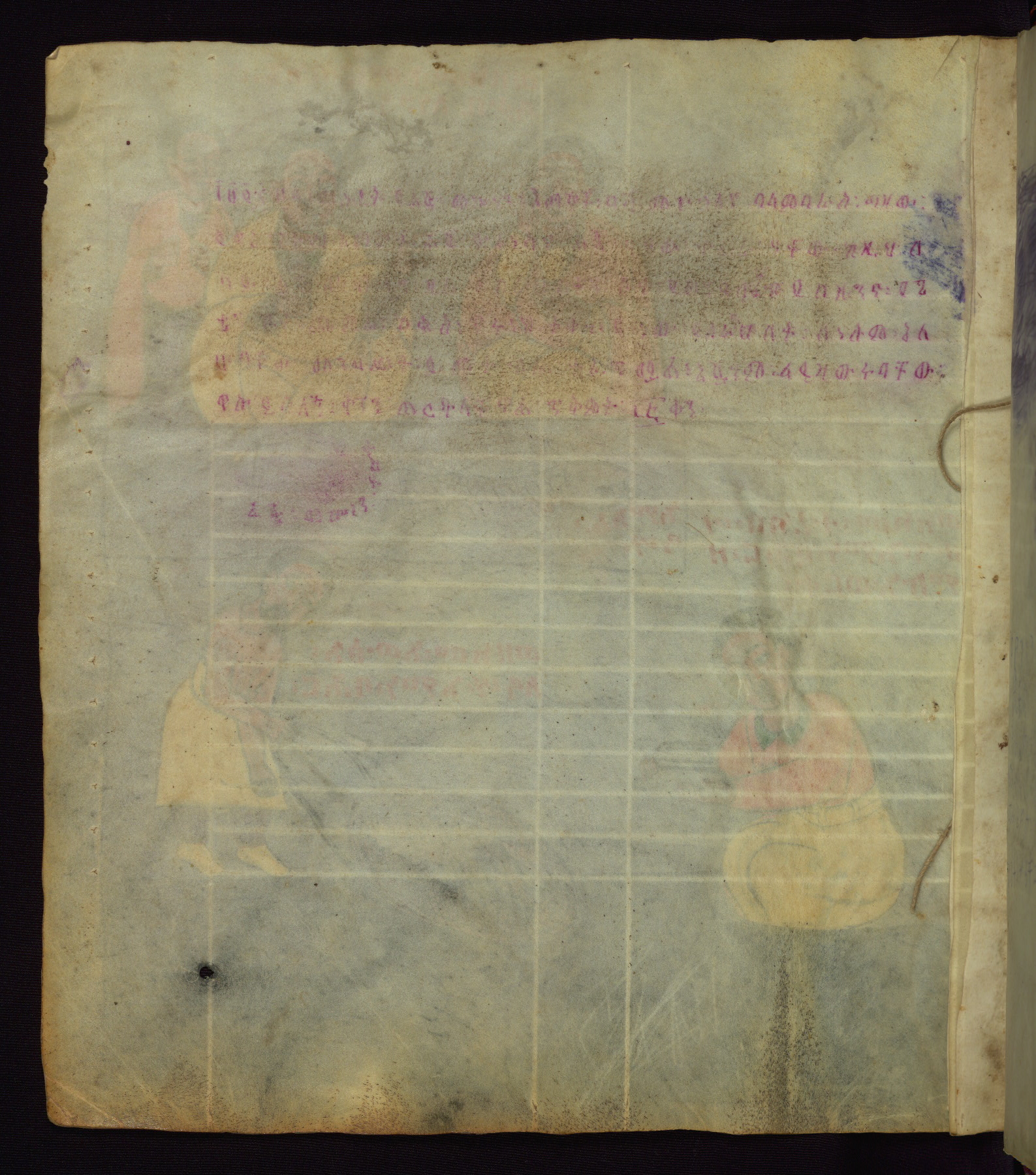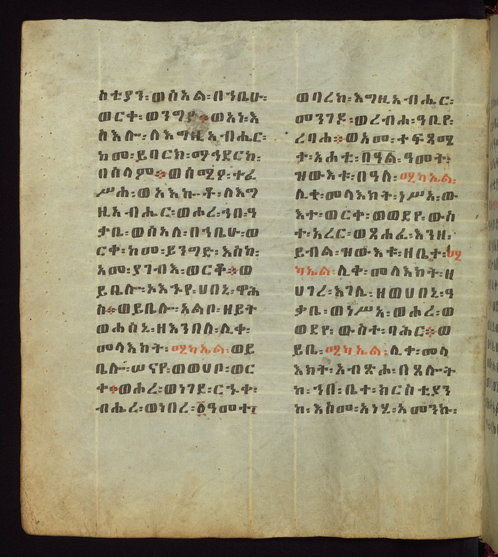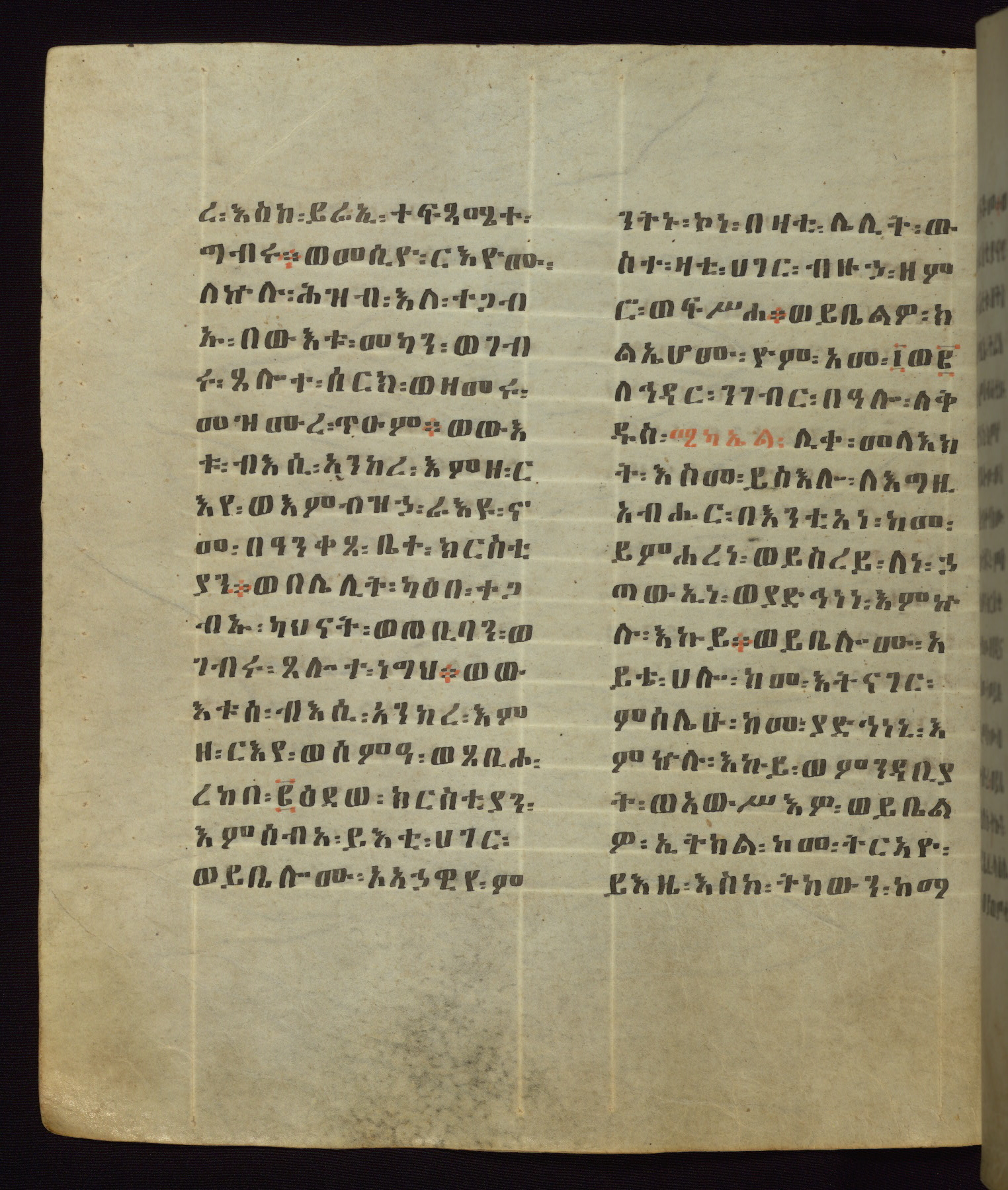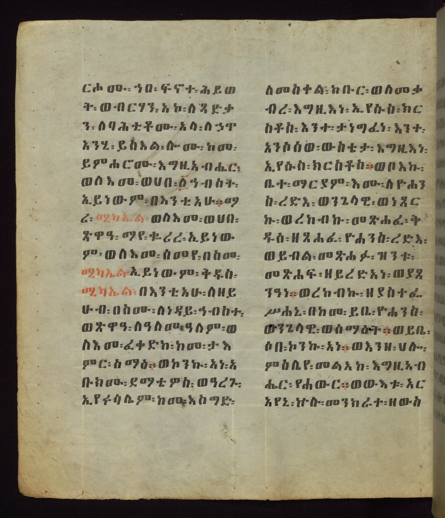 This Homiliary was created in Gondar, Ethiopia, during a period of artistic flowering in the late seventeenth century. The Imperial court and its accompanying aristocracy took up permanent residence in Gondar at this time, and the taste of these wealthy patrons for paintings and extensive image cycles is exemplified by this richly illuminated manuscript. The text, a Homiliary focused on the Miracles of the Archangel Michael, combines liturgical readings with forty-nine brightly colored renderings of God, St. Michael, and the miracles related in the text. Sections of the manuscript would have been read aloud on monthly feast days of the Archangel, and the images would have punctuated the readings. The artists were likely trained as painters, rather than solely as manuscript illuminators, and their art can therefore be linked stylistically to contemporary mural painting.