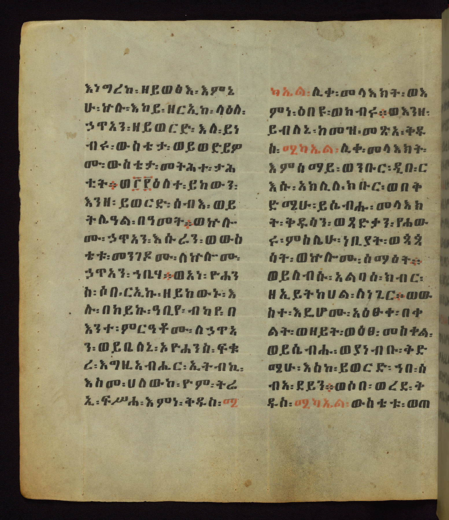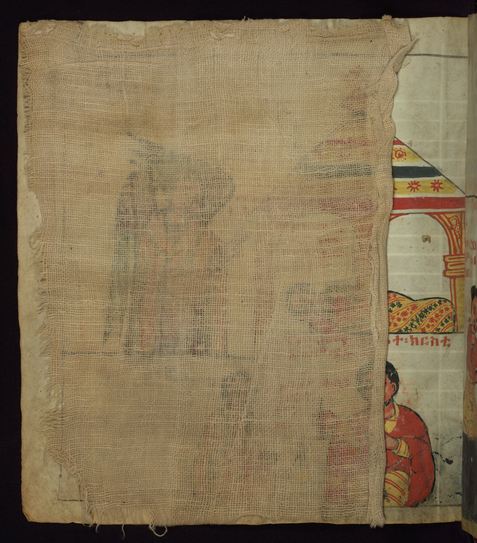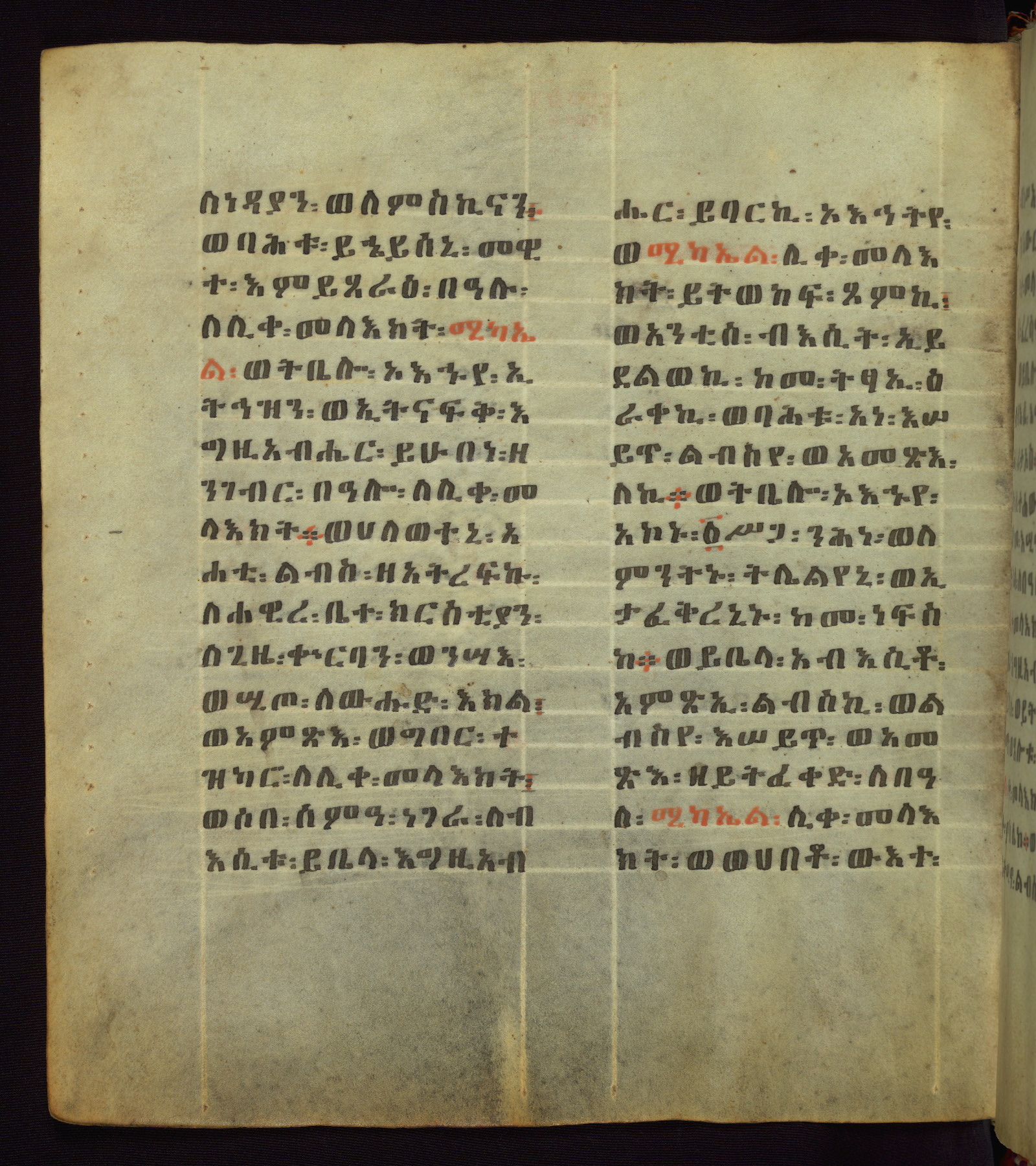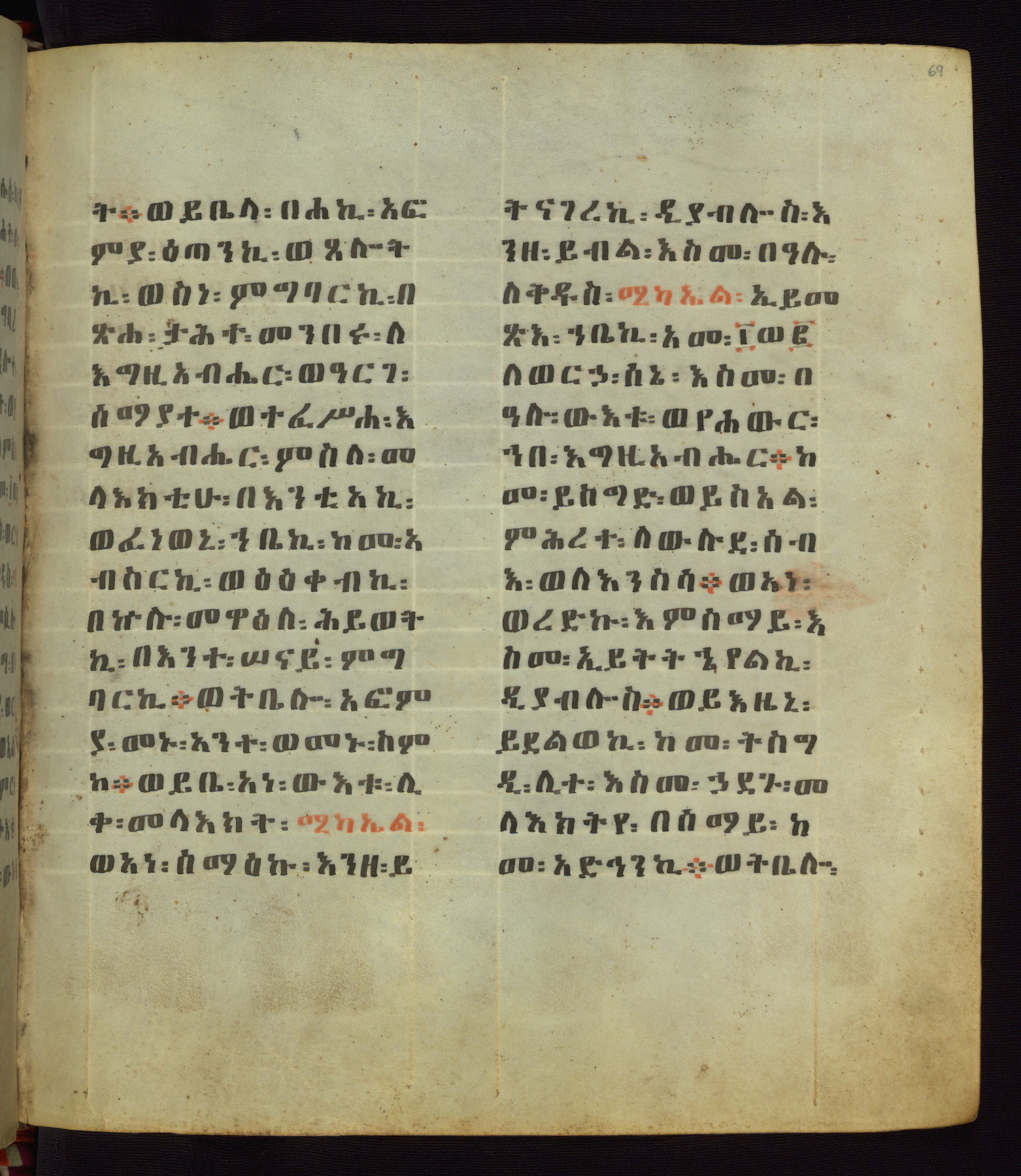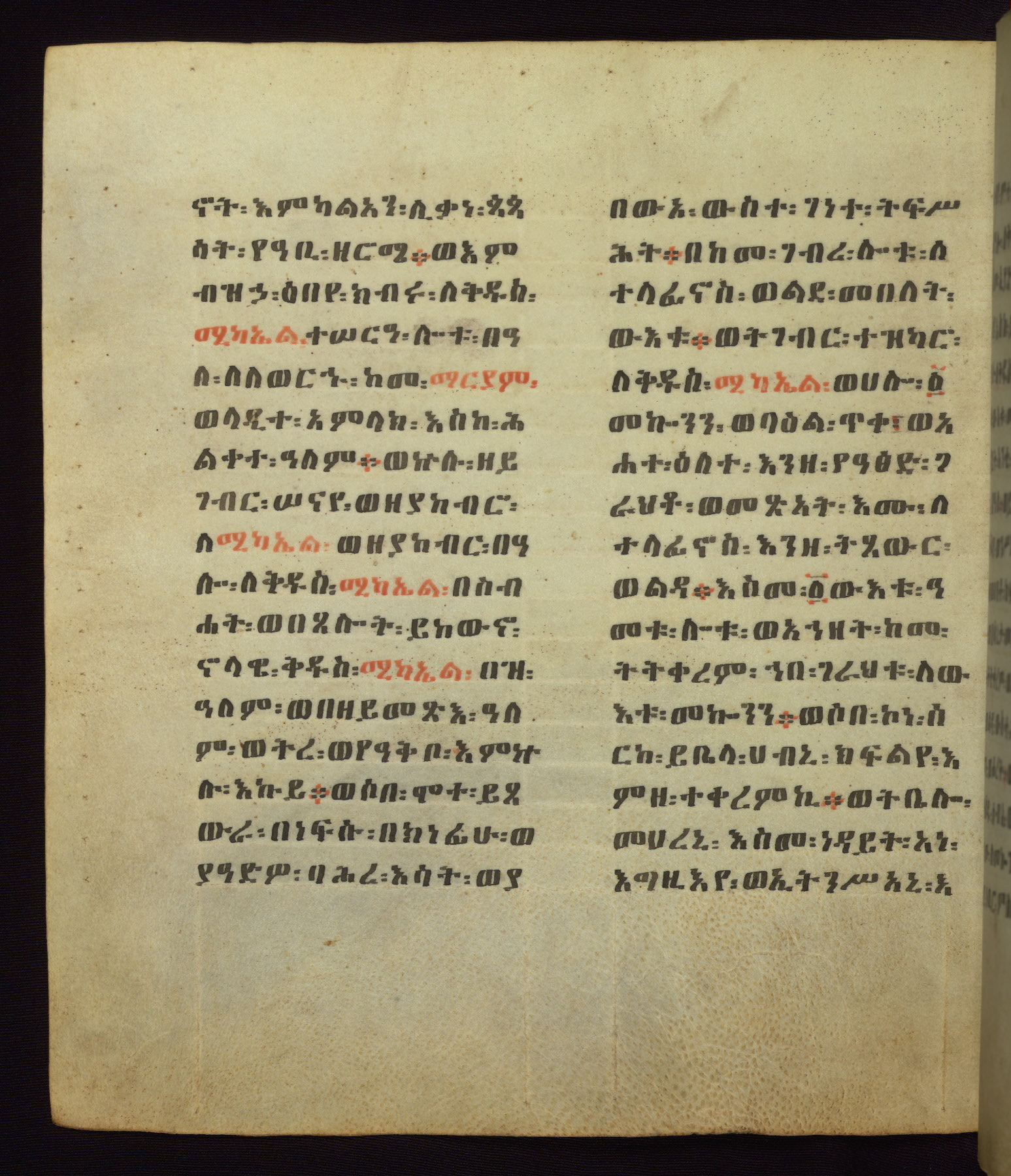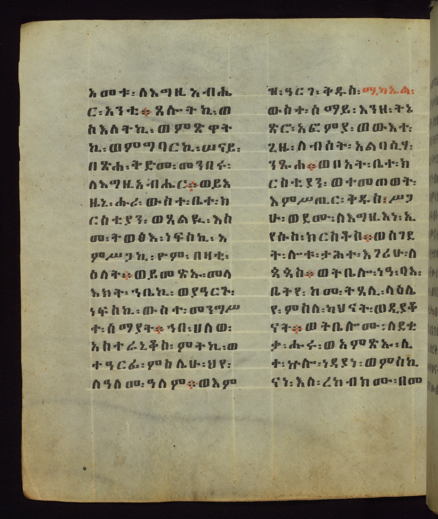This Homiliary was created in Gondar, Ethiopia, during a period of artistic flowering in the late seventeenth century. The Imperial court and its accompanying aristocracy took up permanent residence in Gondar at this time, and the taste of these wealthy patrons for paintings and extensive image cycles is exemplified by this richly illuminated manuscript. The text, a Homiliary focused on the Miracles of the Archangel Michael, combines liturgical readings with forty-nine brightly colored renderings of God, St. Michael, and the miracles related in the text. Sections of the manuscript would have been read aloud on monthly feast days of the Archangel, and the images would have punctuated the readings. The artists were likely trained as painters, rather than solely as manuscript illuminators, and their art can therefore be linked stylistically to contemporary mural painting.