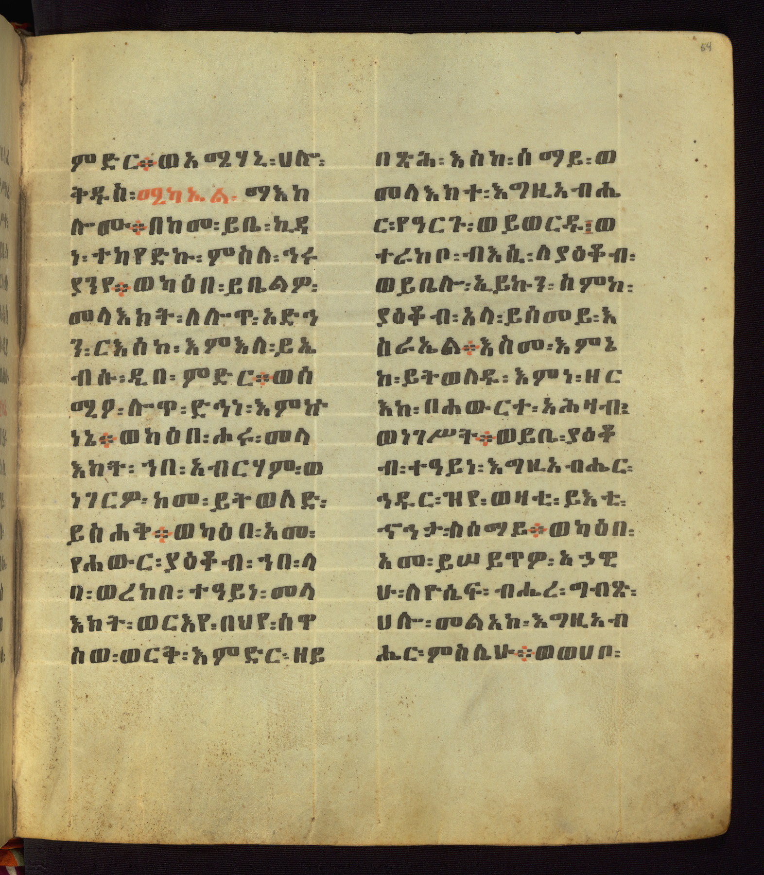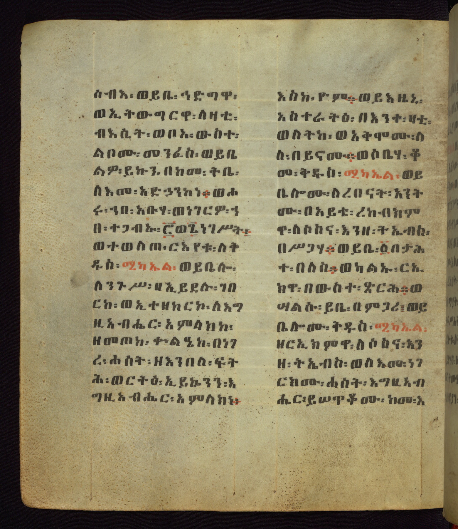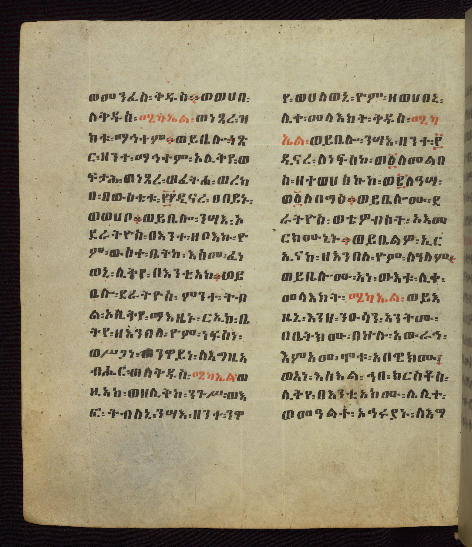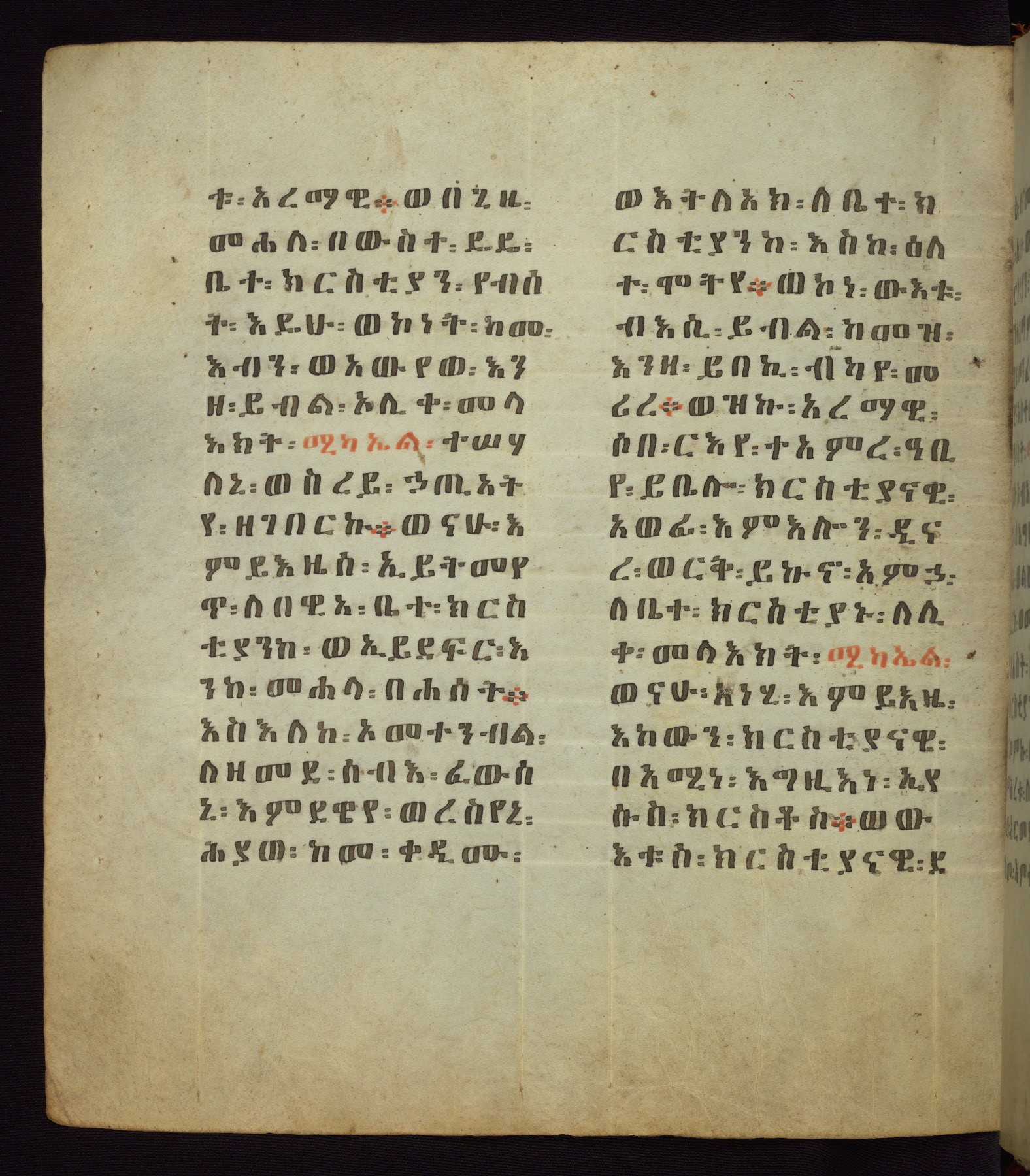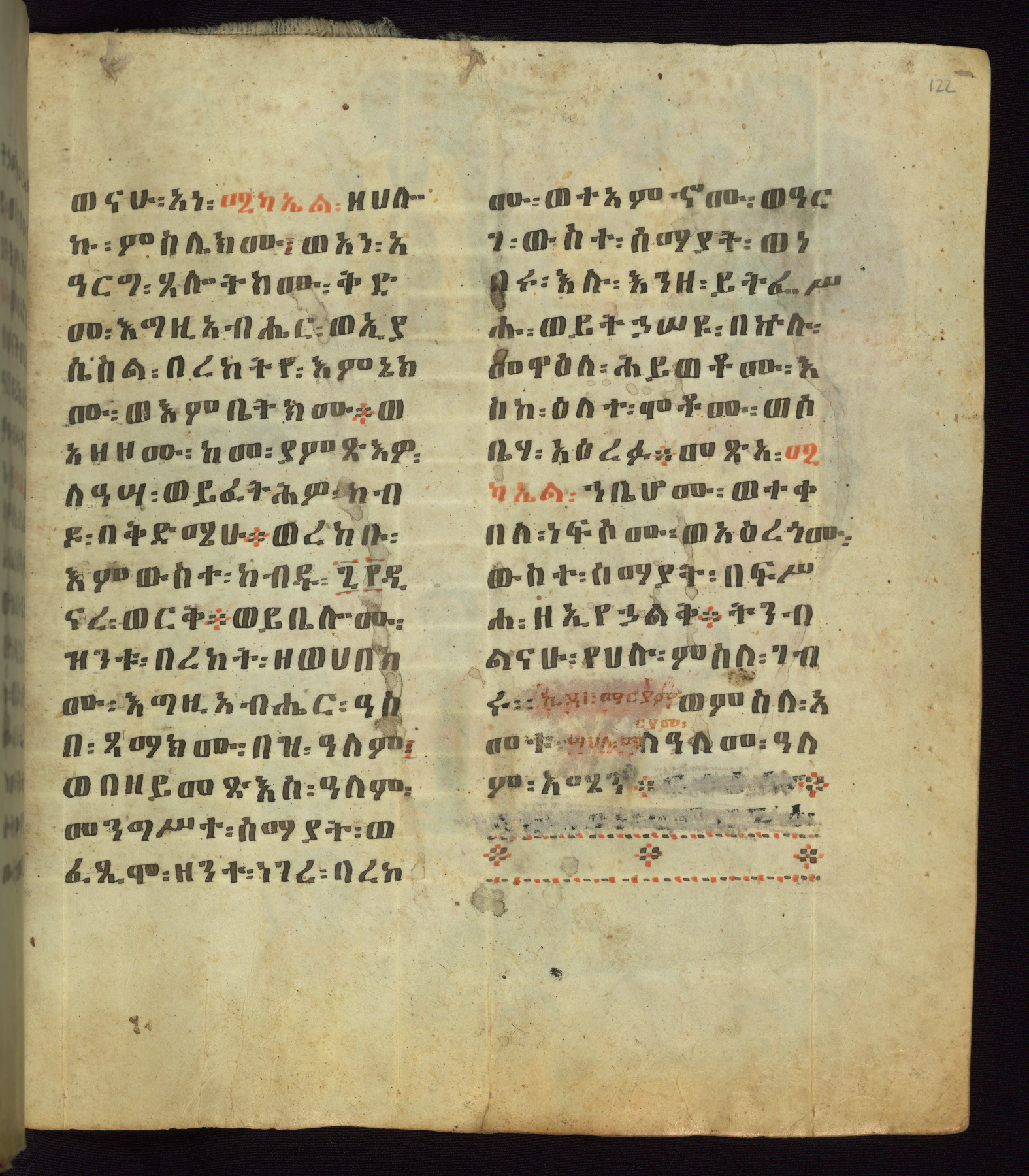 This Homiliary was created in Gondar, Ethiopia, during a period of artistic flowering in the late seventeenth century. The Imperial court and its accompanying aristocracy took up permanent residence in Gondar at this time, and the taste of these wealthy patrons for paintings and extensive image cycles is exemplified by this richly illuminated manuscript. The text, a Homiliary focused on the Miracles of the Archangel Michael, combines liturgical readings with forty-nine brightly colored renderings of God, St. Michael, and the miracles related in the text. Sections of the manuscript would have been read aloud on monthly feast days of the Archangel, and the images would have punctuated the readings. The artists were likely trained as painters, rather than solely as manuscript illuminators, and their art can therefore be linked stylistically to contemporary mural painting.