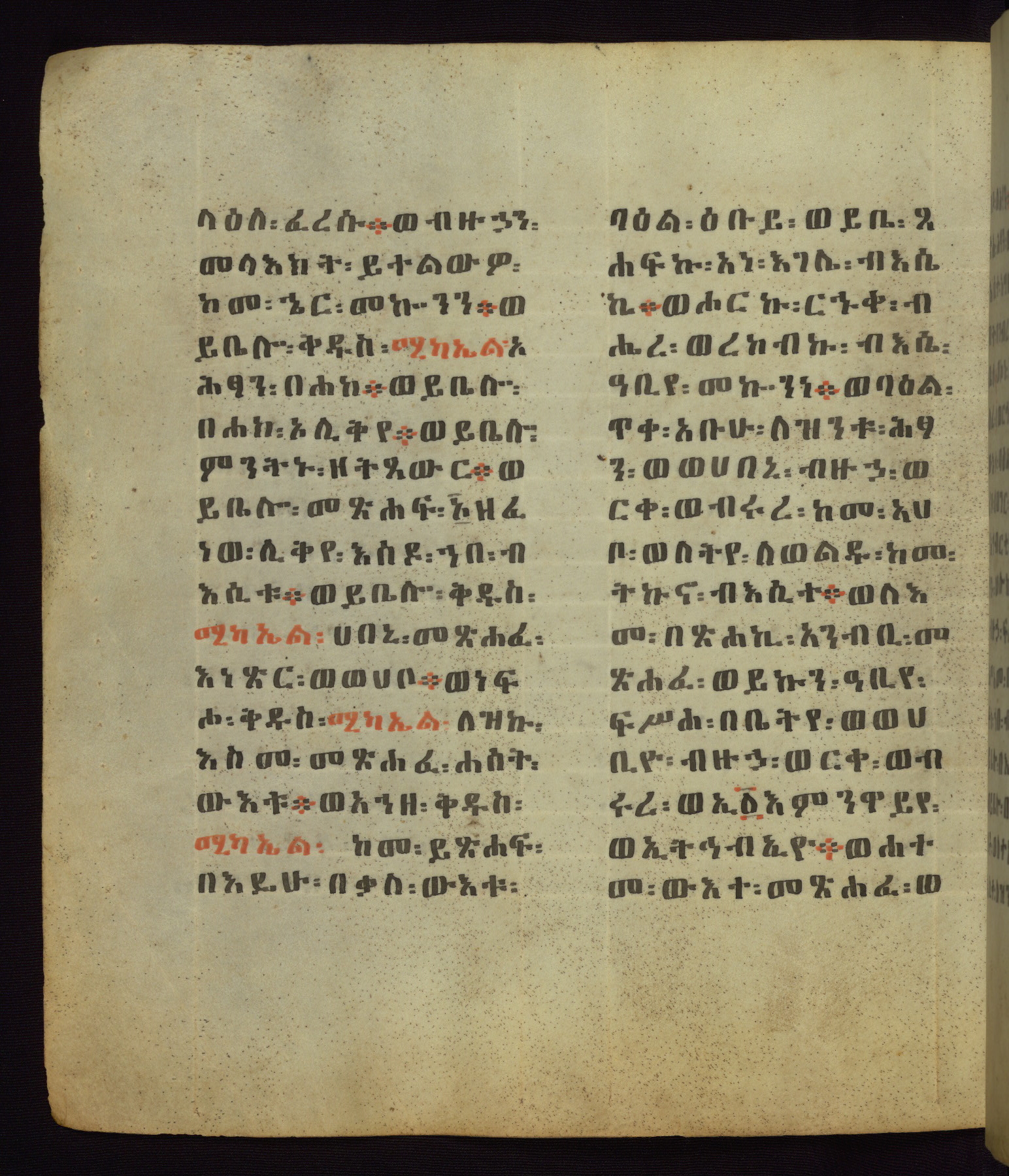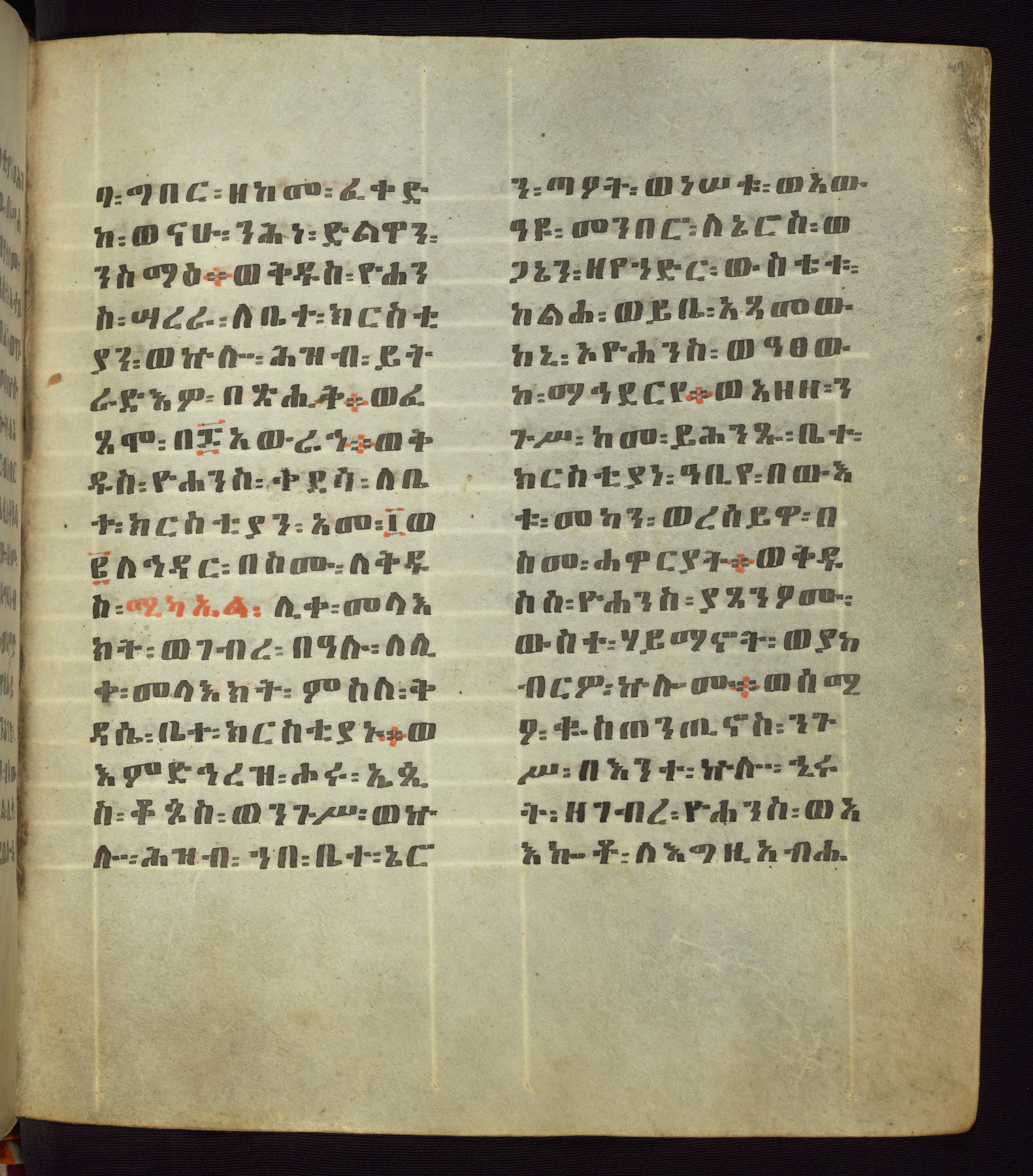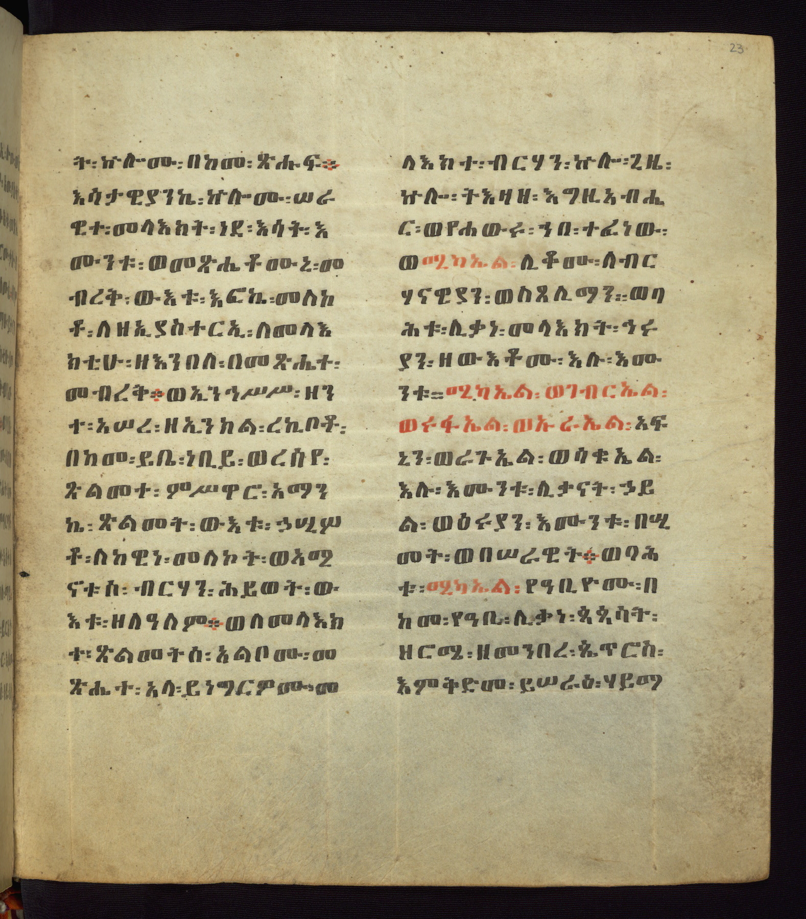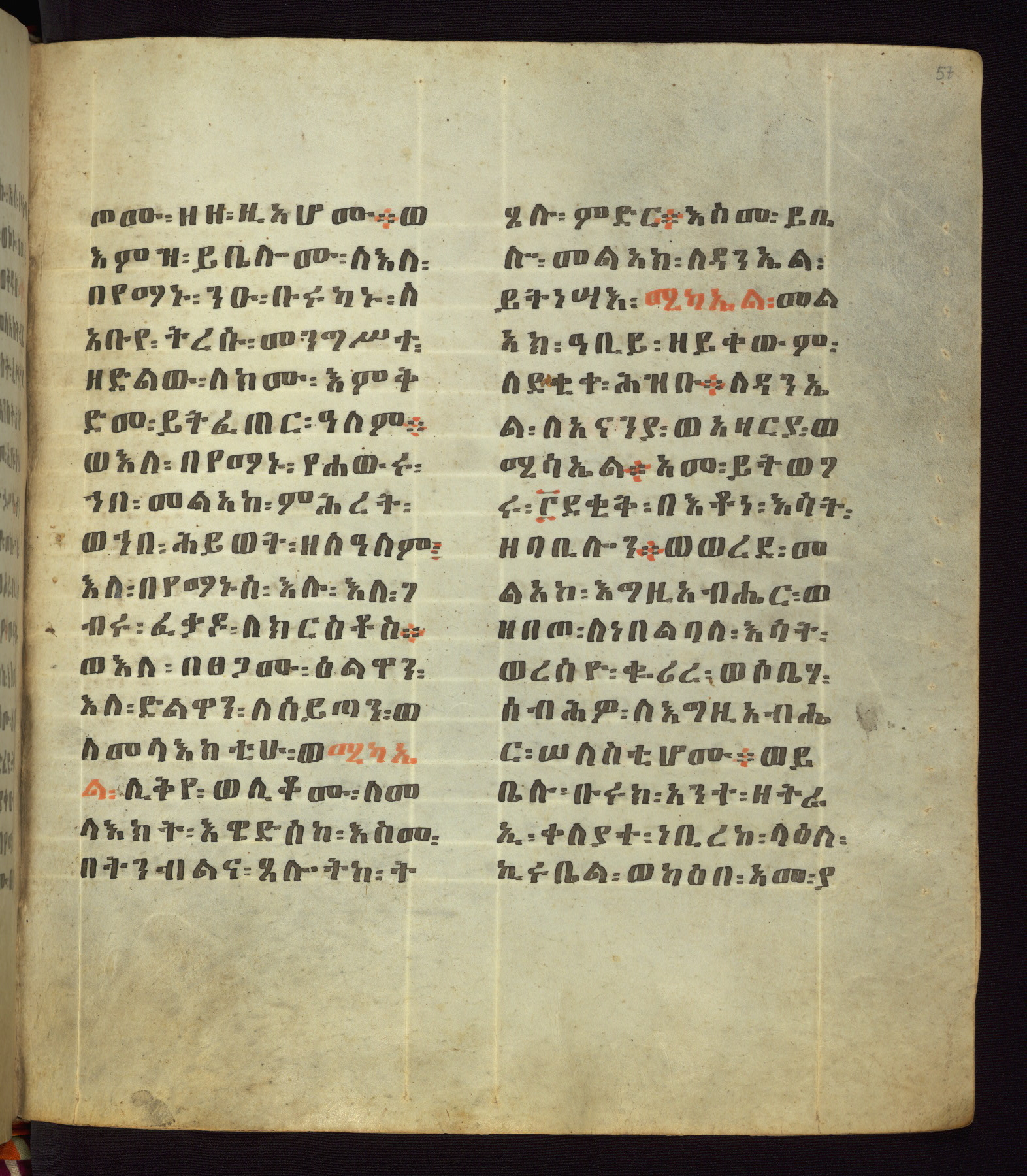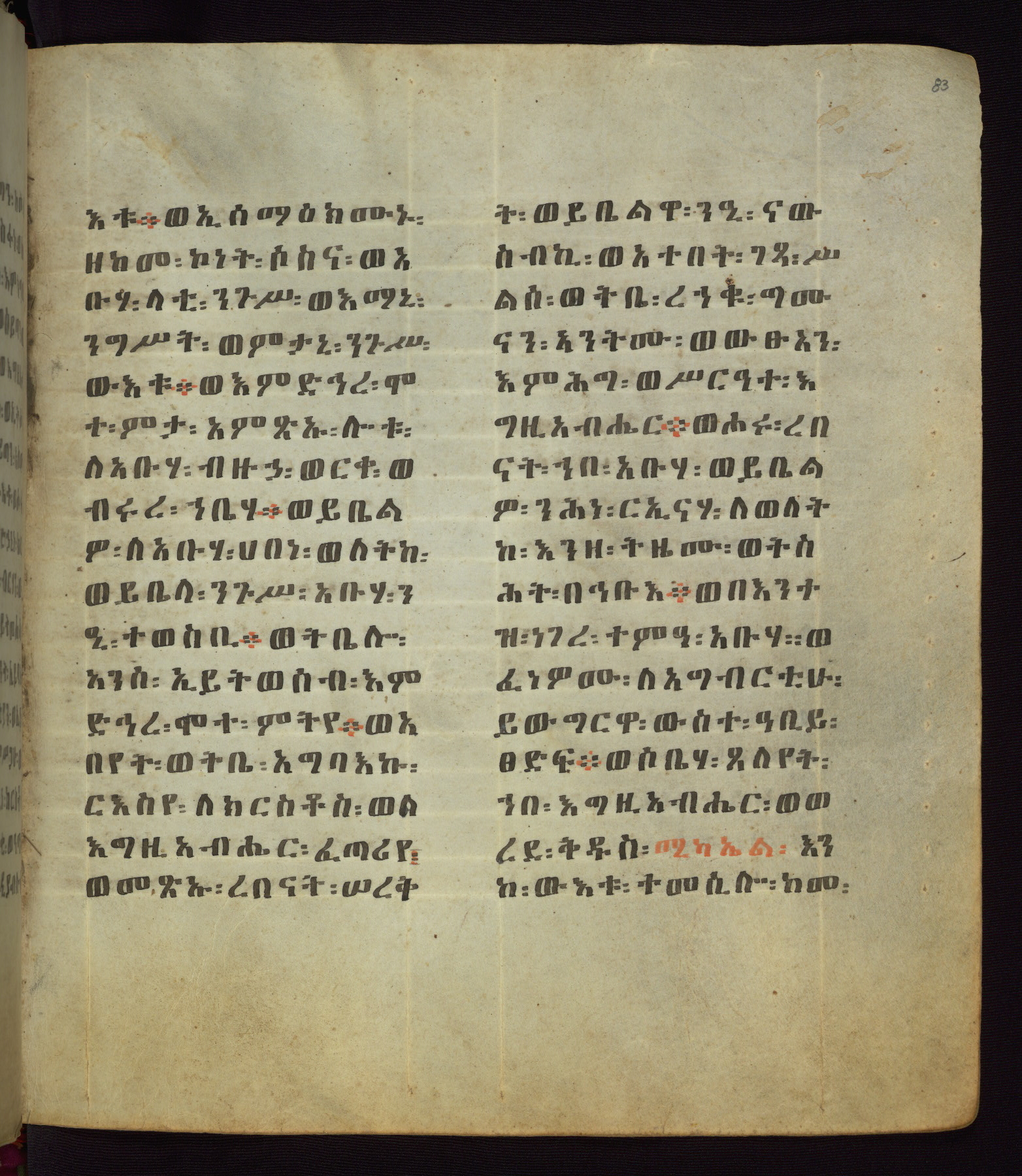 This Homiliary was created in Gondar, Ethiopia, during a period of artistic flowering in the late seventeenth century. The Imperial court and its accompanying aristocracy took up permanent residence in Gondar at this time, and the taste of these wealthy patrons for paintings and extensive image cycles is exemplified by this richly illuminated manuscript. The text, a Homiliary focused on the Miracles of the Archangel Michael, combines liturgical readings with forty-nine brightly colored renderings of God, St. Michael, and the miracles related in the text. Sections of the manuscript would have been read aloud on monthly feast days of the Archangel, and the images would have punctuated the readings. The artists were likely trained as painters, rather than solely as manuscript illuminators, and their art can therefore be linked stylistically to contemporary mural painting.