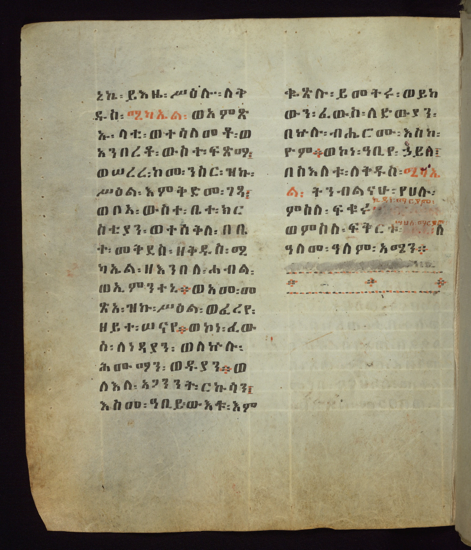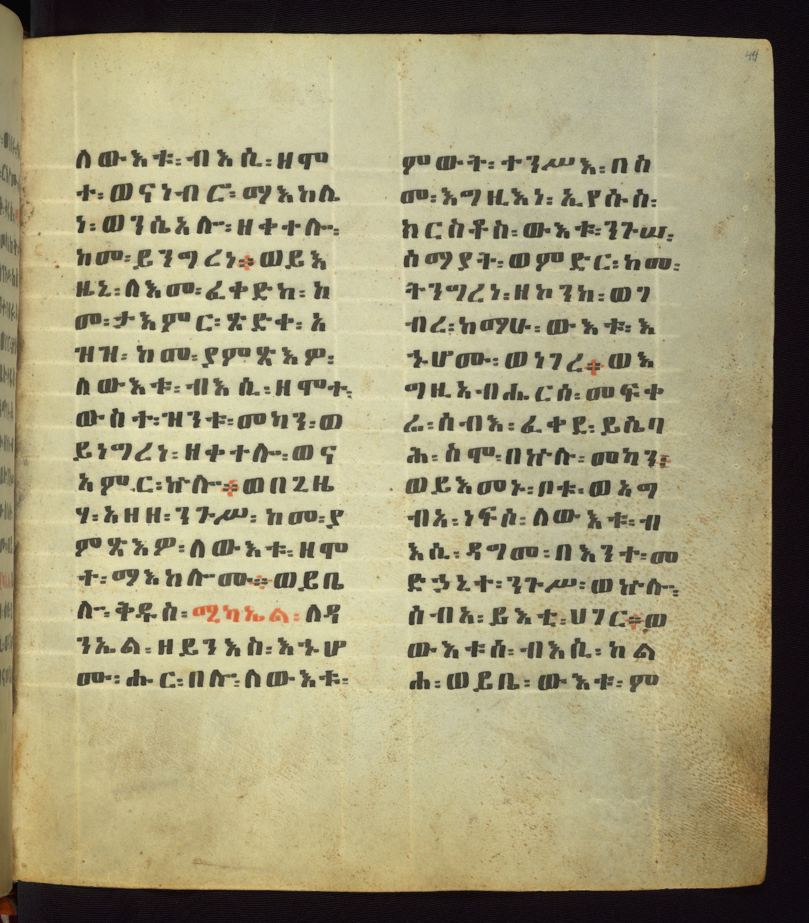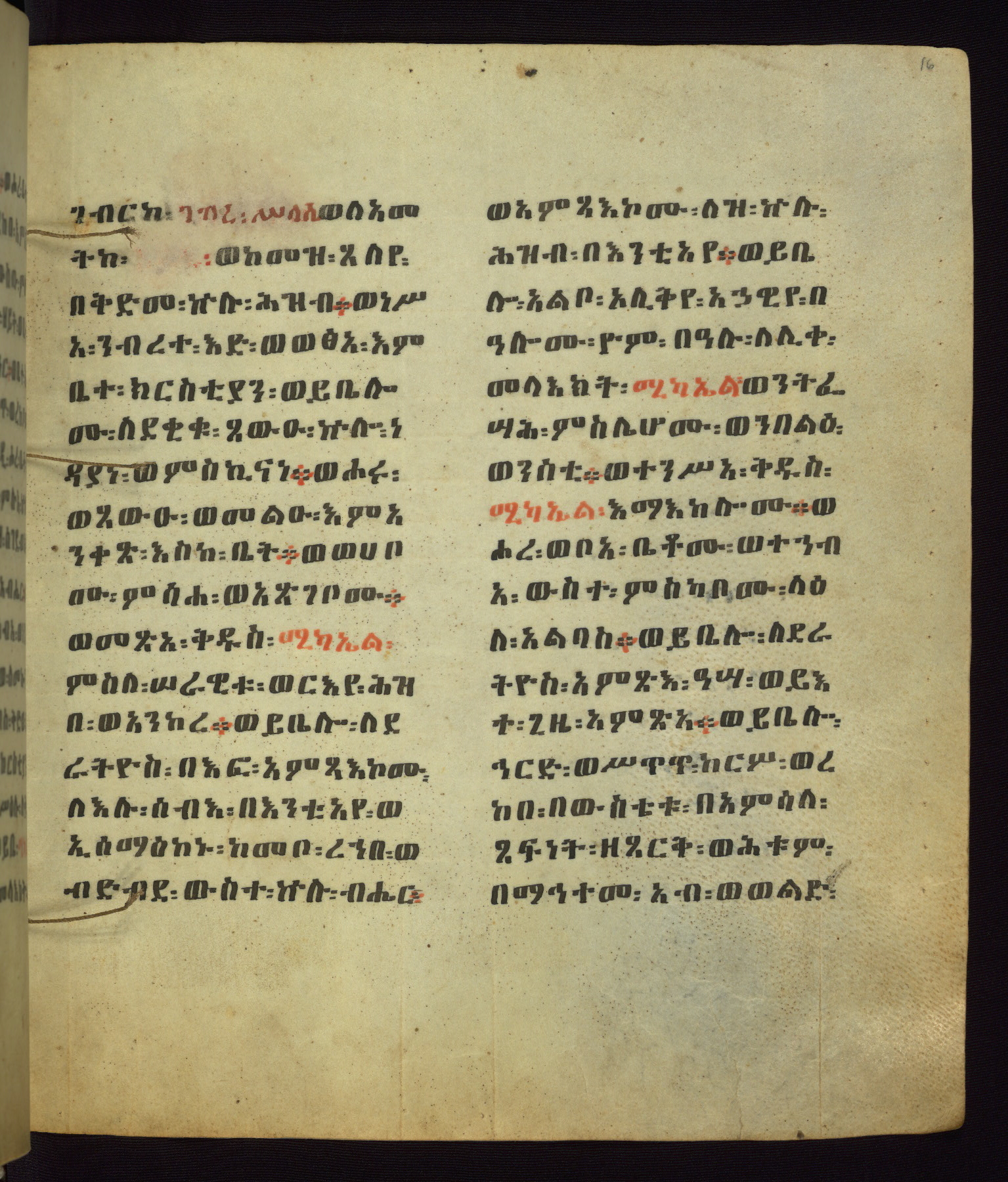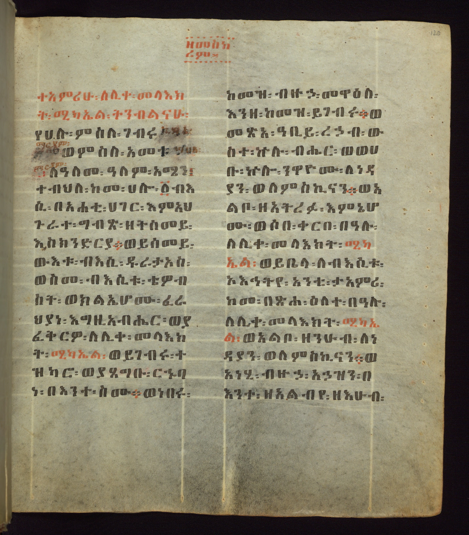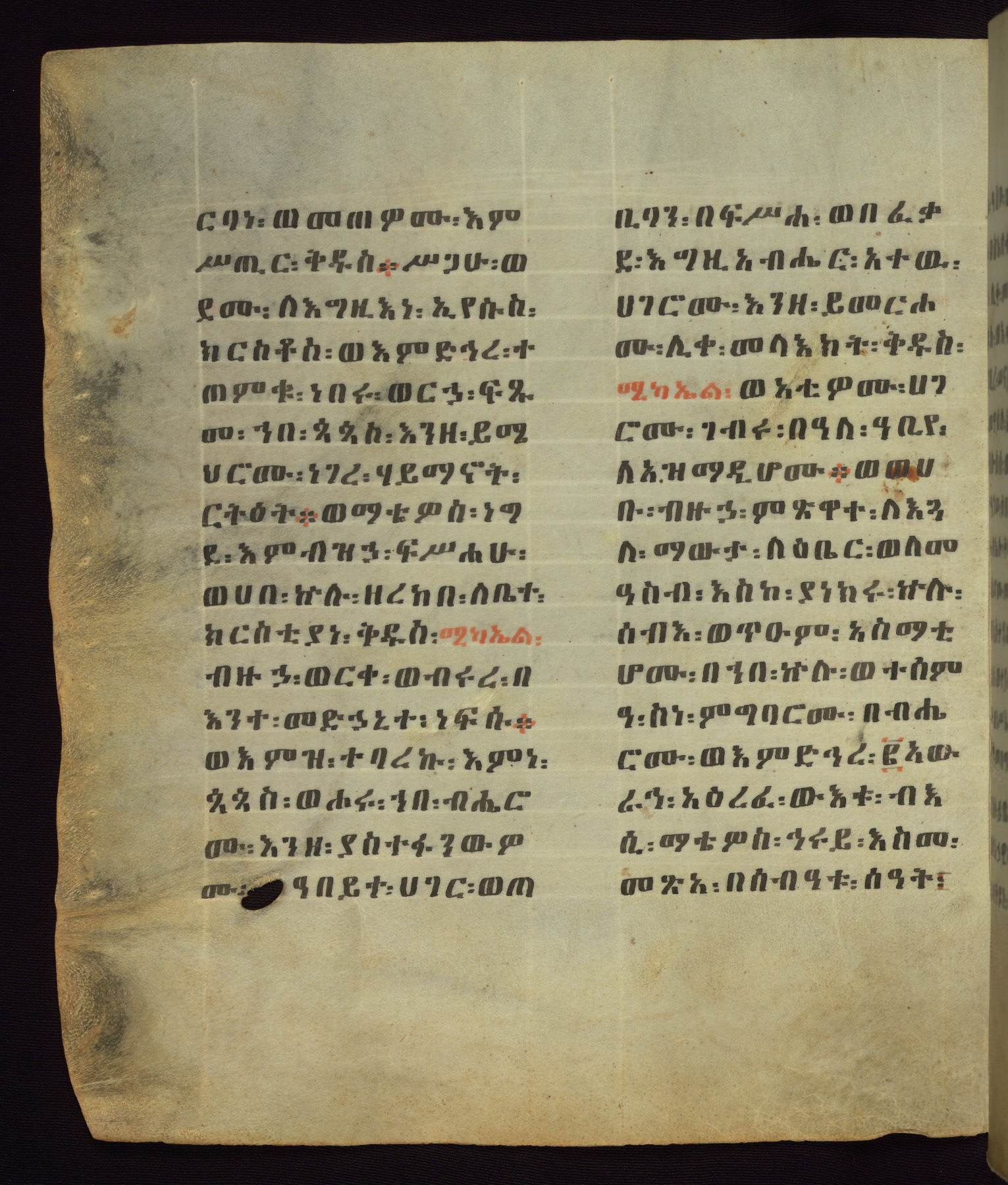 This Homiliary was created in Gondar, Ethiopia, during a period of artistic flowering in the late seventeenth century. The Imperial court and its accompanying aristocracy took up permanent residence in Gondar at this time, and the taste of these wealthy patrons for paintings and extensive image cycles is exemplified by this richly illuminated manuscript. The text, a Homiliary focused on the Miracles of the Archangel Michael, combines liturgical readings with forty-nine brightly colored renderings of God, St. Michael, and the miracles related in the text. Sections of the manuscript would have been read aloud on monthly feast days of the Archangel, and the images would have punctuated the readings. The artists were likely trained as painters, rather than solely as manuscript illuminators, and their art can therefore be linked stylistically to contemporary mural painting.