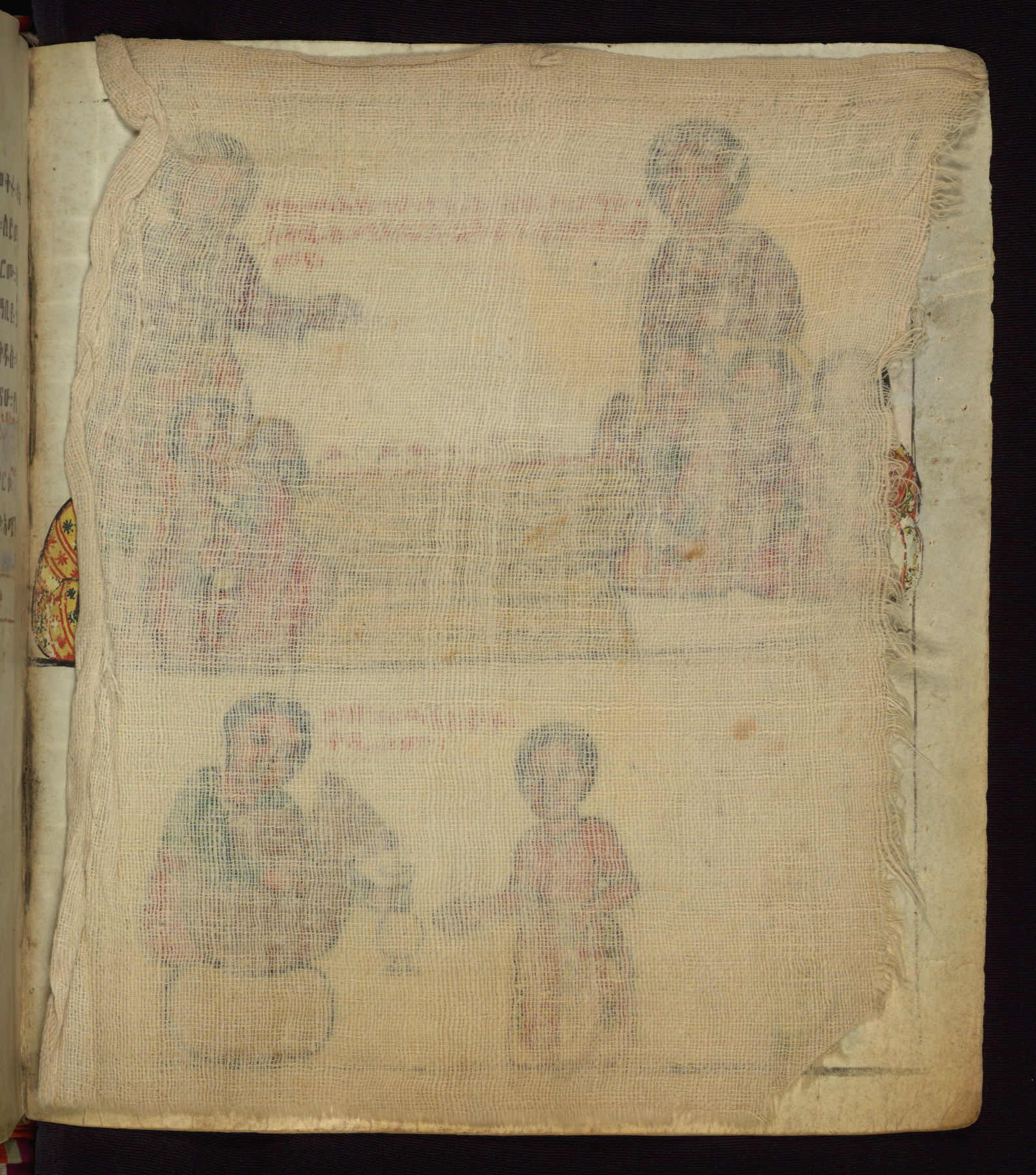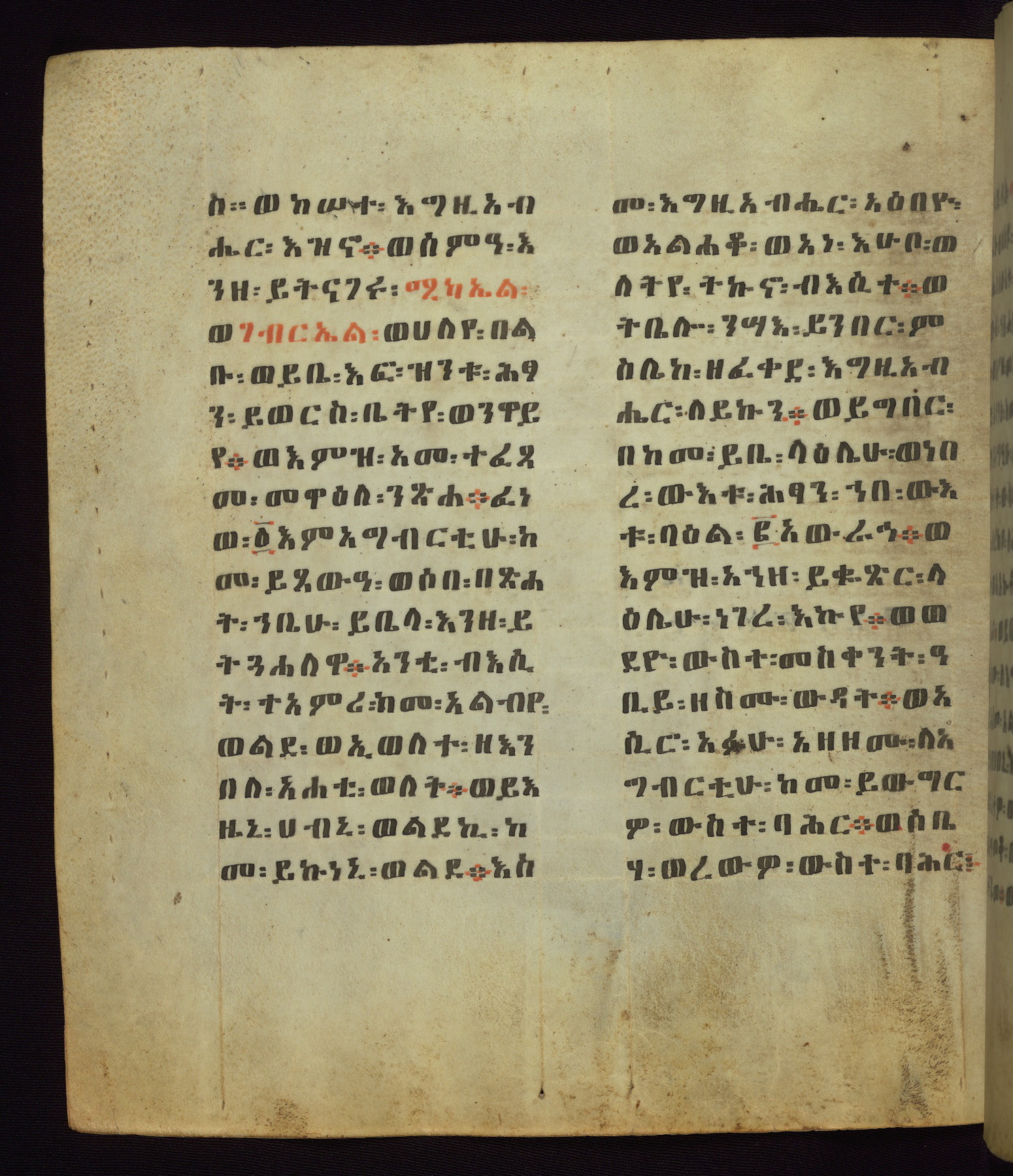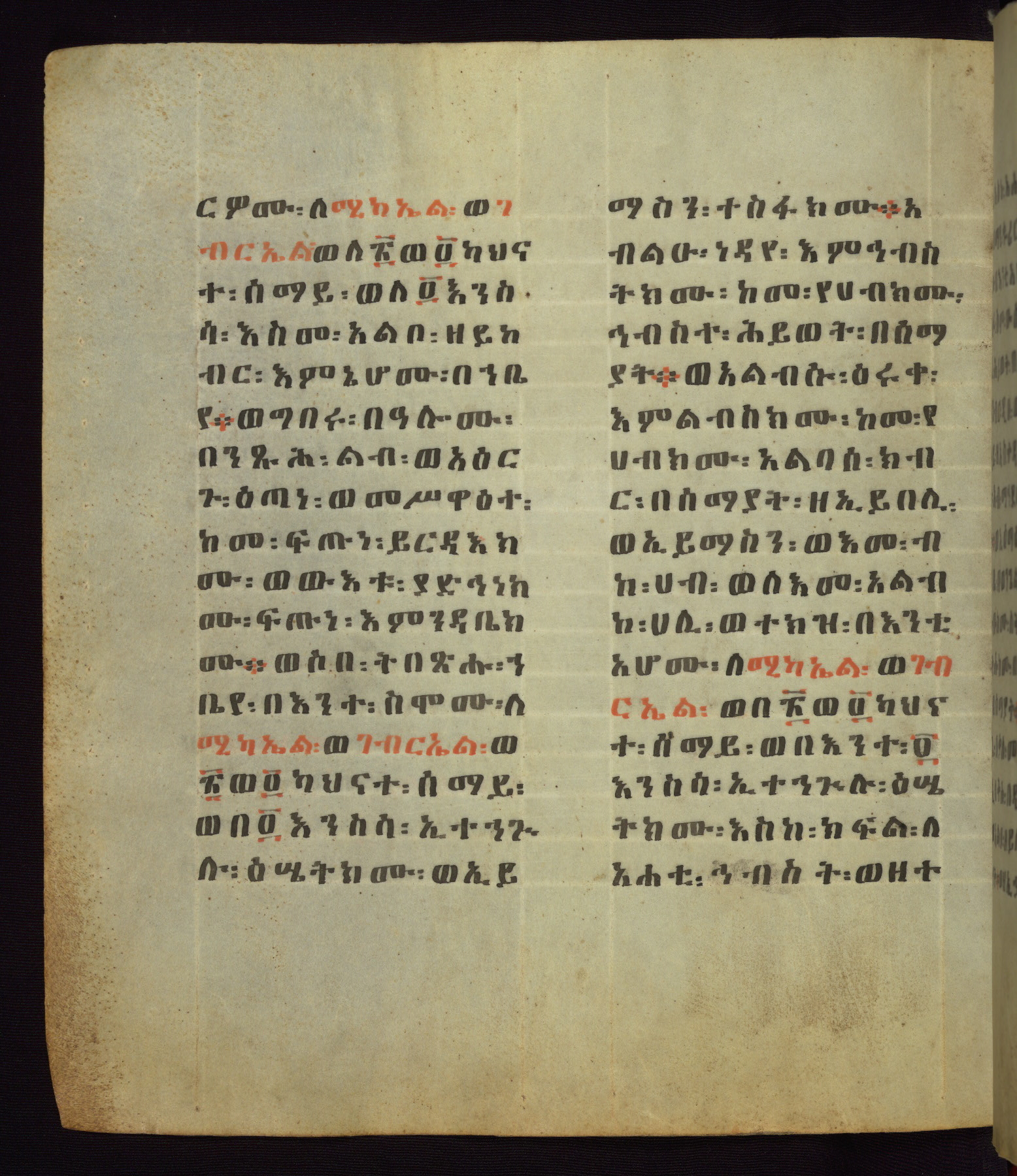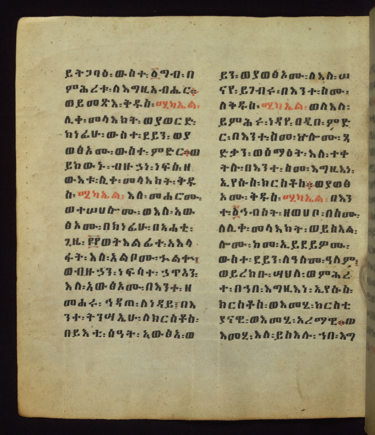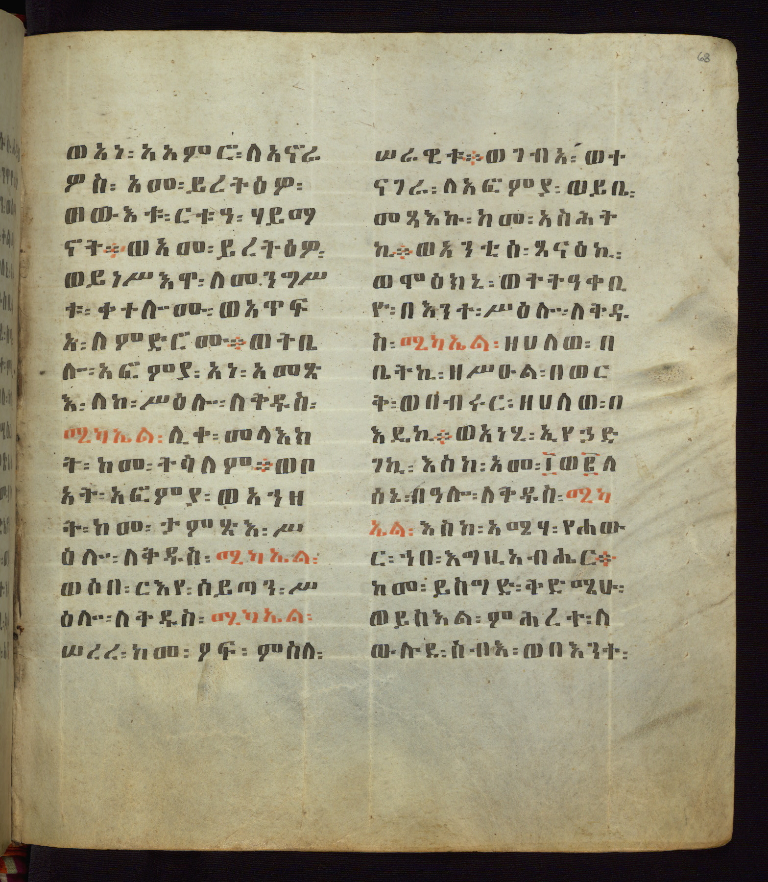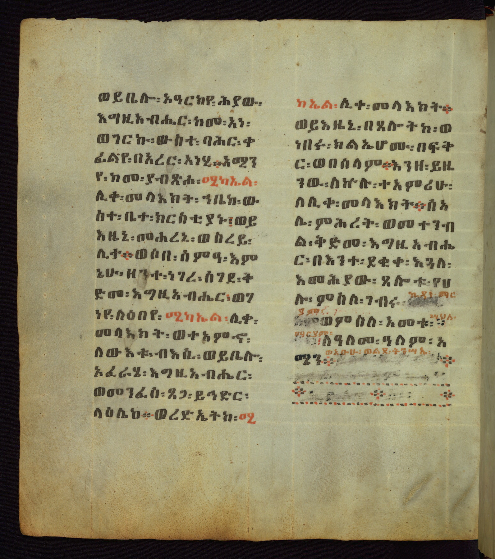 This Homiliary was created in Gondar, Ethiopia, during a period of artistic flowering in the late seventeenth century. The Imperial court and its accompanying aristocracy took up permanent residence in Gondar at this time, and the taste of these wealthy patrons for paintings and extensive image cycles is exemplified by this richly illuminated manuscript. The text, a Homiliary focused on the Miracles of the Archangel Michael, combines liturgical readings with forty-nine brightly colored renderings of God, St. Michael, and the miracles related in the text. Sections of the manuscript would have been read aloud on monthly feast days of the Archangel, and the images would have punctuated the readings. The artists were likely trained as painters, rather than solely as manuscript illuminators, and their art can therefore be linked stylistically to contemporary mural painting.