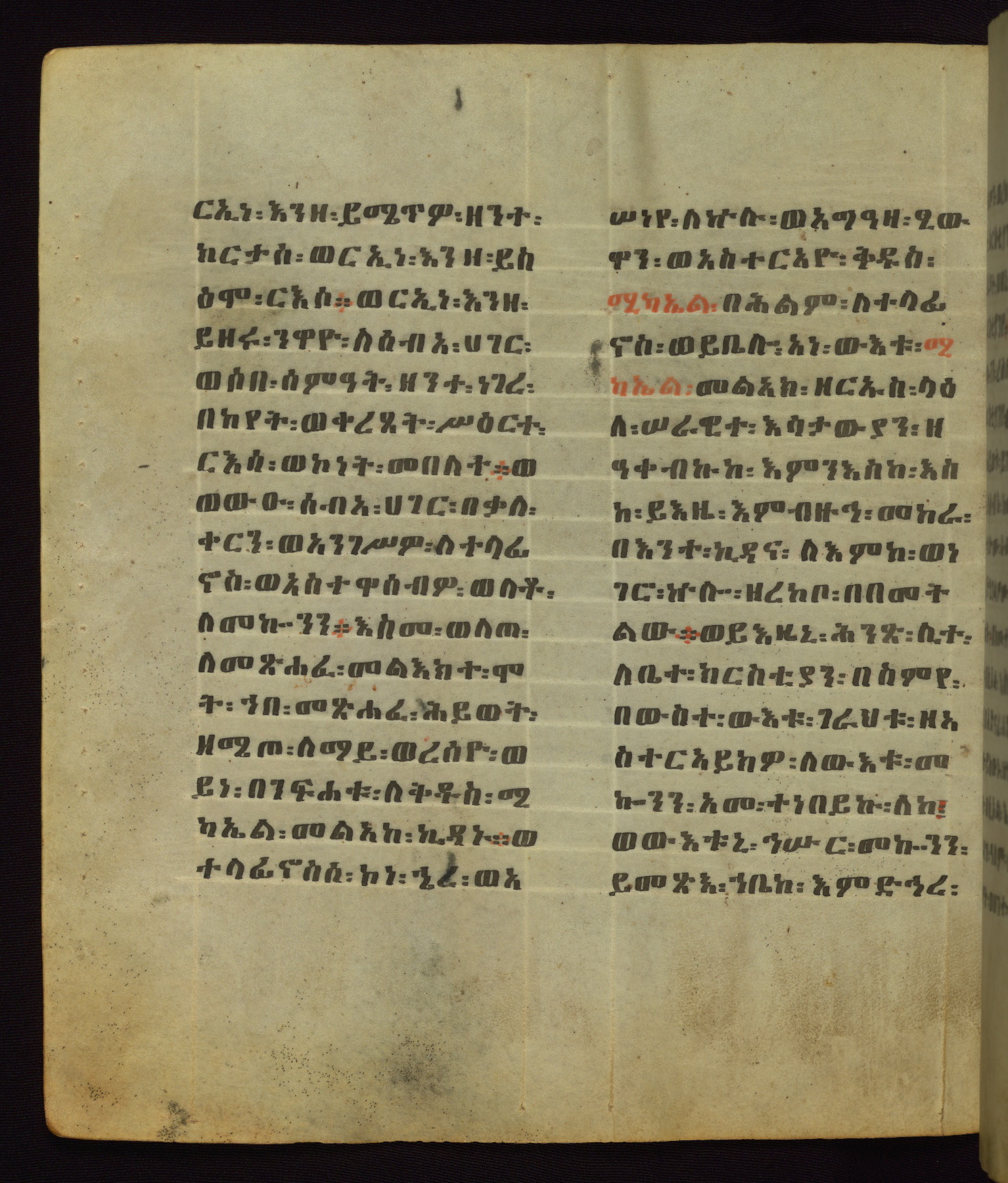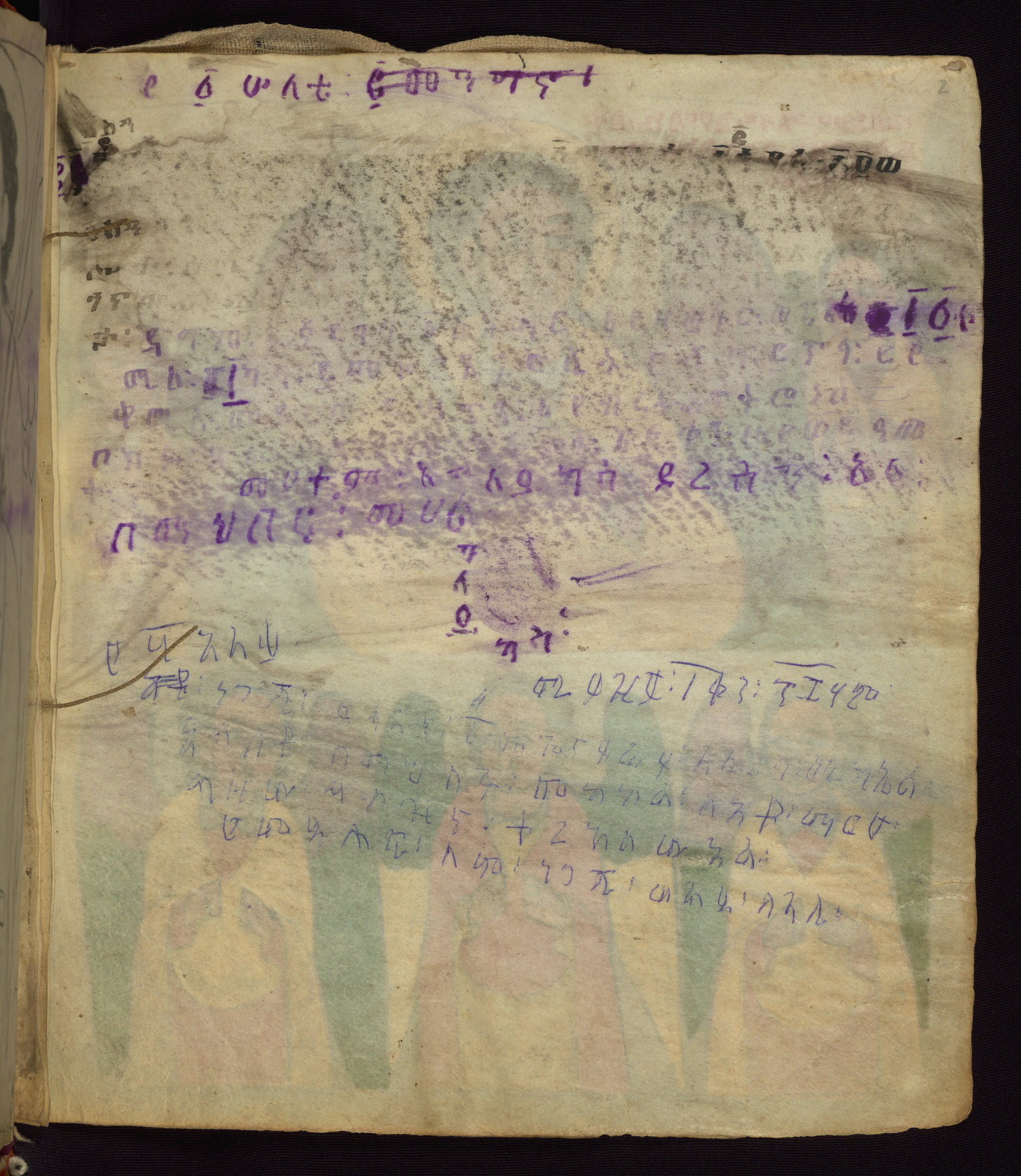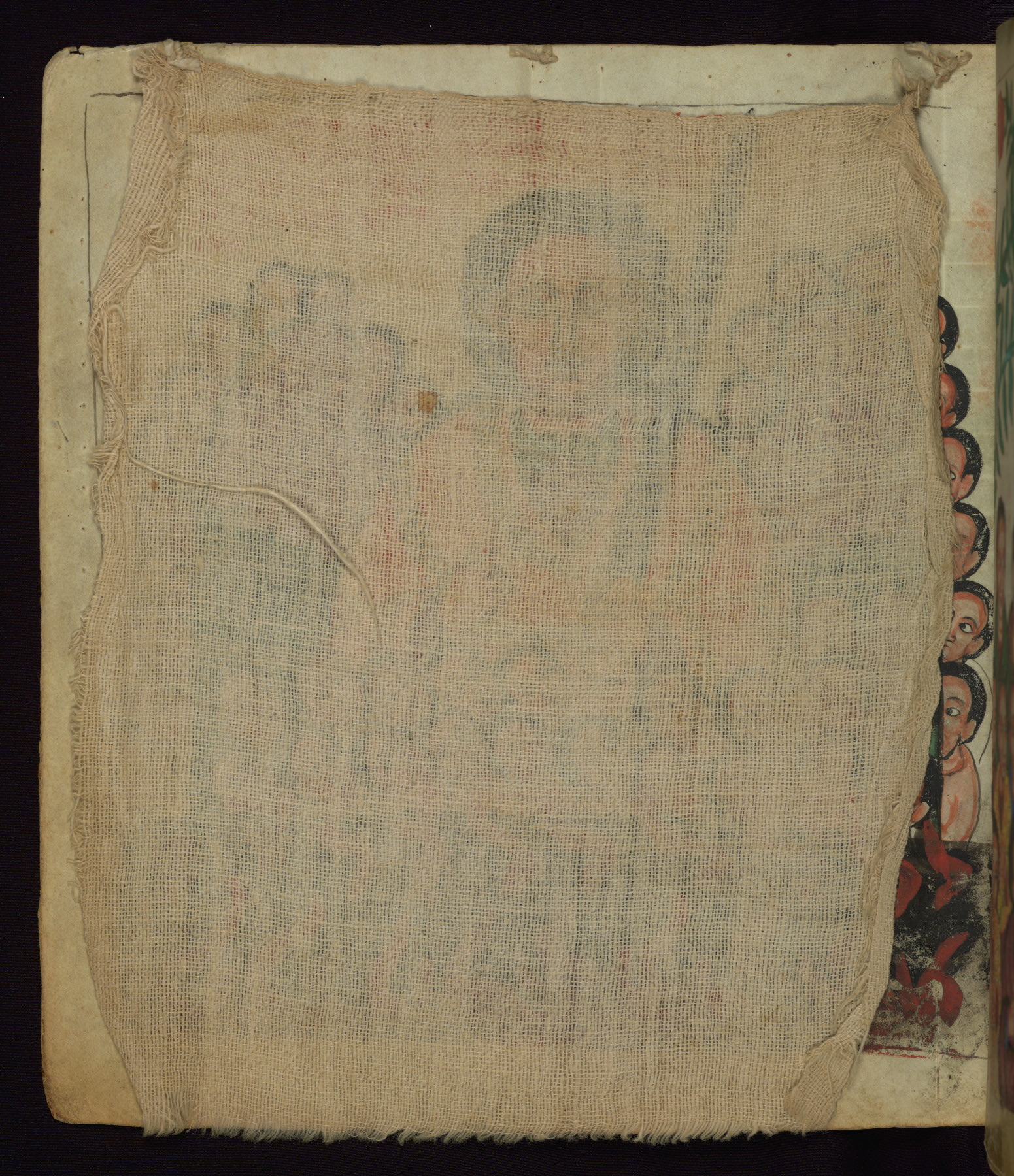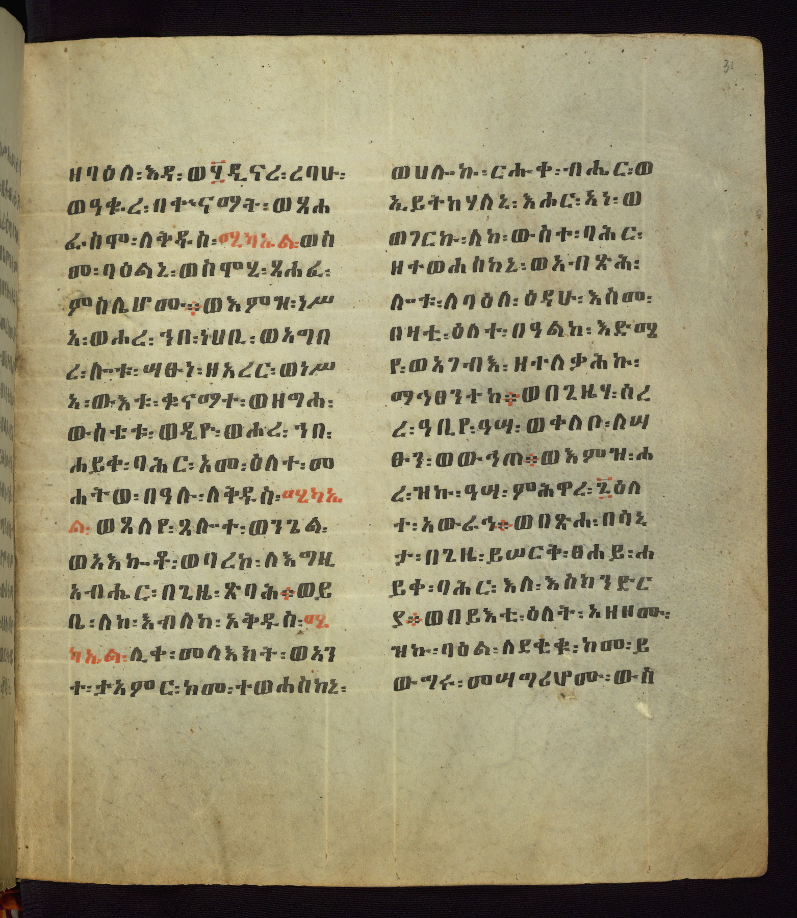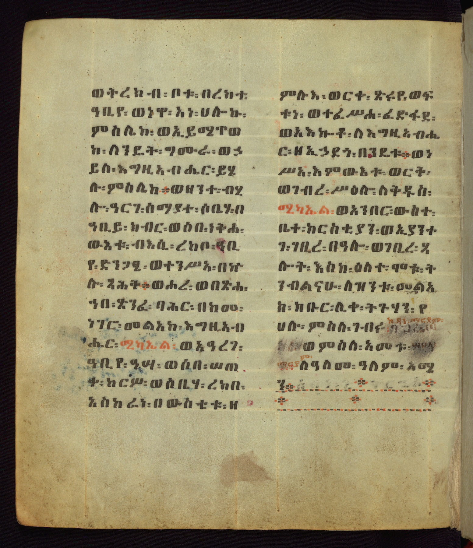 This Homiliary was created in Gondar, Ethiopia, during a period of artistic flowering in the late seventeenth century. The Imperial court and its accompanying aristocracy took up permanent residence in Gondar at this time, and the taste of these wealthy patrons for paintings and extensive image cycles is exemplified by this richly illuminated manuscript. The text, a Homiliary focused on the Miracles of the Archangel Michael, combines liturgical readings with forty-nine brightly colored renderings of God, St. Michael, and the miracles related in the text. Sections of the manuscript would have been read aloud on monthly feast days of the Archangel, and the images would have punctuated the readings. The artists were likely trained as painters, rather than solely as manuscript illuminators, and their art can therefore be linked stylistically to contemporary mural painting.