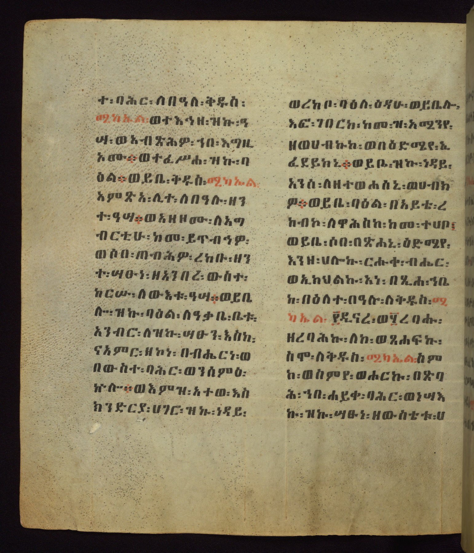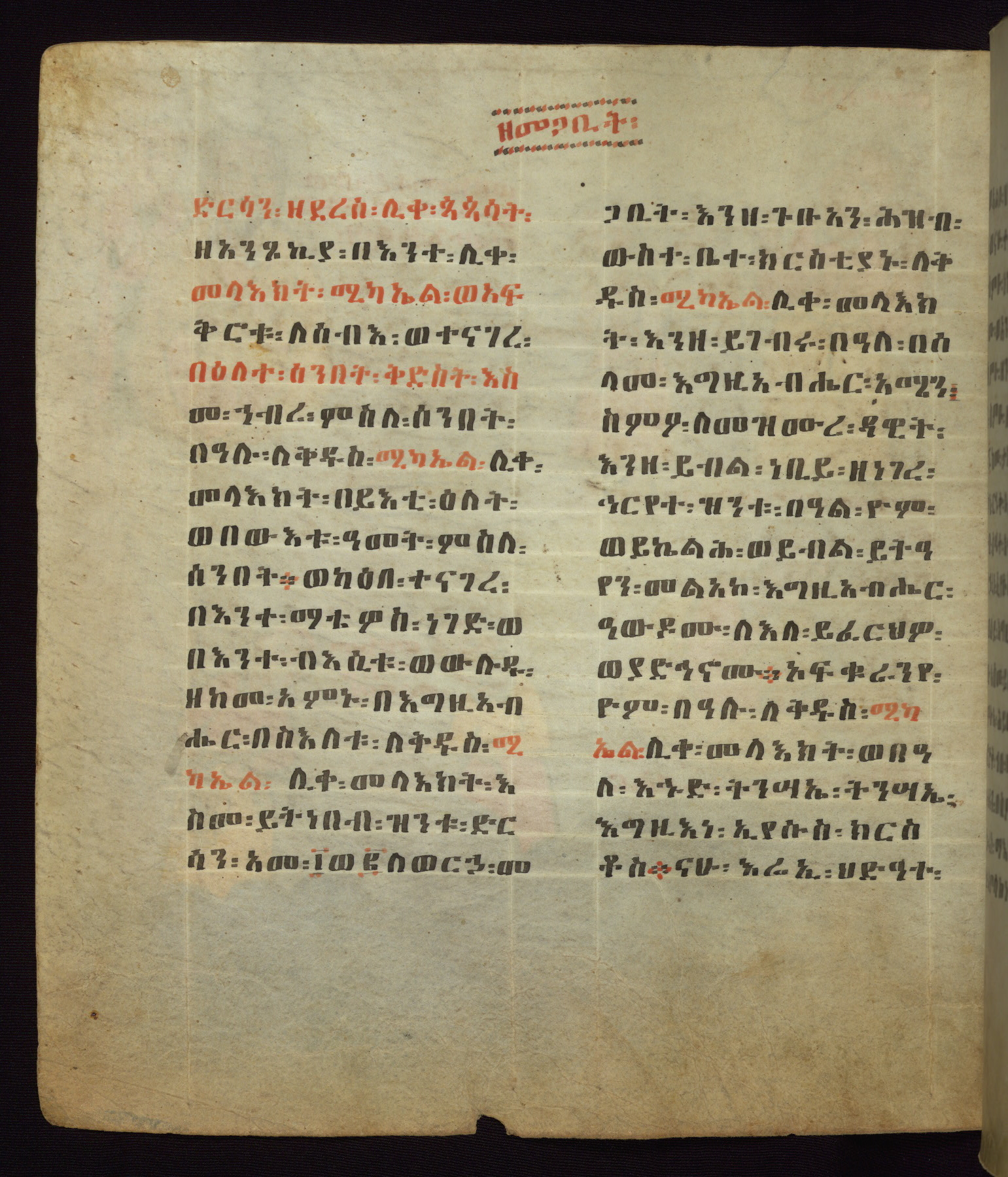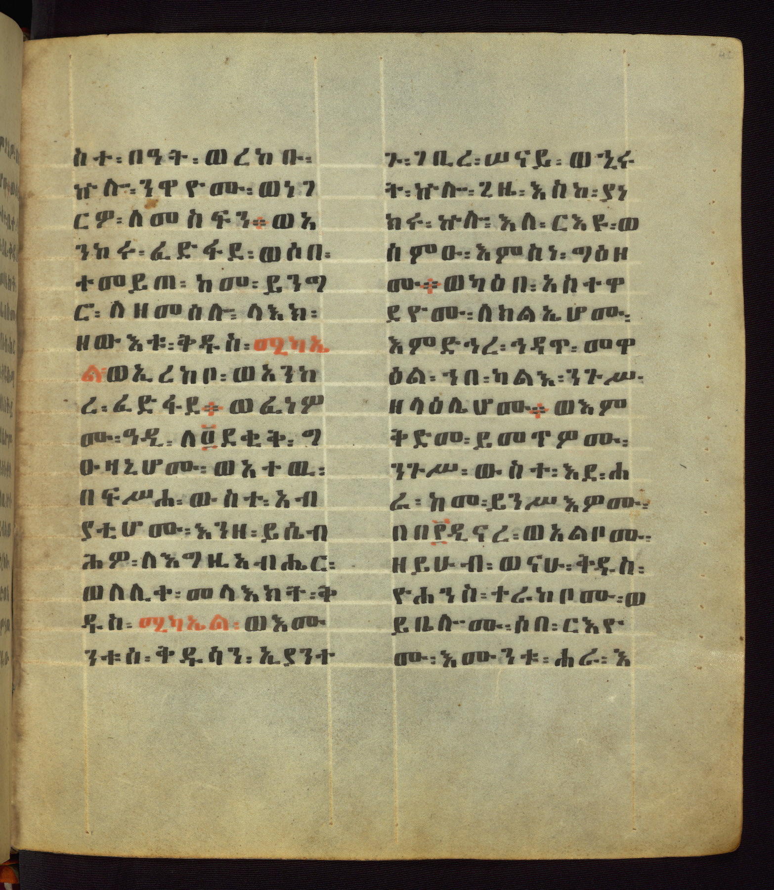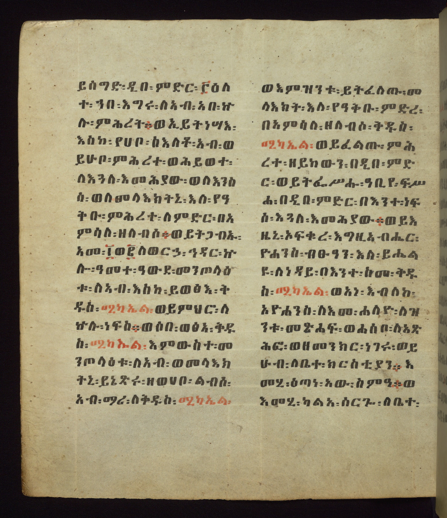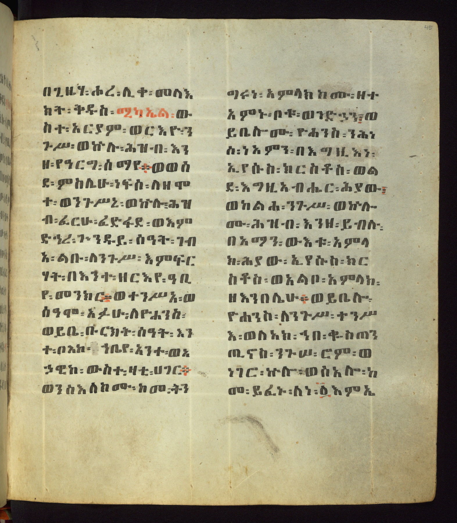This Homiliary was created in Gondar, Ethiopia, during a period of artistic flowering in the late seventeenth century. The Imperial court and its accompanying aristocracy took up permanent residence in Gondar at this time, and the taste of these wealthy patrons for paintings and extensive image cycles is exemplified by this richly illuminated manuscript. The text, a Homiliary focused on the Miracles of the Archangel Michael, combines liturgical readings with forty-nine brightly colored renderings of God, St. Michael, and the miracles related in the text. Sections of the manuscript would have been read aloud on monthly feast days of the Archangel, and the images would have punctuated the readings. The artists were likely trained as painters, rather than solely as manuscript illuminators, and their art can therefore be linked stylistically to contemporary mural painting.