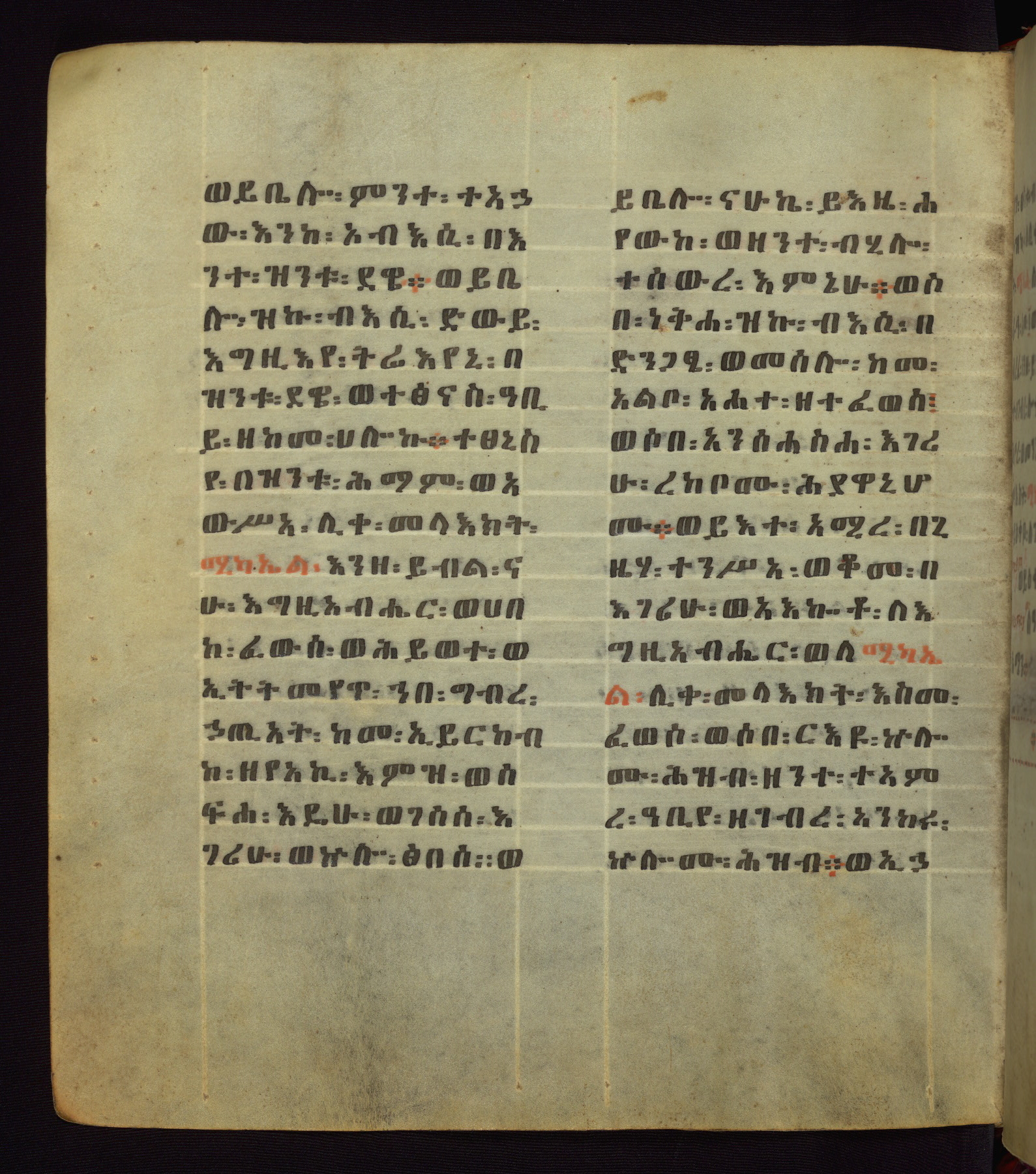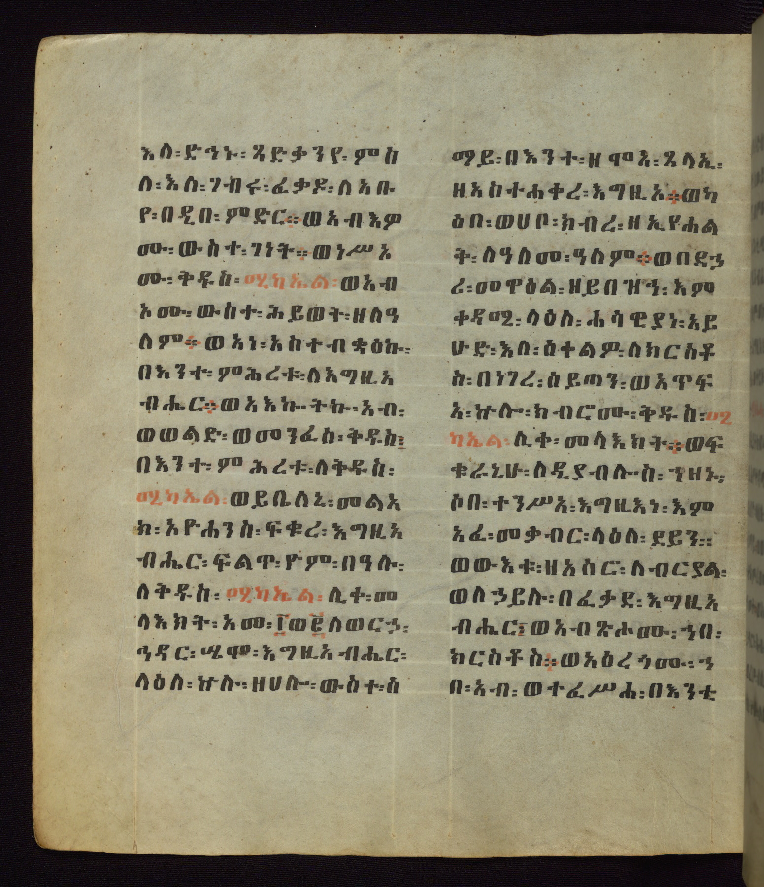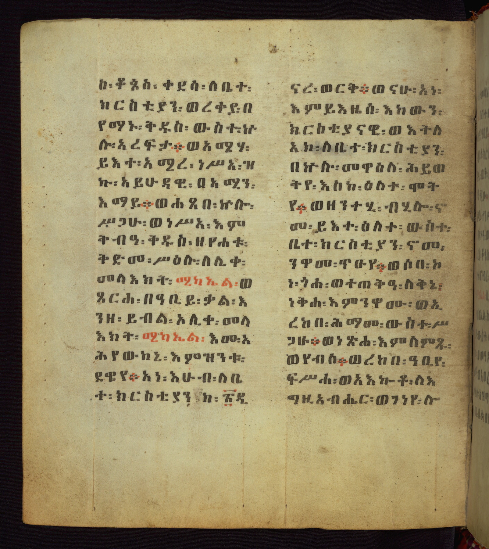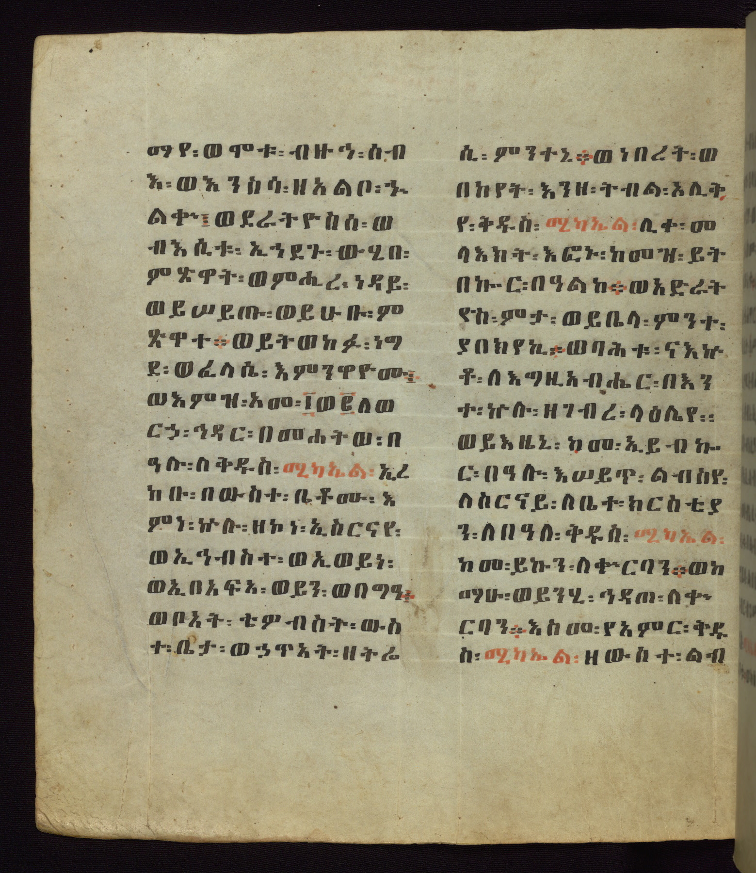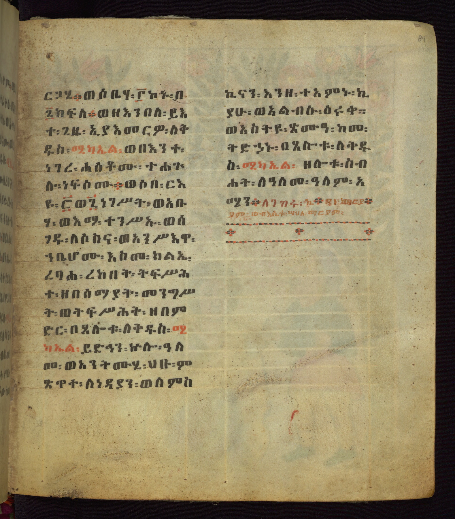 This Homiliary was created in Gondar, Ethiopia, during a period of artistic flowering in the late seventeenth century. The Imperial court and its accompanying aristocracy took up permanent residence in Gondar at this time, and the taste of these wealthy patrons for paintings and extensive image cycles is exemplified by this richly illuminated manuscript. The text, a Homiliary focused on the Miracles of the Archangel Michael, combines liturgical readings with forty-nine brightly colored renderings of God, St. Michael, and the miracles related in the text. Sections of the manuscript would have been read aloud on monthly feast days of the Archangel, and the images would have punctuated the readings. The artists were likely trained as painters, rather than solely as manuscript illuminators, and their art can therefore be linked stylistically to contemporary mural painting.