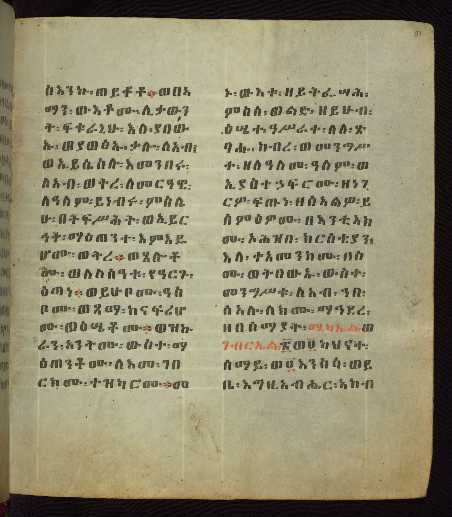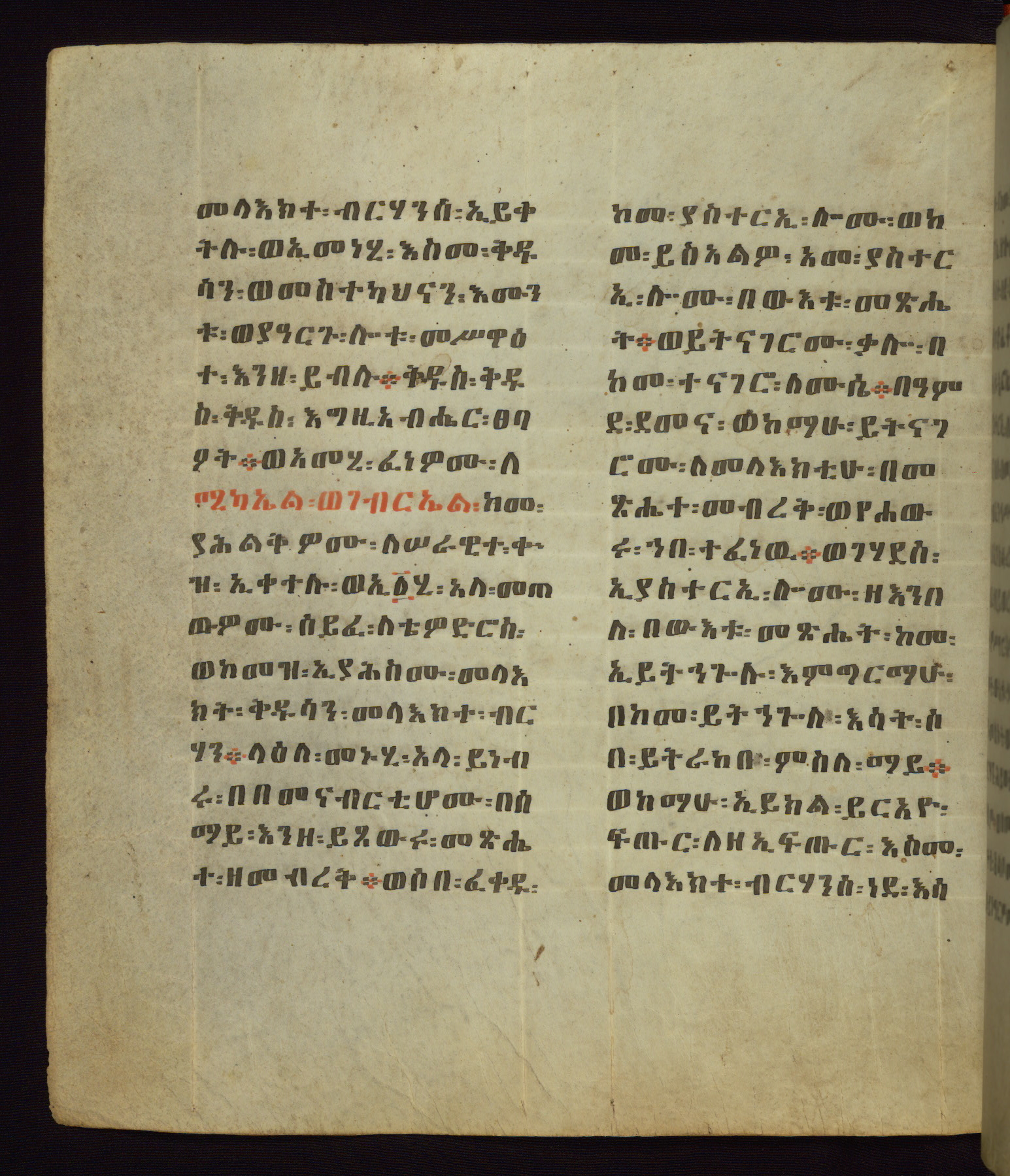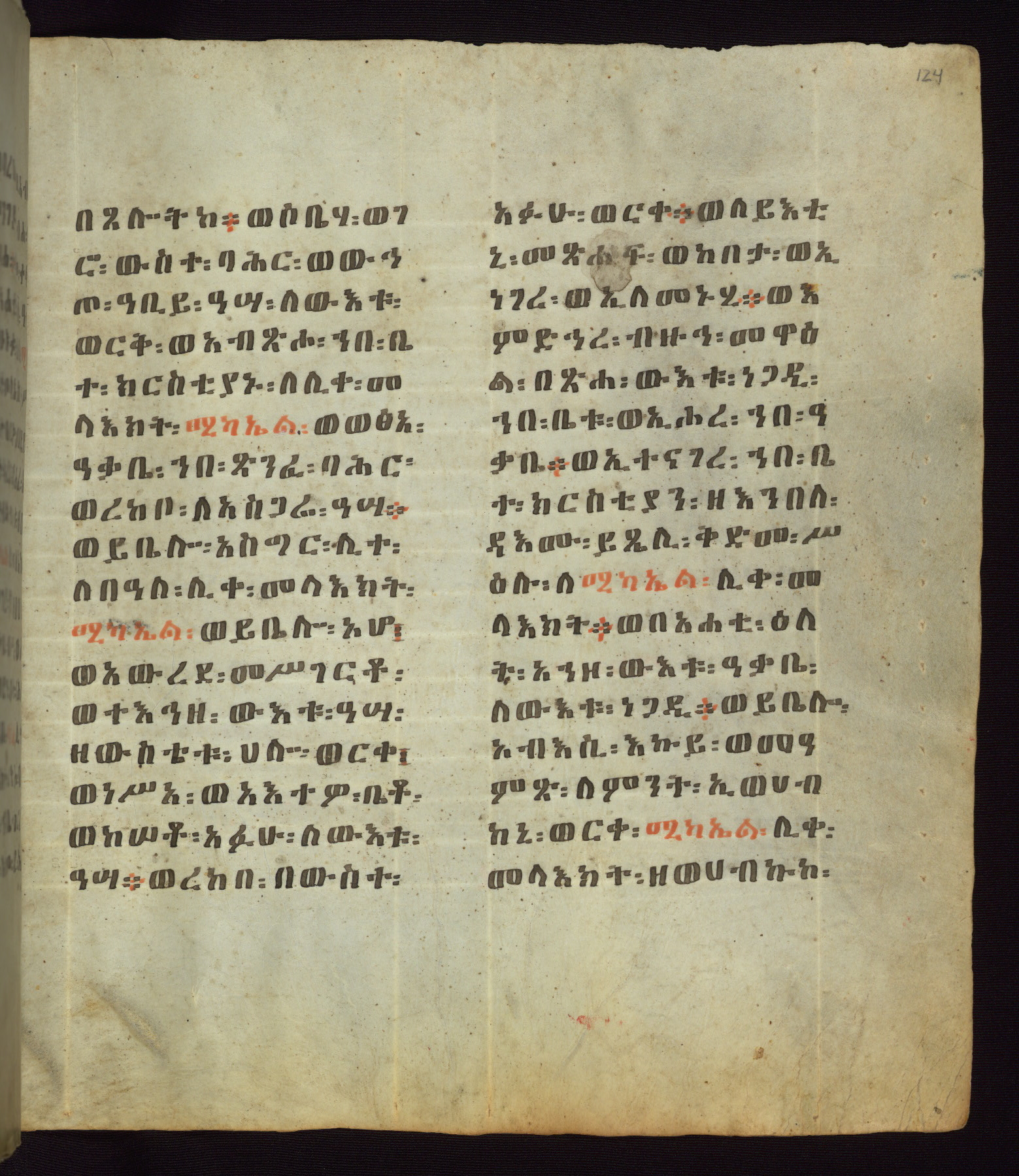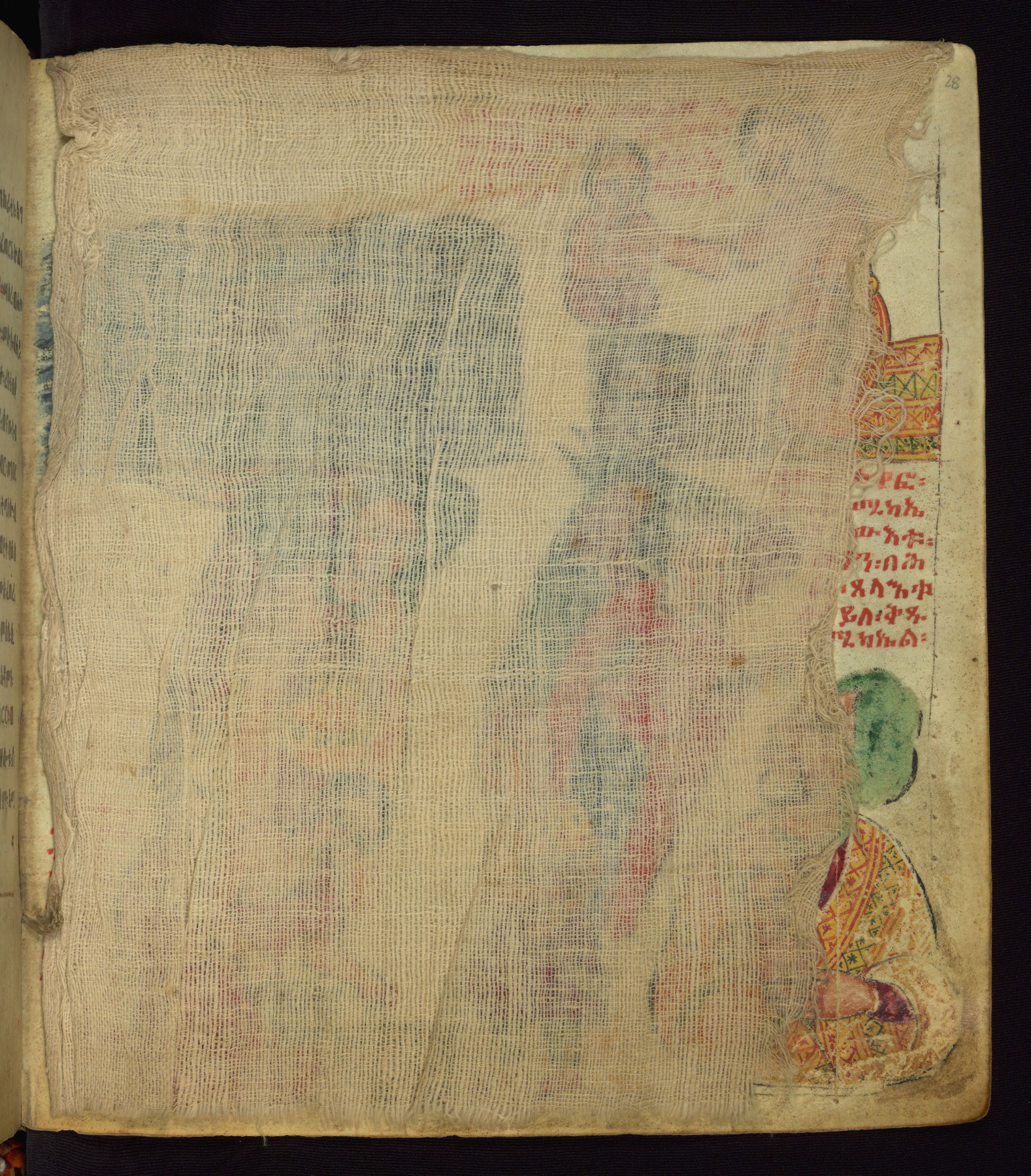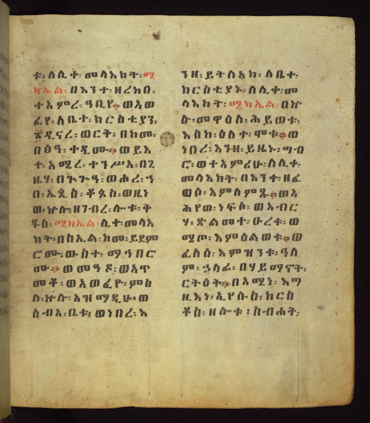This Homiliary was created in Gondar, Ethiopia, during a period of artistic flowering in the late seventeenth century. The Imperial court and its accompanying aristocracy took up permanent residence in Gondar at this time, and the taste of these wealthy patrons for paintings and extensive image cycles is exemplified by this richly illuminated manuscript. The text, a Homiliary focused on the Miracles of the Archangel Michael, combines liturgical readings with forty-nine brightly colored renderings of God, St. Michael, and the miracles related in the text. Sections of the manuscript would have been read aloud on monthly feast days of the Archangel, and the images would have punctuated the readings. The artists were likely trained as painters, rather than solely as manuscript illuminators, and their art can therefore be linked stylistically to contemporary mural painting.