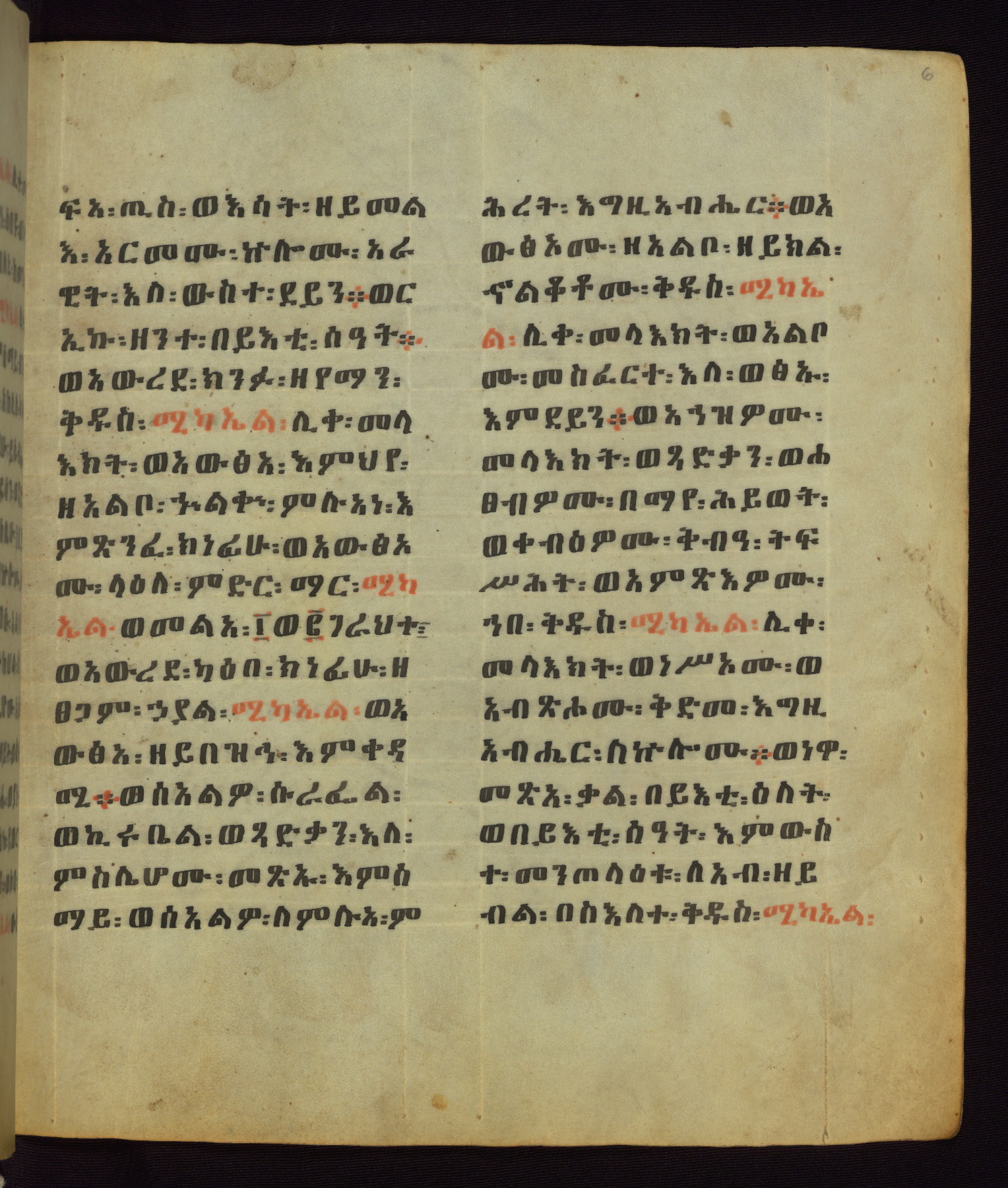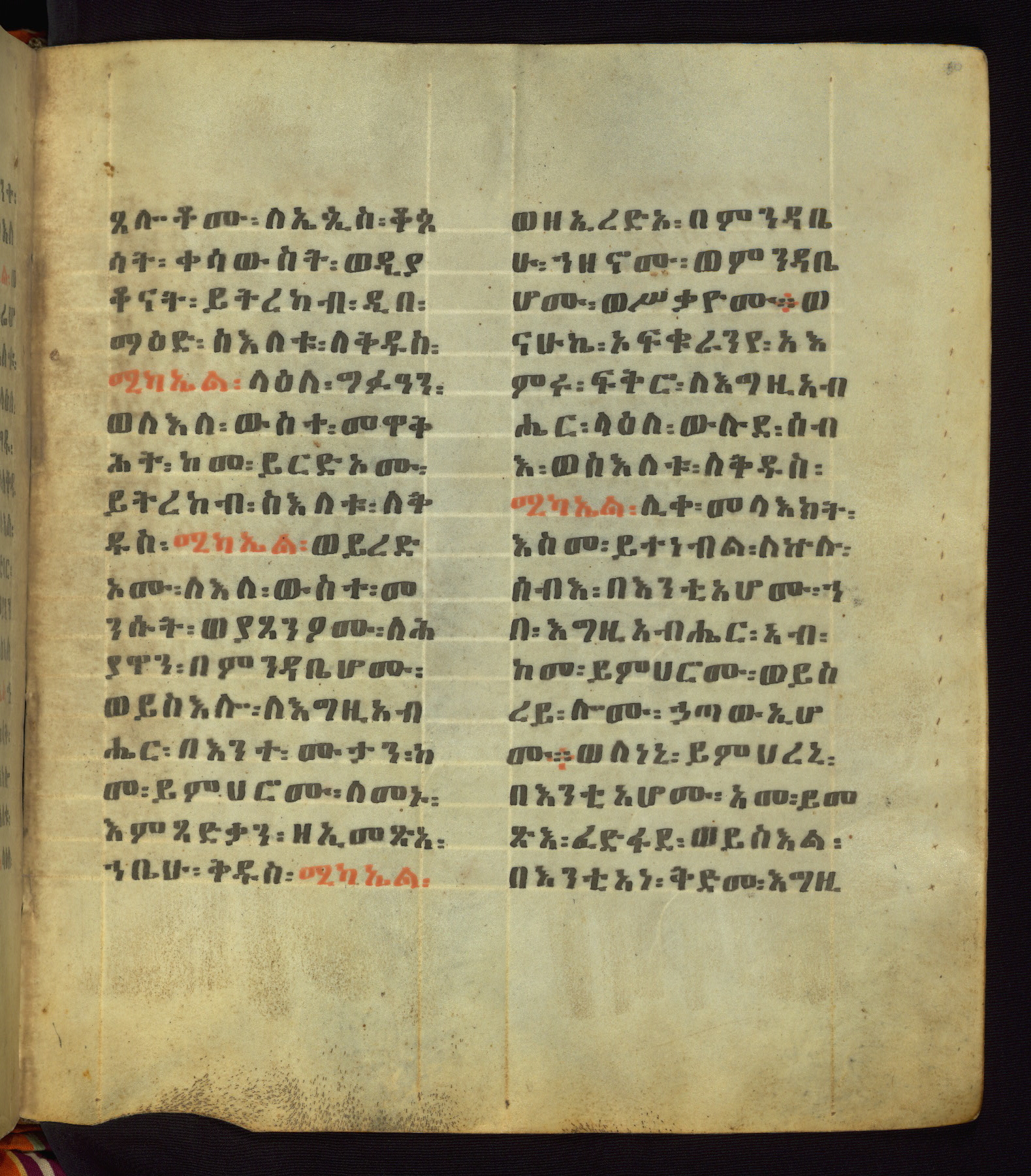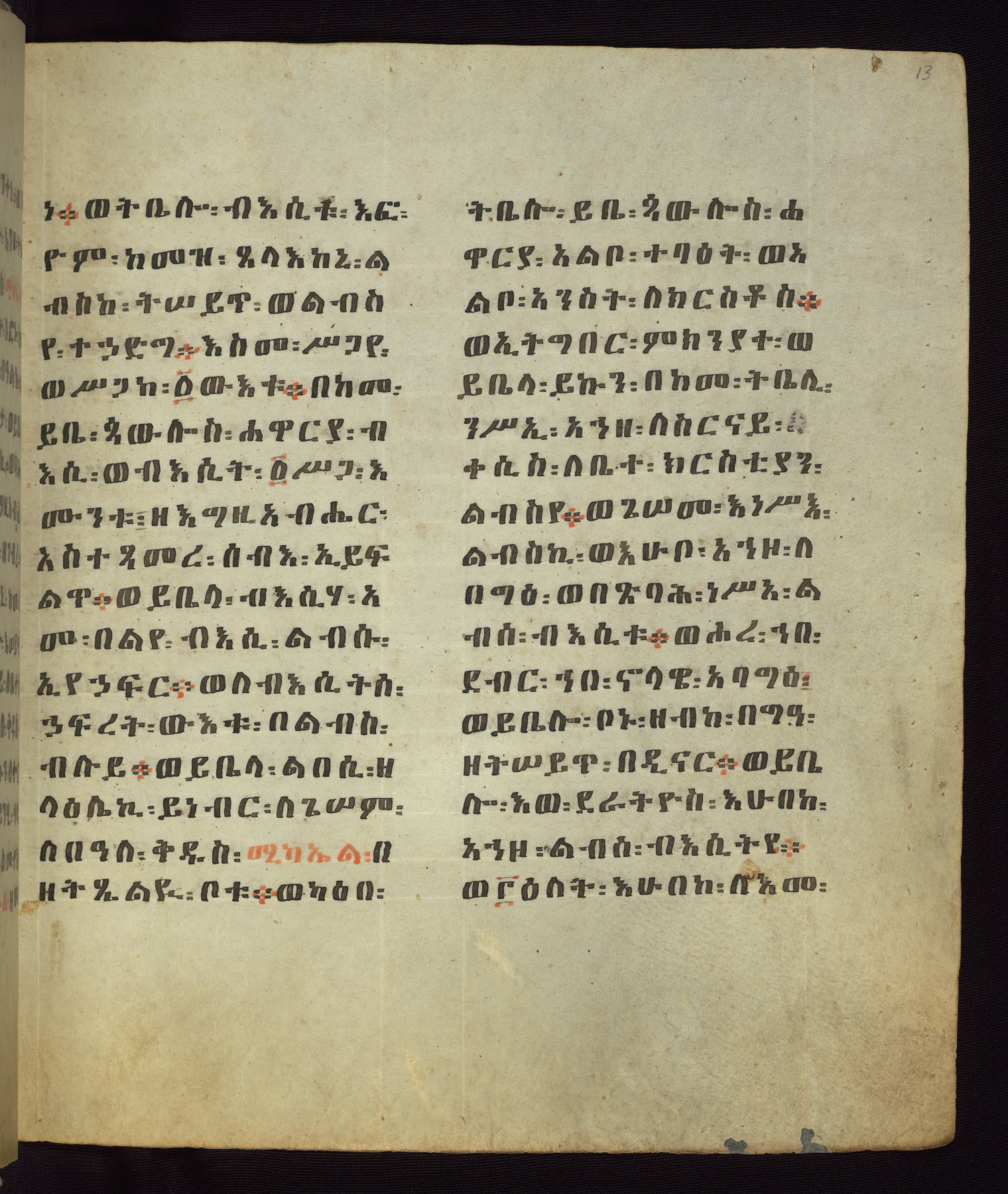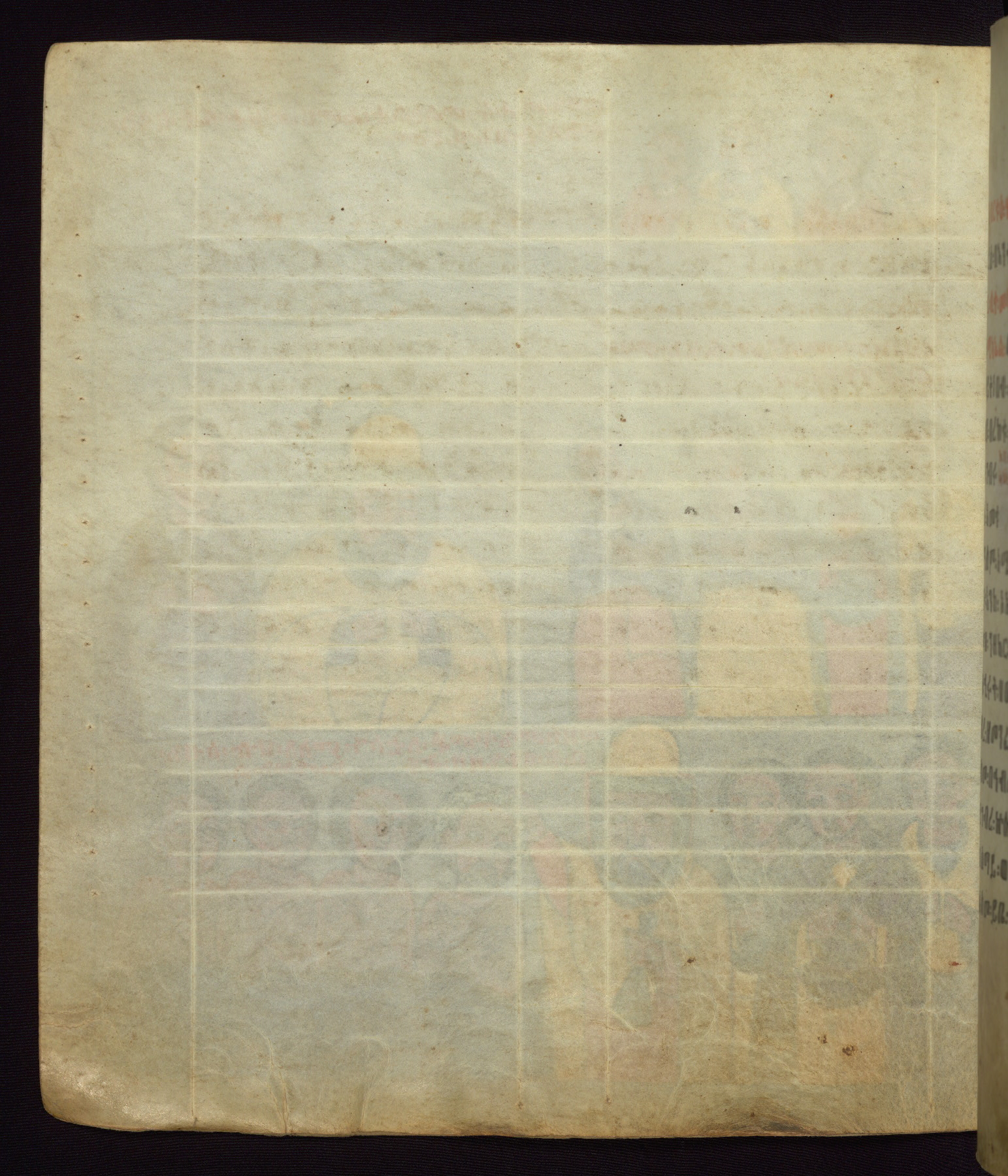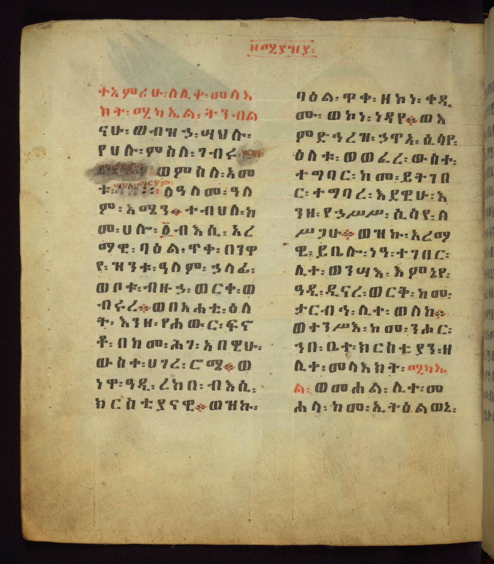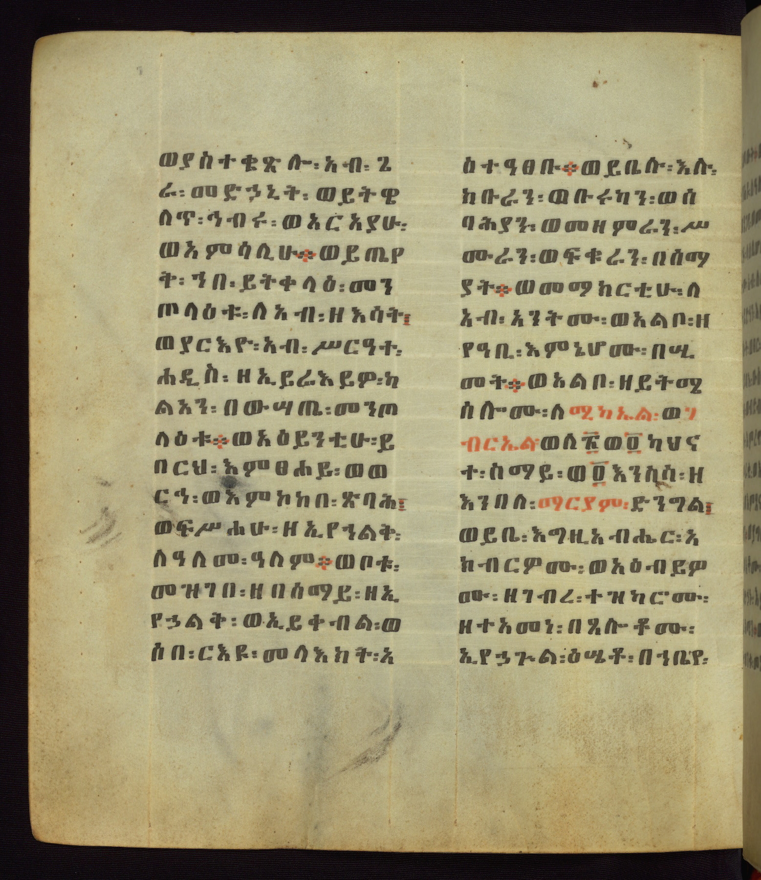 This Homiliary was created in Gondar, Ethiopia, during a period of artistic flowering in the late seventeenth century. The Imperial court and its accompanying aristocracy took up permanent residence in Gondar at this time, and the taste of these wealthy patrons for paintings and extensive image cycles is exemplified by this richly illuminated manuscript. The text, a Homiliary focused on the Miracles of the Archangel Michael, combines liturgical readings with forty-nine brightly colored renderings of God, St. Michael, and the miracles related in the text. Sections of the manuscript would have been read aloud on monthly feast days of the Archangel, and the images would have punctuated the readings. The artists were likely trained as painters, rather than solely as manuscript illuminators, and their art can therefore be linked stylistically to contemporary mural painting.