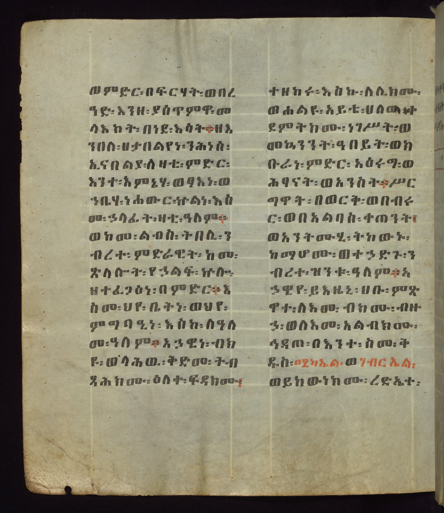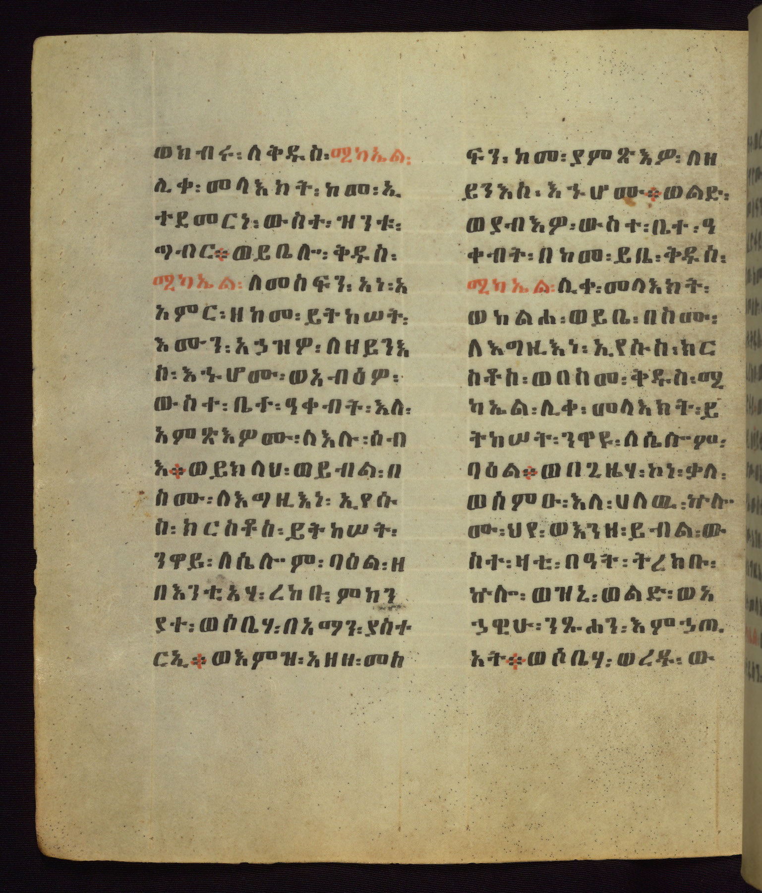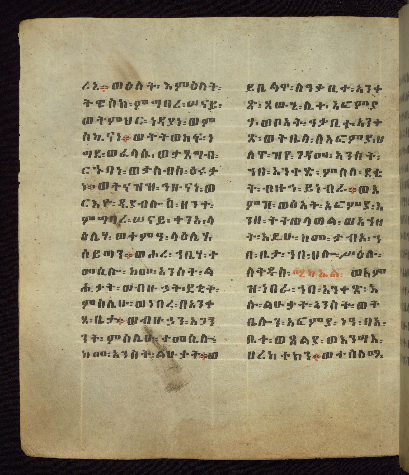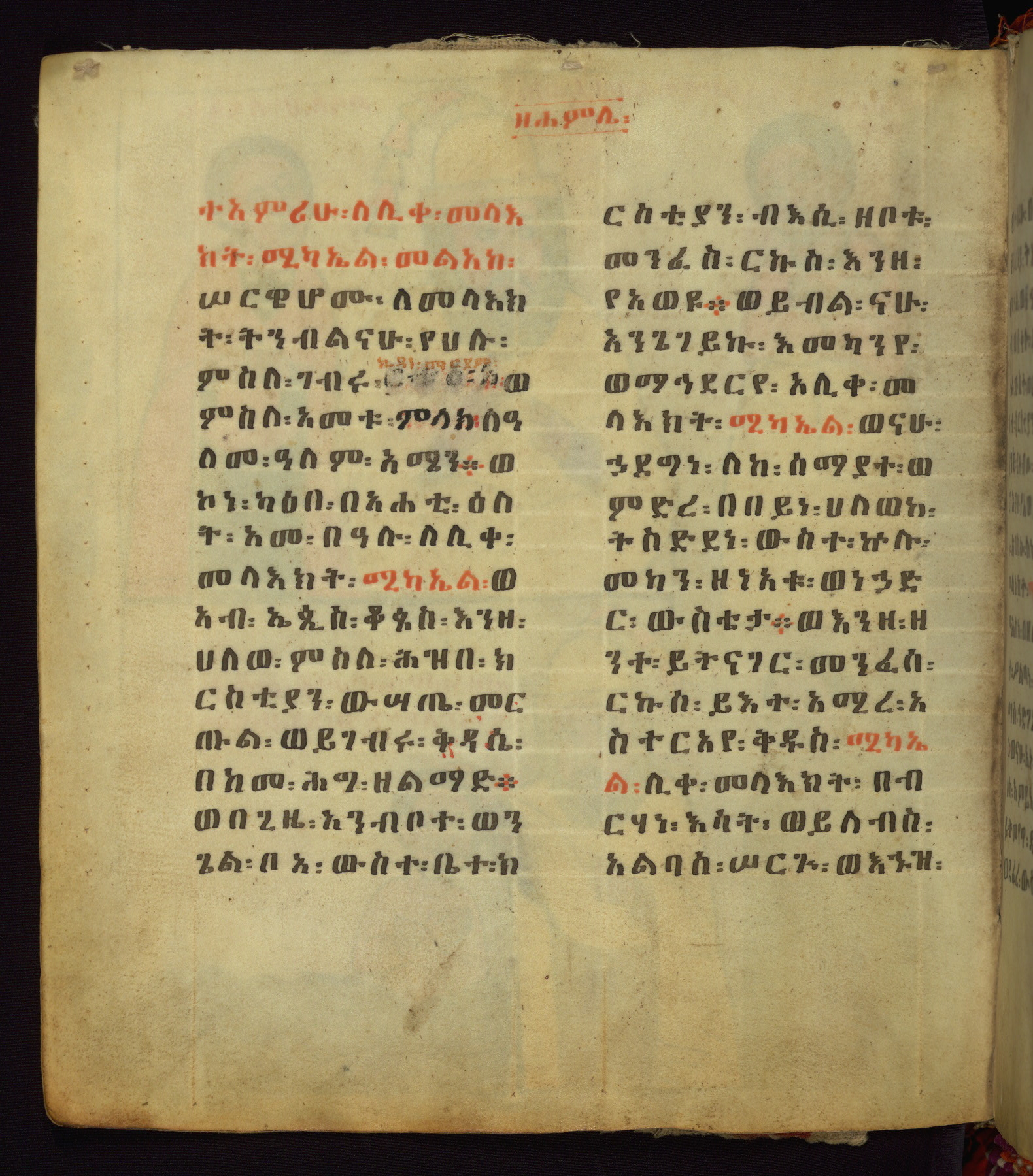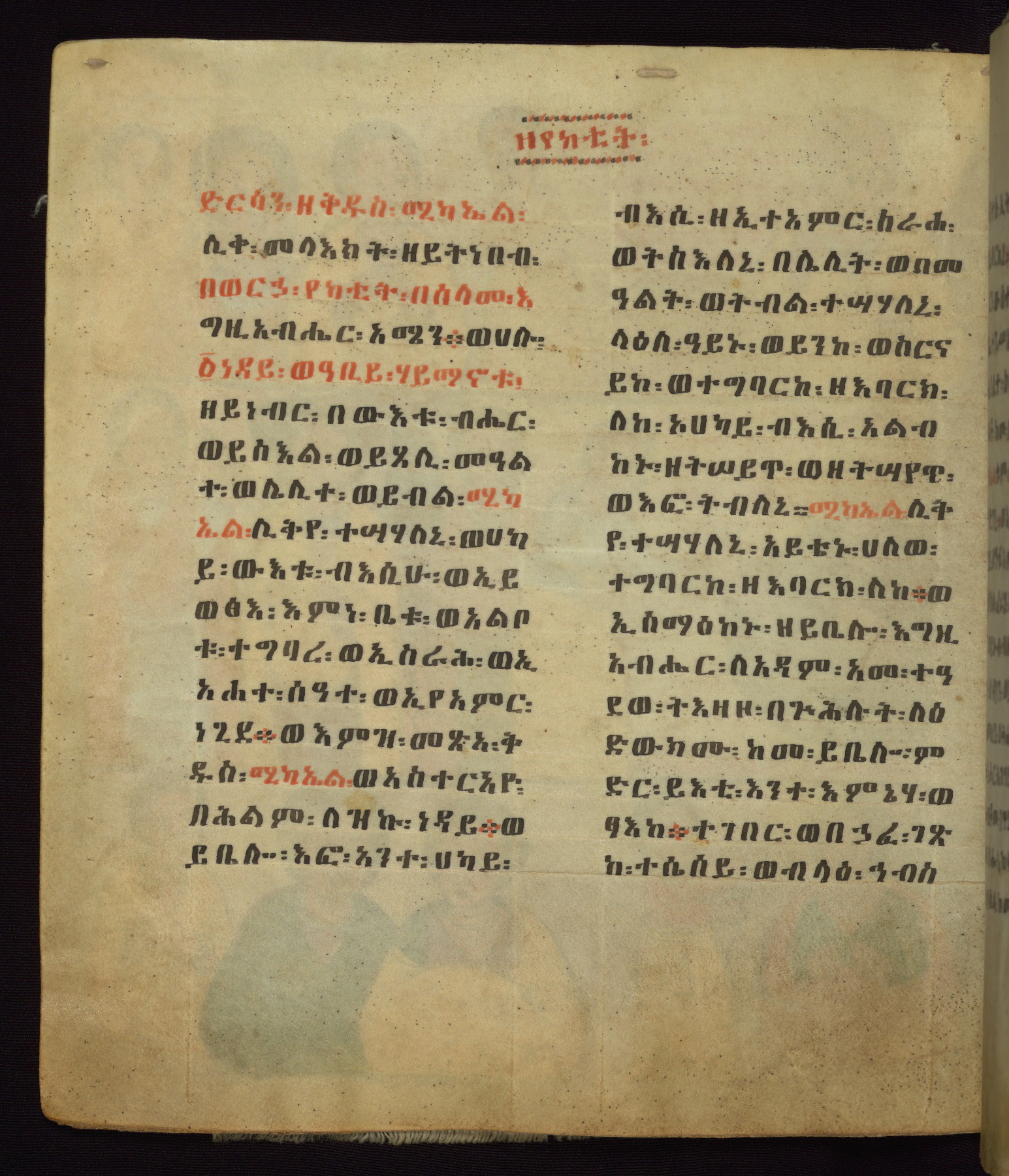 This Homiliary was created in Gondar, Ethiopia, during a period of artistic flowering in the late seventeenth century. The Imperial court and its accompanying aristocracy took up permanent residence in Gondar at this time, and the taste of these wealthy patrons for paintings and extensive image cycles is exemplified by this richly illuminated manuscript. The text, a Homiliary focused on the Miracles of the Archangel Michael, combines liturgical readings with forty-nine brightly colored renderings of God, St. Michael, and the miracles related in the text. Sections of the manuscript would have been read aloud on monthly feast days of the Archangel, and the images would have punctuated the readings. The artists were likely trained as painters, rather than solely as manuscript illuminators, and their art can therefore be linked stylistically to contemporary mural painting.