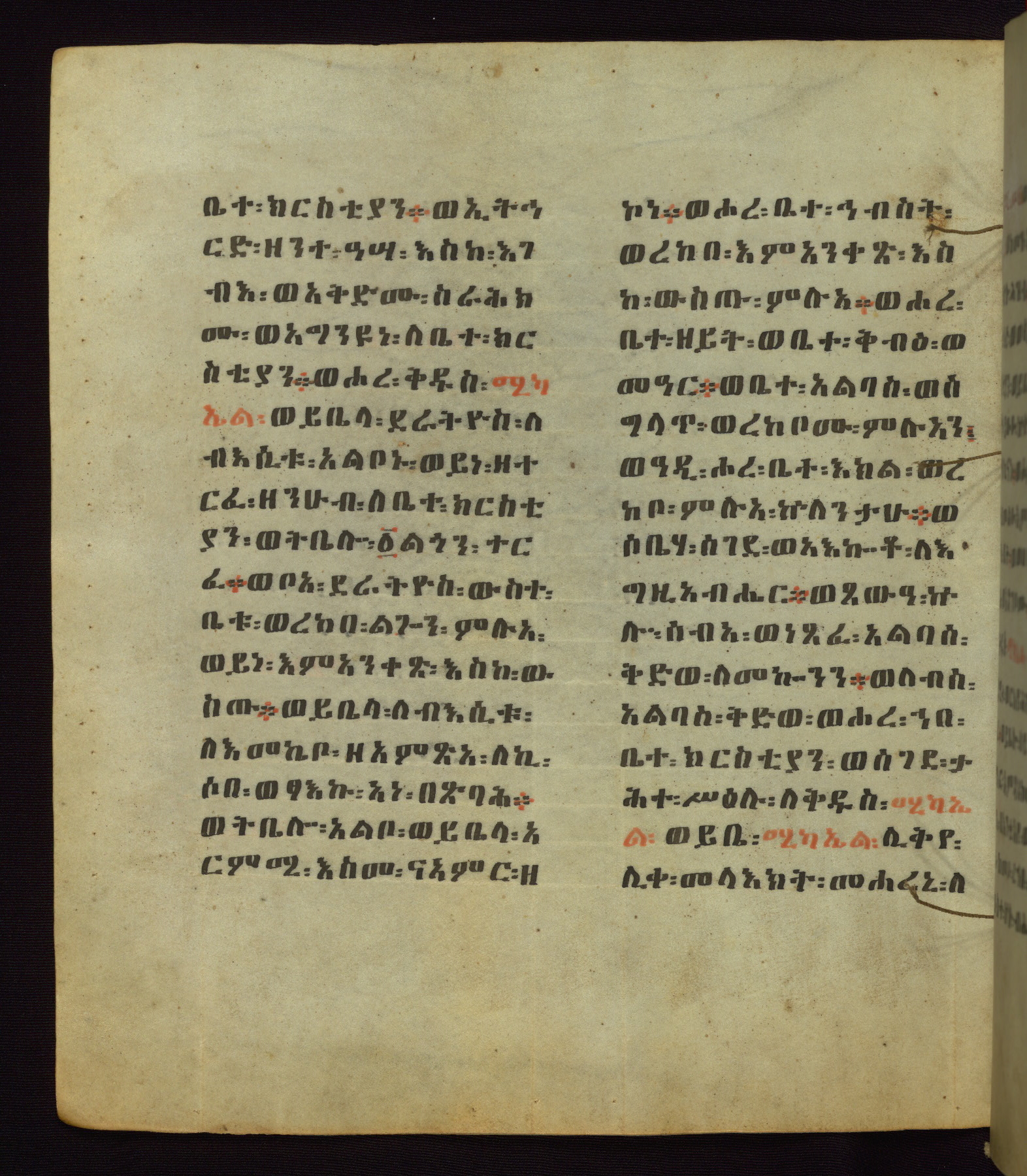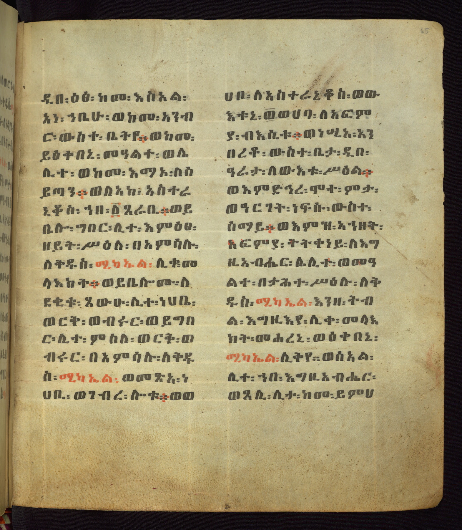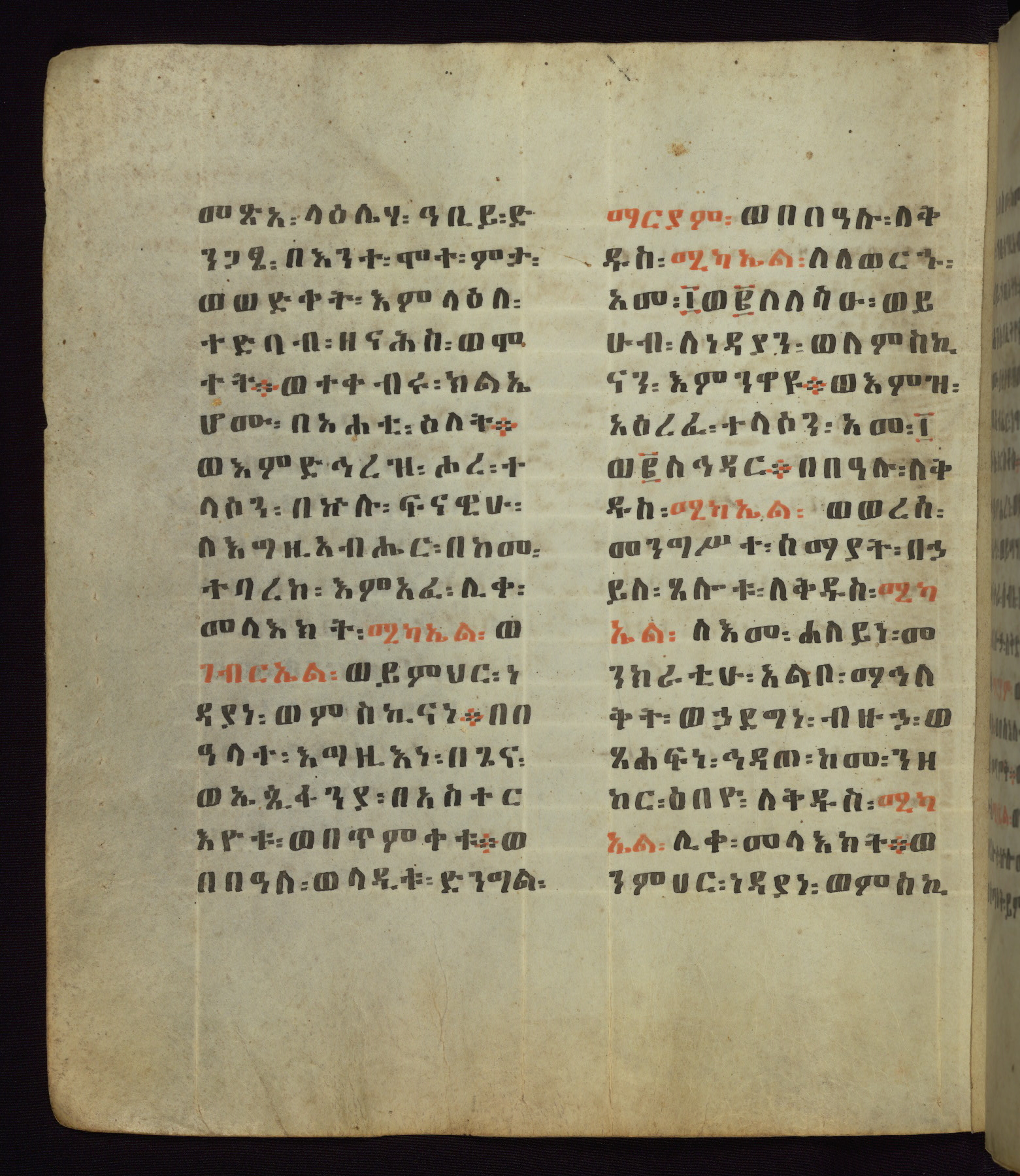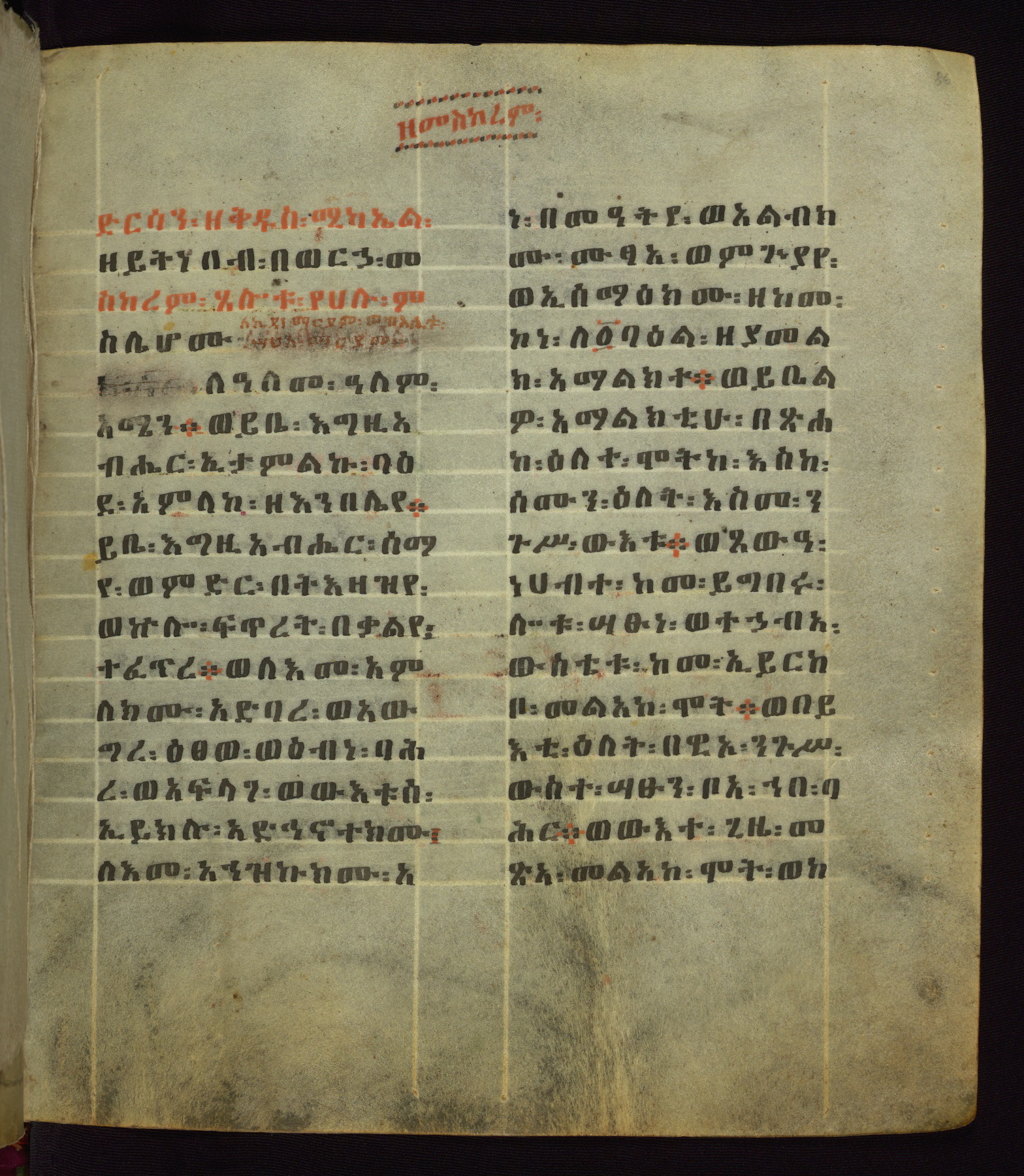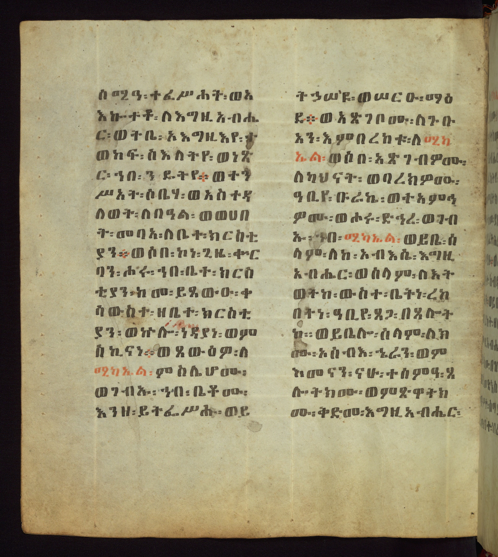 This Homiliary was created in Gondar, Ethiopia, during a period of artistic flowering in the late seventeenth century. The Imperial court and its accompanying aristocracy took up permanent residence in Gondar at this time, and the taste of these wealthy patrons for paintings and extensive image cycles is exemplified by this richly illuminated manuscript. The text, a Homiliary focused on the Miracles of the Archangel Michael, combines liturgical readings with forty-nine brightly colored renderings of God, St. Michael, and the miracles related in the text. Sections of the manuscript would have been read aloud on monthly feast days of the Archangel, and the images would have punctuated the readings. The artists were likely trained as painters, rather than solely as manuscript illuminators, and their art can therefore be linked stylistically to contemporary mural painting.