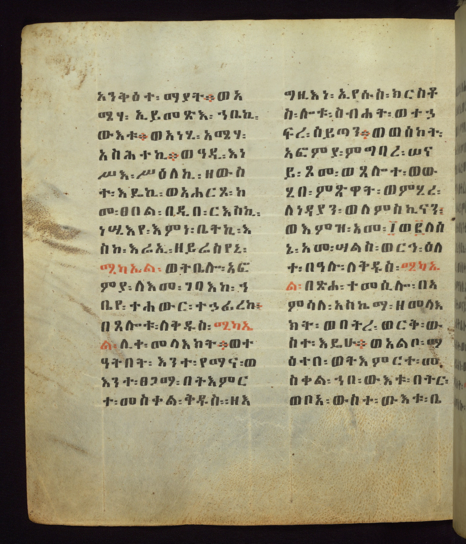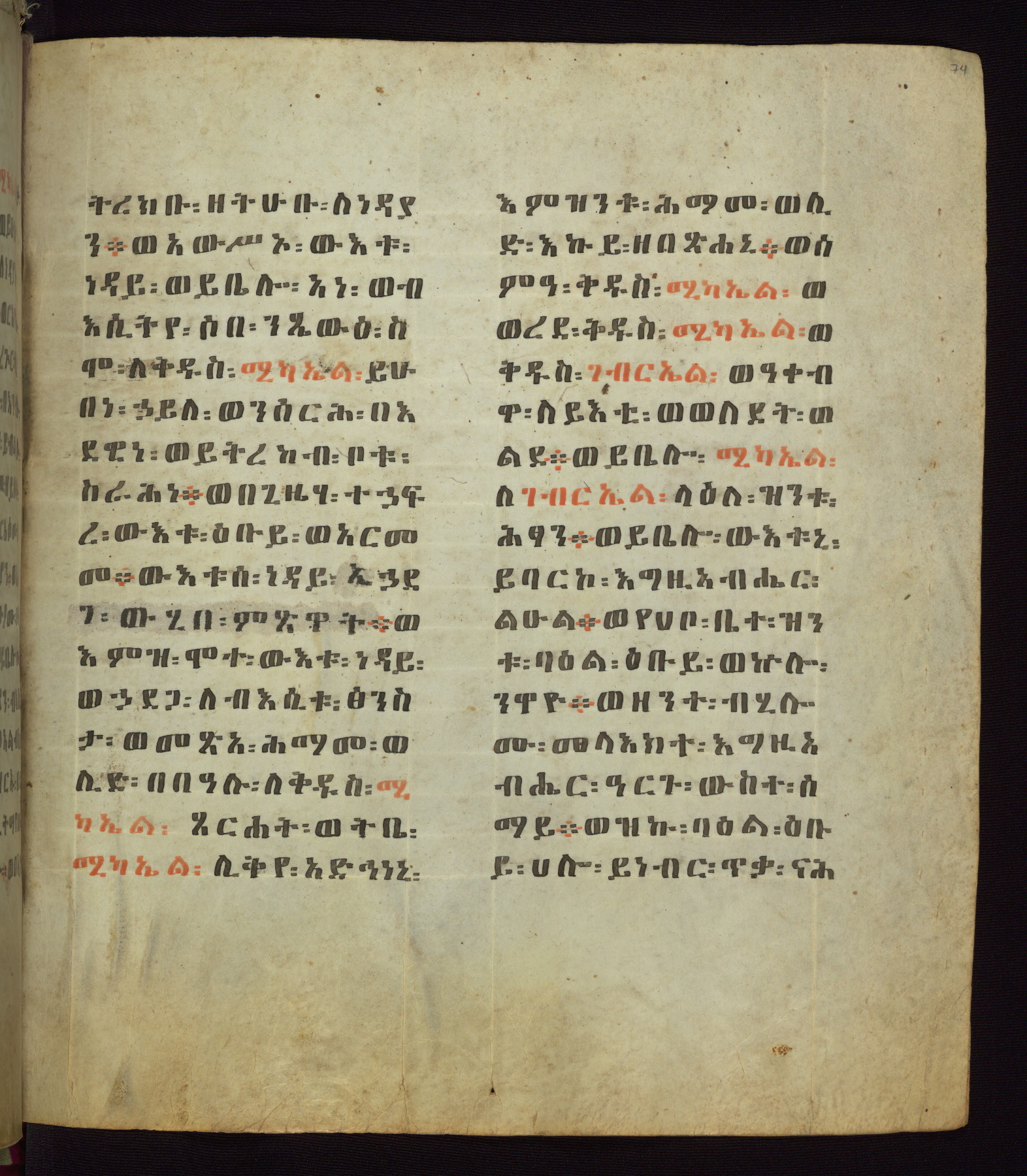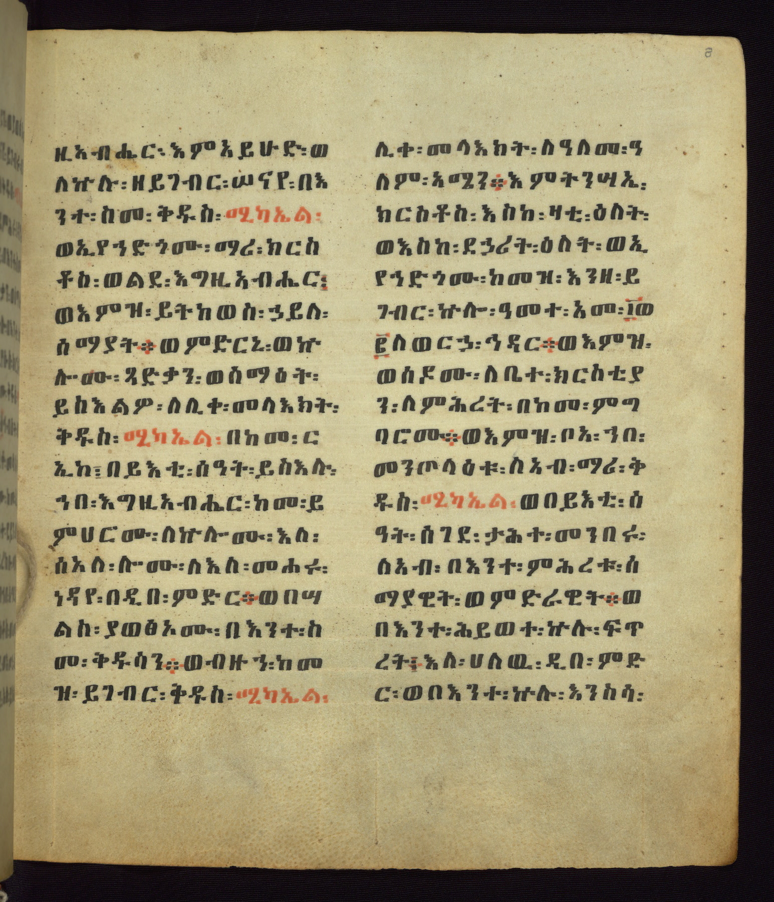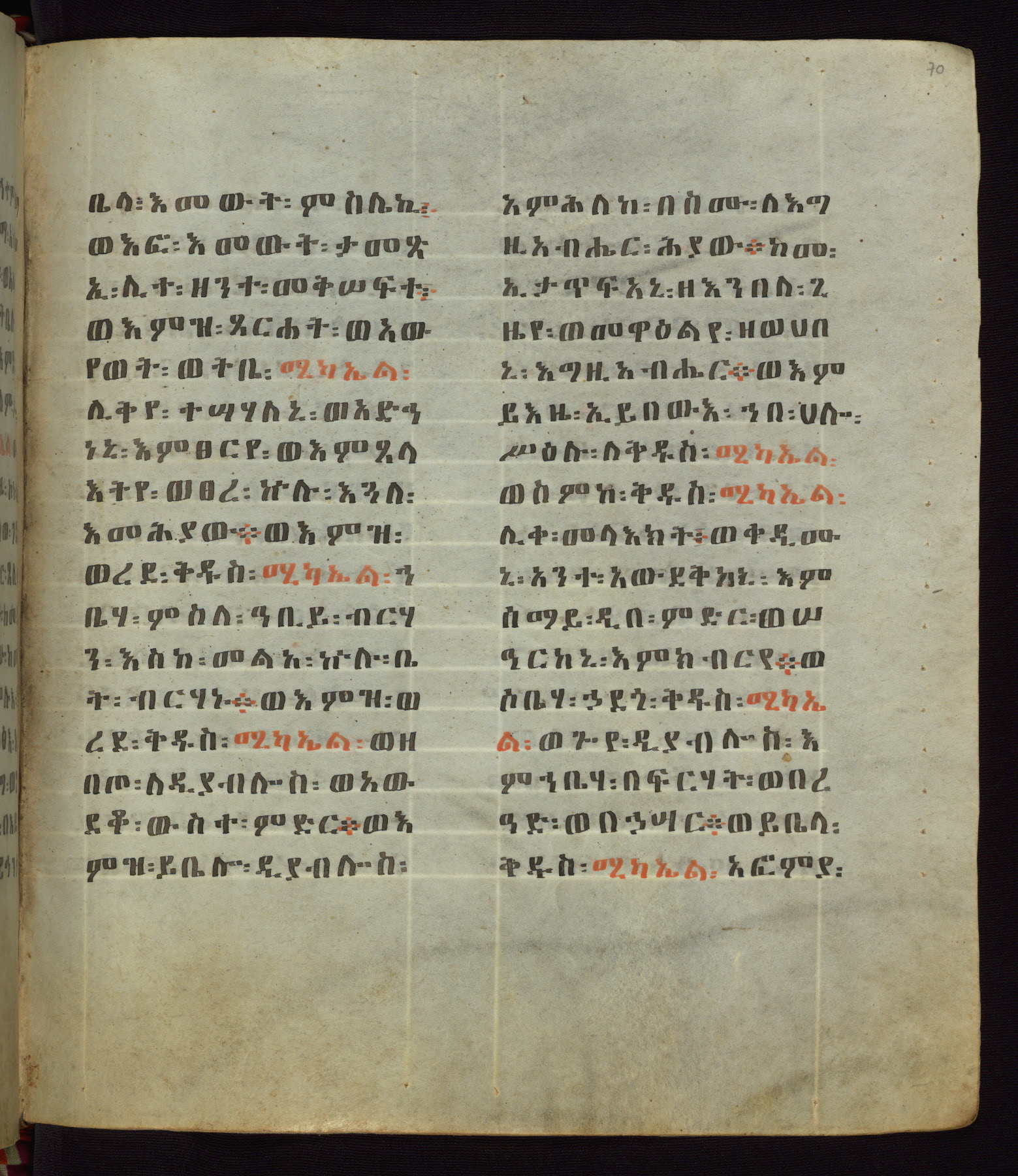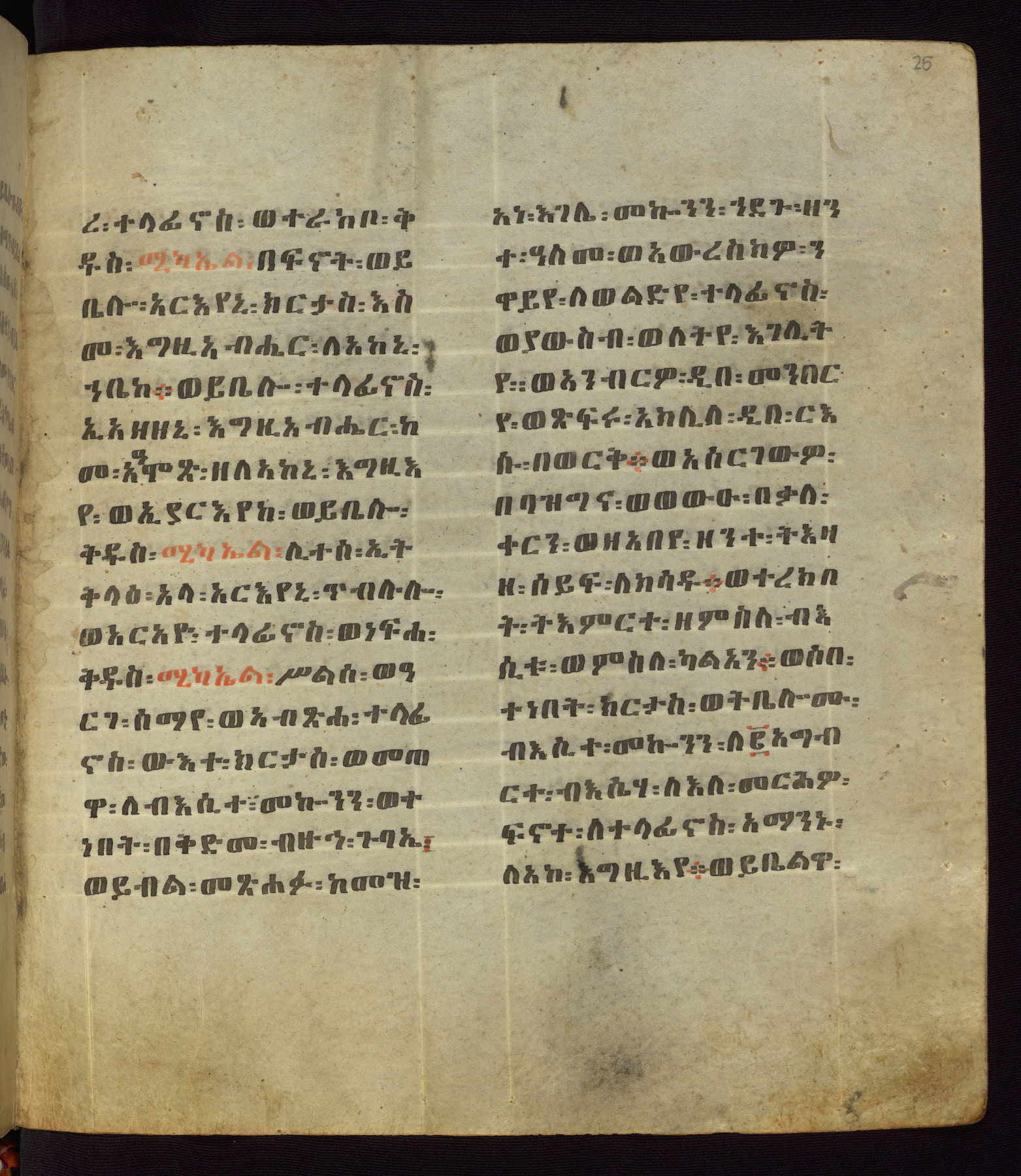 This Homiliary was created in Gondar, Ethiopia, during a period of artistic flowering in the late seventeenth century. The Imperial court and its accompanying aristocracy took up permanent residence in Gondar at this time, and the taste of these wealthy patrons for paintings and extensive image cycles is exemplified by this richly illuminated manuscript. The text, a Homiliary focused on the Miracles of the Archangel Michael, combines liturgical readings with forty-nine brightly colored renderings of God, St. Michael, and the miracles related in the text. Sections of the manuscript would have been read aloud on monthly feast days of the Archangel, and the images would have punctuated the readings. The artists were likely trained as painters, rather than solely as manuscript illuminators, and their art can therefore be linked stylistically to contemporary mural painting.