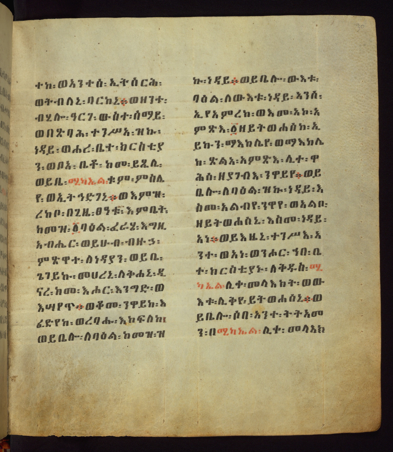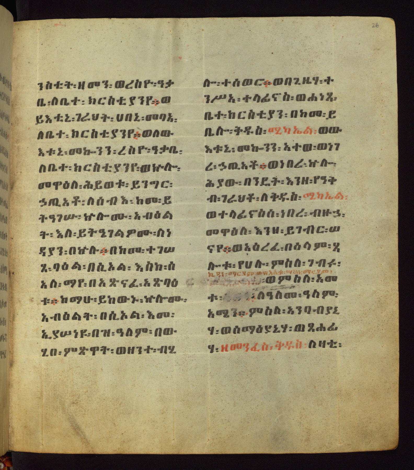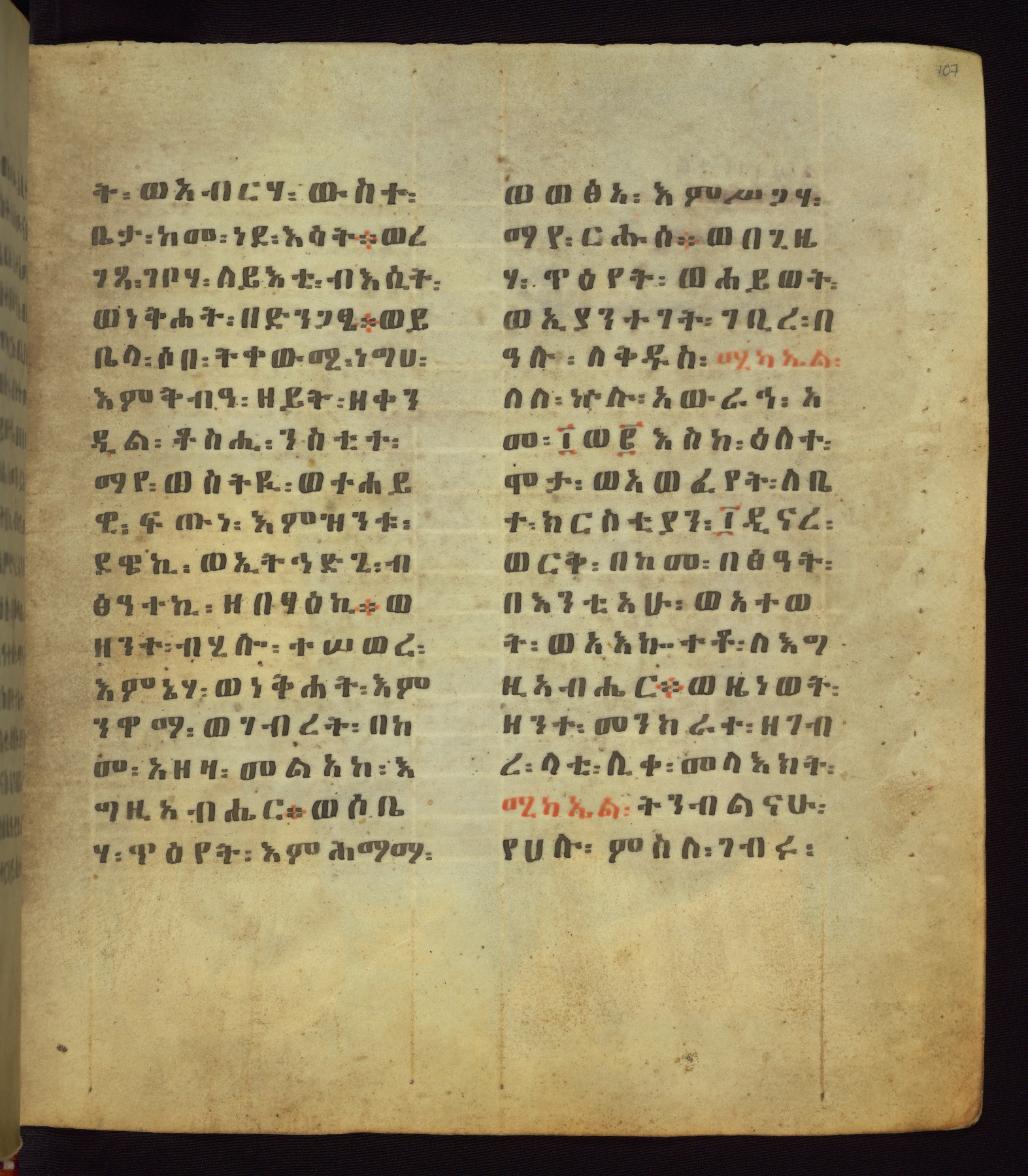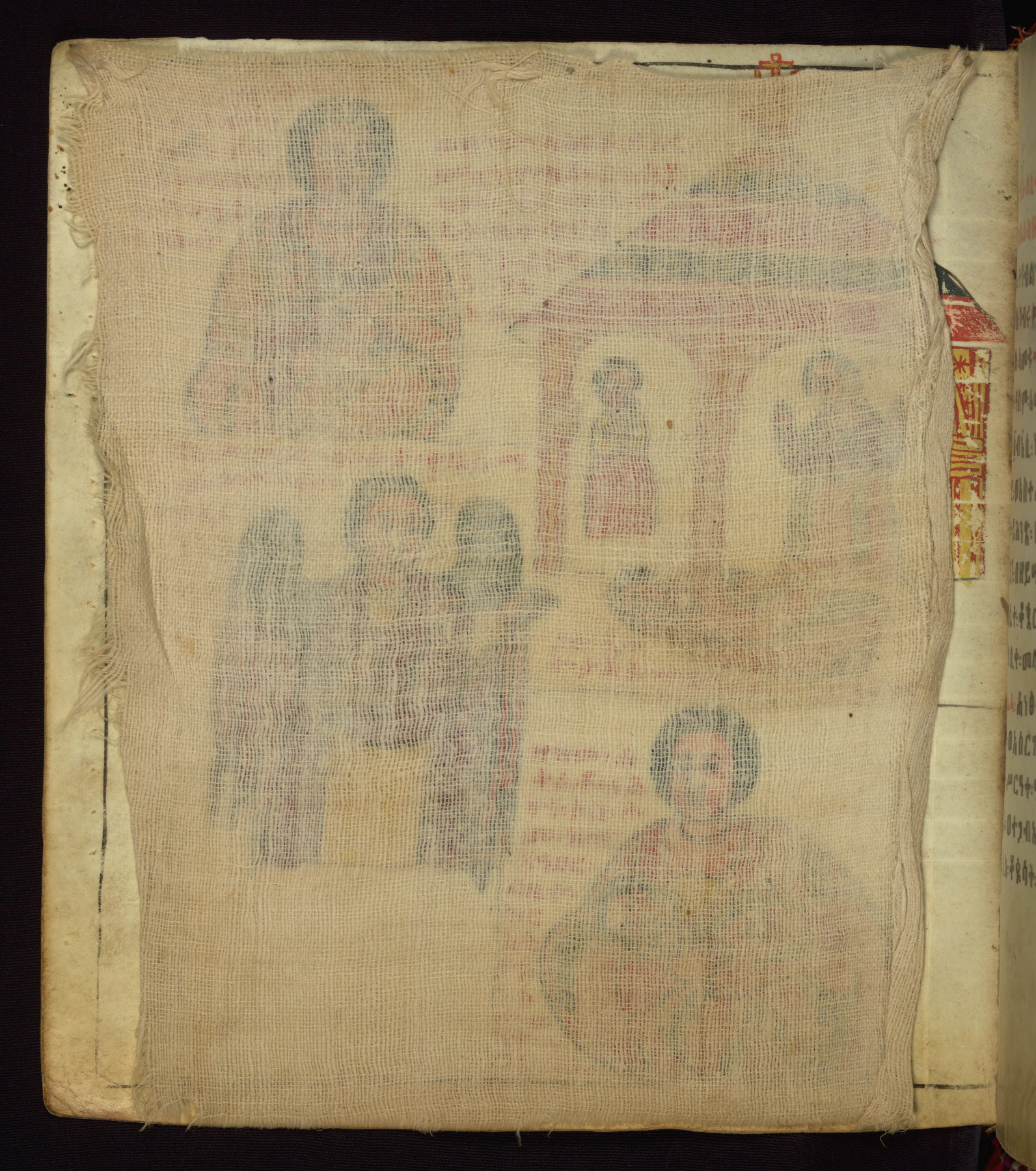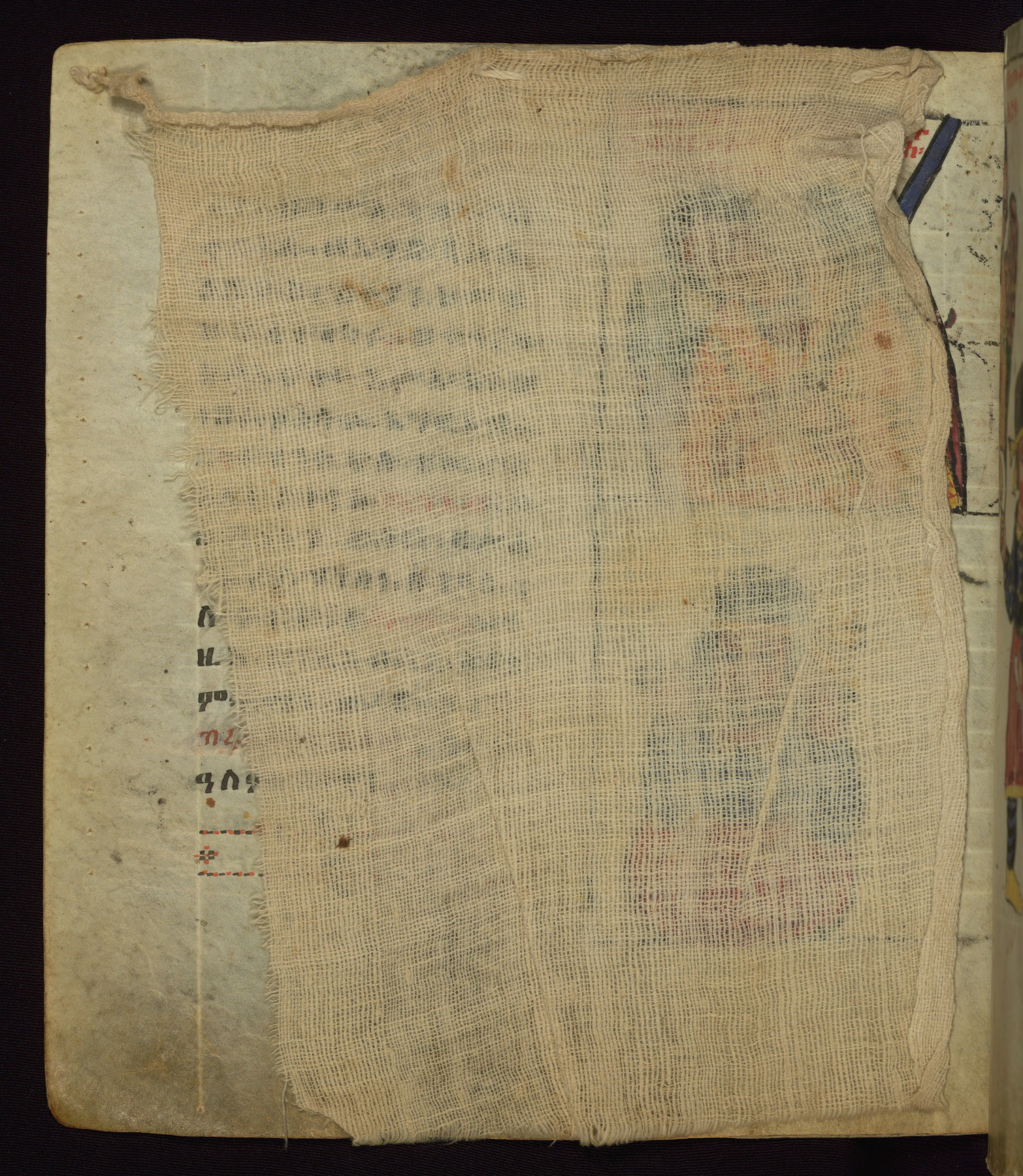 This Homiliary was created in Gondar, Ethiopia, during a period of artistic flowering in the late seventeenth century. The Imperial court and its accompanying aristocracy took up permanent residence in Gondar at this time, and the taste of these wealthy patrons for paintings and extensive image cycles is exemplified by this richly illuminated manuscript. The text, a Homiliary focused on the Miracles of the Archangel Michael, combines liturgical readings with forty-nine brightly colored renderings of God, St. Michael, and the miracles related in the text. Sections of the manuscript would have been read aloud on monthly feast days of the Archangel, and the images would have punctuated the readings. The artists were likely trained as painters, rather than solely as manuscript illuminators, and their art can therefore be linked stylistically to contemporary mural painting.