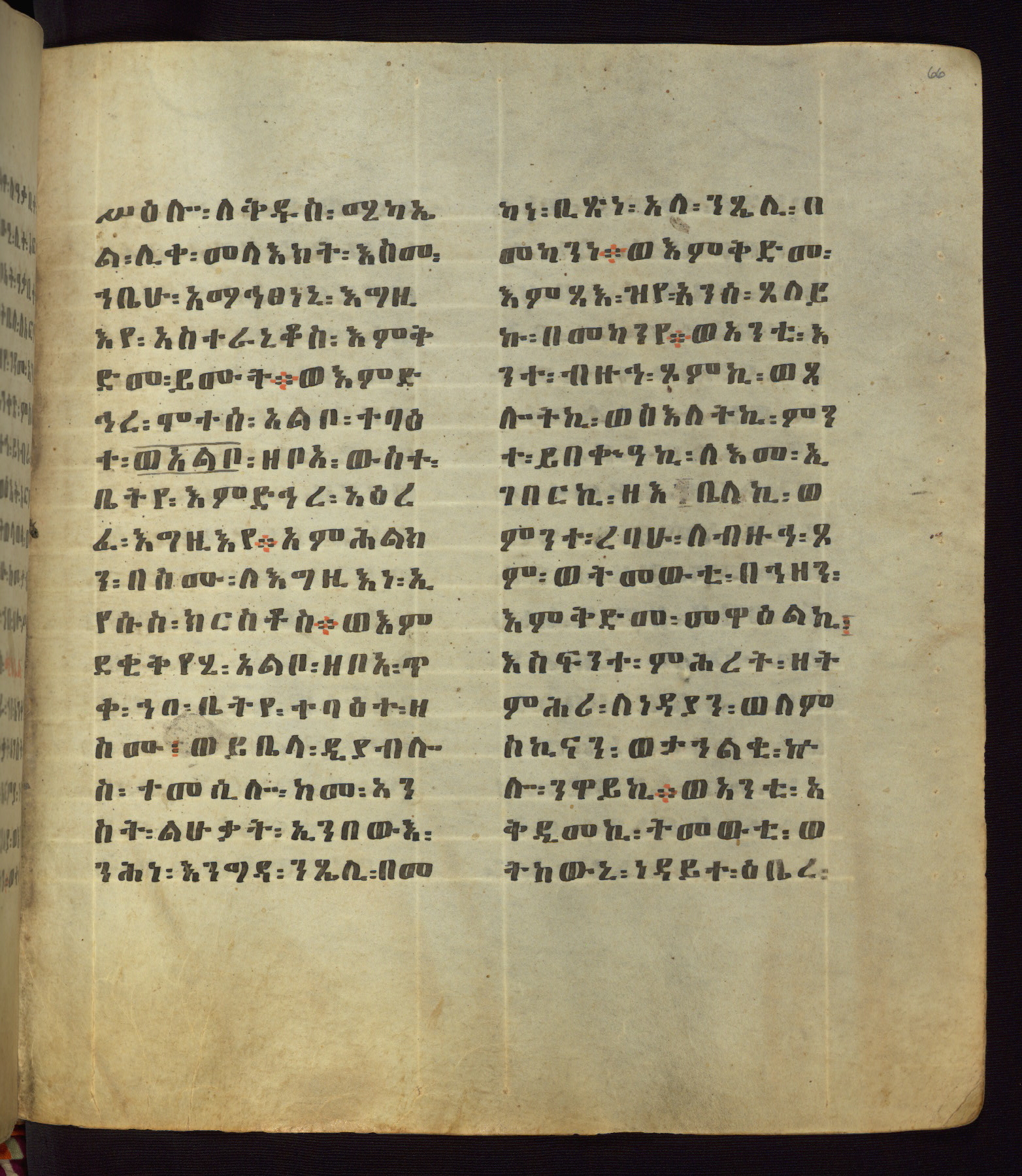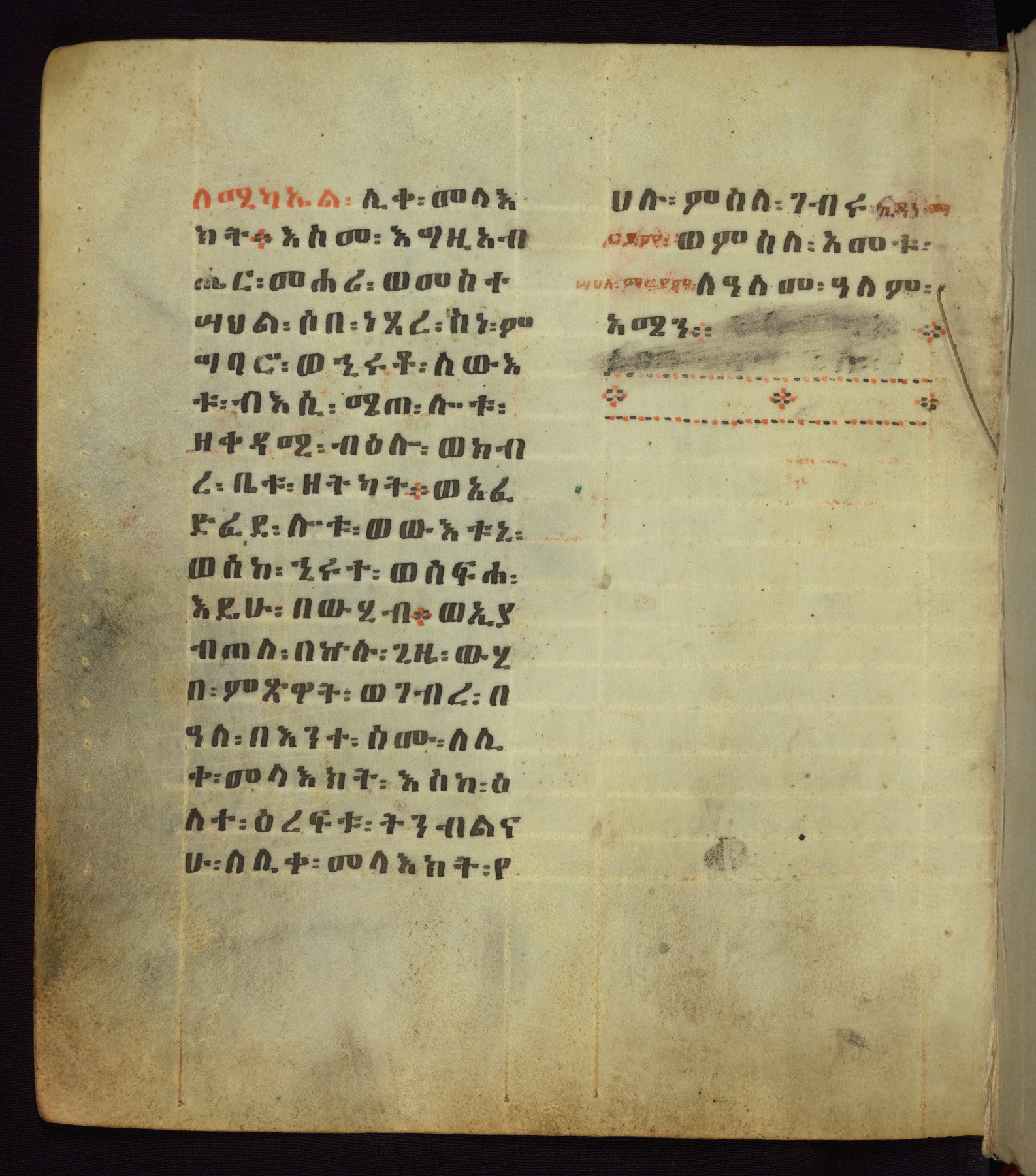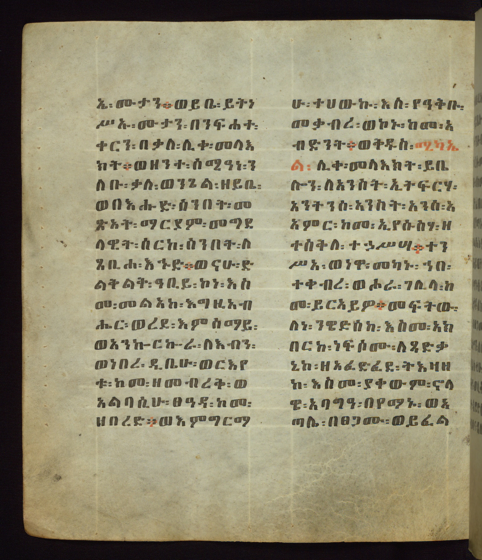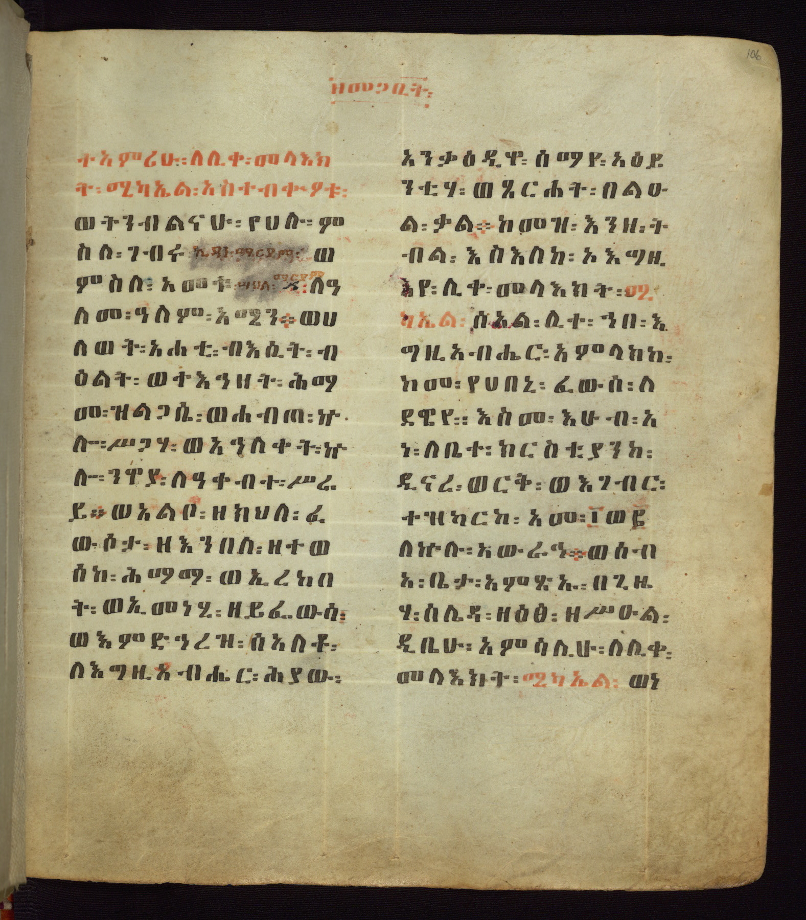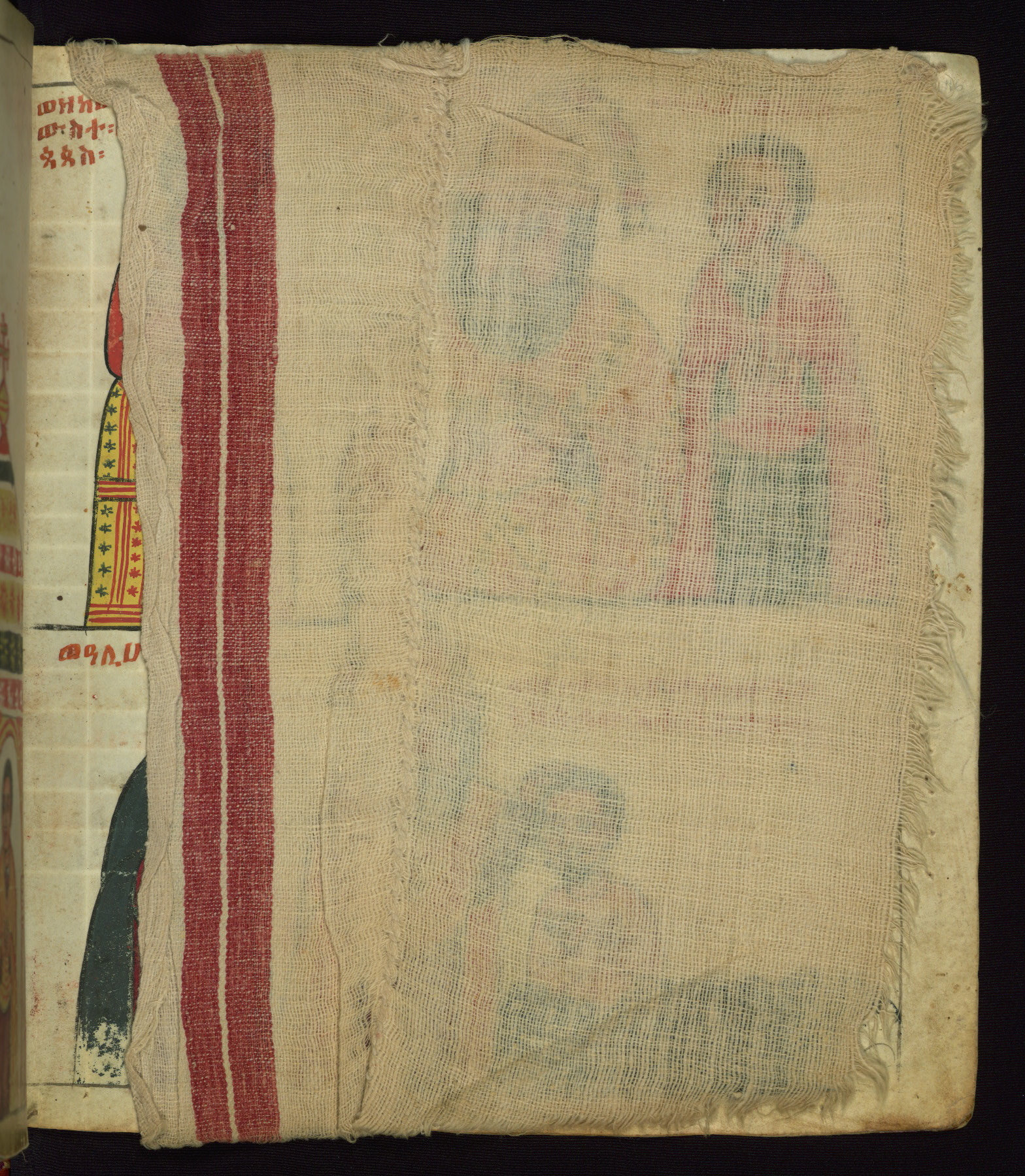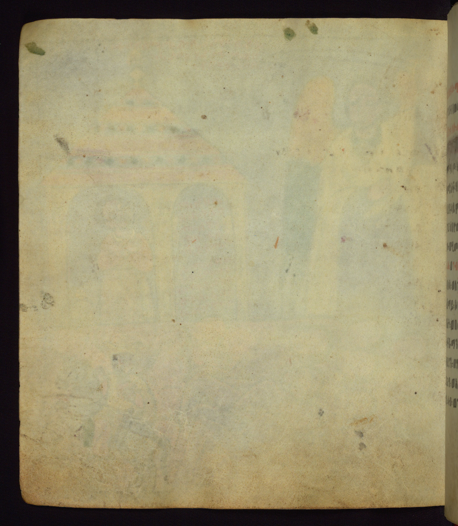 This Homiliary was created in Gondar, Ethiopia, during a period of artistic flowering in the late seventeenth century. The Imperial court and its accompanying aristocracy took up permanent residence in Gondar at this time, and the taste of these wealthy patrons for paintings and extensive image cycles is exemplified by this richly illuminated manuscript. The text, a Homiliary focused on the Miracles of the Archangel Michael, combines liturgical readings with forty-nine brightly colored renderings of God, St. Michael, and the miracles related in the text. Sections of the manuscript would have been read aloud on monthly feast days of the Archangel, and the images would have punctuated the readings. The artists were likely trained as painters, rather than solely as manuscript illuminators, and their art can therefore be linked stylistically to contemporary mural painting.