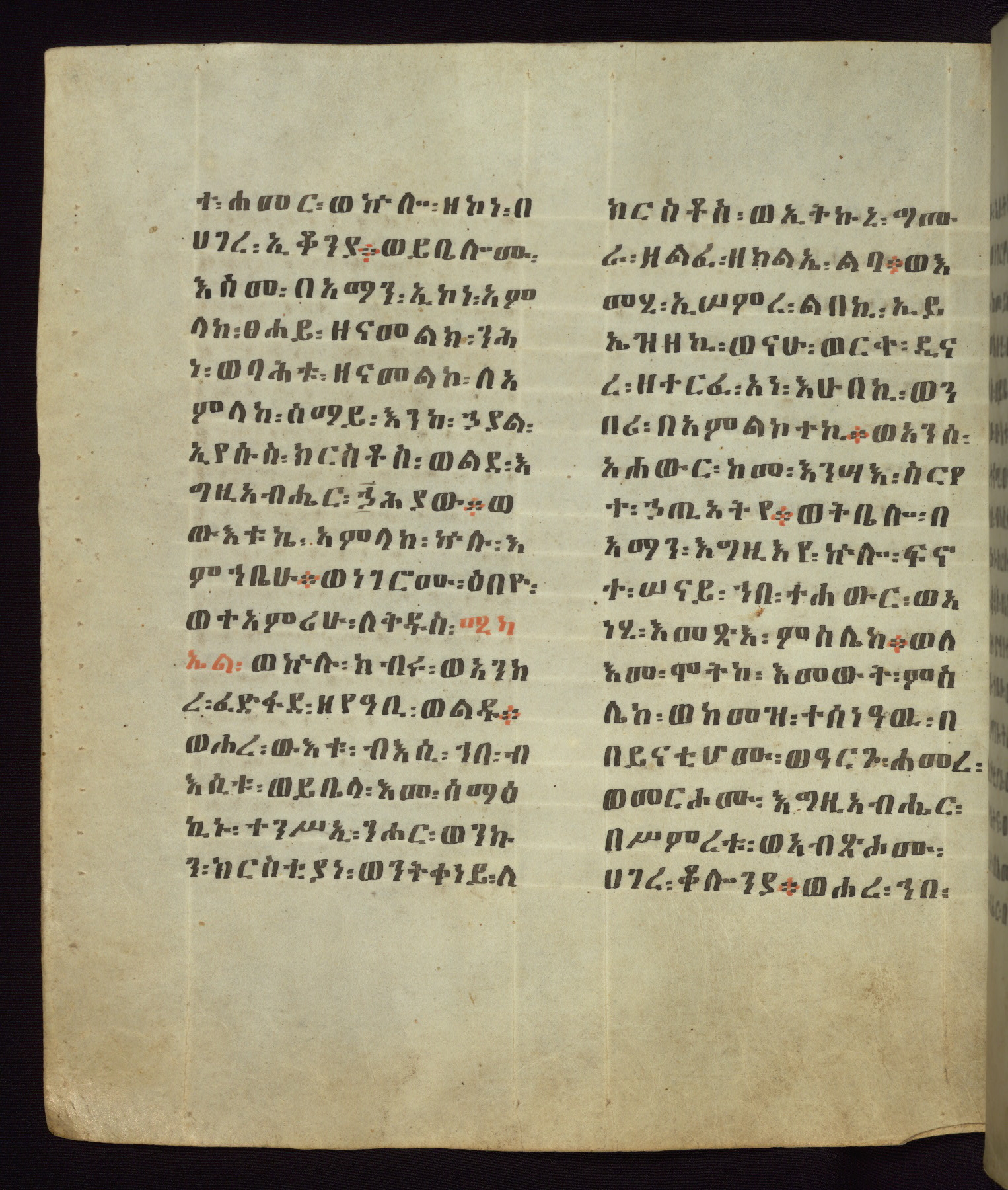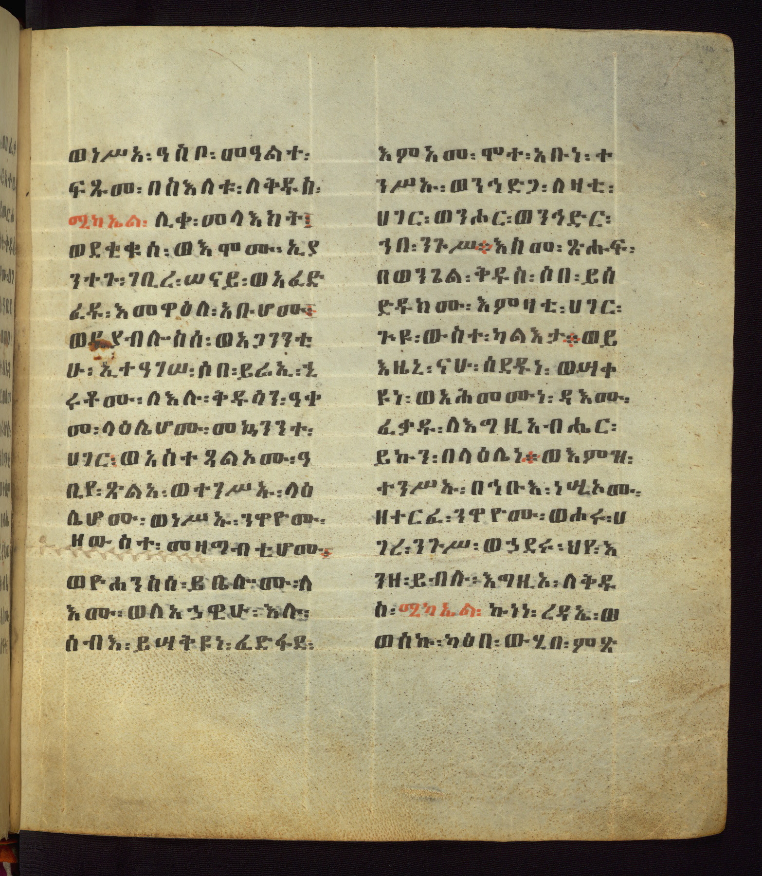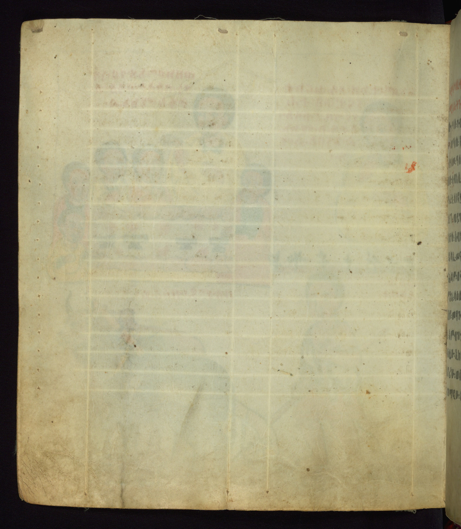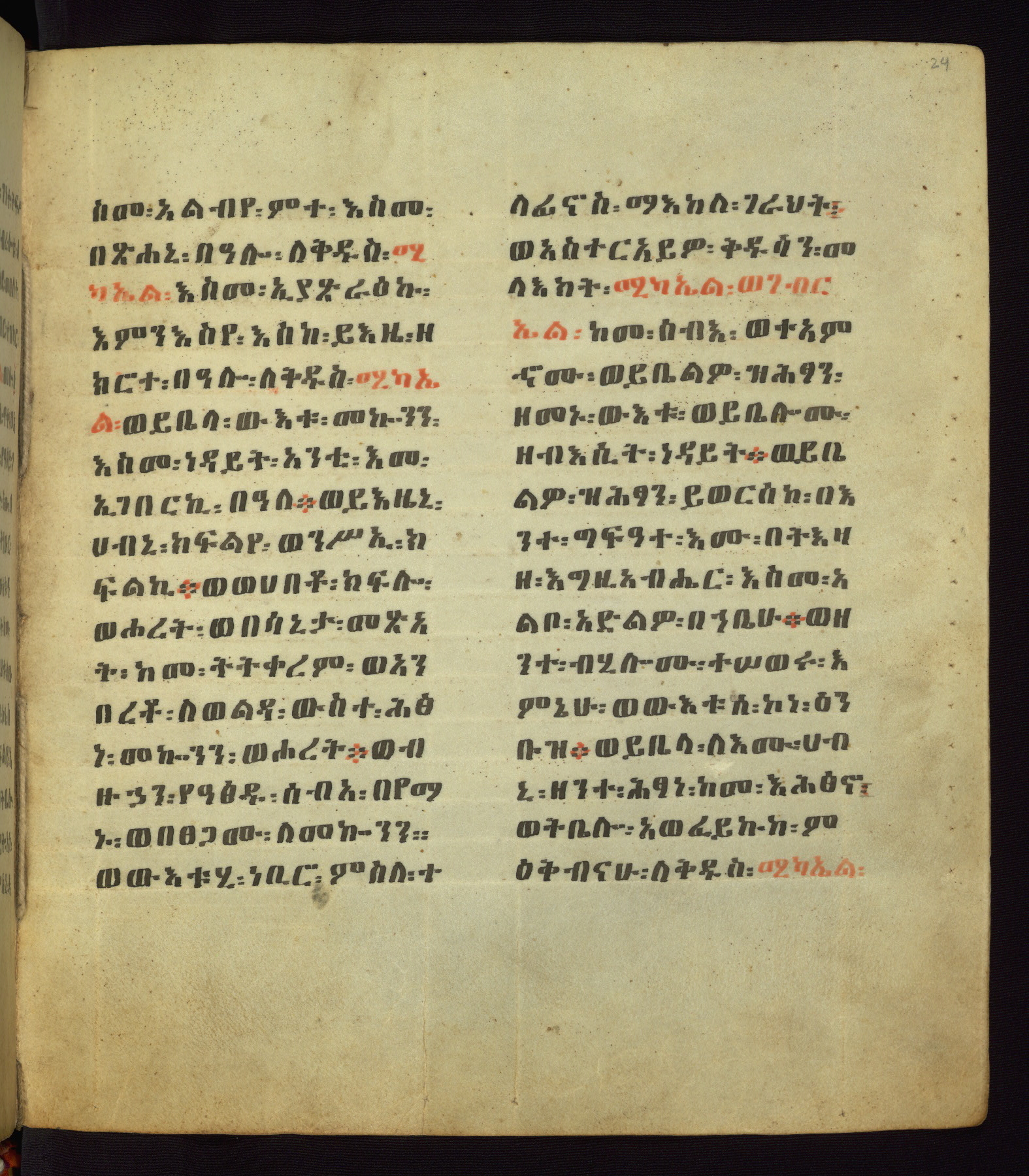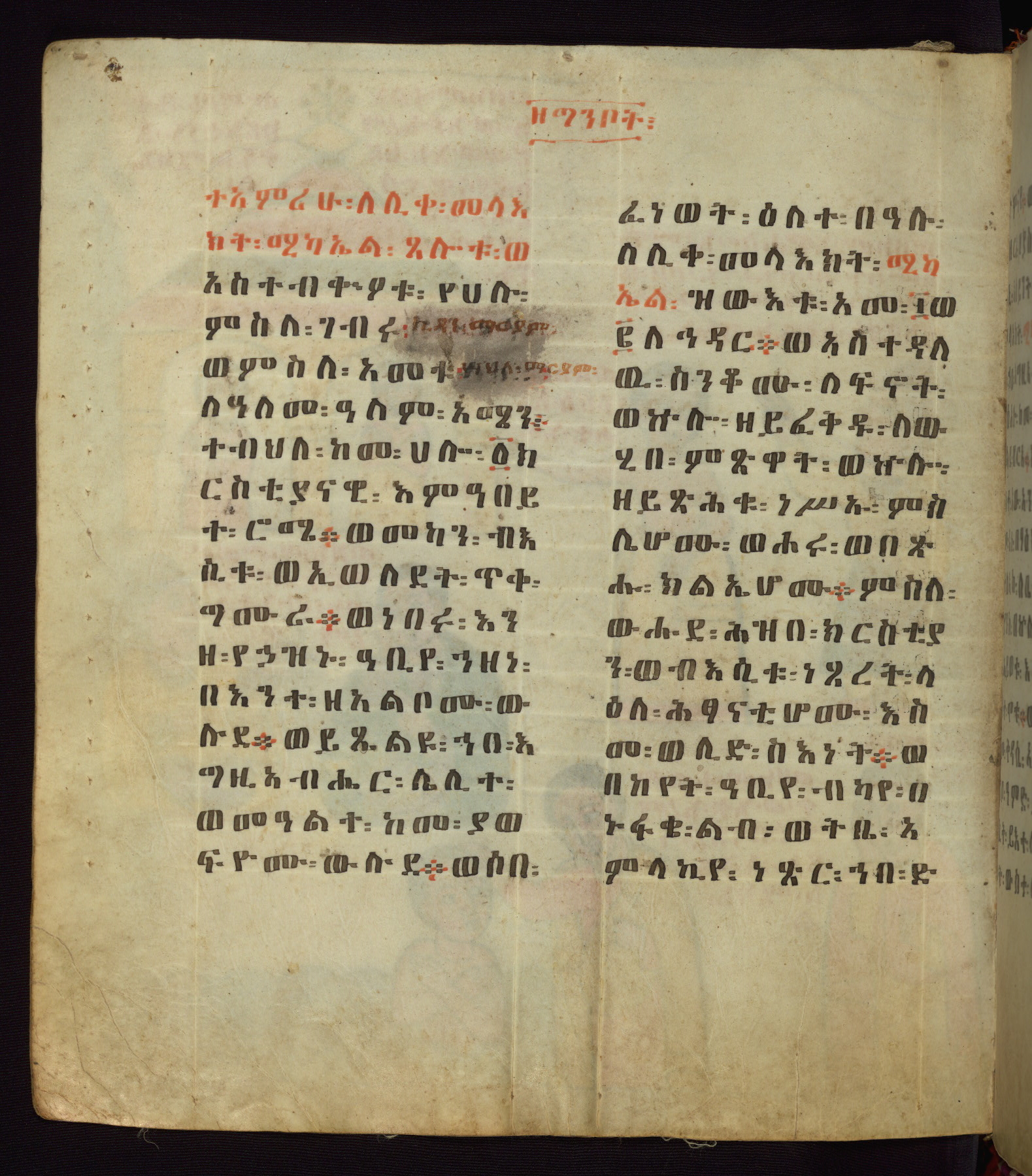 This Homiliary was created in Gondar, Ethiopia, during a period of artistic flowering in the late seventeenth century. The Imperial court and its accompanying aristocracy took up permanent residence in Gondar at this time, and the taste of these wealthy patrons for paintings and extensive image cycles is exemplified by this richly illuminated manuscript. The text, a Homiliary focused on the Miracles of the Archangel Michael, combines liturgical readings with forty-nine brightly colored renderings of God, St. Michael, and the miracles related in the text. Sections of the manuscript would have been read aloud on monthly feast days of the Archangel, and the images would have punctuated the readings. The artists were likely trained as painters, rather than solely as manuscript illuminators, and their art can therefore be linked stylistically to contemporary mural painting.