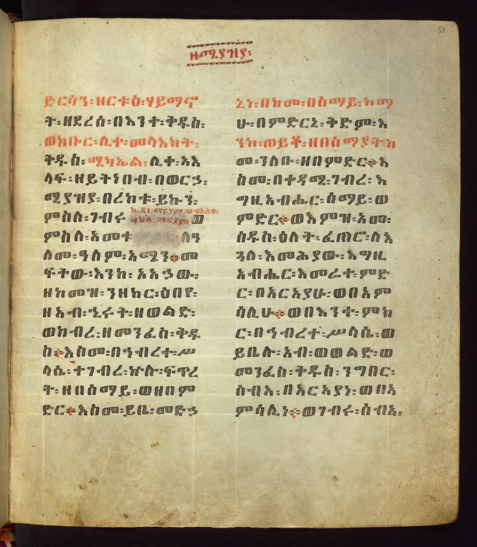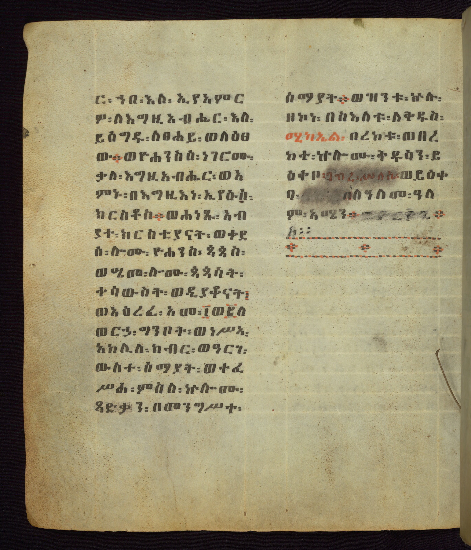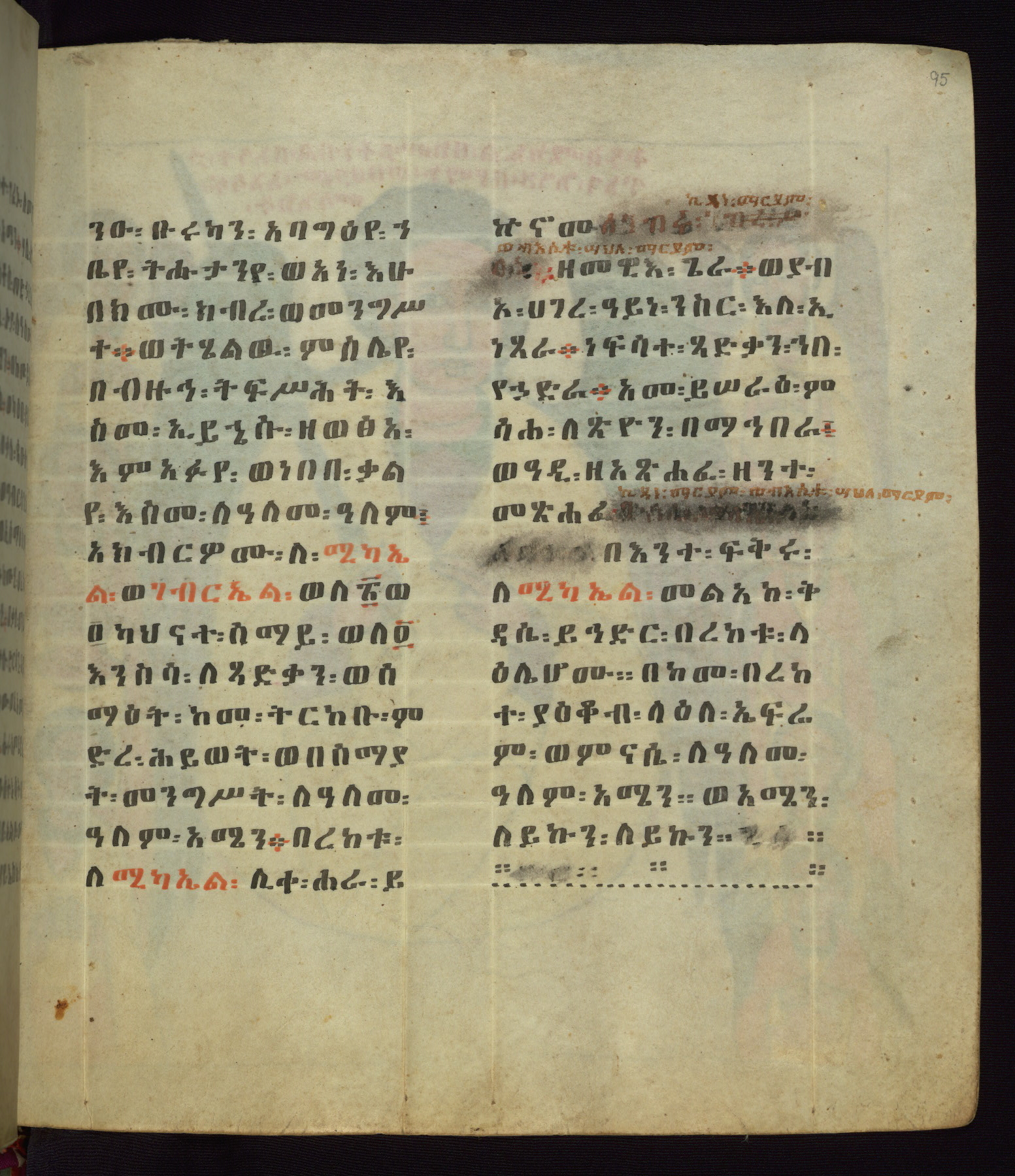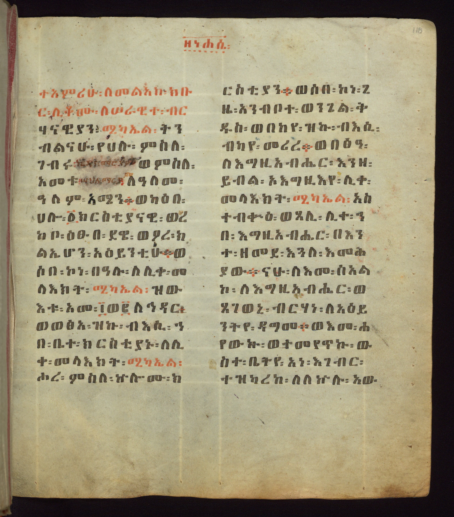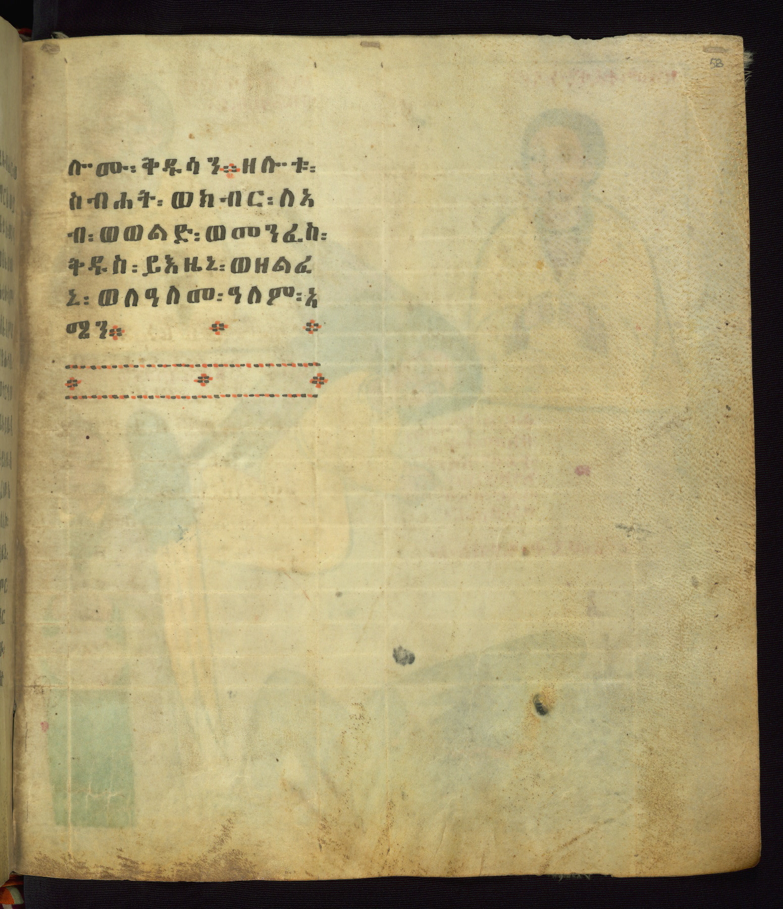 This Homiliary was created in Gondar, Ethiopia, during a period of artistic flowering in the late seventeenth century. The Imperial court and its accompanying aristocracy took up permanent residence in Gondar at this time, and the taste of these wealthy patrons for paintings and extensive image cycles is exemplified by this richly illuminated manuscript. The text, a Homiliary focused on the Miracles of the Archangel Michael, combines liturgical readings with forty-nine brightly colored renderings of God, St. Michael, and the miracles related in the text. Sections of the manuscript would have been read aloud on monthly feast days of the Archangel, and the images would have punctuated the readings. The artists were likely trained as painters, rather than solely as manuscript illuminators, and their art can therefore be linked stylistically to contemporary mural painting.
