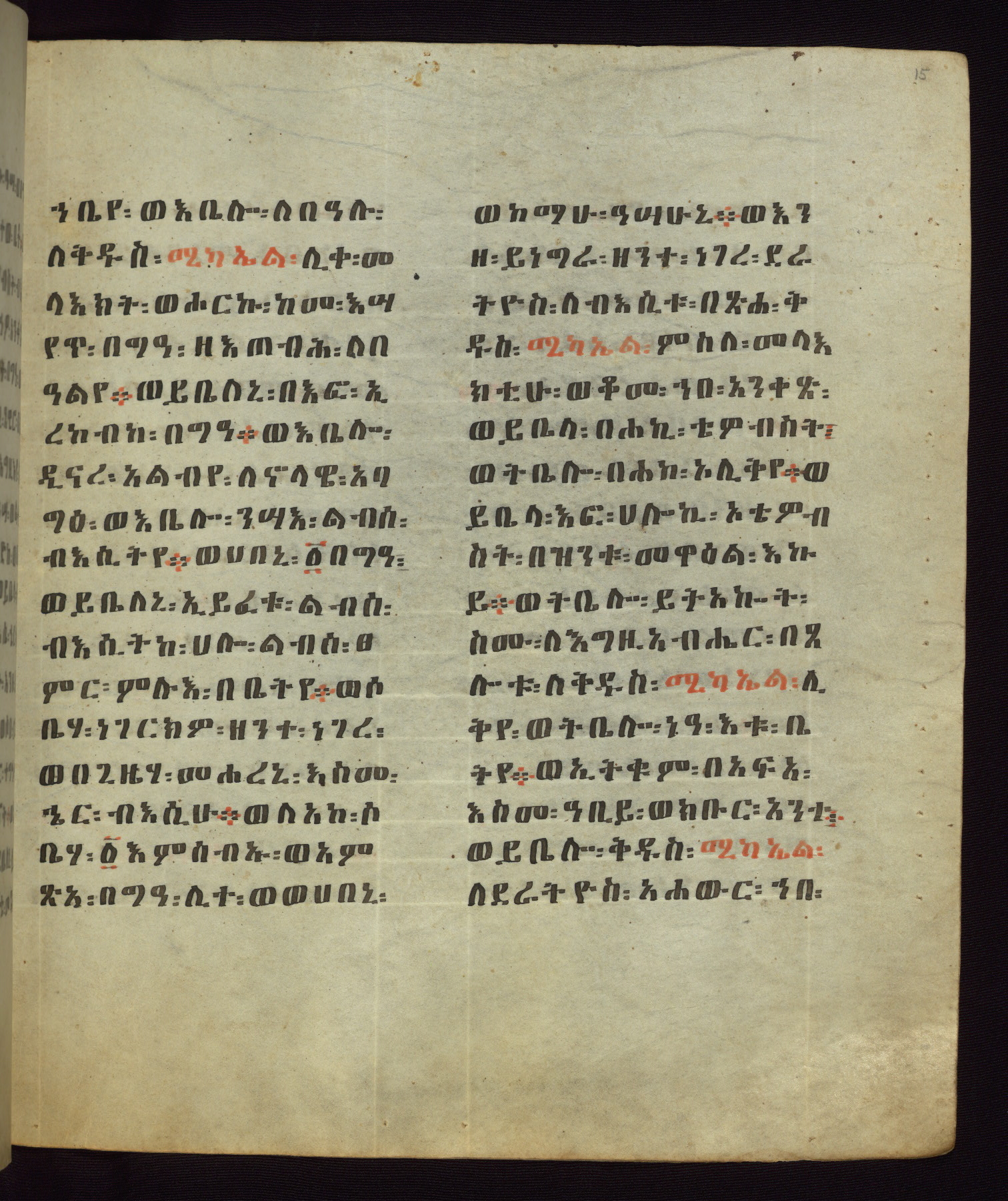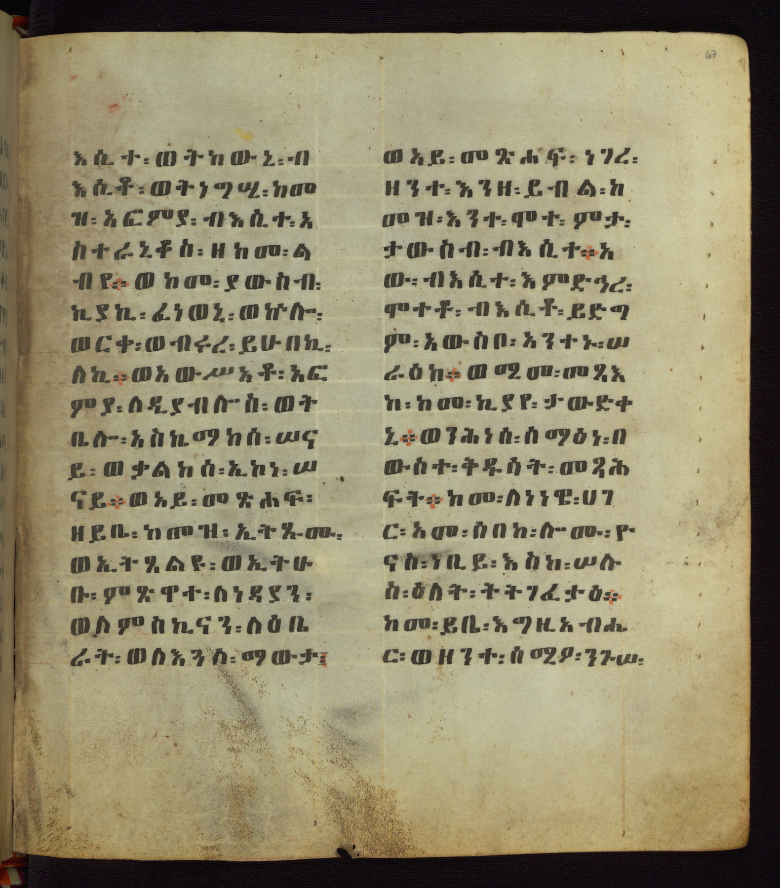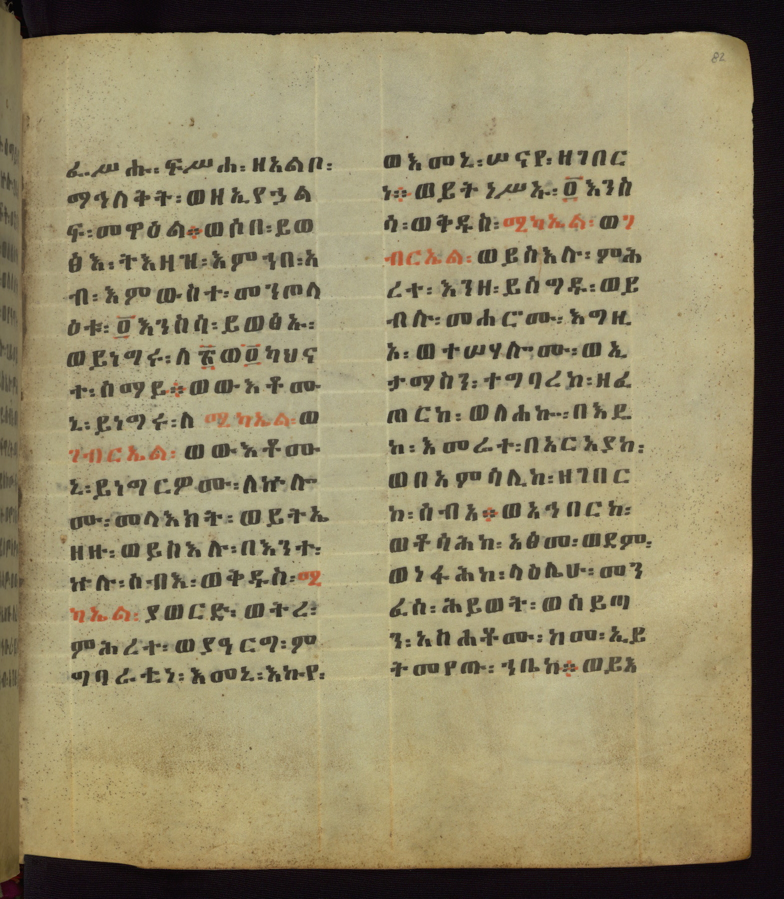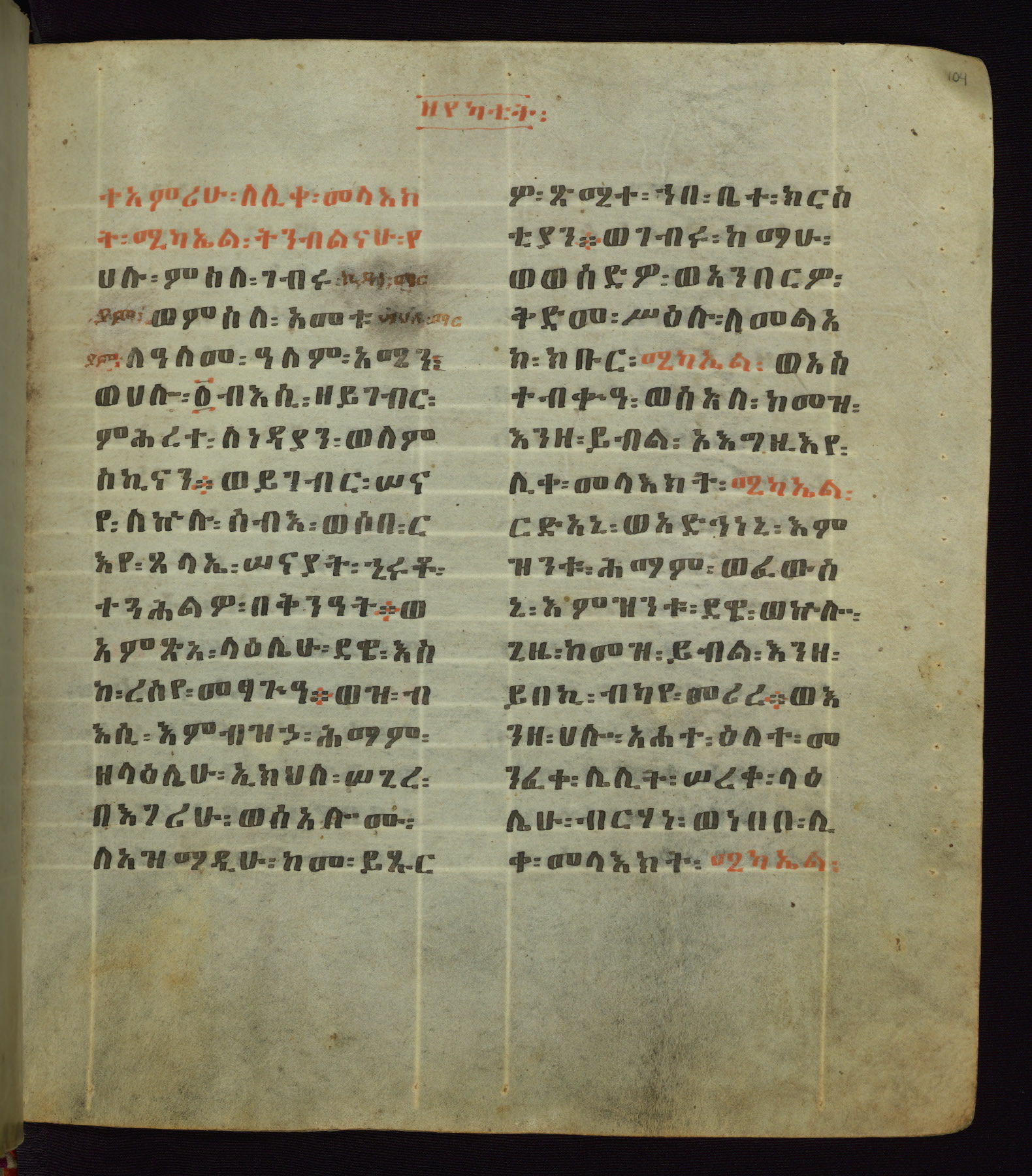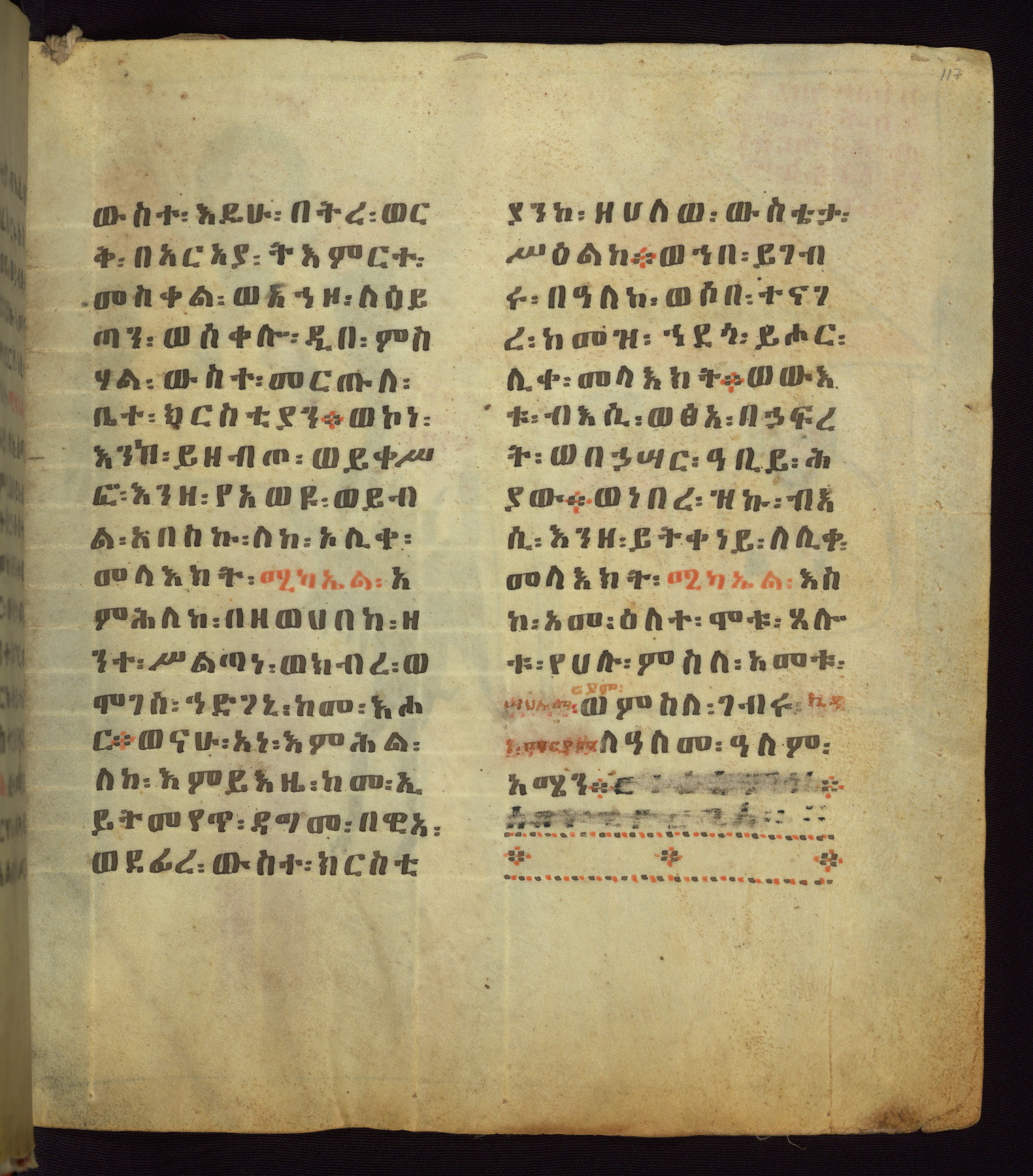 This Homiliary was created in Gondar, Ethiopia, during a period of artistic flowering in the late seventeenth century. The Imperial court and its accompanying aristocracy took up permanent residence in Gondar at this time, and the taste of these wealthy patrons for paintings and extensive image cycles is exemplified by this richly illuminated manuscript. The text, a Homiliary focused on the Miracles of the Archangel Michael, combines liturgical readings with forty-nine brightly colored renderings of God, St. Michael, and the miracles related in the text. Sections of the manuscript would have been read aloud on monthly feast days of the Archangel, and the images would have punctuated the readings. The artists were likely trained as painters, rather than solely as manuscript illuminators, and their art can therefore be linked stylistically to contemporary mural painting.