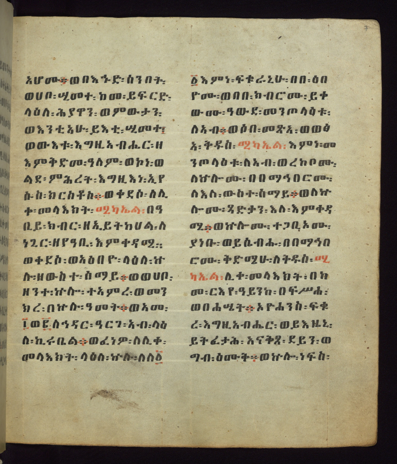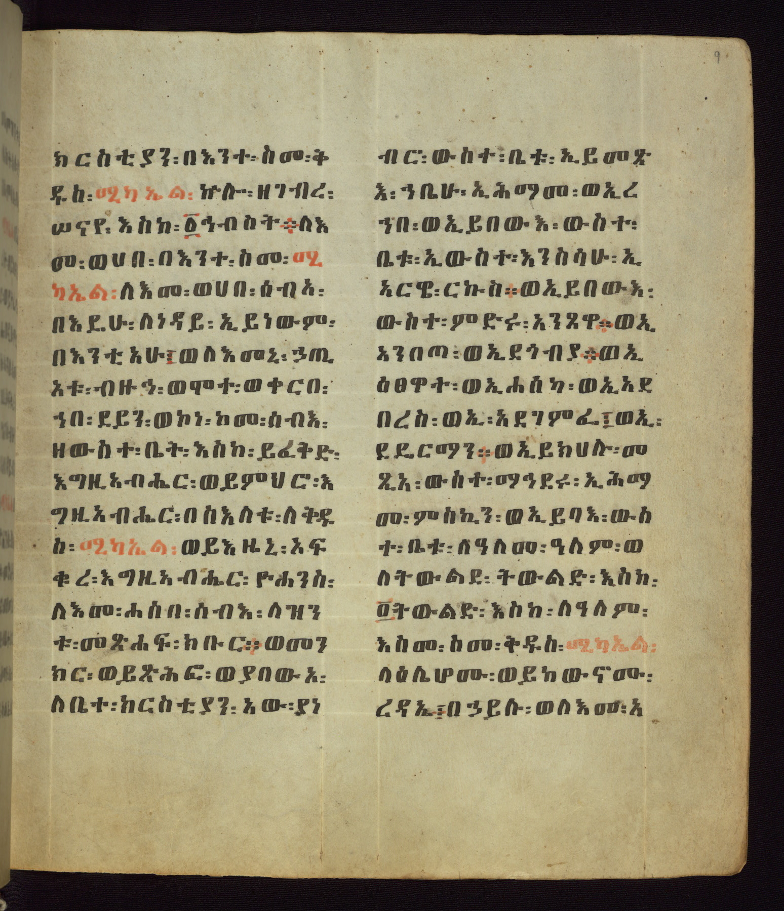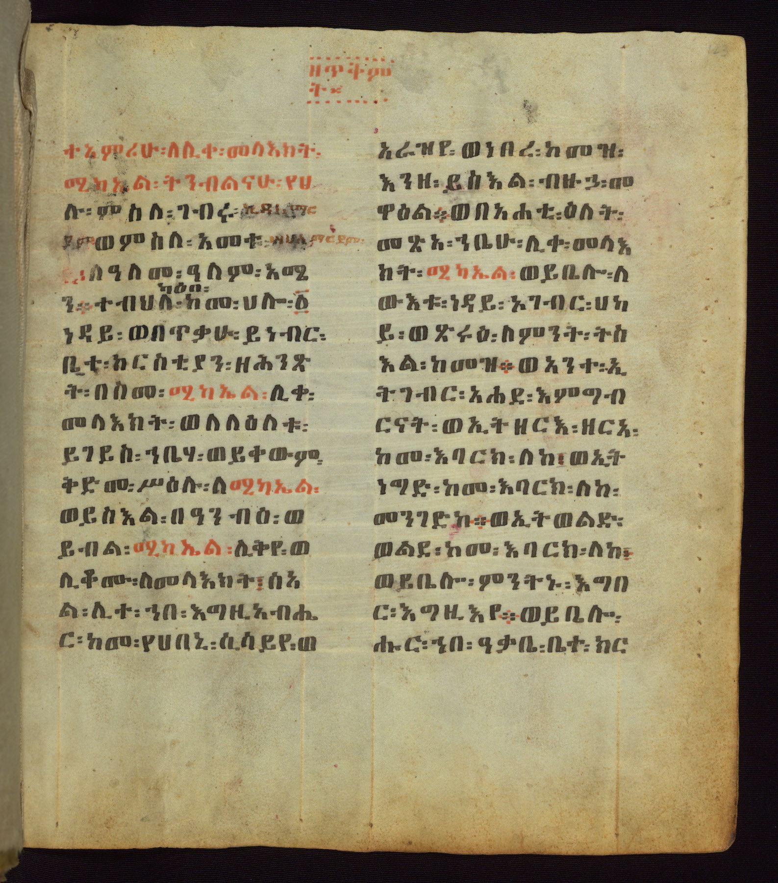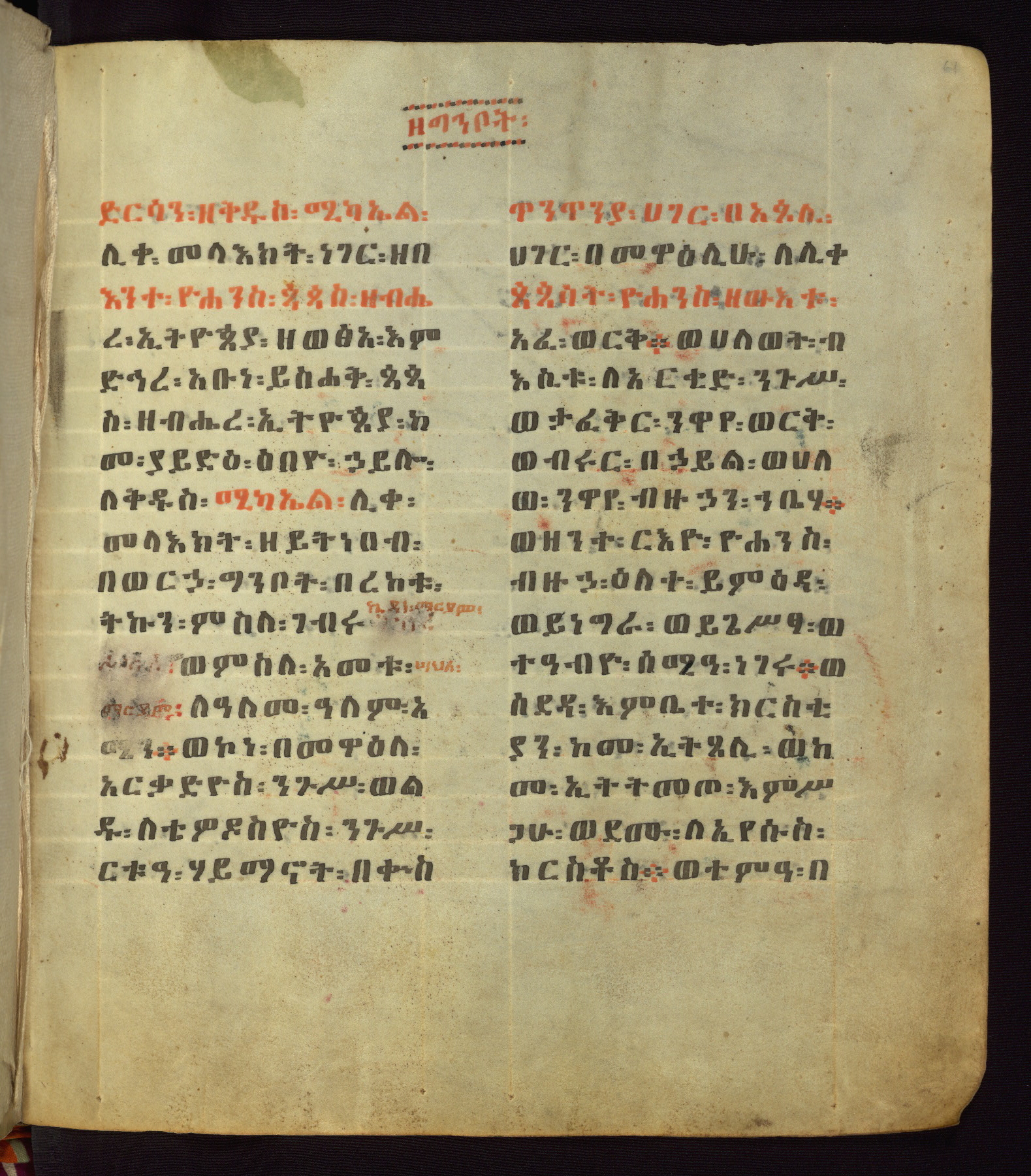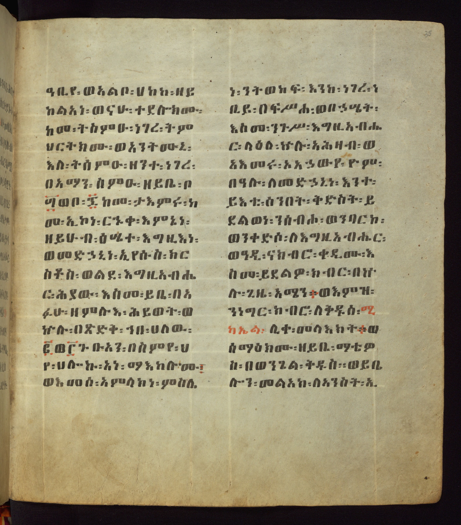 This Homiliary was created in Gondar, Ethiopia, during a period of artistic flowering in the late seventeenth century. The Imperial court and its accompanying aristocracy took up permanent residence in Gondar at this time, and the taste of these wealthy patrons for paintings and extensive image cycles is exemplified by this richly illuminated manuscript. The text, a Homiliary focused on the Miracles of the Archangel Michael, combines liturgical readings with forty-nine brightly colored renderings of God, St. Michael, and the miracles related in the text. Sections of the manuscript would have been read aloud on monthly feast days of the Archangel, and the images would have punctuated the readings. The artists were likely trained as painters, rather than solely as manuscript illuminators, and their art can therefore be linked stylistically to contemporary mural painting.
