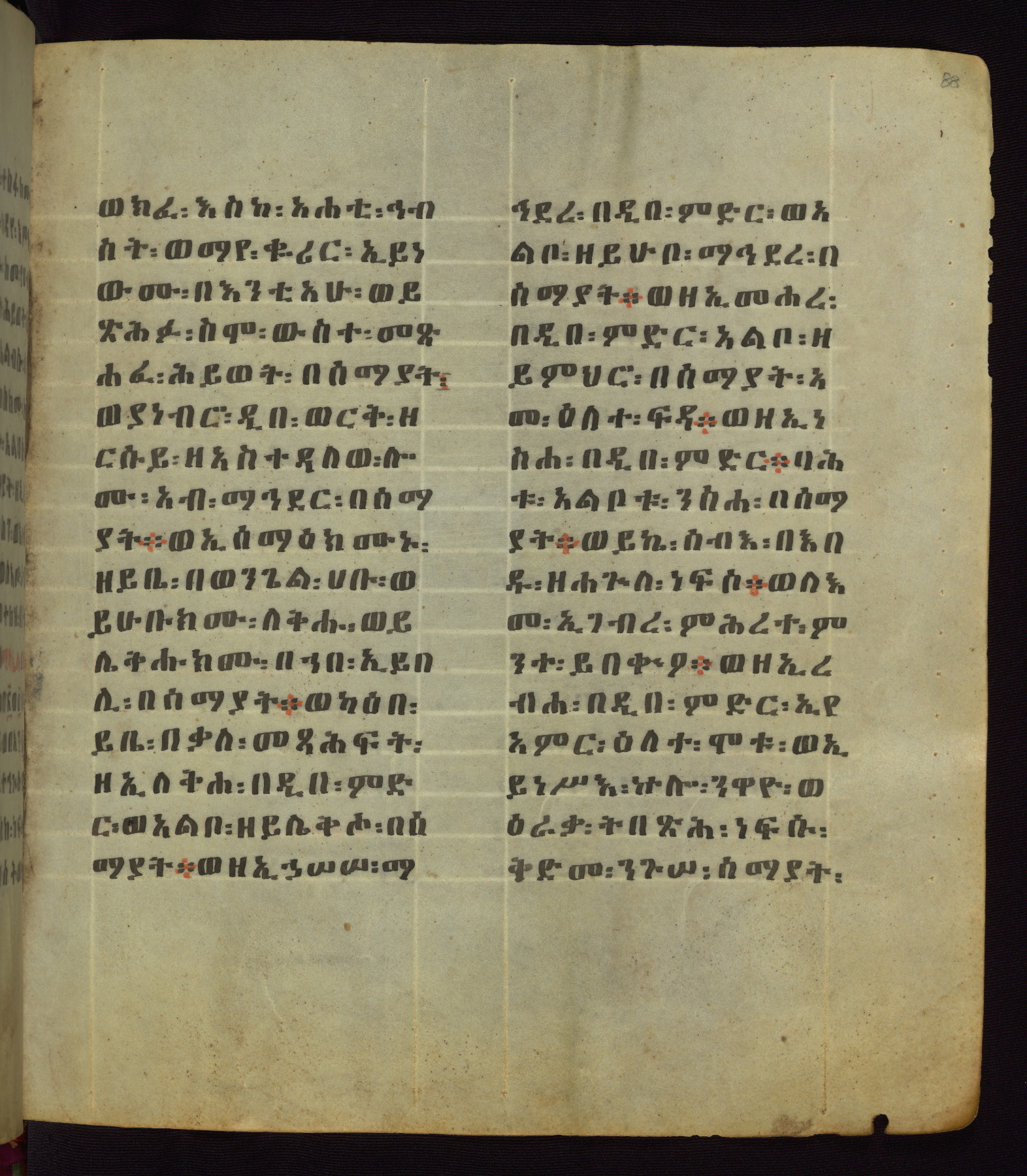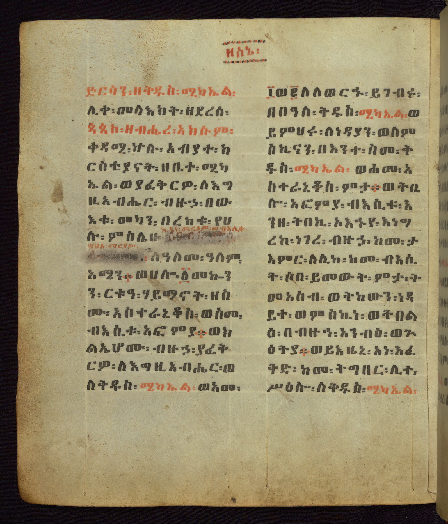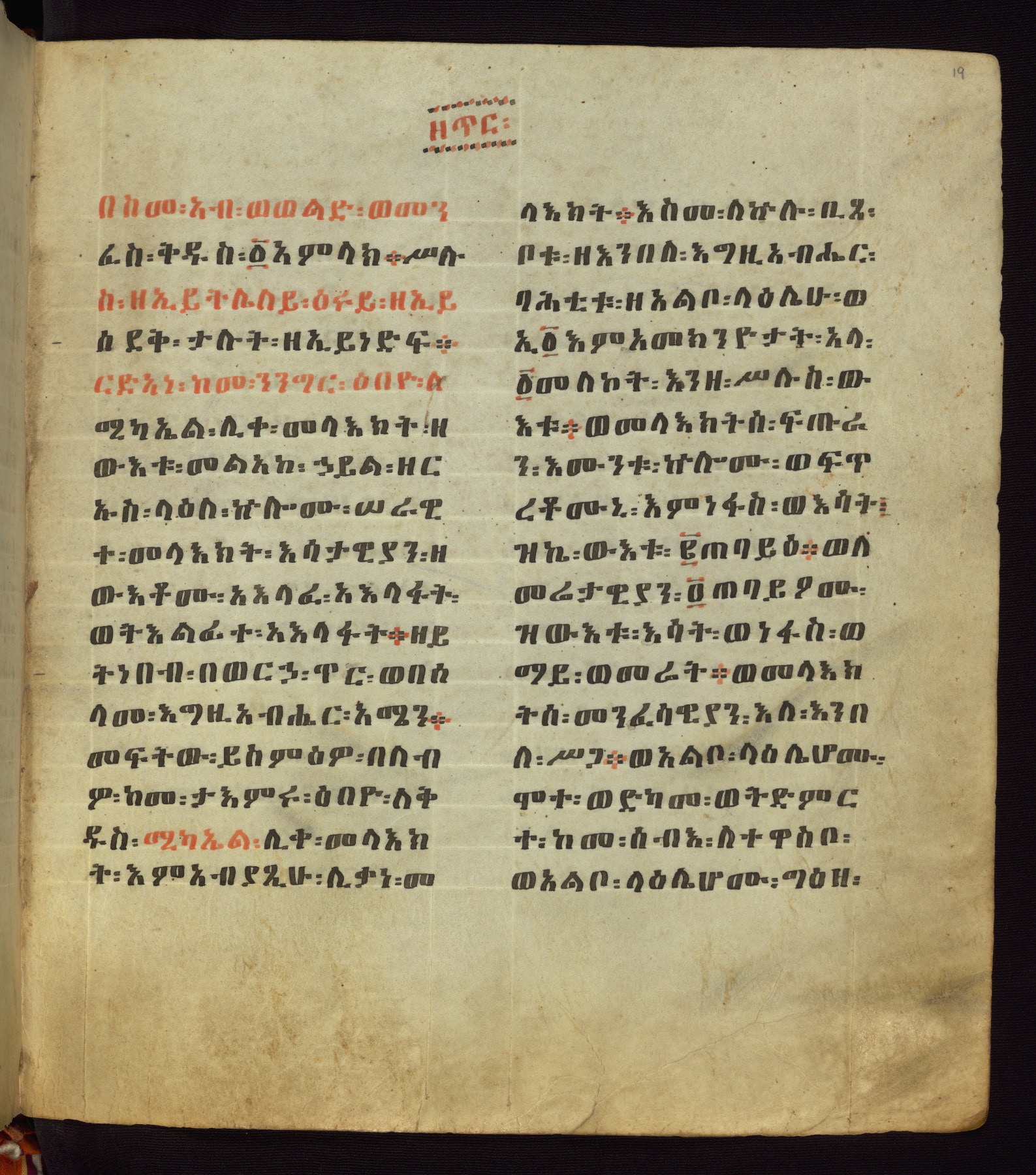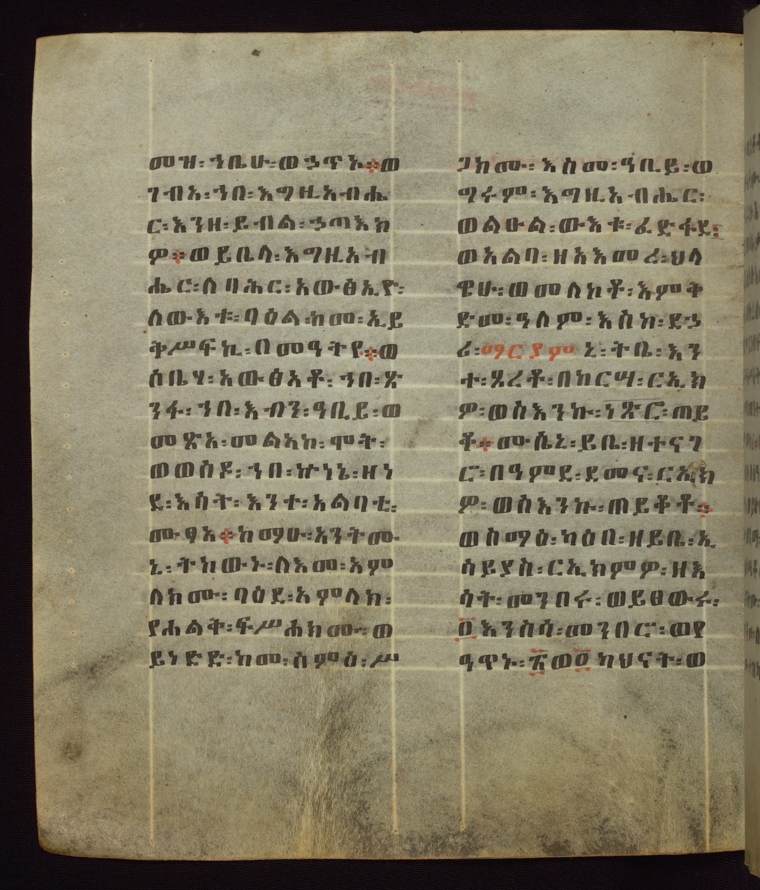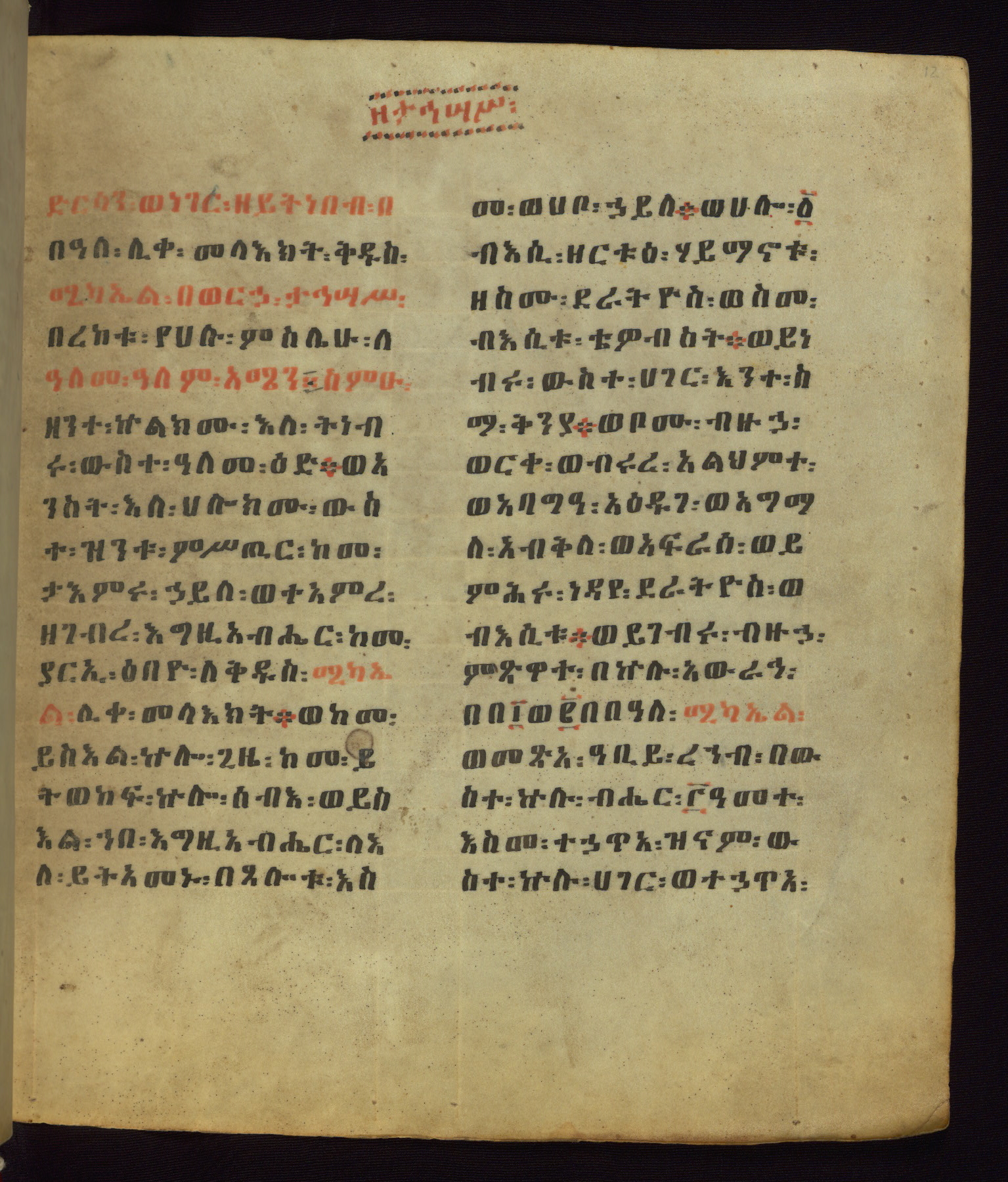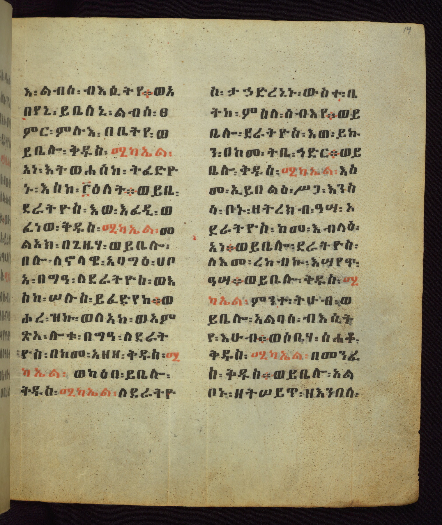 This Homiliary was created in Gondar, Ethiopia, during a period of artistic flowering in the late seventeenth century. The Imperial court and its accompanying aristocracy took up permanent residence in Gondar at this time, and the taste of these wealthy patrons for paintings and extensive image cycles is exemplified by this richly illuminated manuscript. The text, a Homiliary focused on the Miracles of the Archangel Michael, combines liturgical readings with forty-nine brightly colored renderings of God, St. Michael, and the miracles related in the text. Sections of the manuscript would have been read aloud on monthly feast days of the Archangel, and the images would have punctuated the readings. The artists were likely trained as painters, rather than solely as manuscript illuminators, and their art can therefore be linked stylistically to contemporary mural painting.