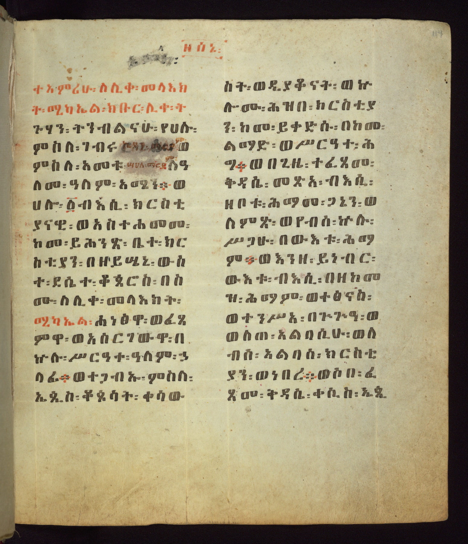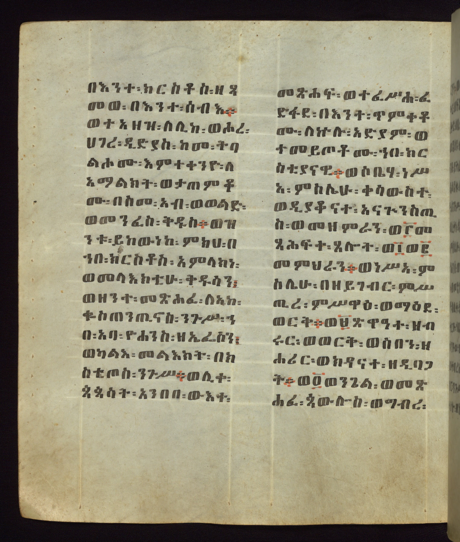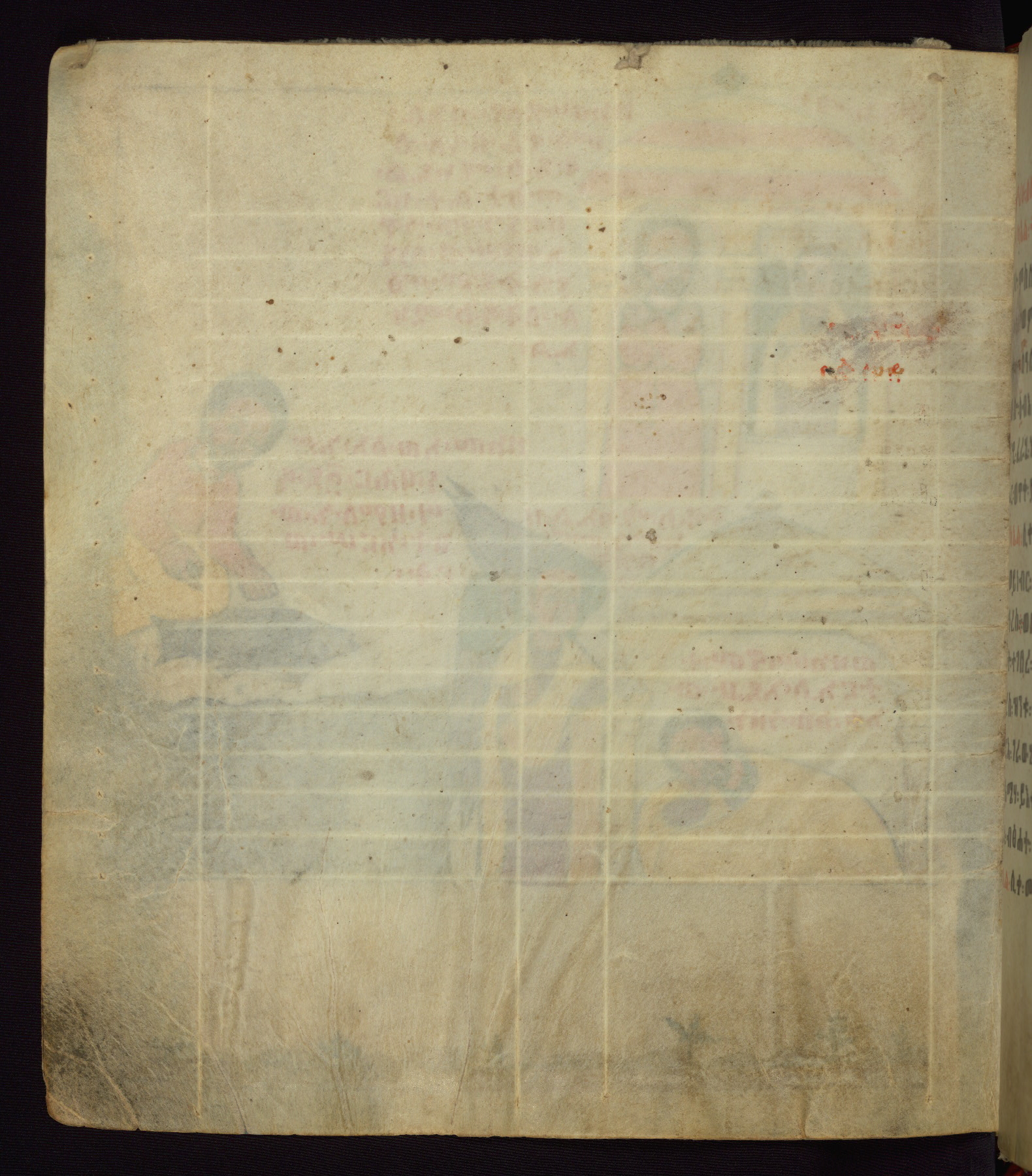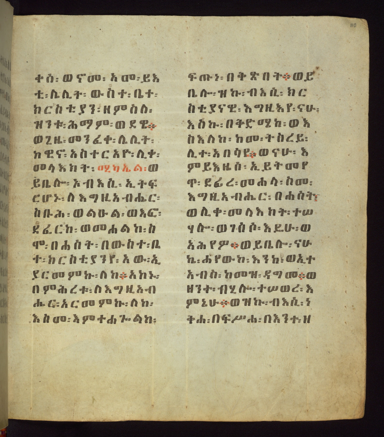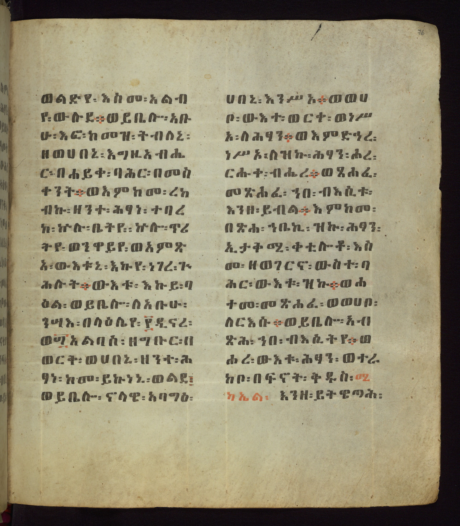 This Homiliary was created in Gondar, Ethiopia, during a period of artistic flowering in the late seventeenth century. The Imperial court and its accompanying aristocracy took up permanent residence in Gondar at this time, and the taste of these wealthy patrons for paintings and extensive image cycles is exemplified by this richly illuminated manuscript. The text, a Homiliary focused on the Miracles of the Archangel Michael, combines liturgical readings with forty-nine brightly colored renderings of God, St. Michael, and the miracles related in the text. Sections of the manuscript would have been read aloud on monthly feast days of the Archangel, and the images would have punctuated the readings. The artists were likely trained as painters, rather than solely as manuscript illuminators, and their art can therefore be linked stylistically to contemporary mural painting.