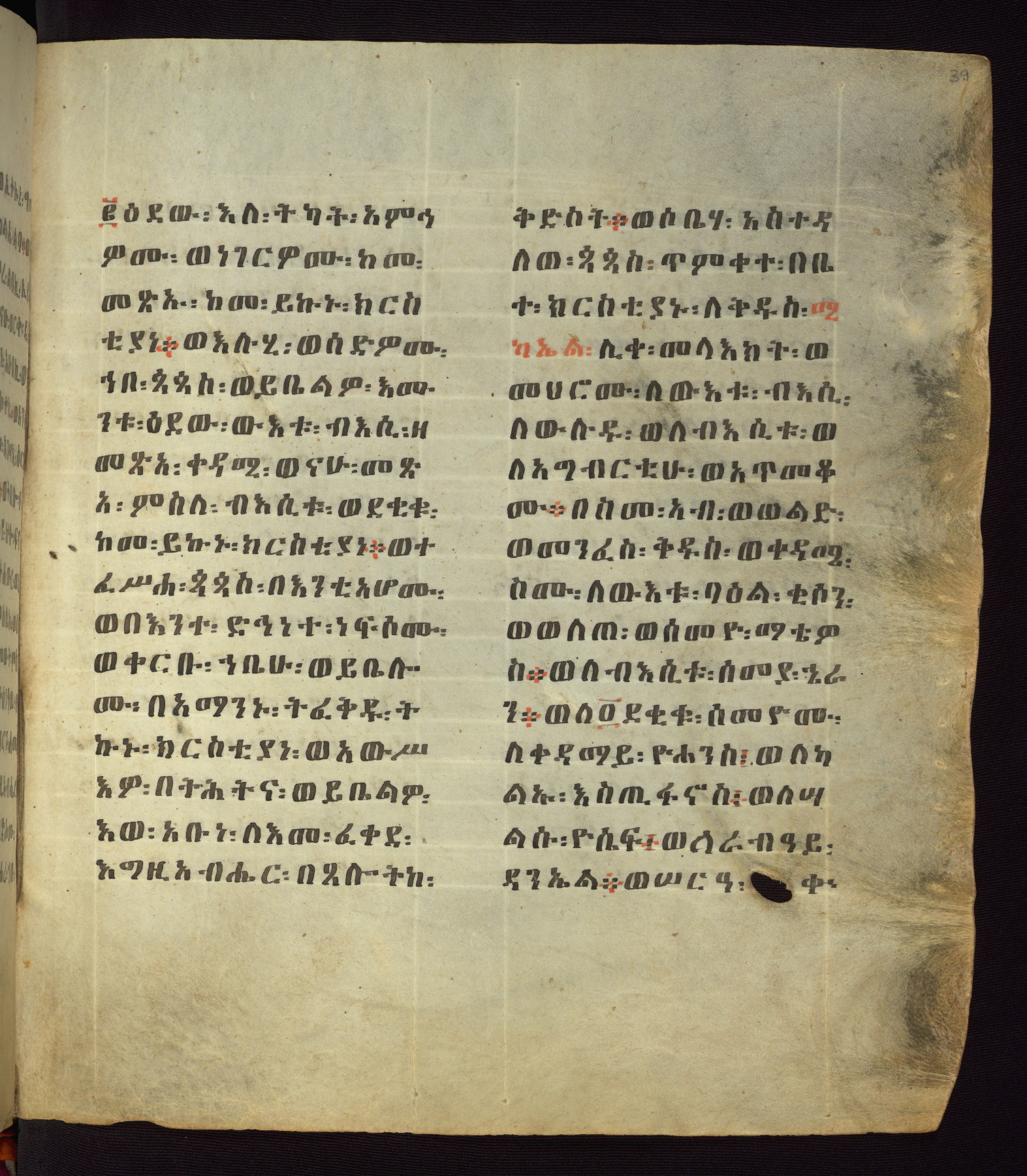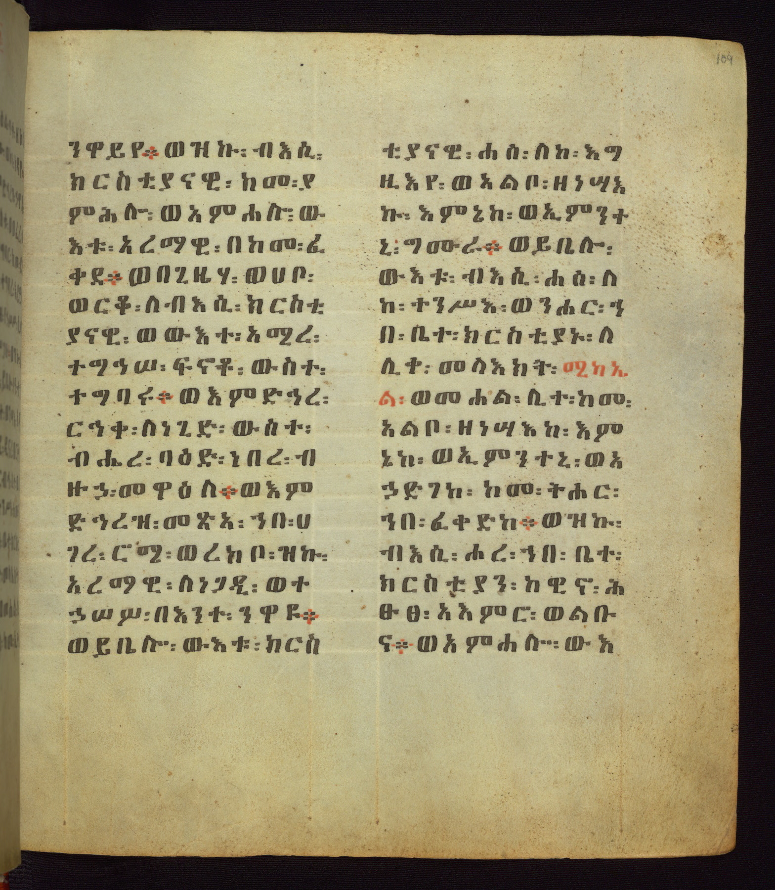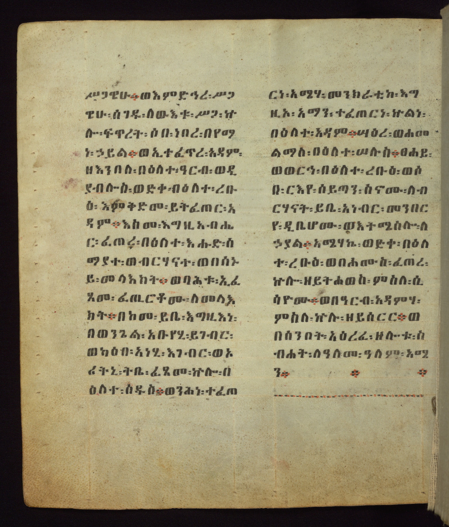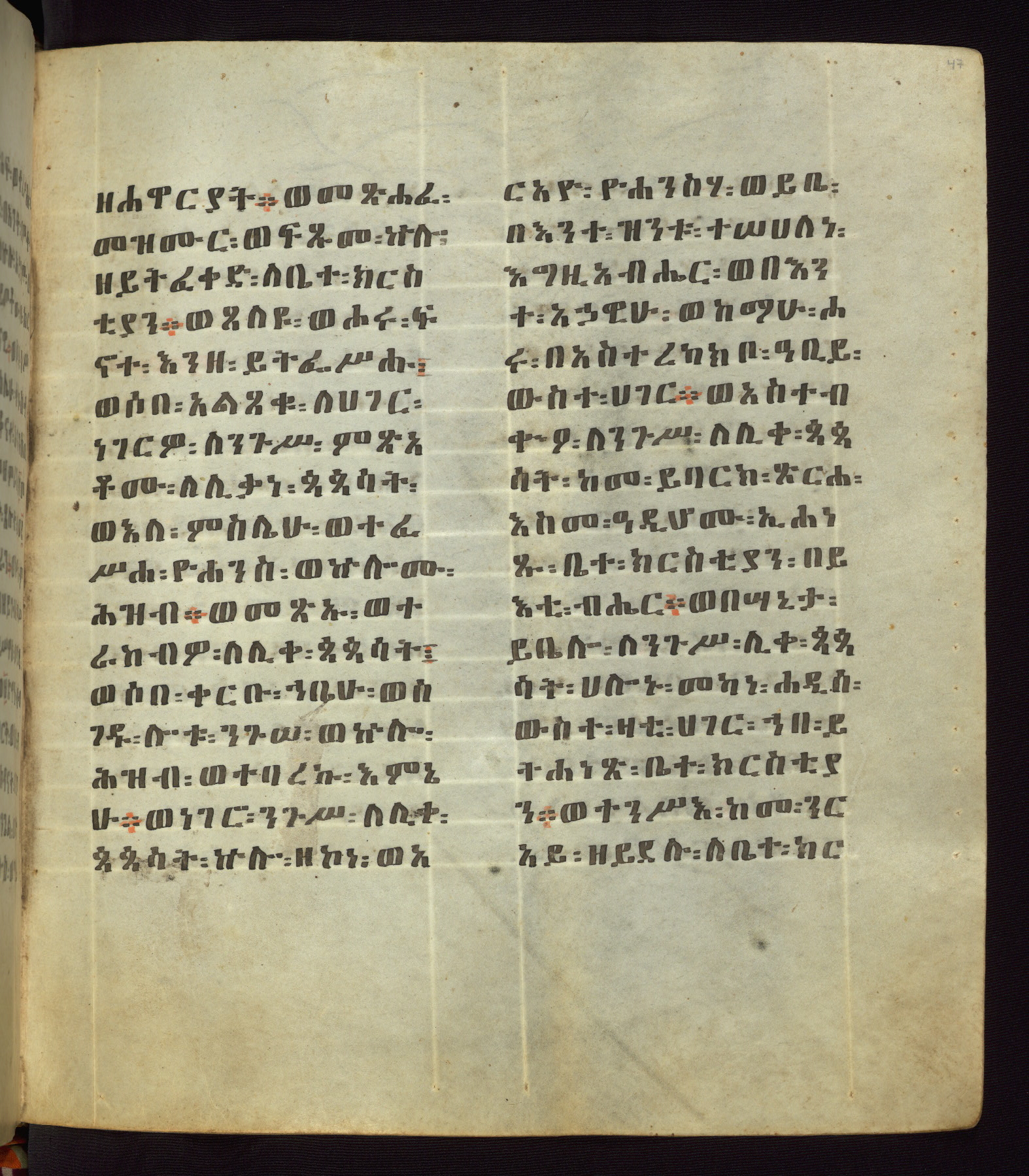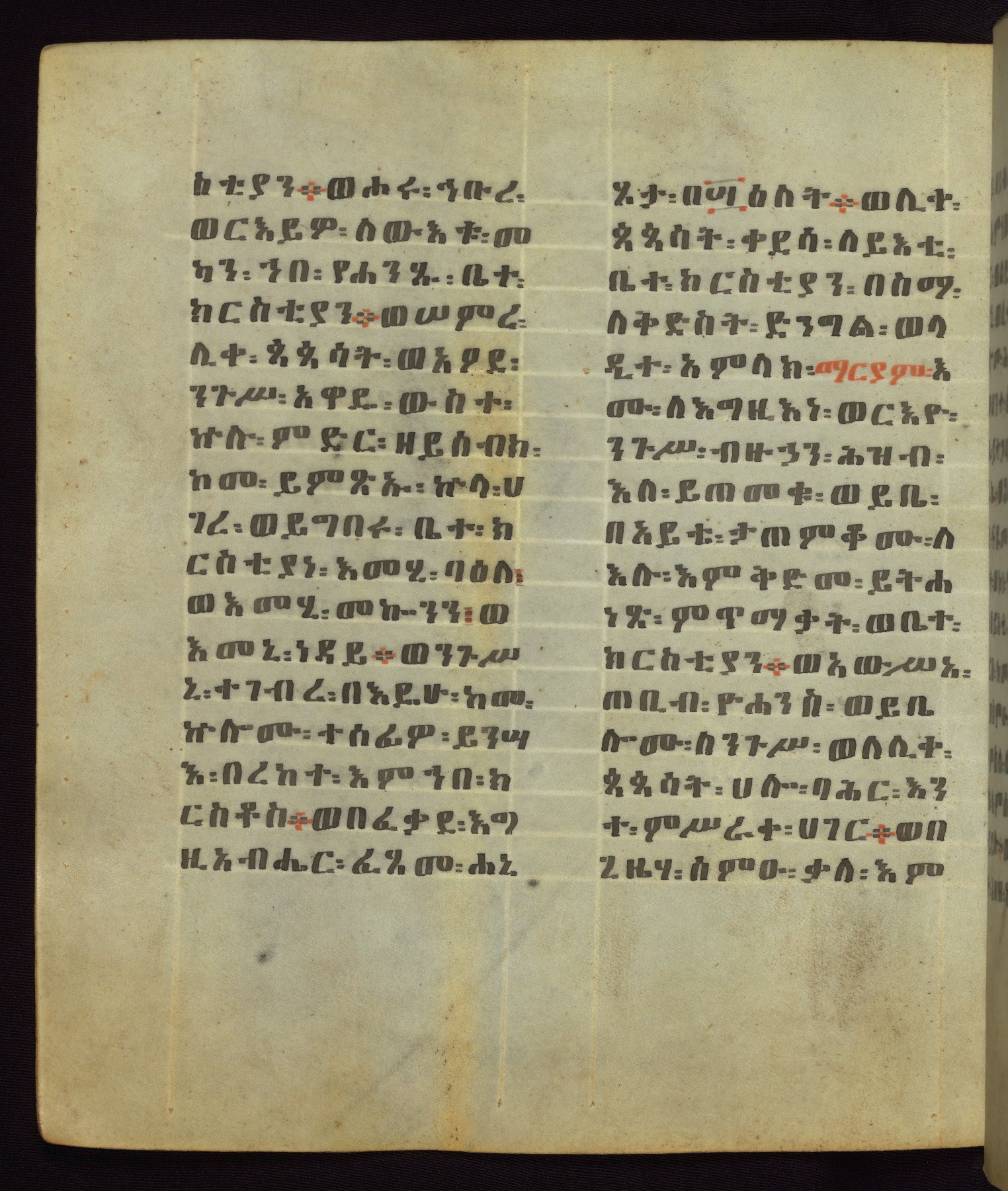 This Homiliary was created in Gondar, Ethiopia, during a period of artistic flowering in the late seventeenth century. The Imperial court and its accompanying aristocracy took up permanent residence in Gondar at this time, and the taste of these wealthy patrons for paintings and extensive image cycles is exemplified by this richly illuminated manuscript. The text, a Homiliary focused on the Miracles of the Archangel Michael, combines liturgical readings with forty-nine brightly colored renderings of God, St. Michael, and the miracles related in the text. Sections of the manuscript would have been read aloud on monthly feast days of the Archangel, and the images would have punctuated the readings. The artists were likely trained as painters, rather than solely as manuscript illuminators, and their art can therefore be linked stylistically to contemporary mural painting.