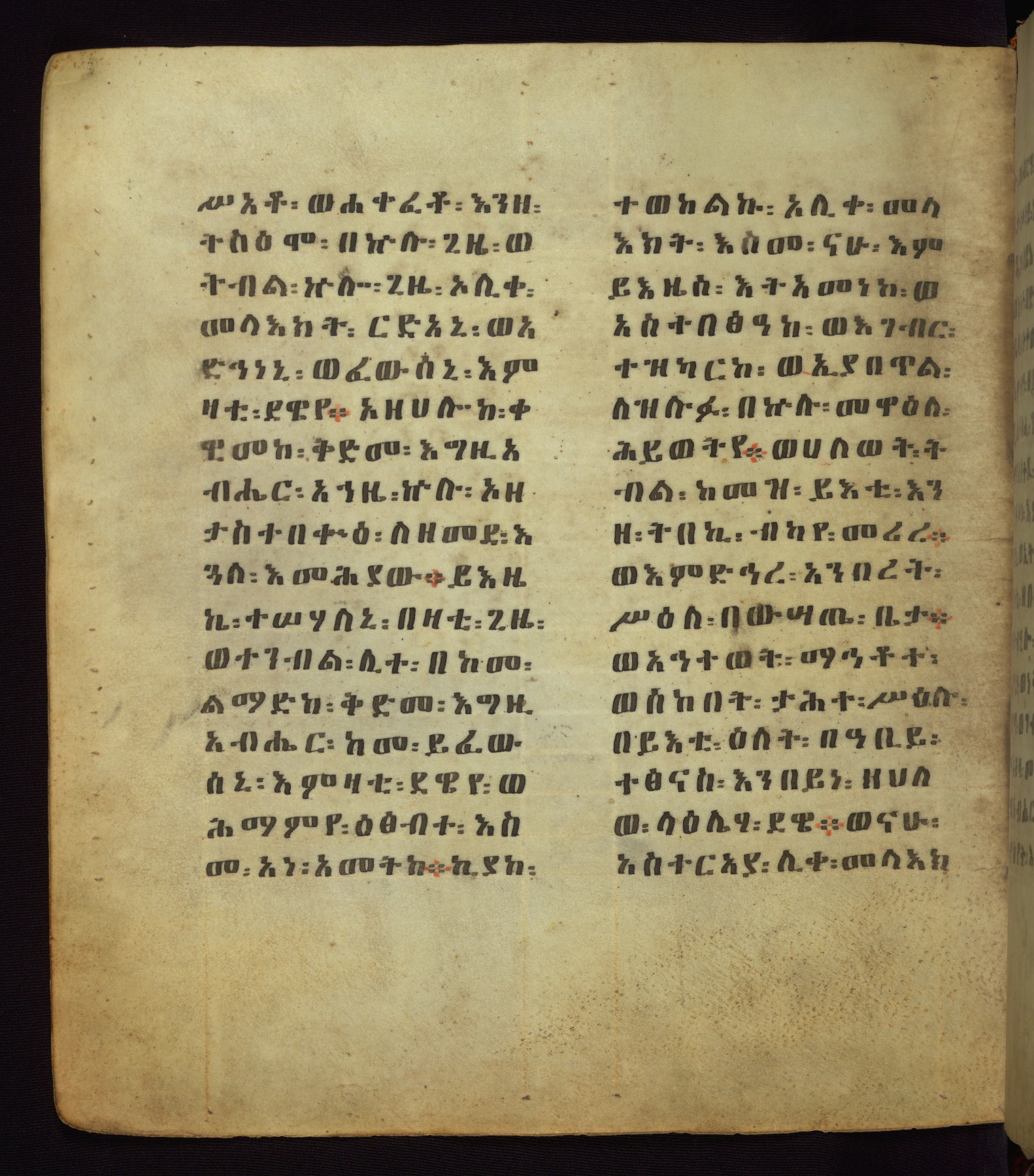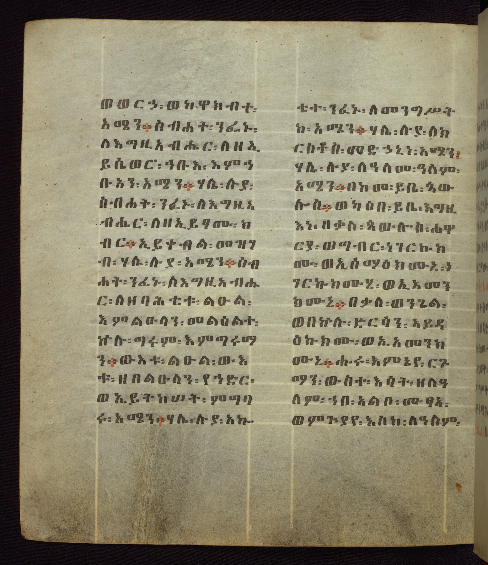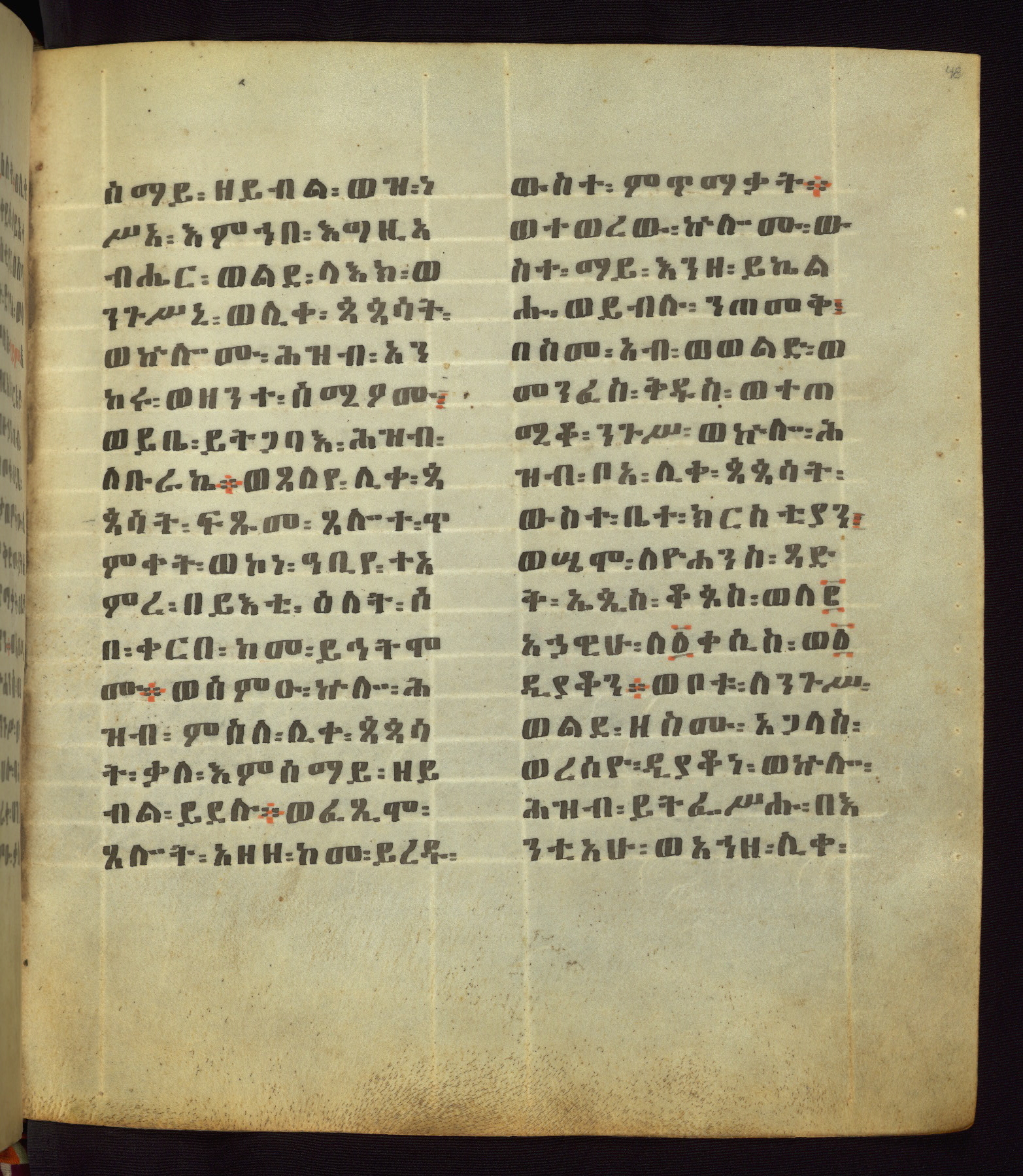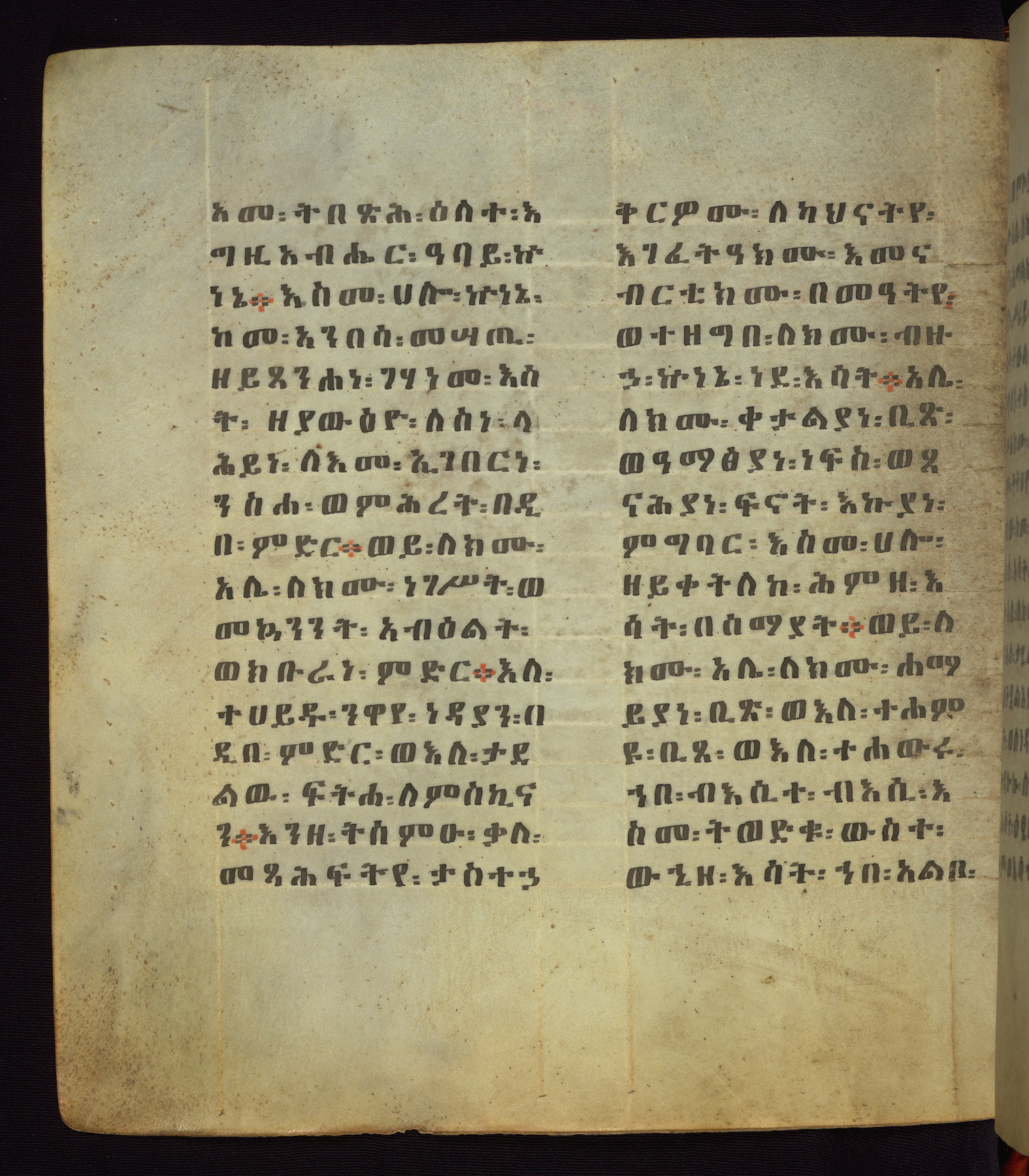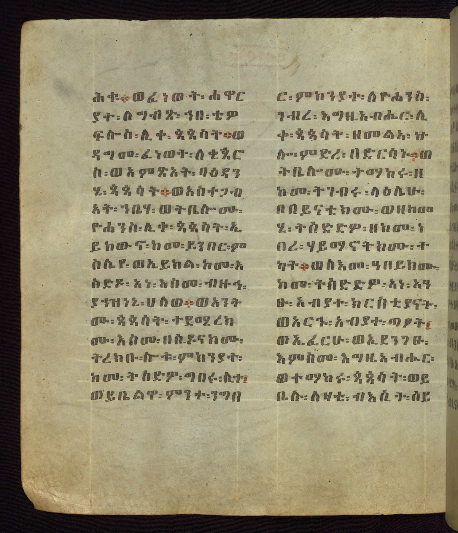 This Homiliary was created in Gondar, Ethiopia, during a period of artistic flowering in the late seventeenth century. The Imperial court and its accompanying aristocracy took up permanent residence in Gondar at this time, and the taste of these wealthy patrons for paintings and extensive image cycles is exemplified by this richly illuminated manuscript. The text, a Homiliary focused on the Miracles of the Archangel Michael, combines liturgical readings with forty-nine brightly colored renderings of God, St. Michael, and the miracles related in the text. Sections of the manuscript would have been read aloud on monthly feast days of the Archangel, and the images would have punctuated the readings. The artists were likely trained as painters, rather than solely as manuscript illuminators, and their art can therefore be linked stylistically to contemporary mural painting.
