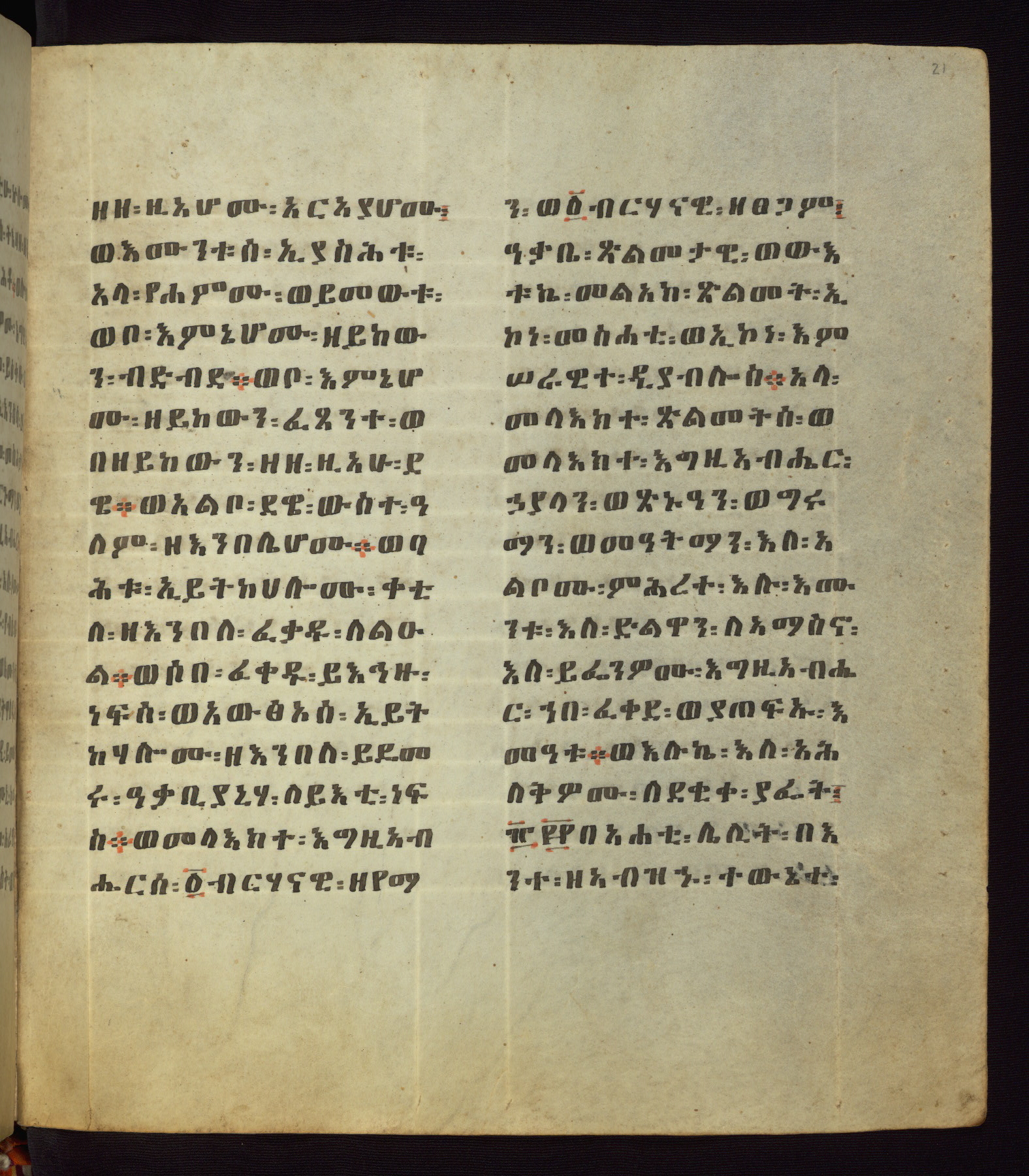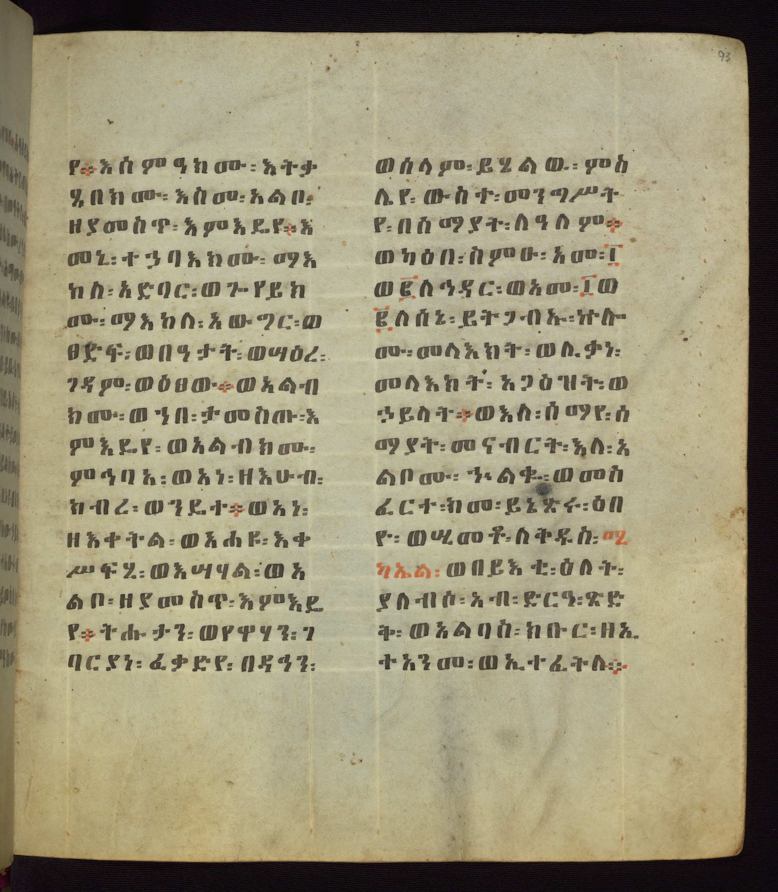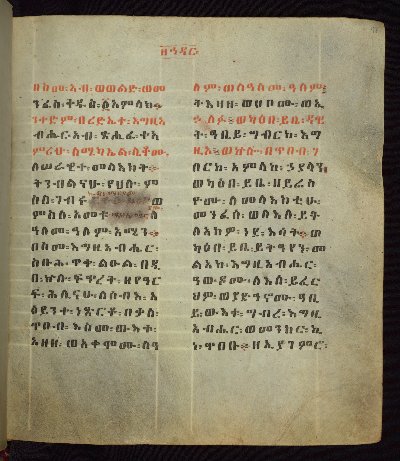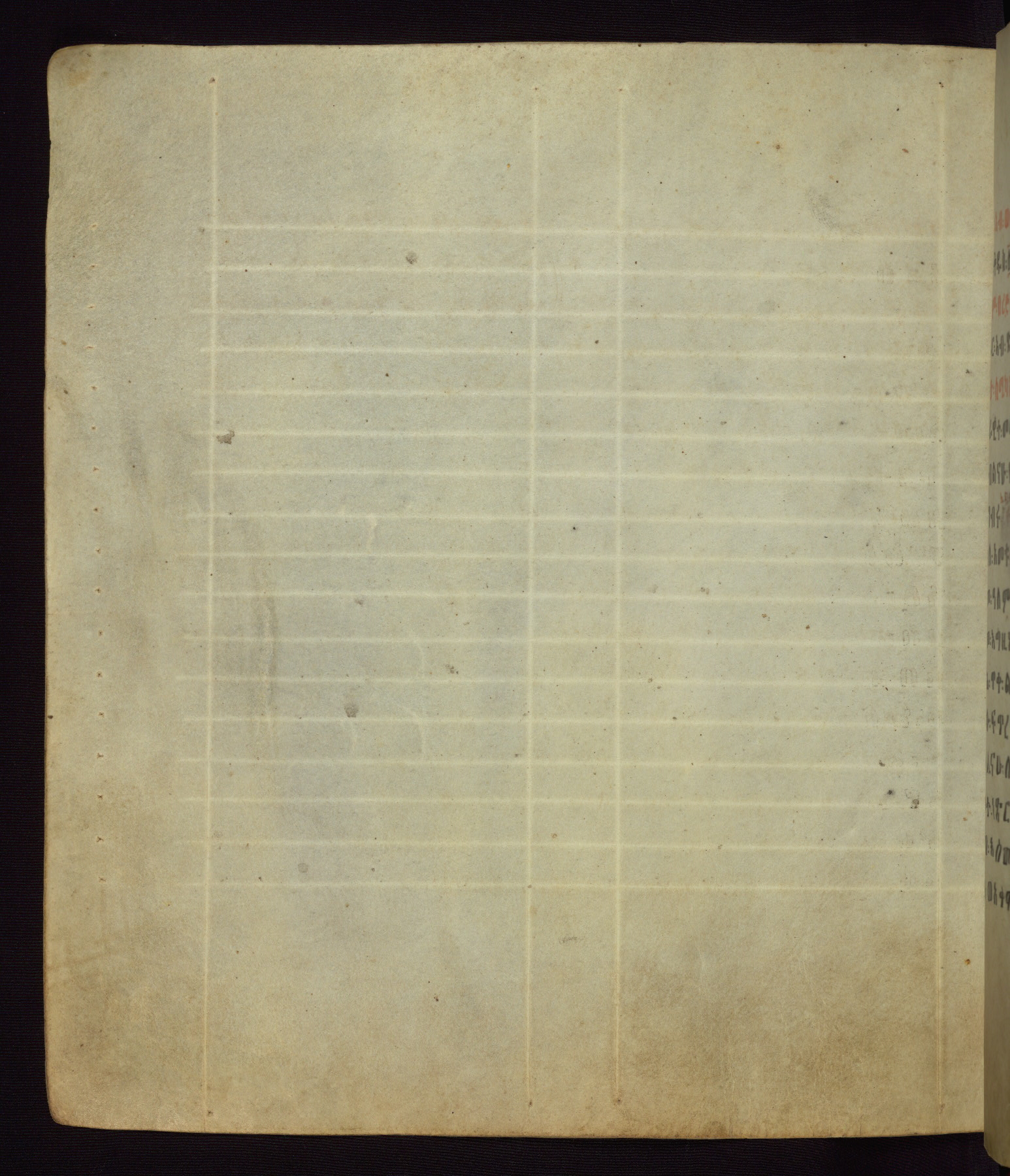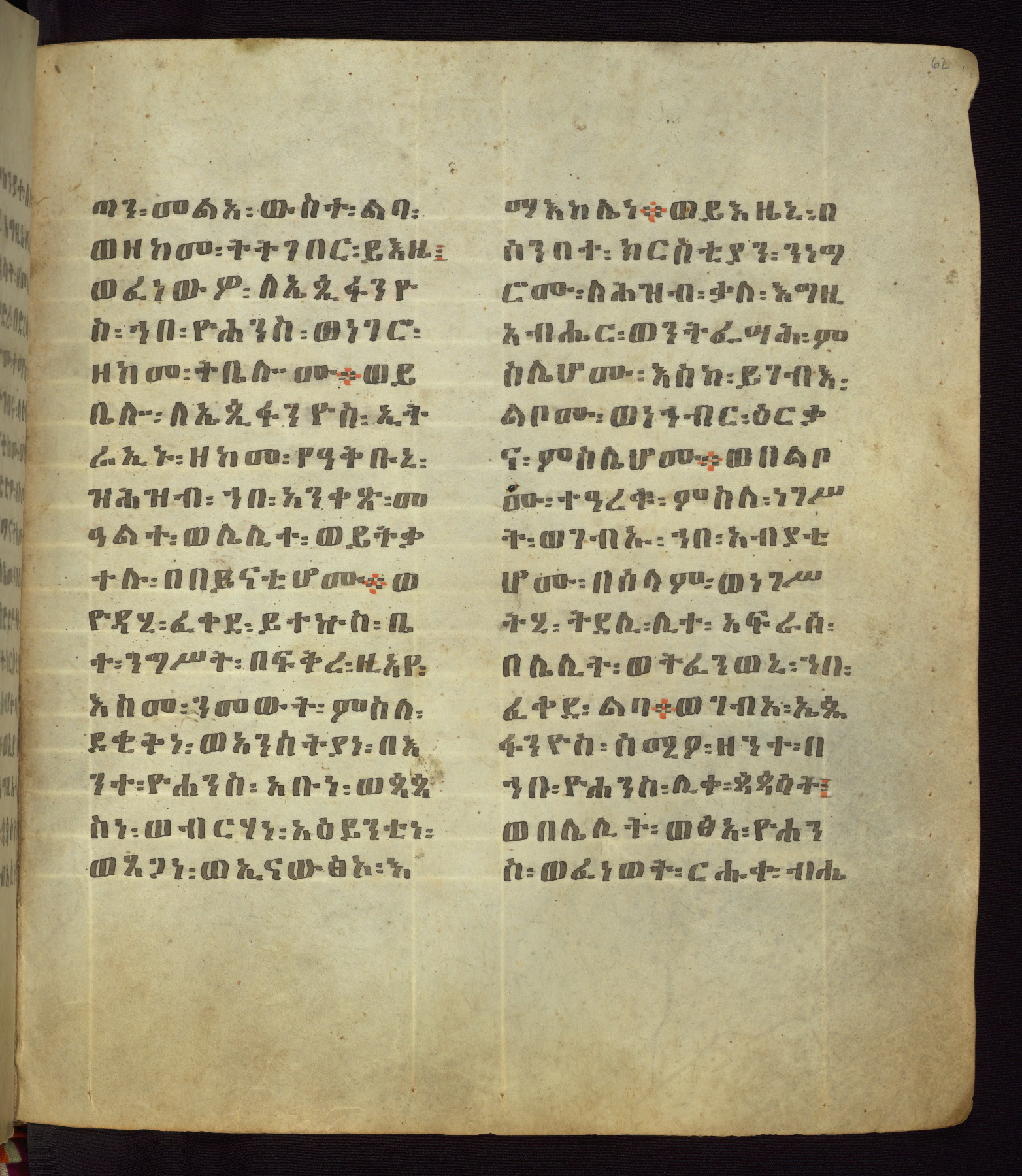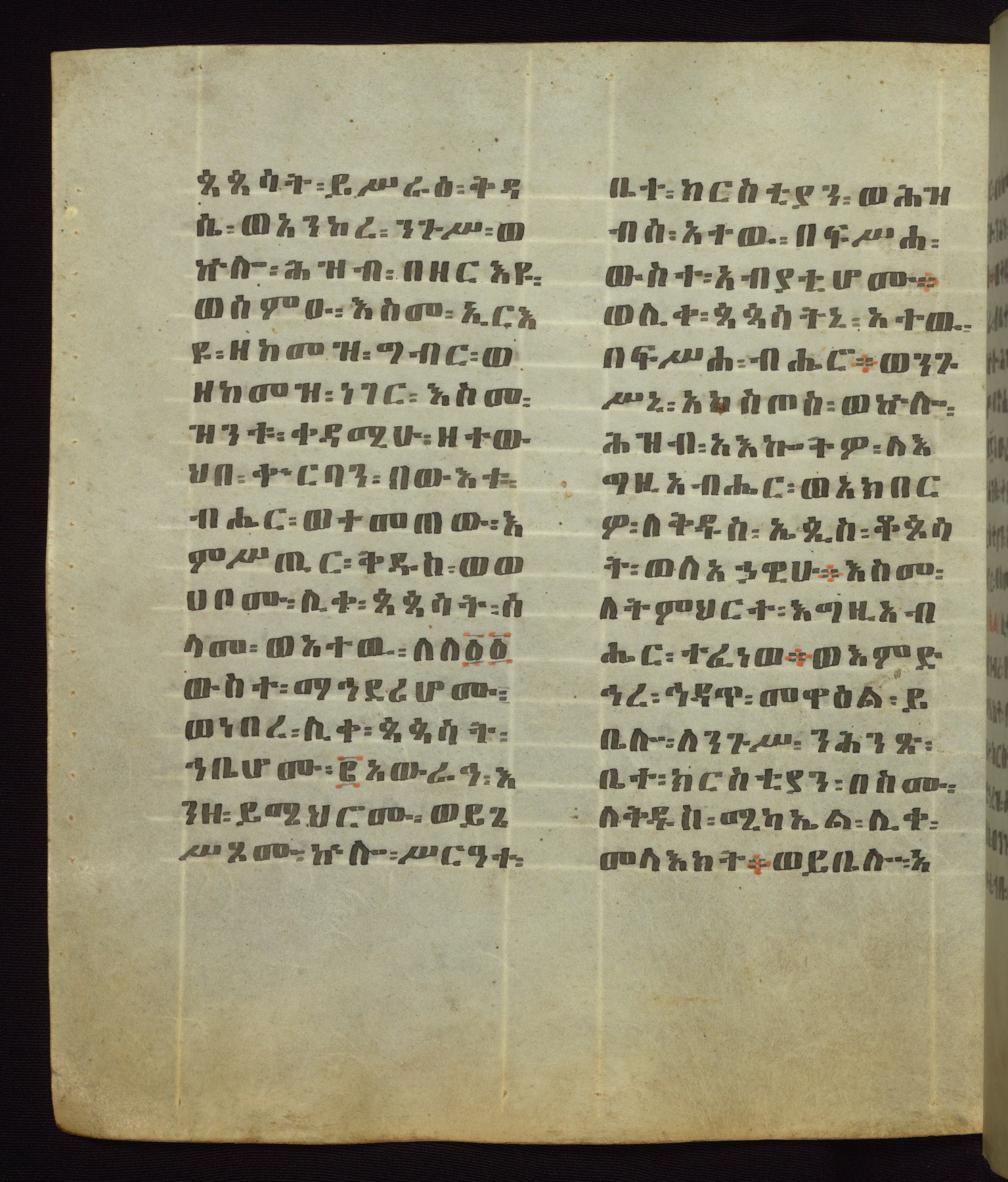This Homiliary was created in Gondar, Ethiopia, during a period of artistic flowering in the late seventeenth century. The Imperial court and its accompanying aristocracy took up permanent residence in Gondar at this time, and the taste of these wealthy patrons for paintings and extensive image cycles is exemplified by this richly illuminated manuscript. The text, a Homiliary focused on the Miracles of the Archangel Michael, combines liturgical readings with forty-nine brightly colored renderings of God, St. Michael, and the miracles related in the text. Sections of the manuscript would have been read aloud on monthly feast days of the Archangel, and the images would have punctuated the readings. The artists were likely trained as painters, rather than solely as manuscript illuminators, and their art can therefore be linked stylistically to contemporary mural painting.