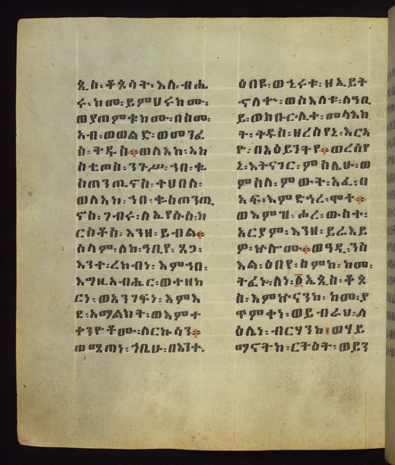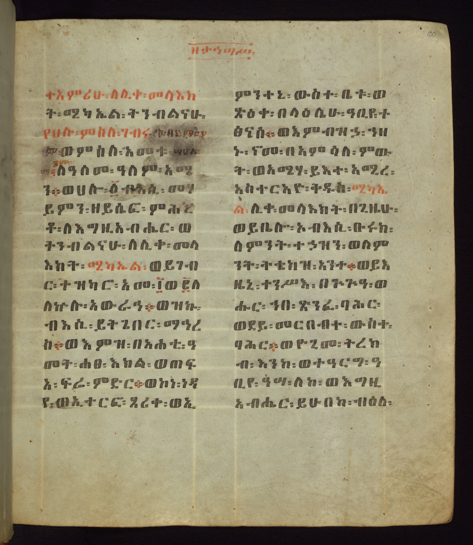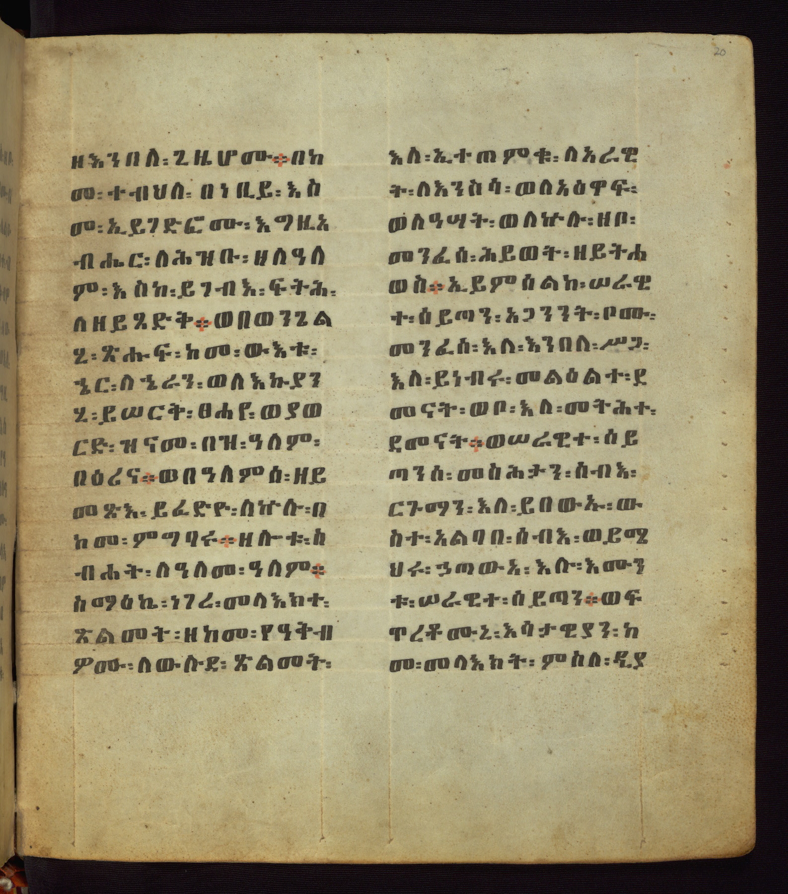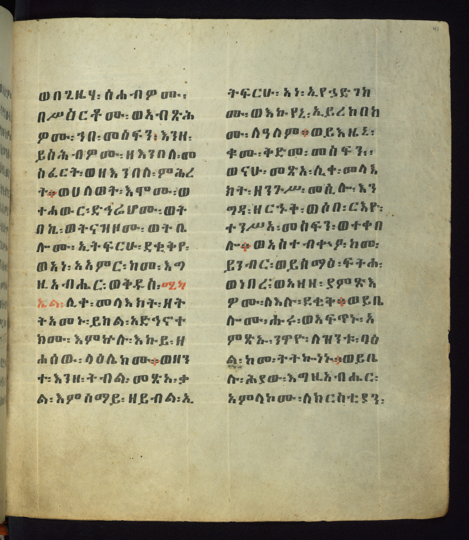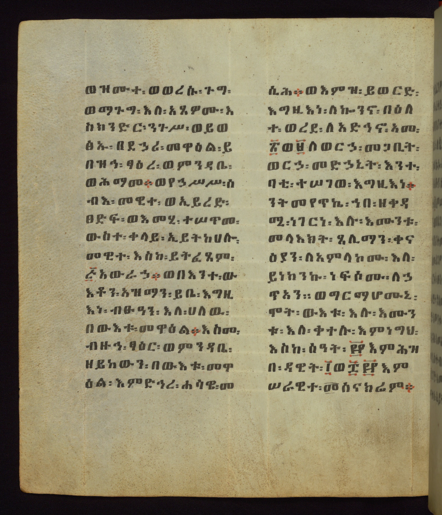 This Homiliary was created in Gondar, Ethiopia, during a period of artistic flowering in the late seventeenth century. The Imperial court and its accompanying aristocracy took up permanent residence in Gondar at this time, and the taste of these wealthy patrons for paintings and extensive image cycles is exemplified by this richly illuminated manuscript. The text, a Homiliary focused on the Miracles of the Archangel Michael, combines liturgical readings with forty-nine brightly colored renderings of God, St. Michael, and the miracles related in the text. Sections of the manuscript would have been read aloud on monthly feast days of the Archangel, and the images would have punctuated the readings. The artists were likely trained as painters, rather than solely as manuscript illuminators, and their art can therefore be linked stylistically to contemporary mural painting.