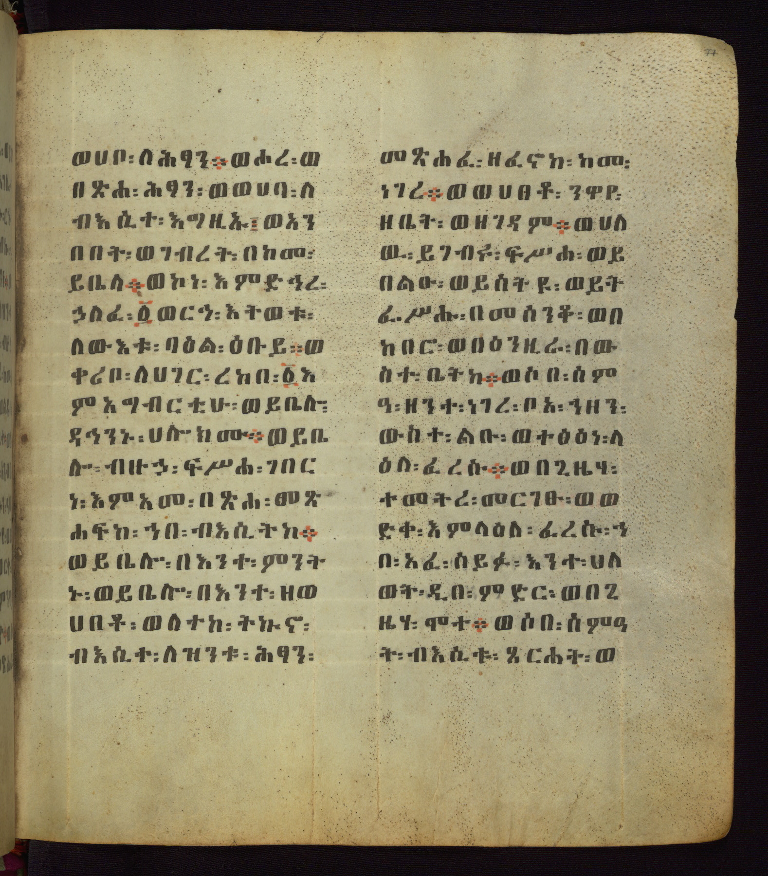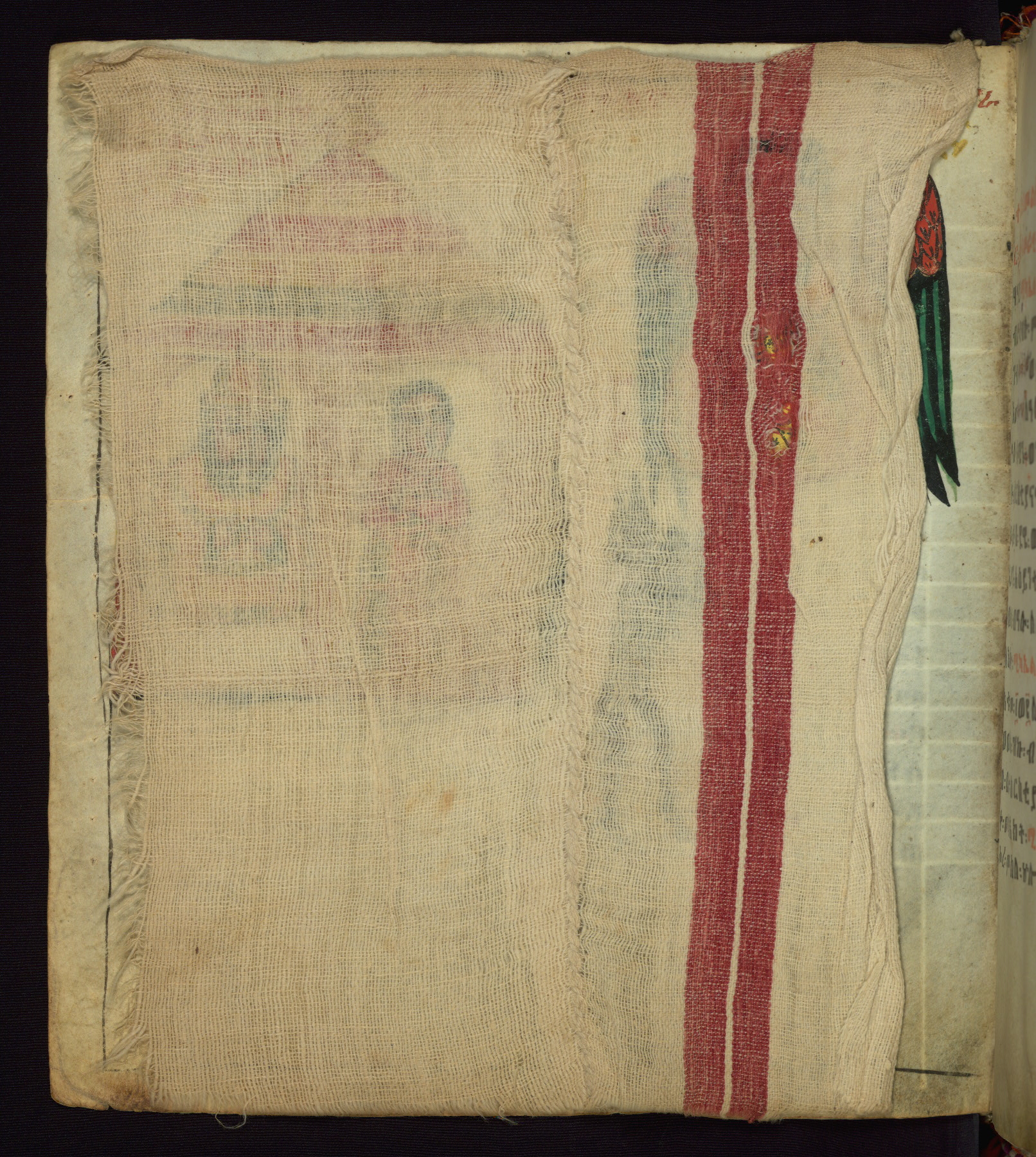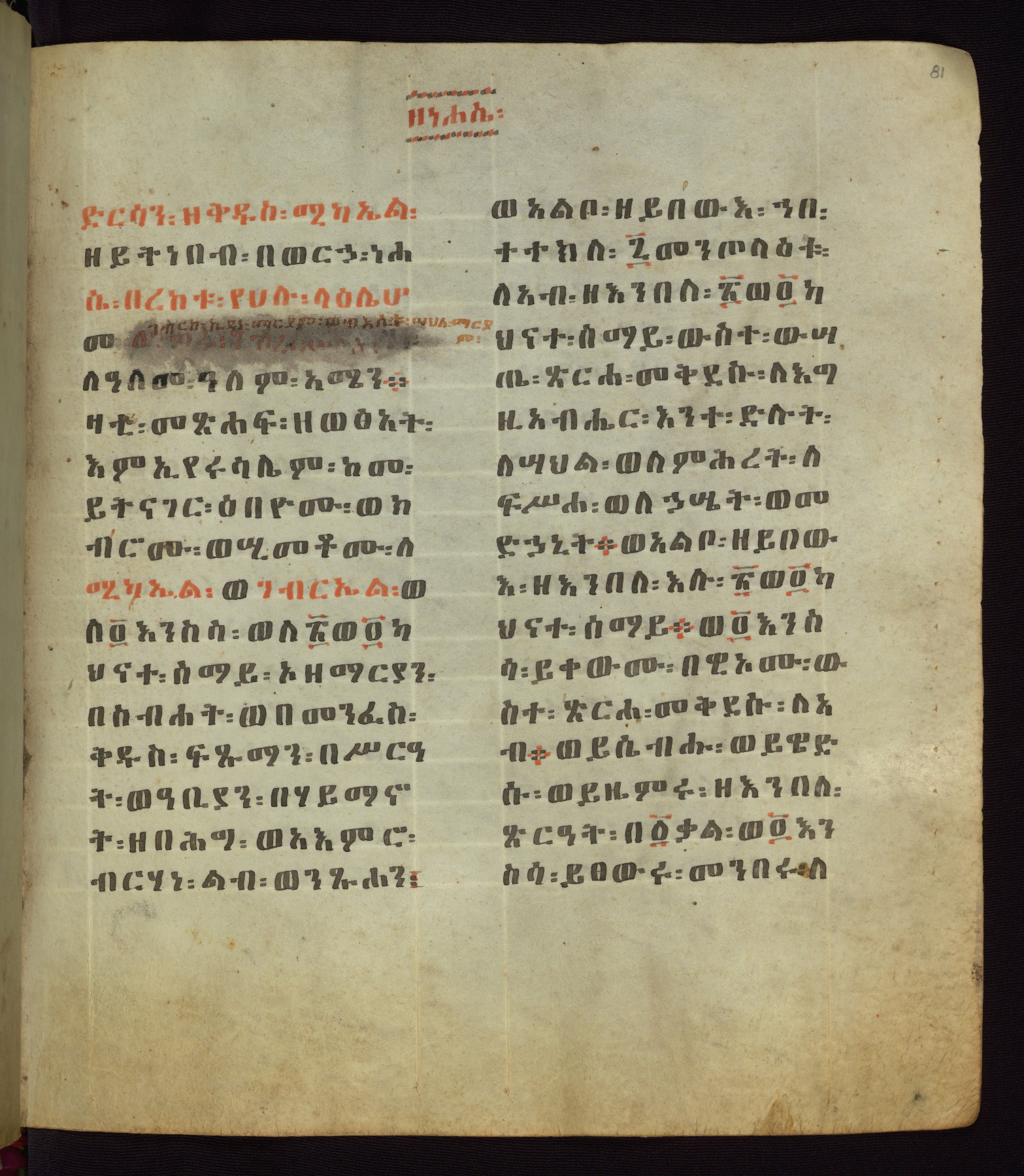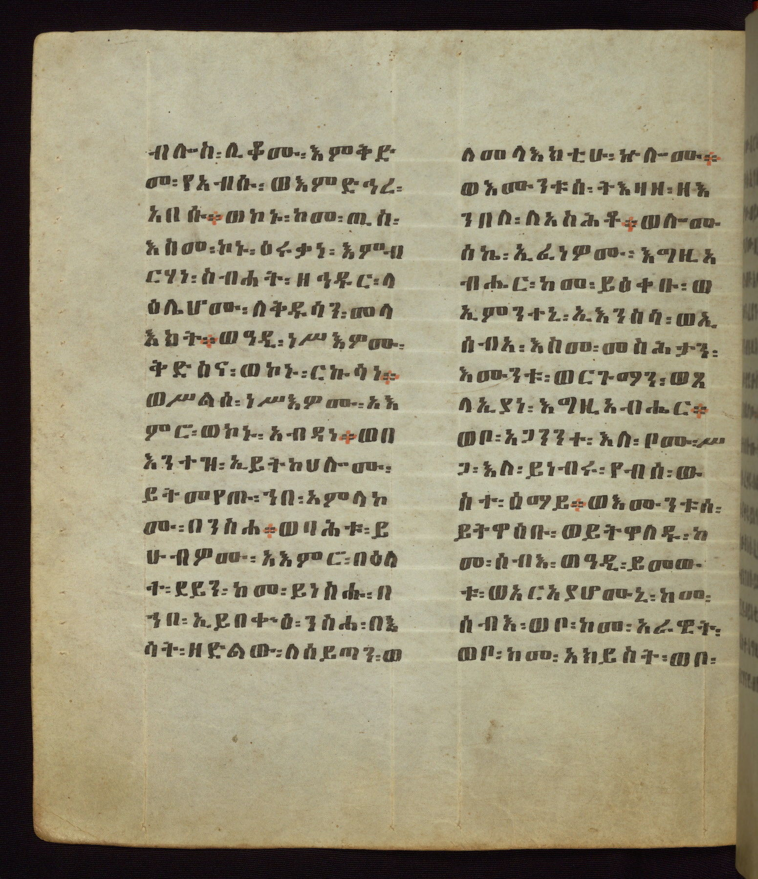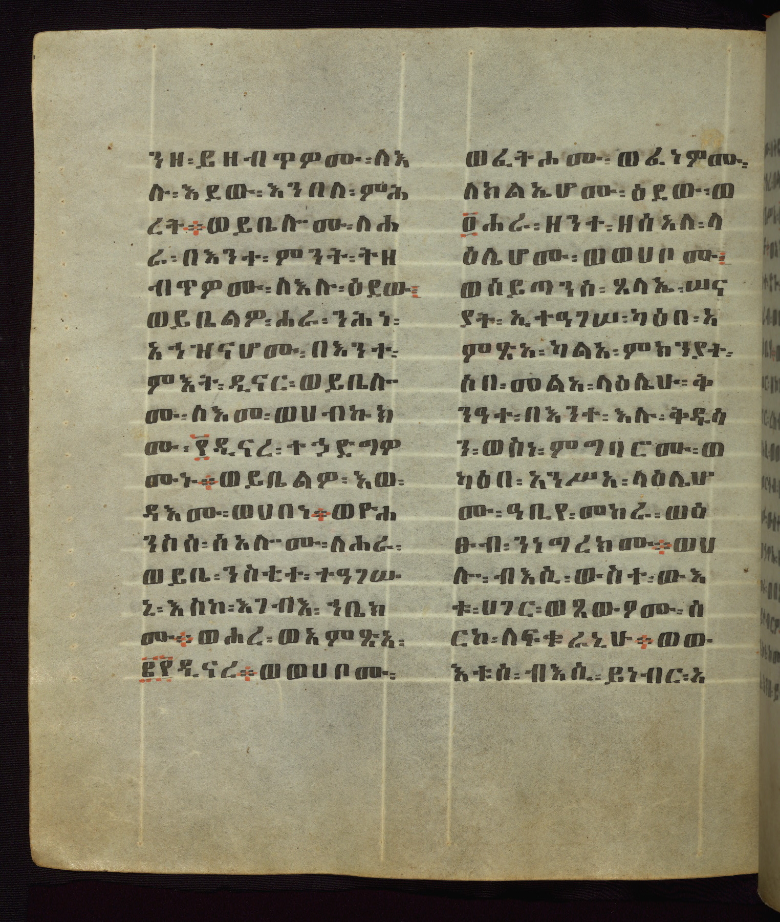 This Homiliary was created in Gondar, Ethiopia, during a period of artistic flowering in the late seventeenth century. The Imperial court and its accompanying aristocracy took up permanent residence in Gondar at this time, and the taste of these wealthy patrons for paintings and extensive image cycles is exemplified by this richly illuminated manuscript. The text, a Homiliary focused on the Miracles of the Archangel Michael, combines liturgical readings with forty-nine brightly colored renderings of God, St. Michael, and the miracles related in the text. Sections of the manuscript would have been read aloud on monthly feast days of the Archangel, and the images would have punctuated the readings. The artists were likely trained as painters, rather than solely as manuscript illuminators, and their art can therefore be linked stylistically to contemporary mural painting.