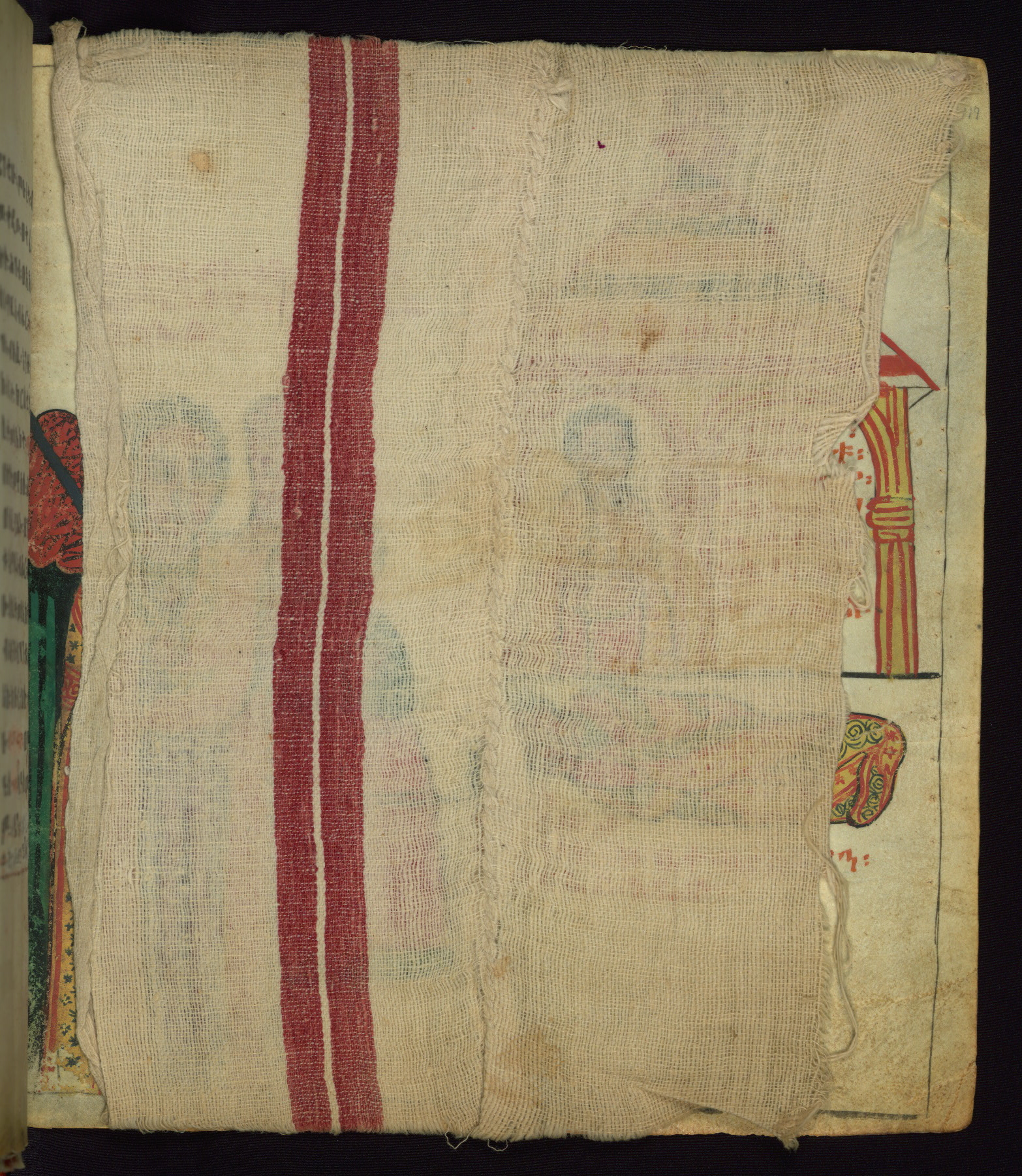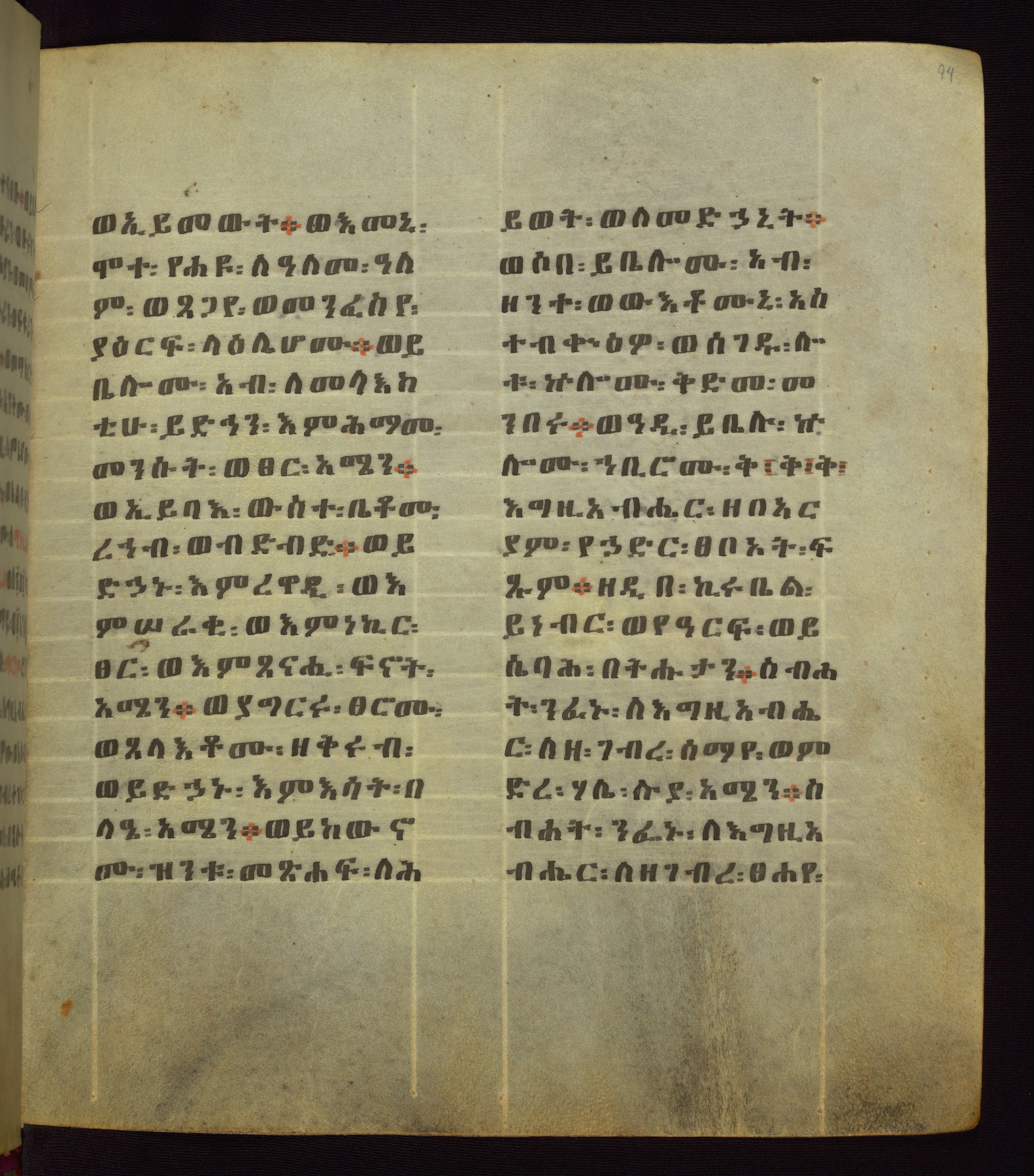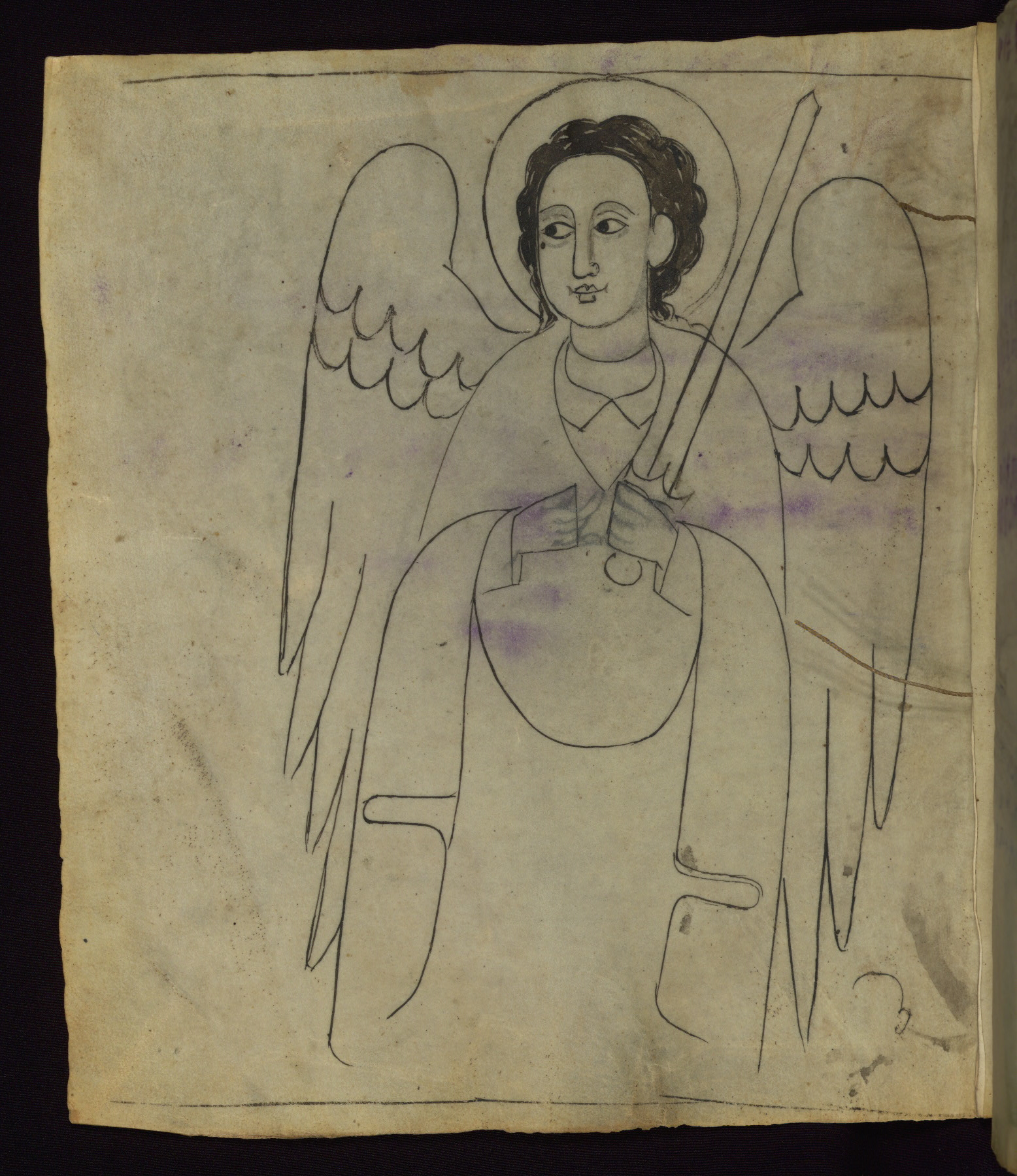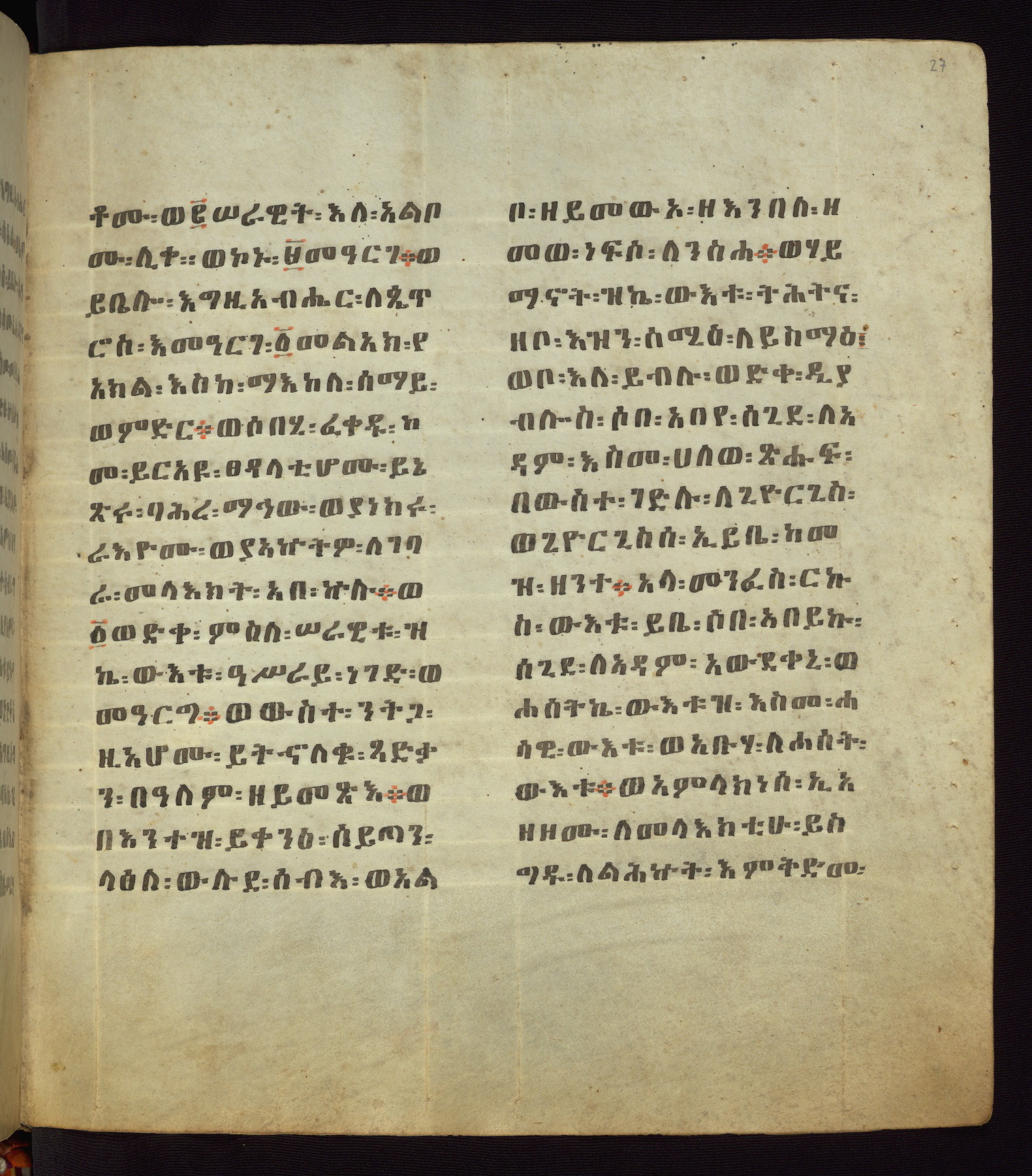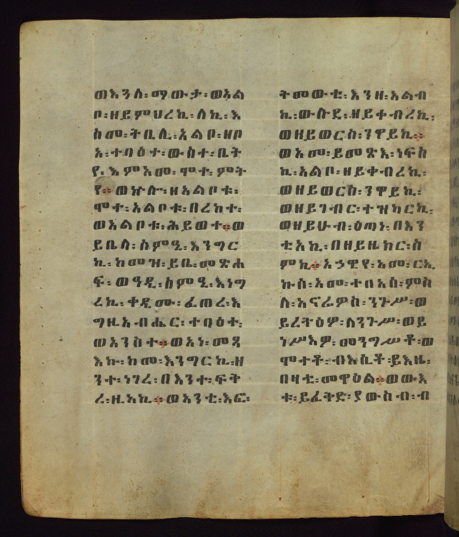 This Homiliary was created in Gondar, Ethiopia, during a period of artistic flowering in the late seventeenth century. The Imperial court and its accompanying aristocracy took up permanent residence in Gondar at this time, and the taste of these wealthy patrons for paintings and extensive image cycles is exemplified by this richly illuminated manuscript. The text, a Homiliary focused on the Miracles of the Archangel Michael, combines liturgical readings with forty-nine brightly colored renderings of God, St. Michael, and the miracles related in the text. Sections of the manuscript would have been read aloud on monthly feast days of the Archangel, and the images would have punctuated the readings. The artists were likely trained as painters, rather than solely as manuscript illuminators, and their art can therefore be linked stylistically to contemporary mural painting.