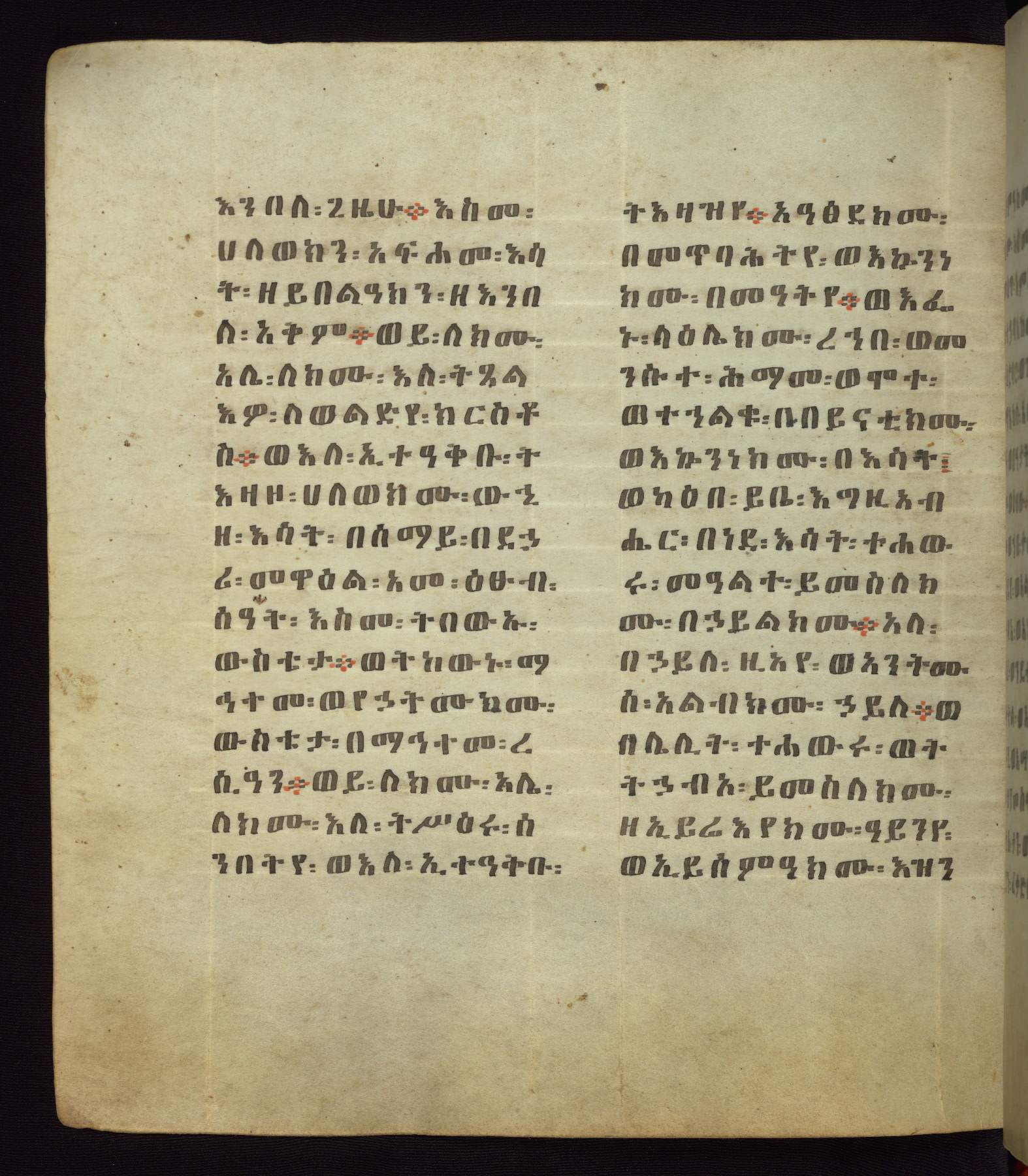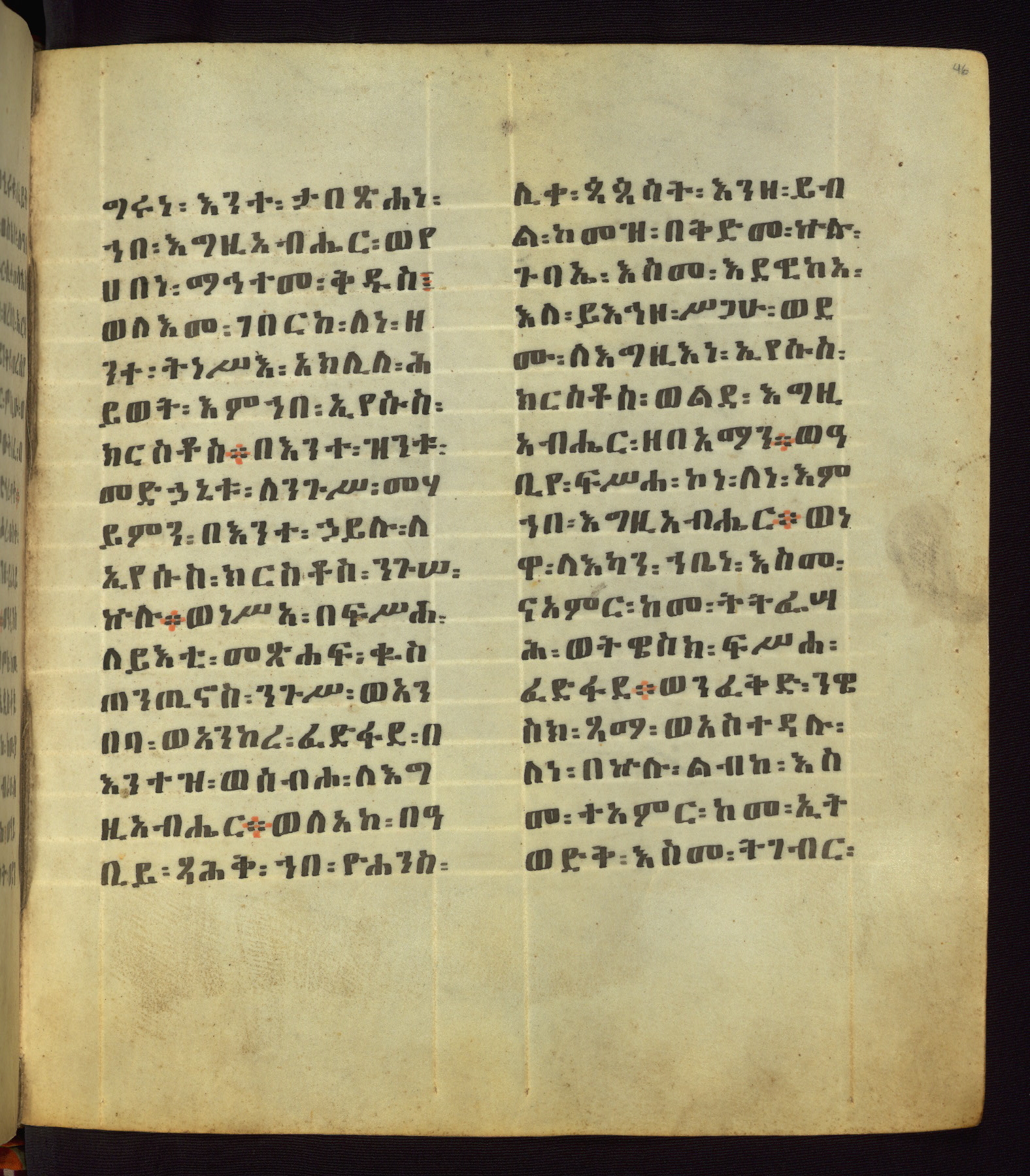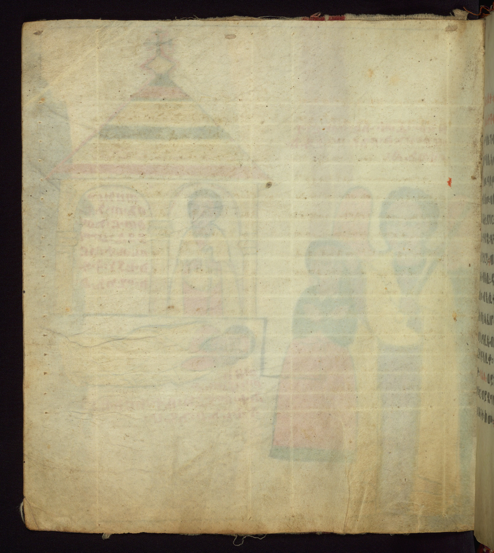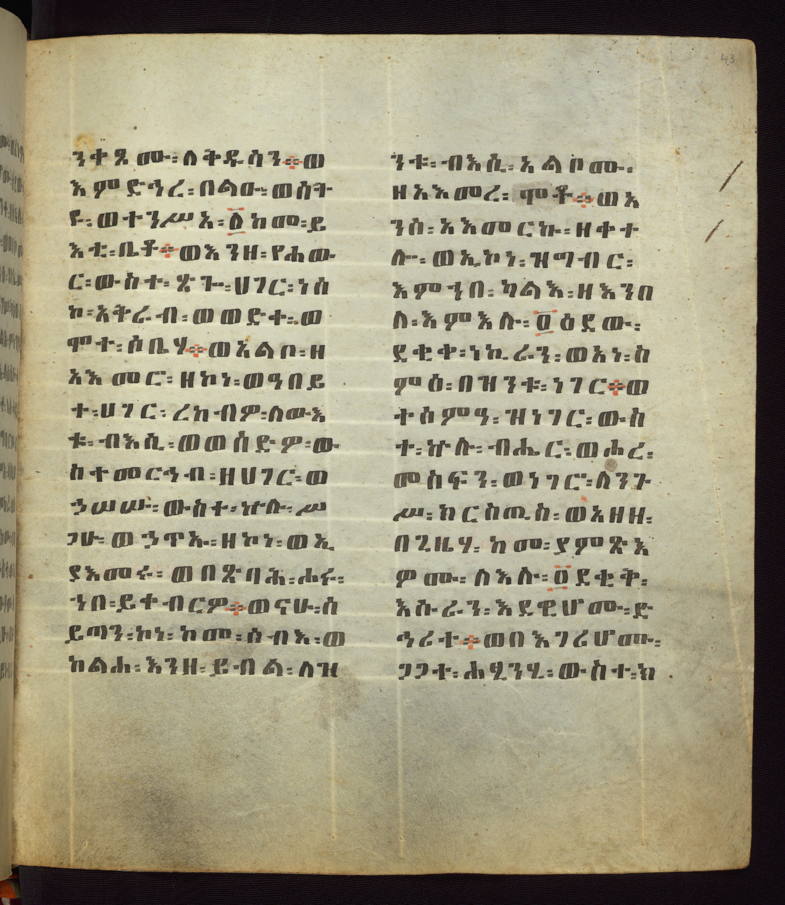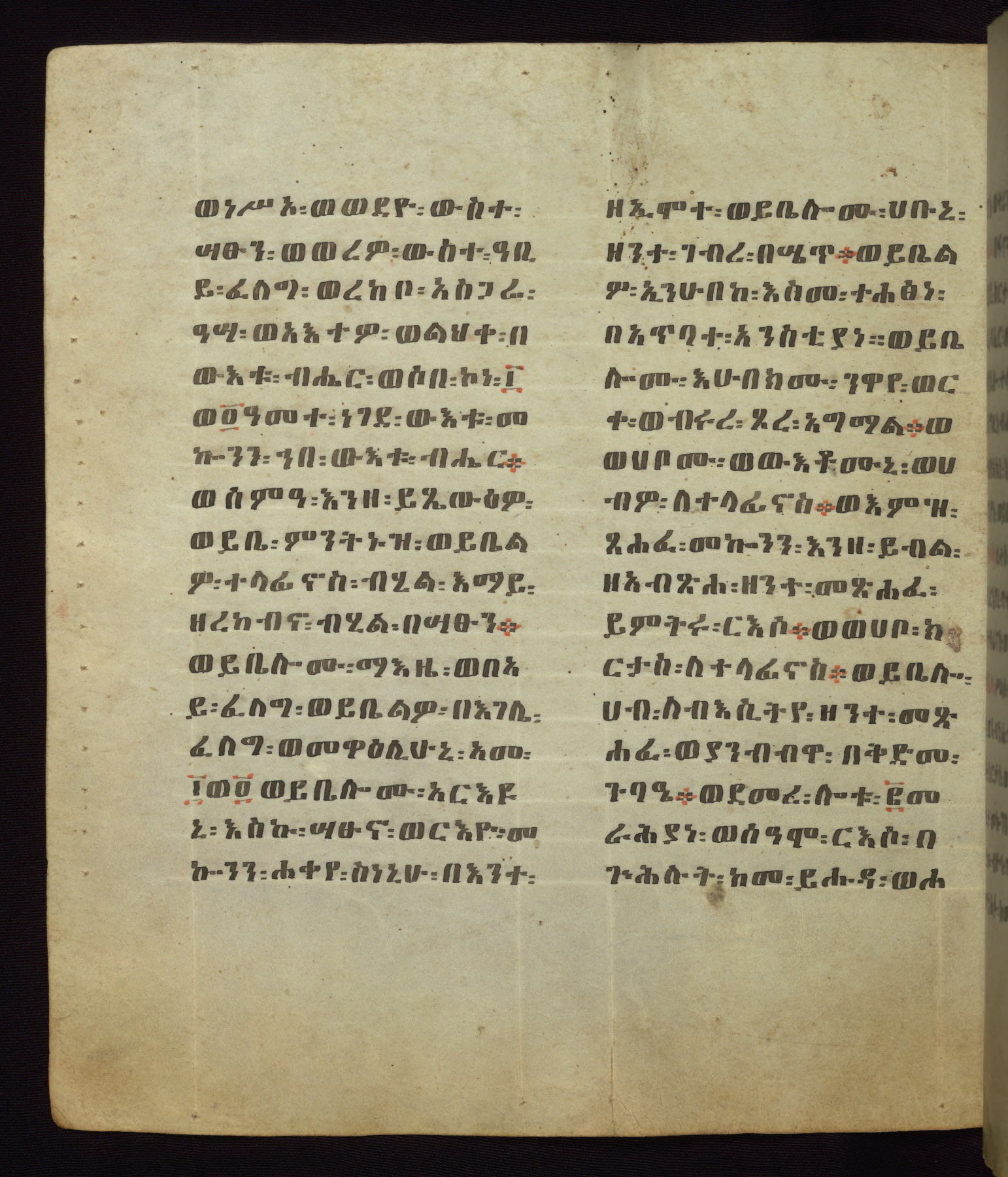 This Homiliary was created in Gondar, Ethiopia, during a period of artistic flowering in the late seventeenth century. The Imperial court and its accompanying aristocracy took up permanent residence in Gondar at this time, and the taste of these wealthy patrons for paintings and extensive image cycles is exemplified by this richly illuminated manuscript. The text, a Homiliary focused on the Miracles of the Archangel Michael, combines liturgical readings with forty-nine brightly colored renderings of God, St. Michael, and the miracles related in the text. Sections of the manuscript would have been read aloud on monthly feast days of the Archangel, and the images would have punctuated the readings. The artists were likely trained as painters, rather than solely as manuscript illuminators, and their art can therefore be linked stylistically to contemporary mural painting.