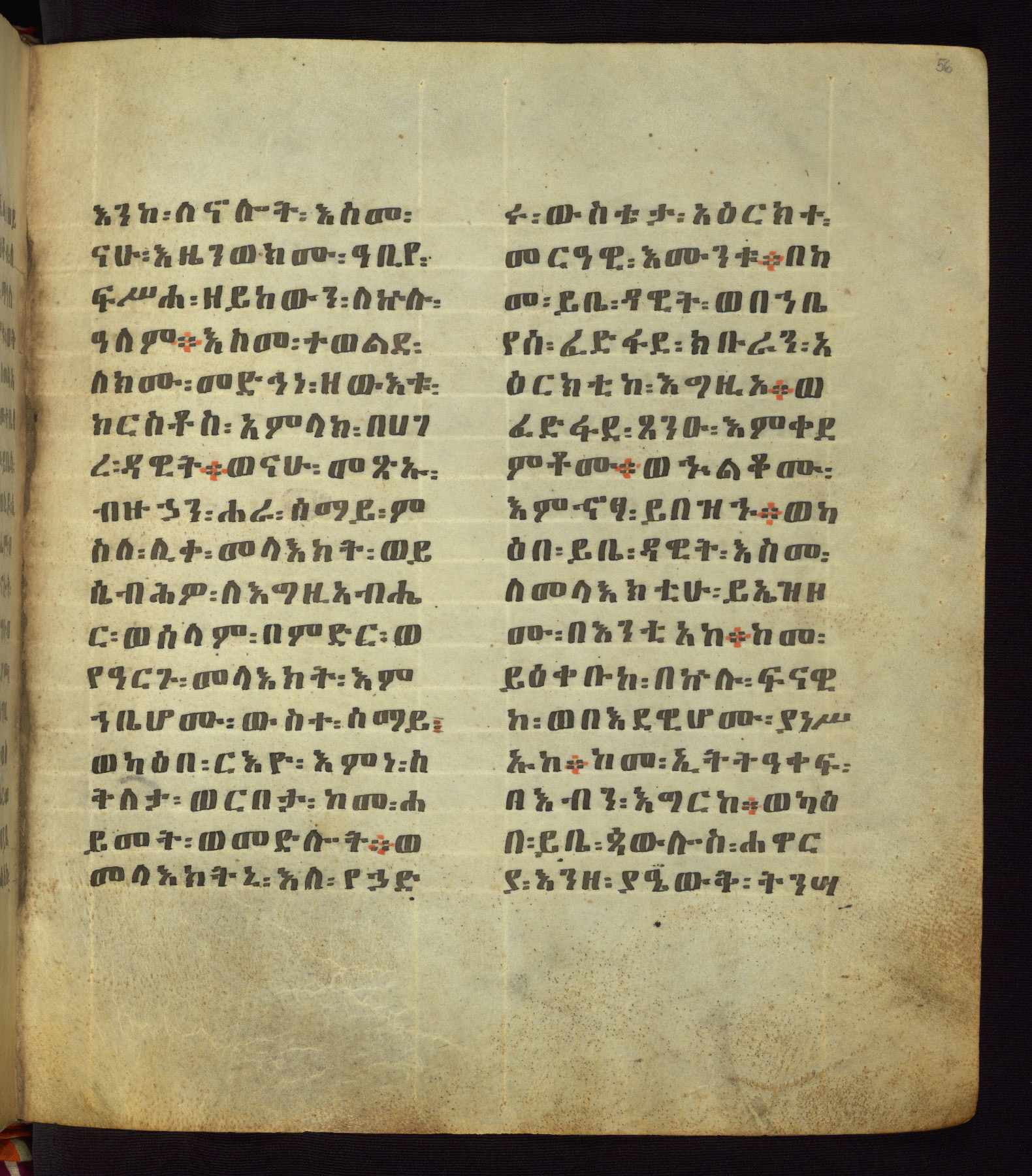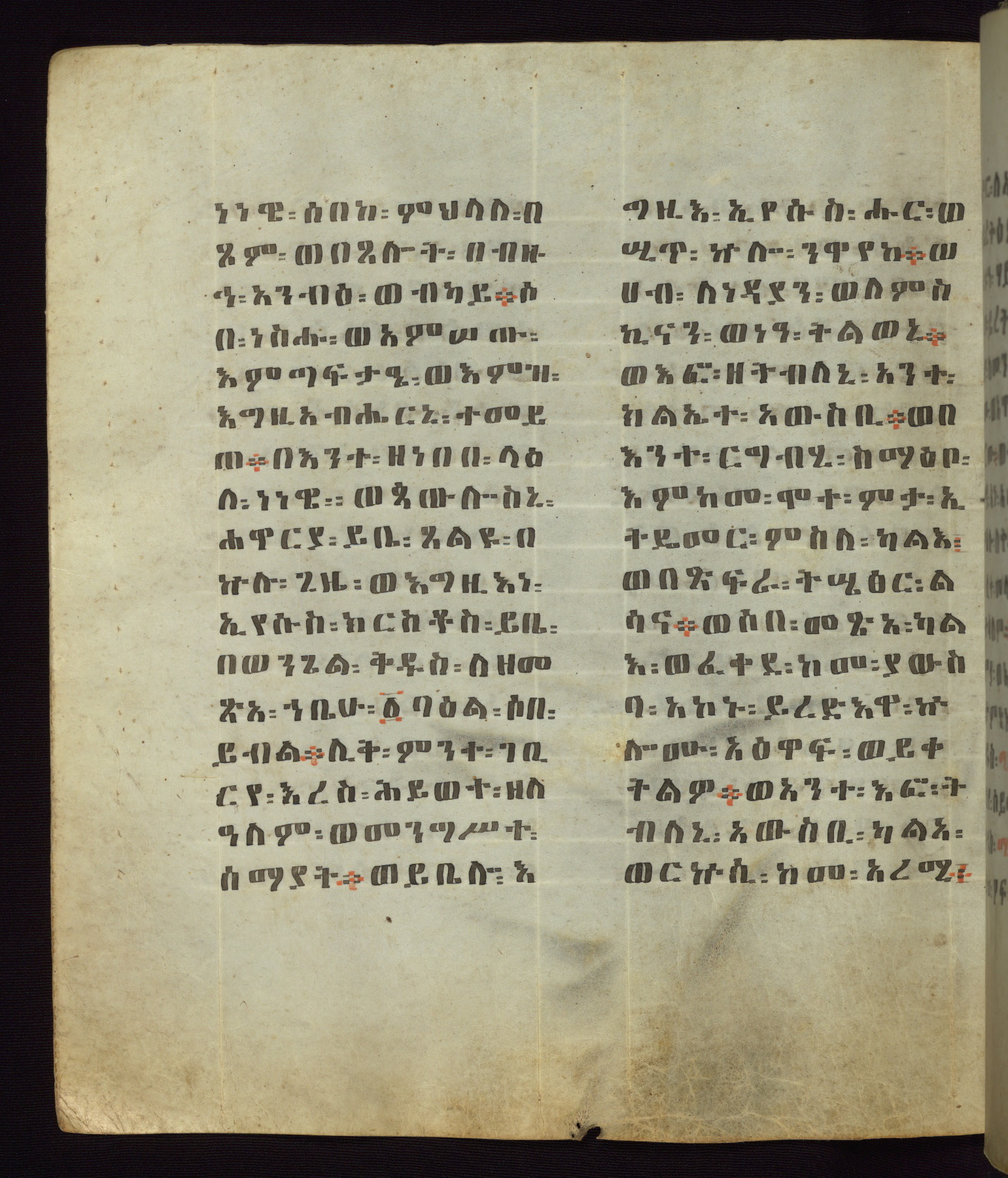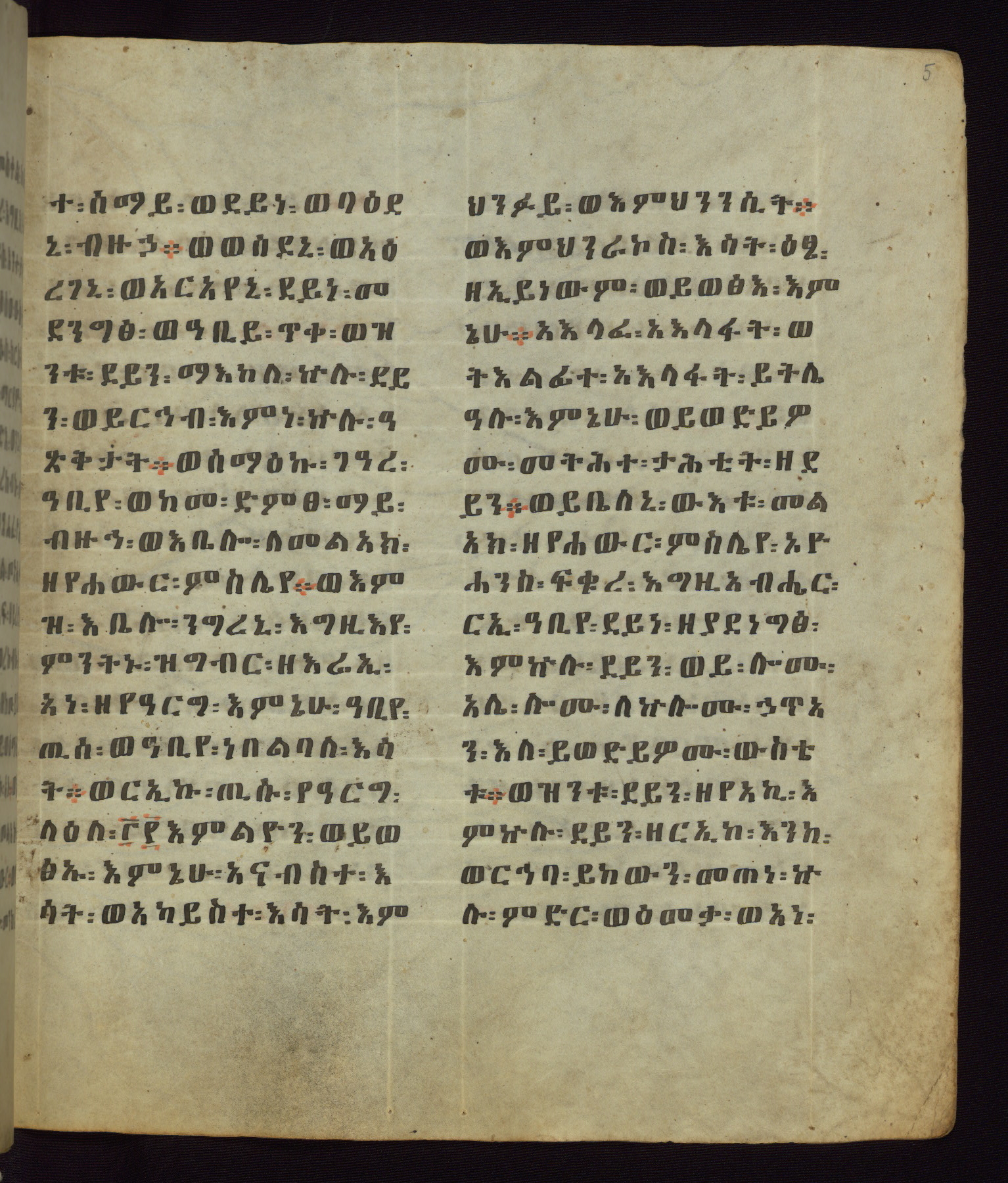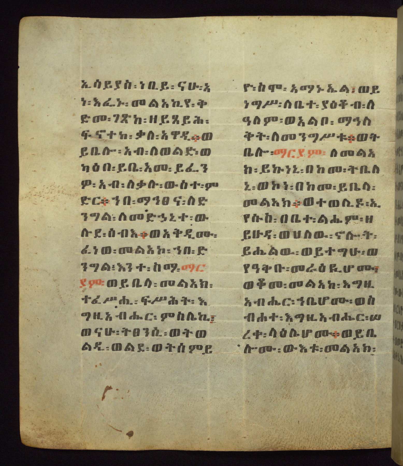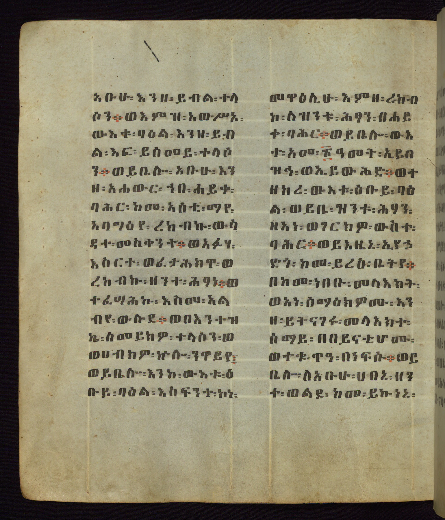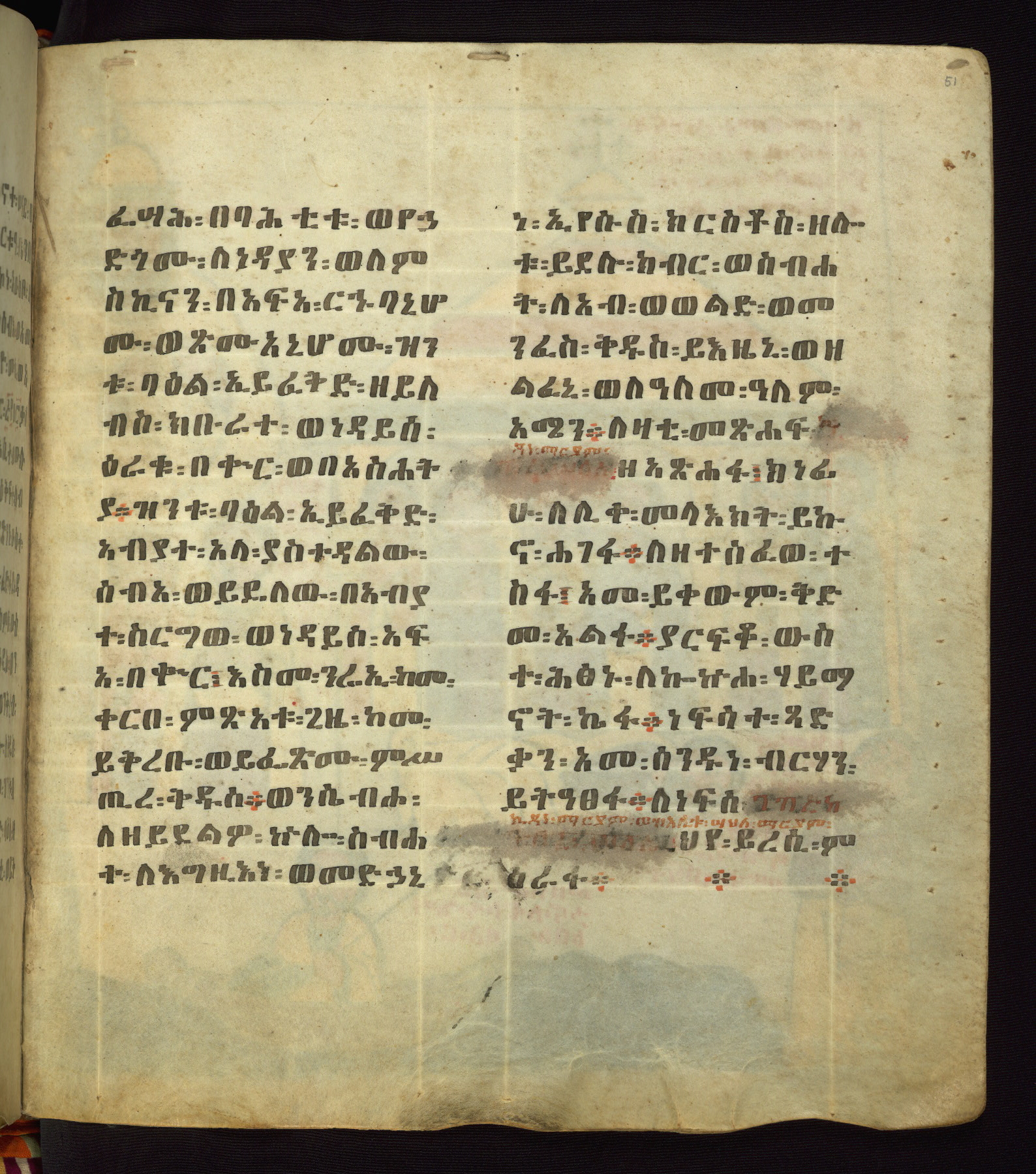 This Homiliary was created in Gondar, Ethiopia, during a period of artistic flowering in the late seventeenth century. The Imperial court and its accompanying aristocracy took up permanent residence in Gondar at this time, and the taste of these wealthy patrons for paintings and extensive image cycles is exemplified by this richly illuminated manuscript. The text, a Homiliary focused on the Miracles of the Archangel Michael, combines liturgical readings with forty-nine brightly colored renderings of God, St. Michael, and the miracles related in the text. Sections of the manuscript would have been read aloud on monthly feast days of the Archangel, and the images would have punctuated the readings. The artists were likely trained as painters, rather than solely as manuscript illuminators, and their art can therefore be linked stylistically to contemporary mural painting.