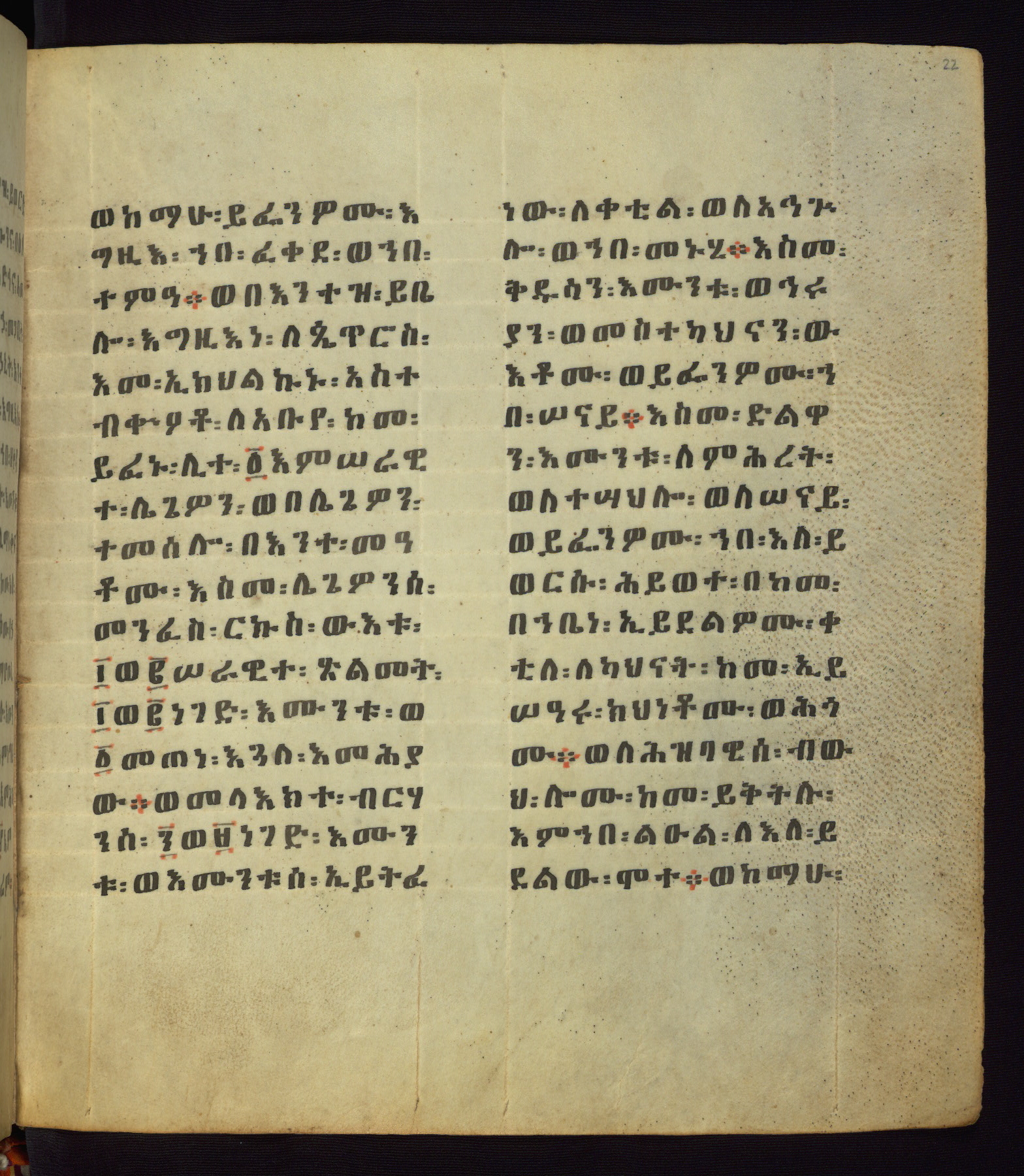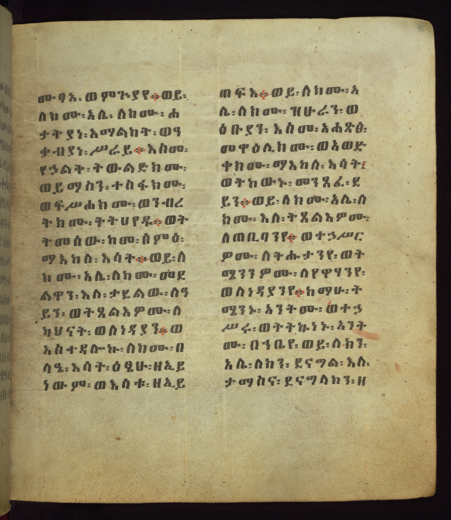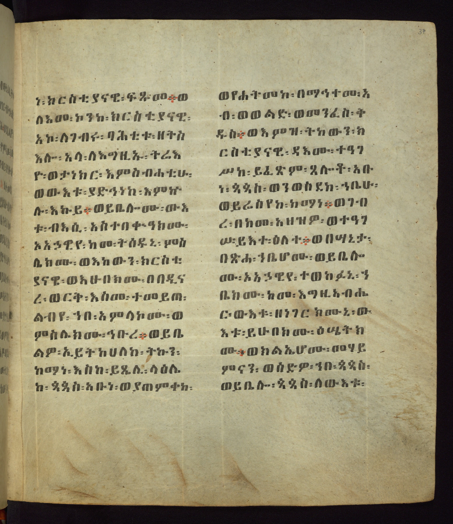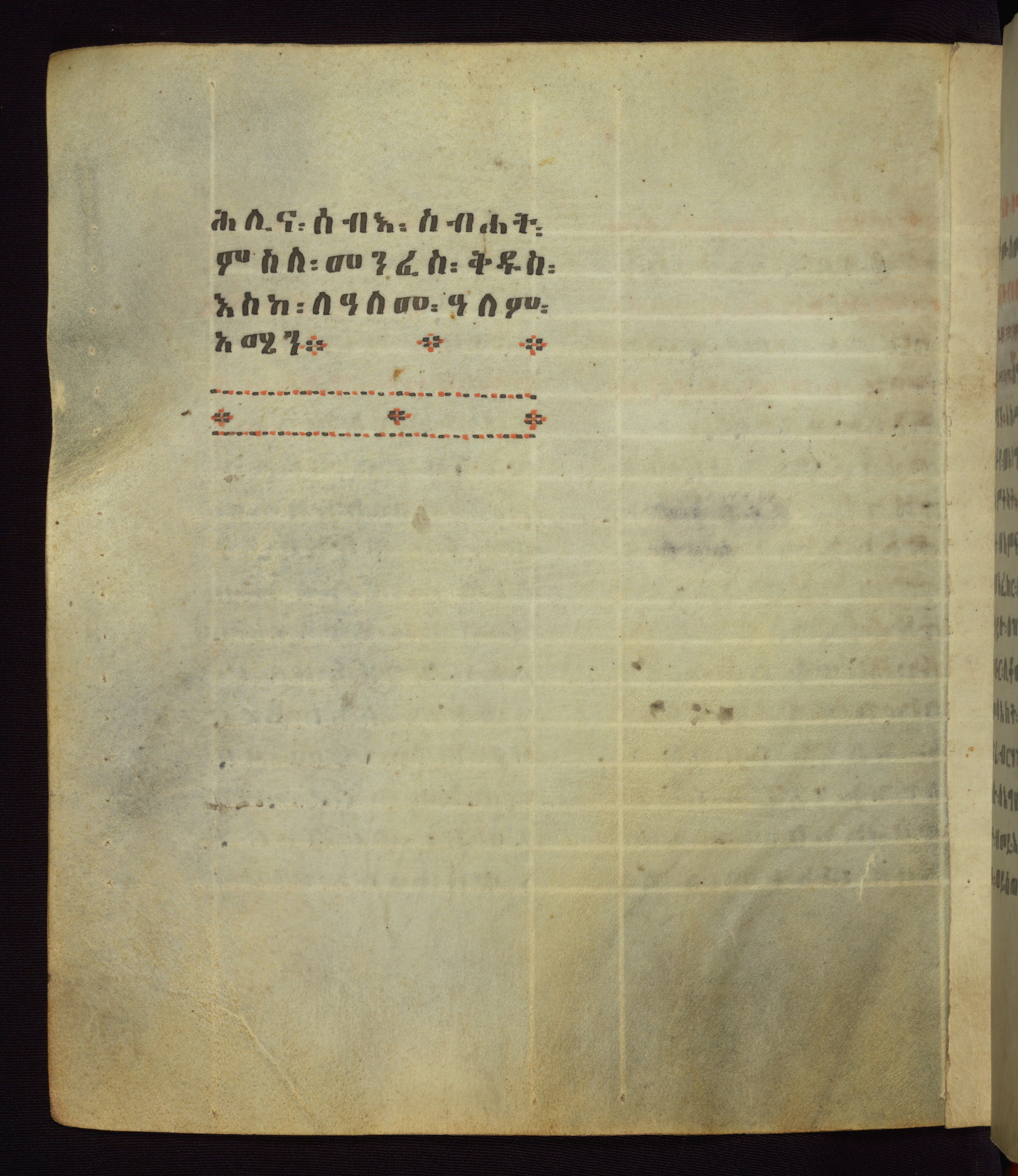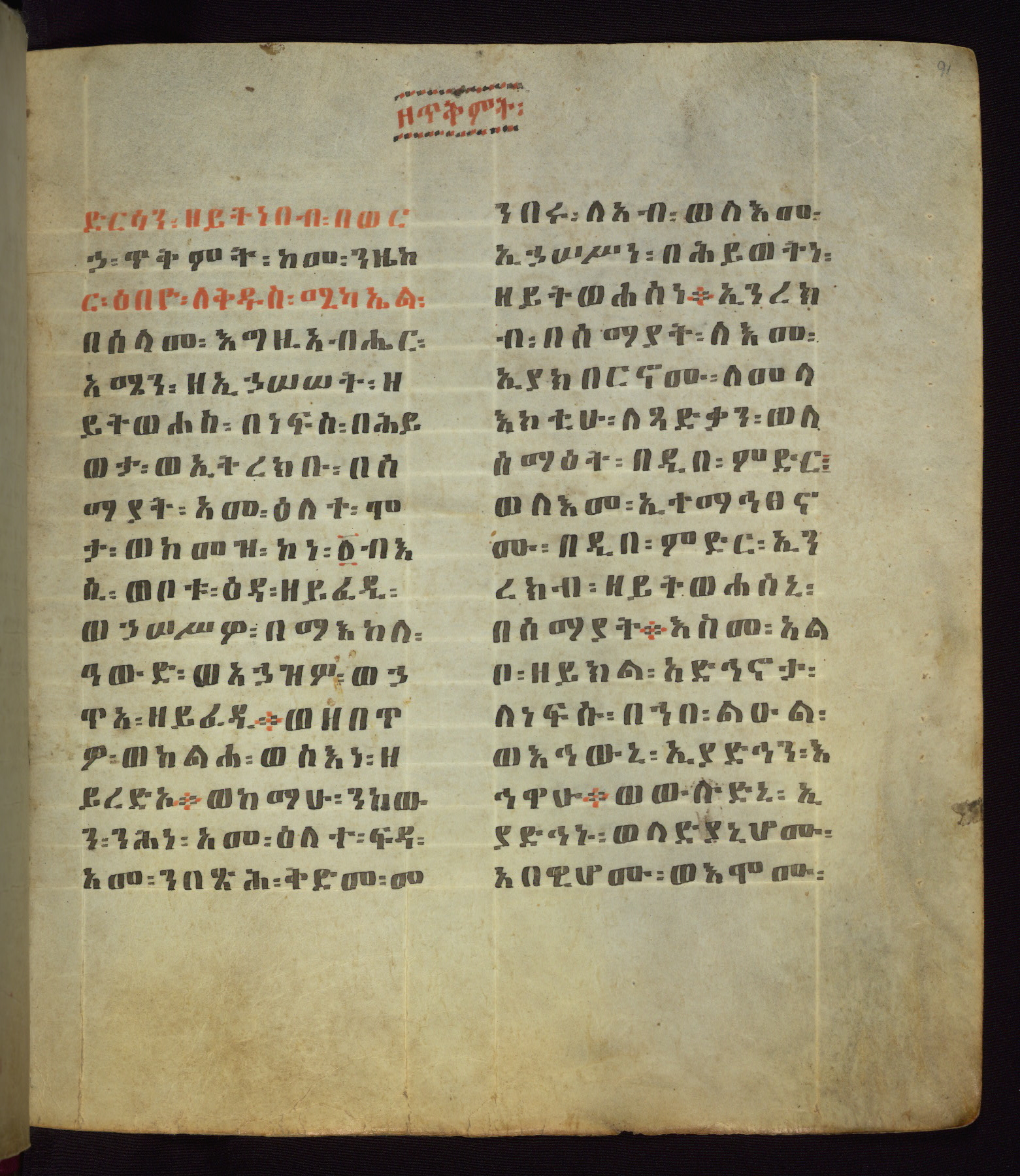 This Homiliary was created in Gondar, Ethiopia, during a period of artistic flowering in the late seventeenth century. The Imperial court and its accompanying aristocracy took up permanent residence in Gondar at this time, and the taste of these wealthy patrons for paintings and extensive image cycles is exemplified by this richly illuminated manuscript. The text, a Homiliary focused on the Miracles of the Archangel Michael, combines liturgical readings with forty-nine brightly colored renderings of God, St. Michael, and the miracles related in the text. Sections of the manuscript would have been read aloud on monthly feast days of the Archangel, and the images would have punctuated the readings. The artists were likely trained as painters, rather than solely as manuscript illuminators, and their art can therefore be linked stylistically to contemporary mural painting.