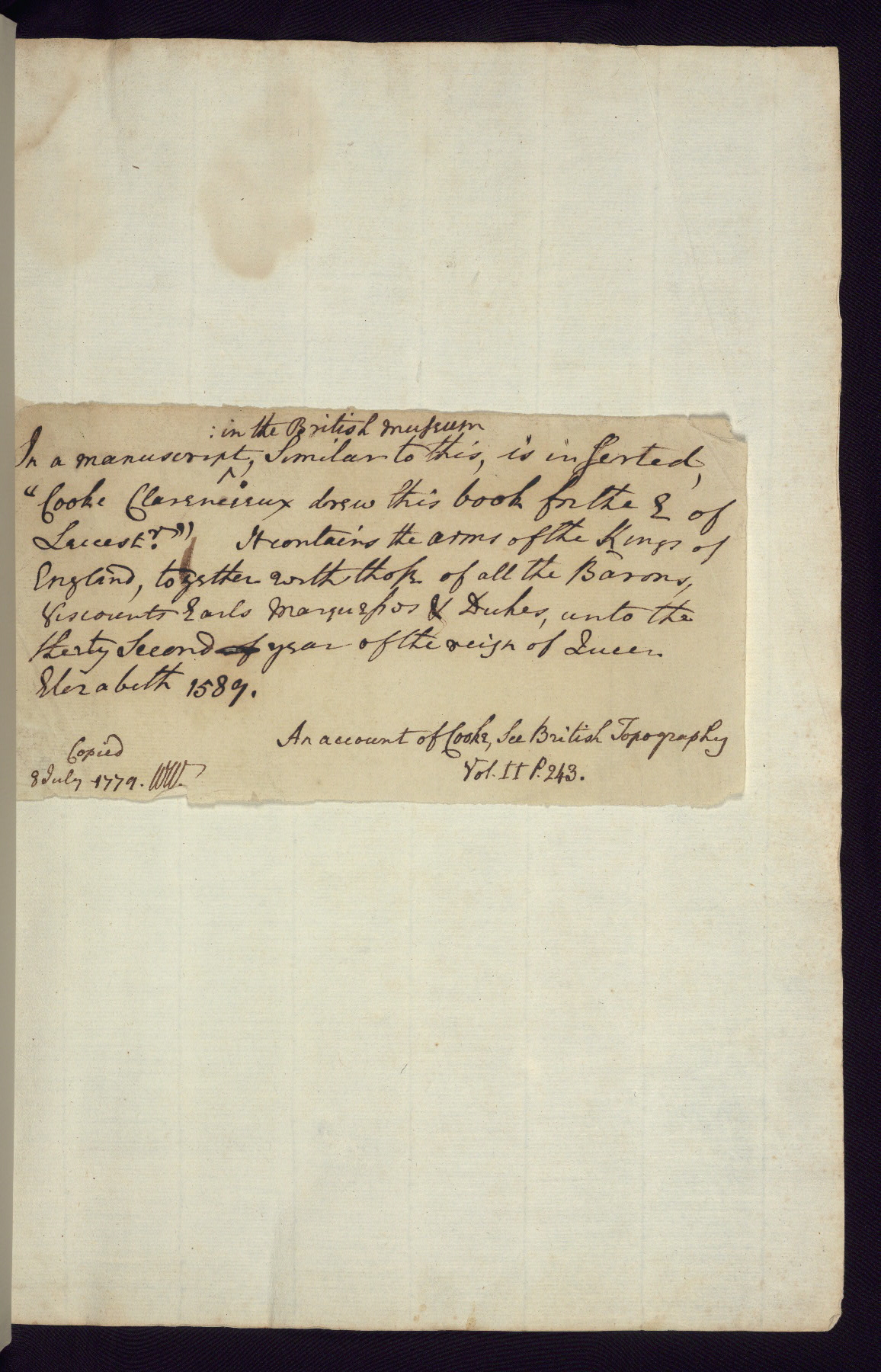 This book of English heraldry was completed ca. 1589. The manuscript belonged to the Spencer family, as known through inscriptions on the first few flyleaves, including the motto "Dieu defende Le Droit" (God defends the right). This motto has long been associated with the Spencer family of England, which is the family line of Princess Diana, as well as the Spencers who were among the founders of Virginia. The Spencer family's heraldry is included in the manuscript, along with the coats of arms of numerous prominent British families, including the Hasting, Gray, Beuford, and Percye families. A similar book of English heraldry in the British Library, Stowe MS 693, was also completed at the end of the sixteenth century.