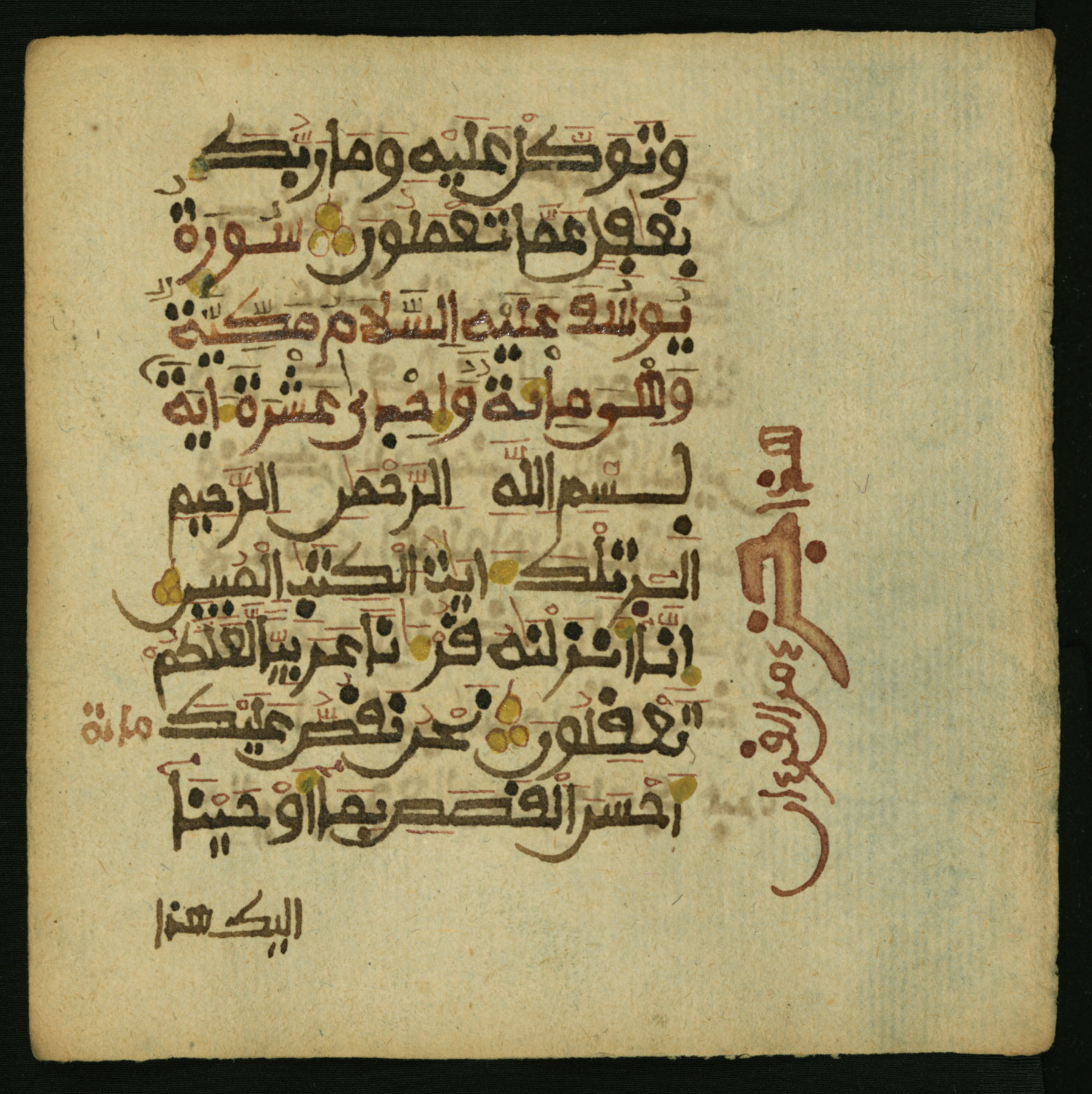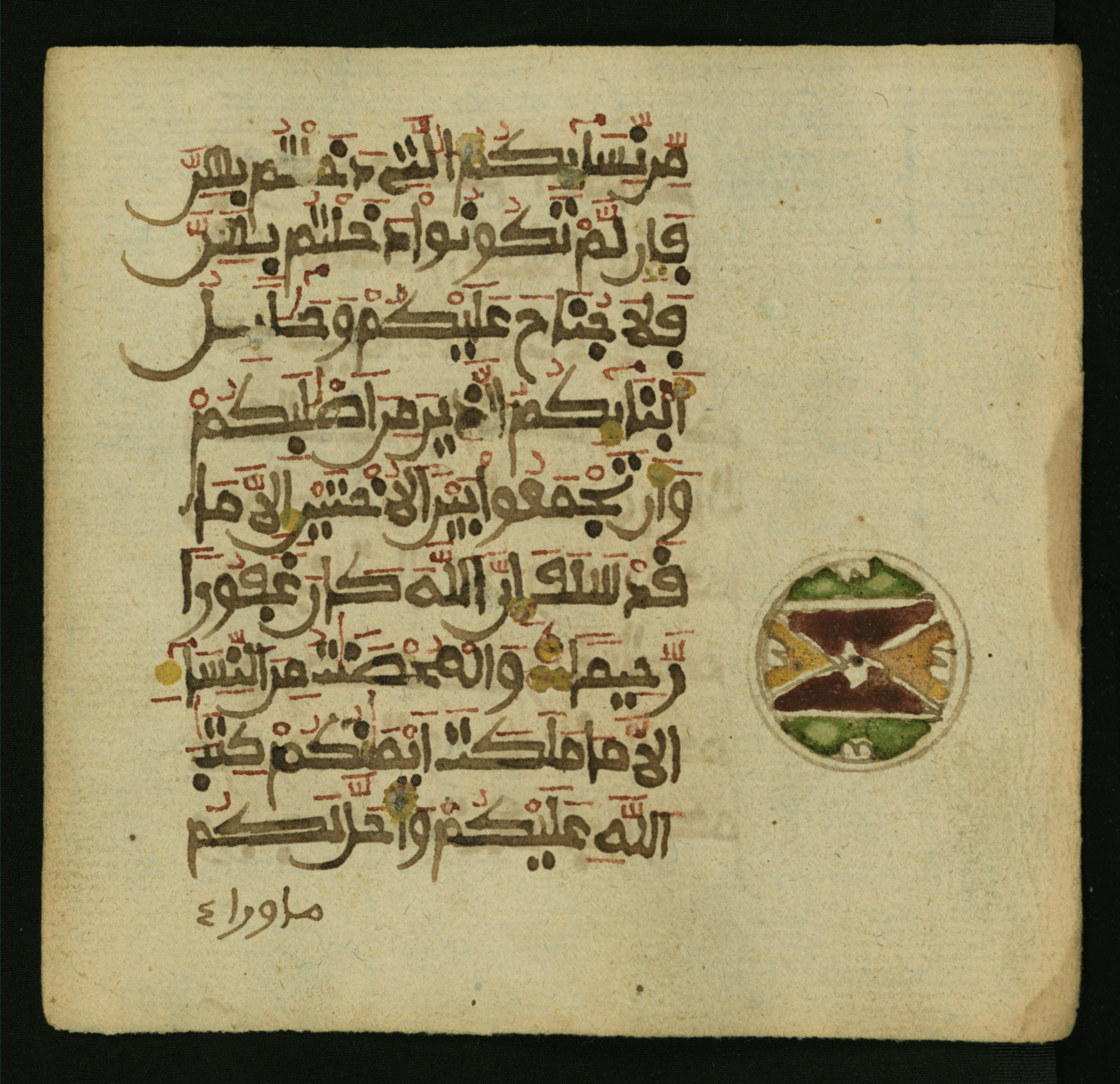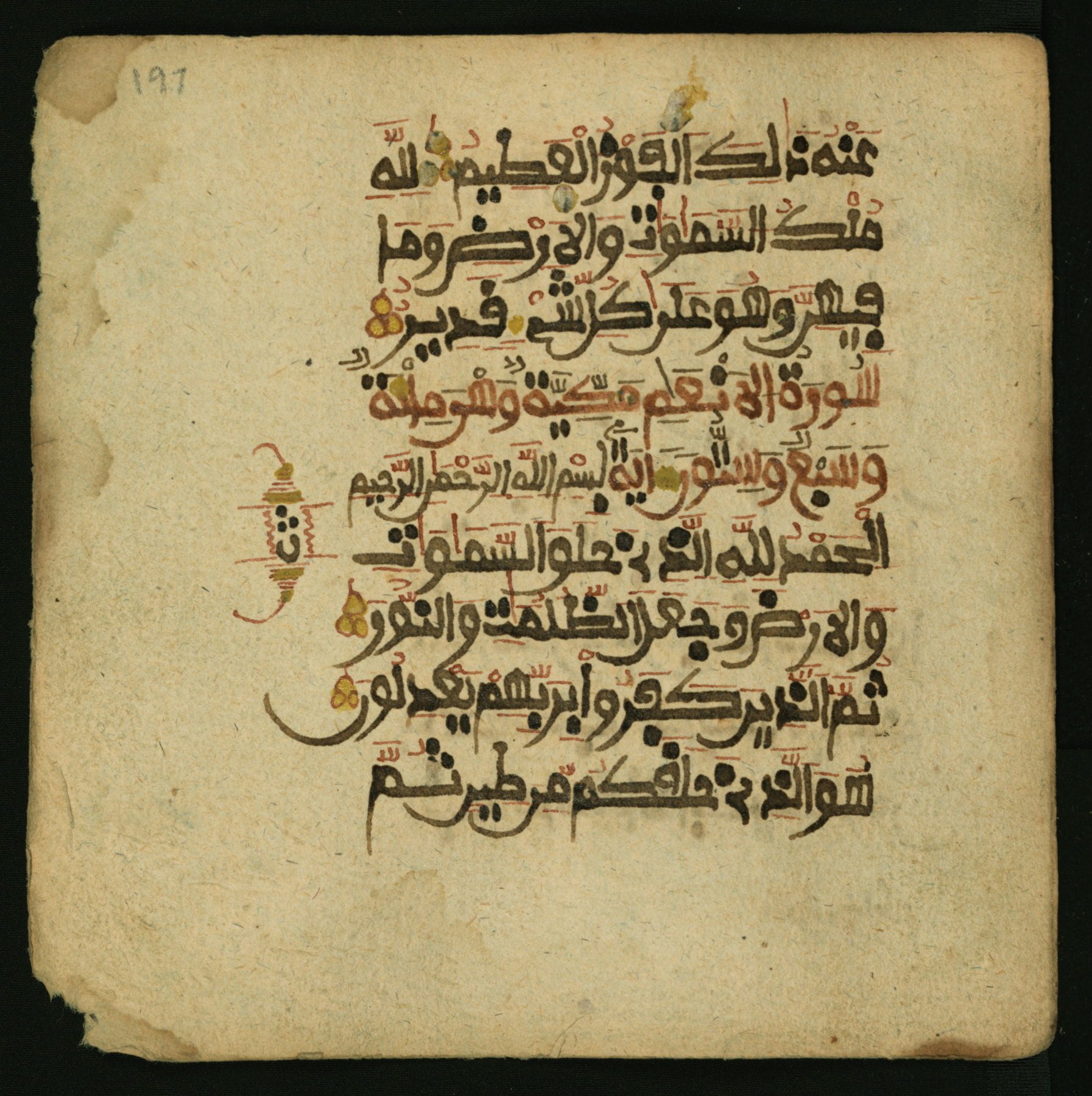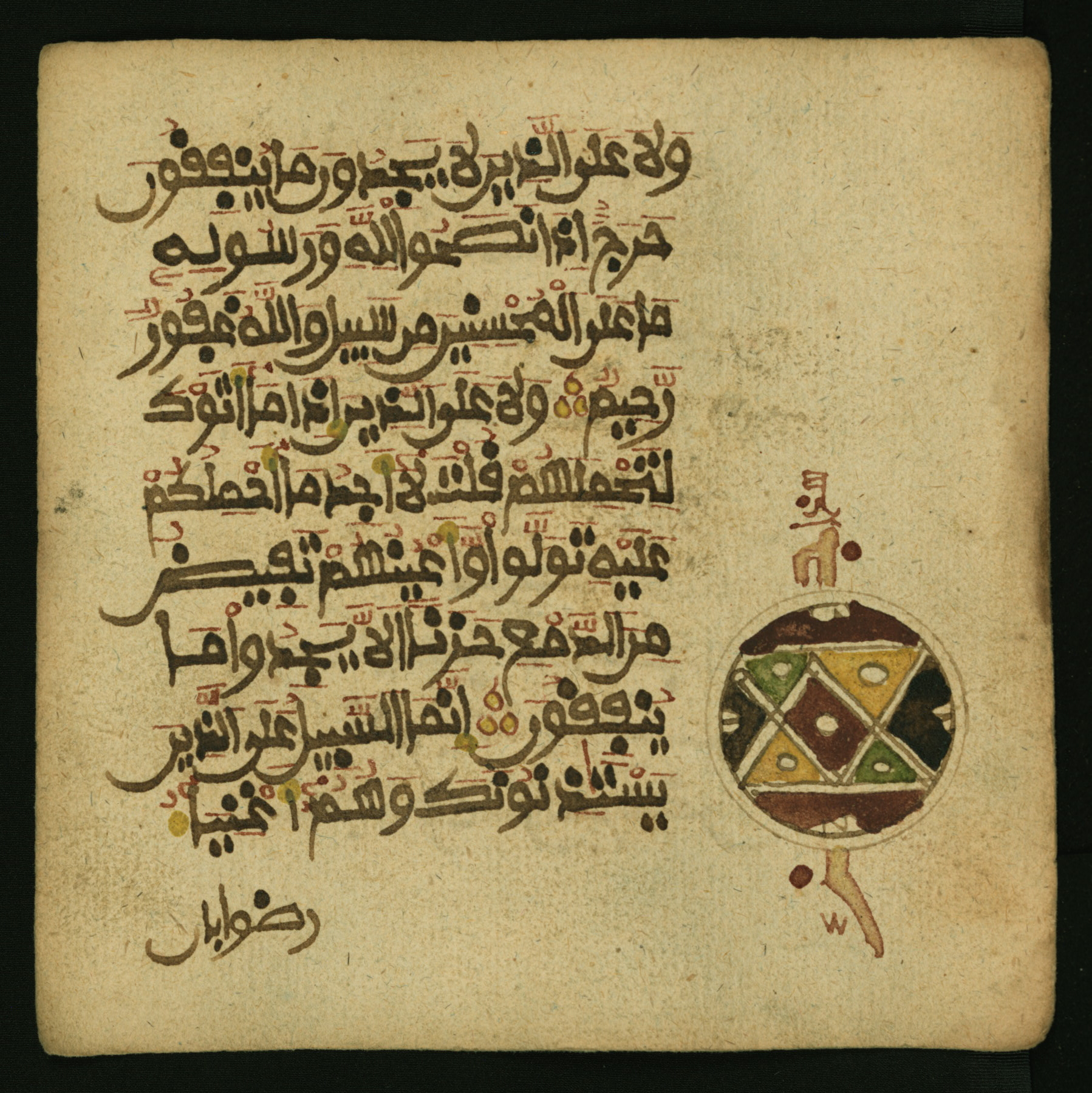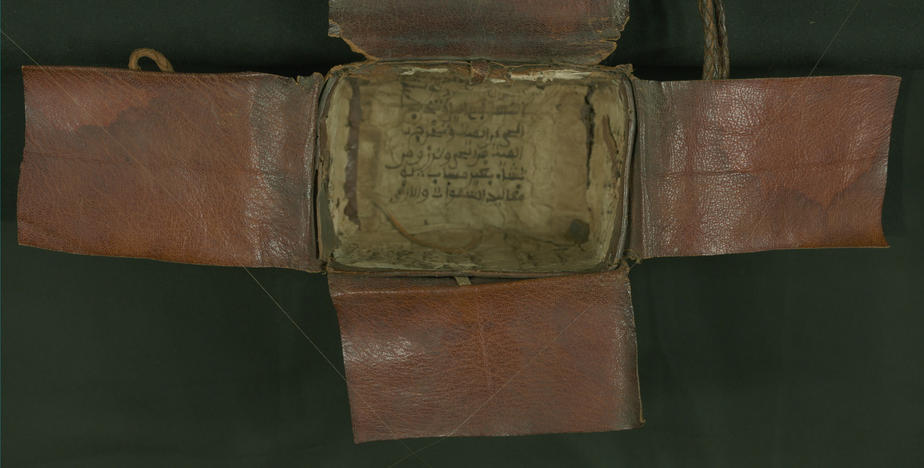 This square-format manuscript is volume 1, containing chapters 1-18 (Sūrat al-fātiḥah through Sūrat al-kahf), of an illuminated two-volume Qur'an produced in Sub-Saharan (West) Africa in the thirteenth century AH / nineteenth CE. The text is written in Sūdānī script in dark brown ink with vocalization in red on loose leaves. Chapter headings are in reddish-brown ink. Three yellow dots outlined in red arranged in a triangular form separate verses. Polychrome circular medallions as well as square and rectangular devices in a variety of patterns and colors mark textual divisions. The leaves of the text are organized between two decorated boards with geometric compositions. The pages and boards are housed in a leather pouch (satchel).