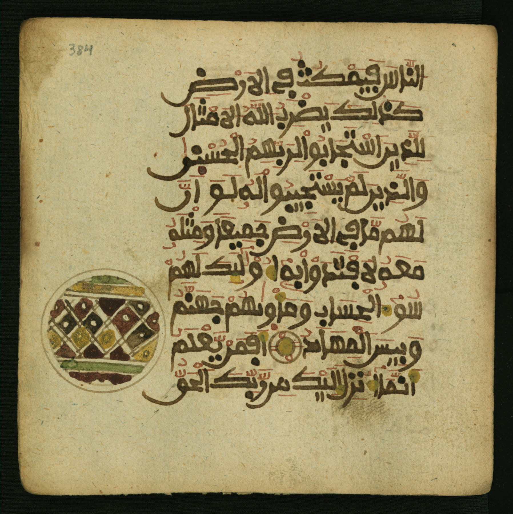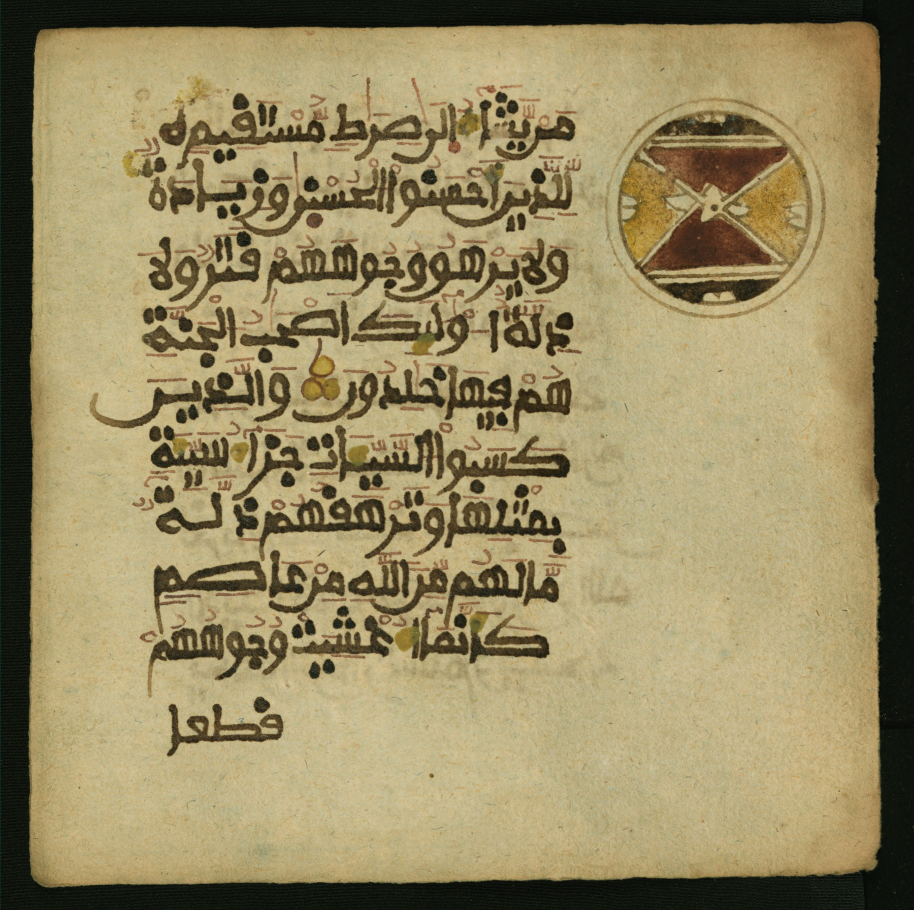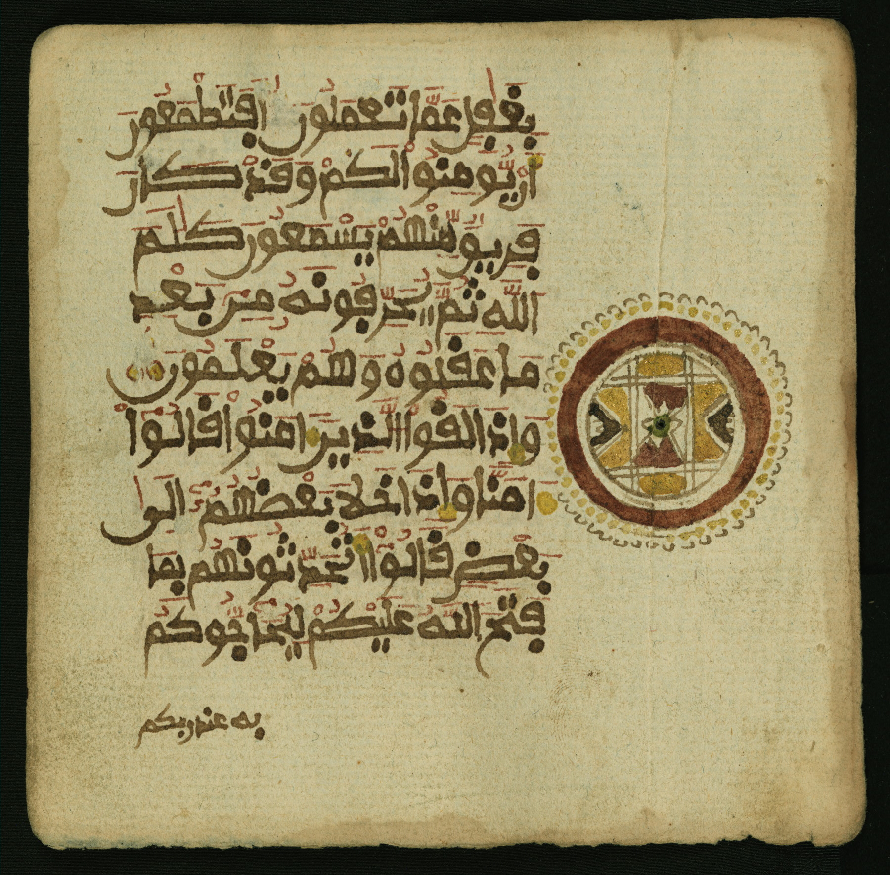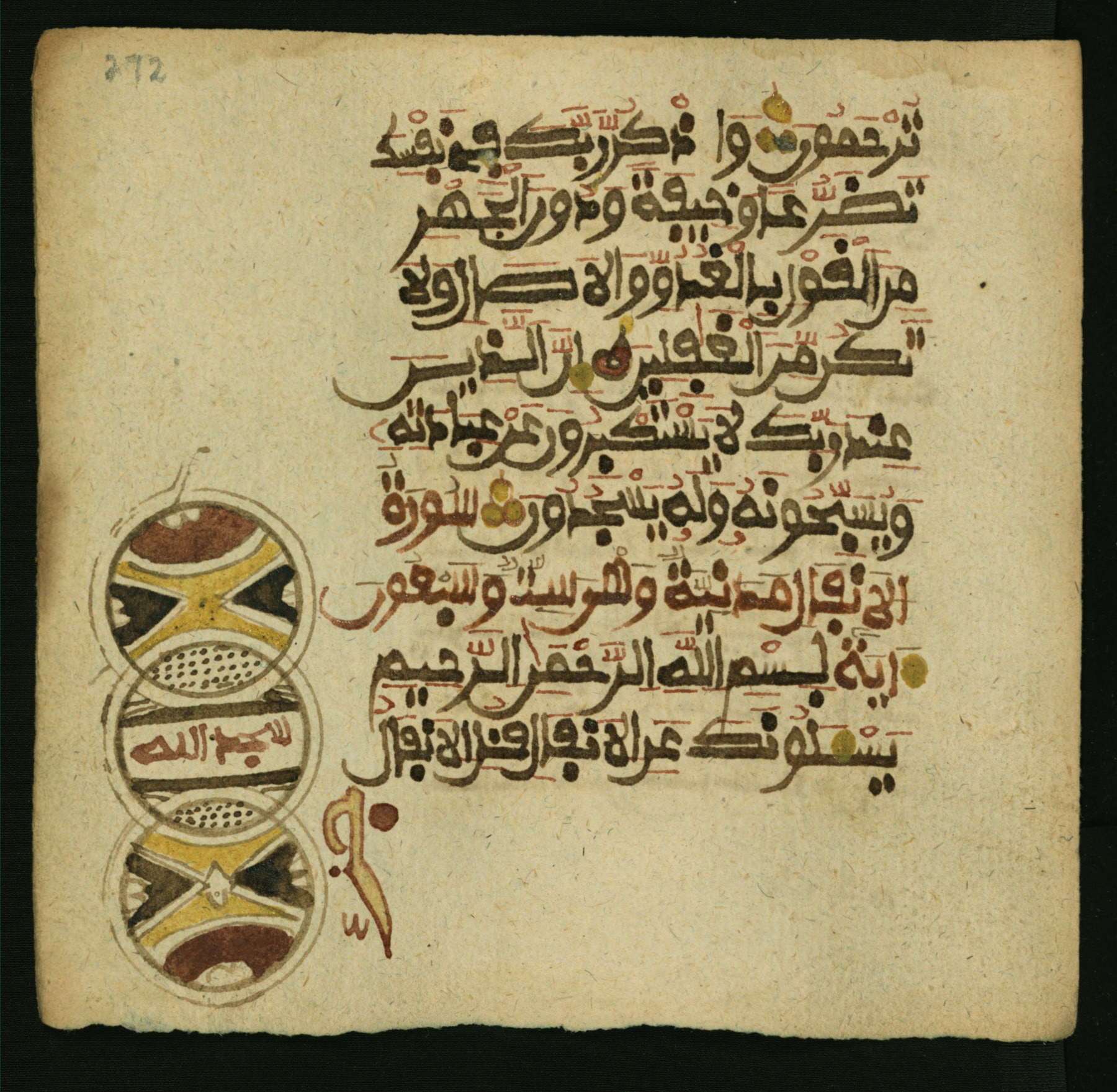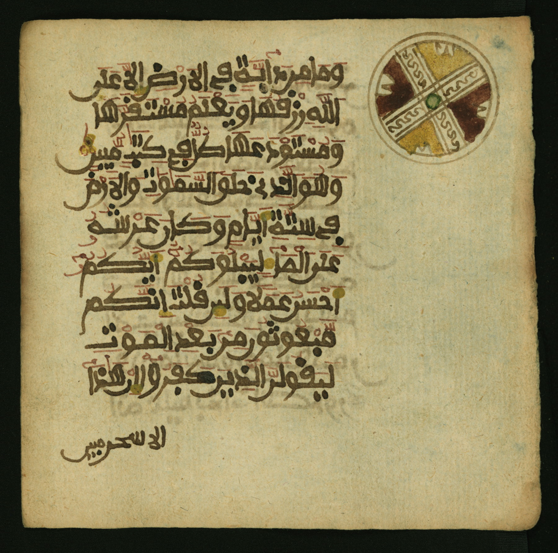 This square-format manuscript is volume 1, containing chapters 1-18 (Sūrat al-fātiḥah through Sūrat al-kahf), of an illuminated two-volume Qur'an produced in Sub-Saharan (West) Africa in the thirteenth century AH / nineteenth CE. The text is written in Sūdānī script in dark brown ink with vocalization in red on loose leaves. Chapter headings are in reddish-brown ink. Three yellow dots outlined in red arranged in a triangular form separate verses. Polychrome circular medallions as well as square and rectangular devices in a variety of patterns and colors mark textual divisions. The leaves of the text are organized between two decorated boards with geometric compositions. The pages and boards are housed in a leather pouch (satchel).